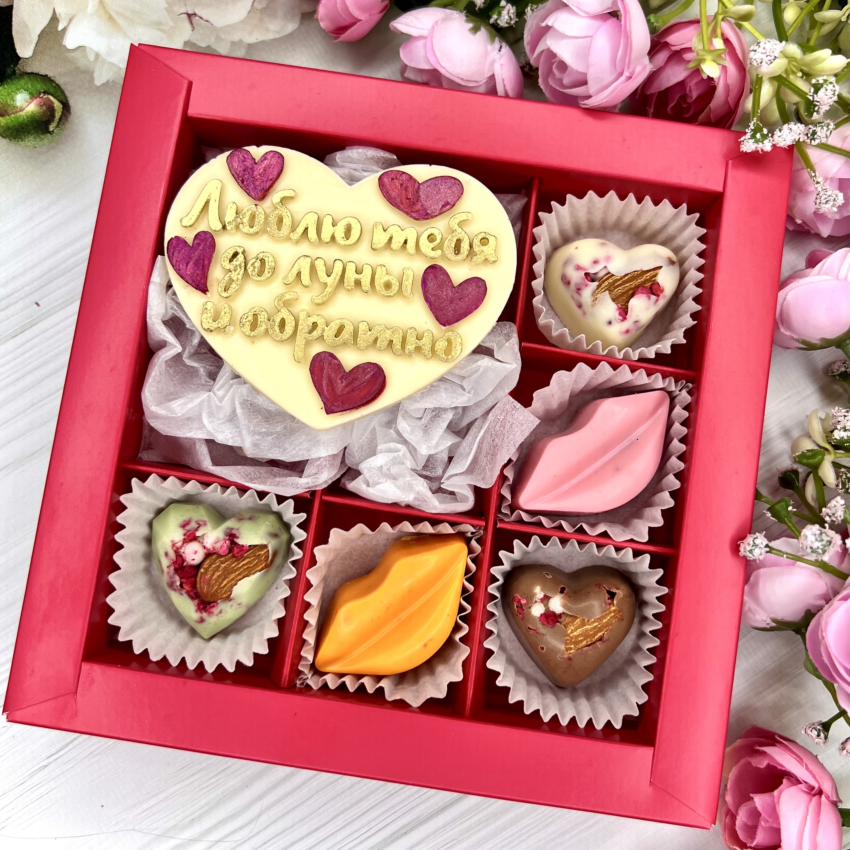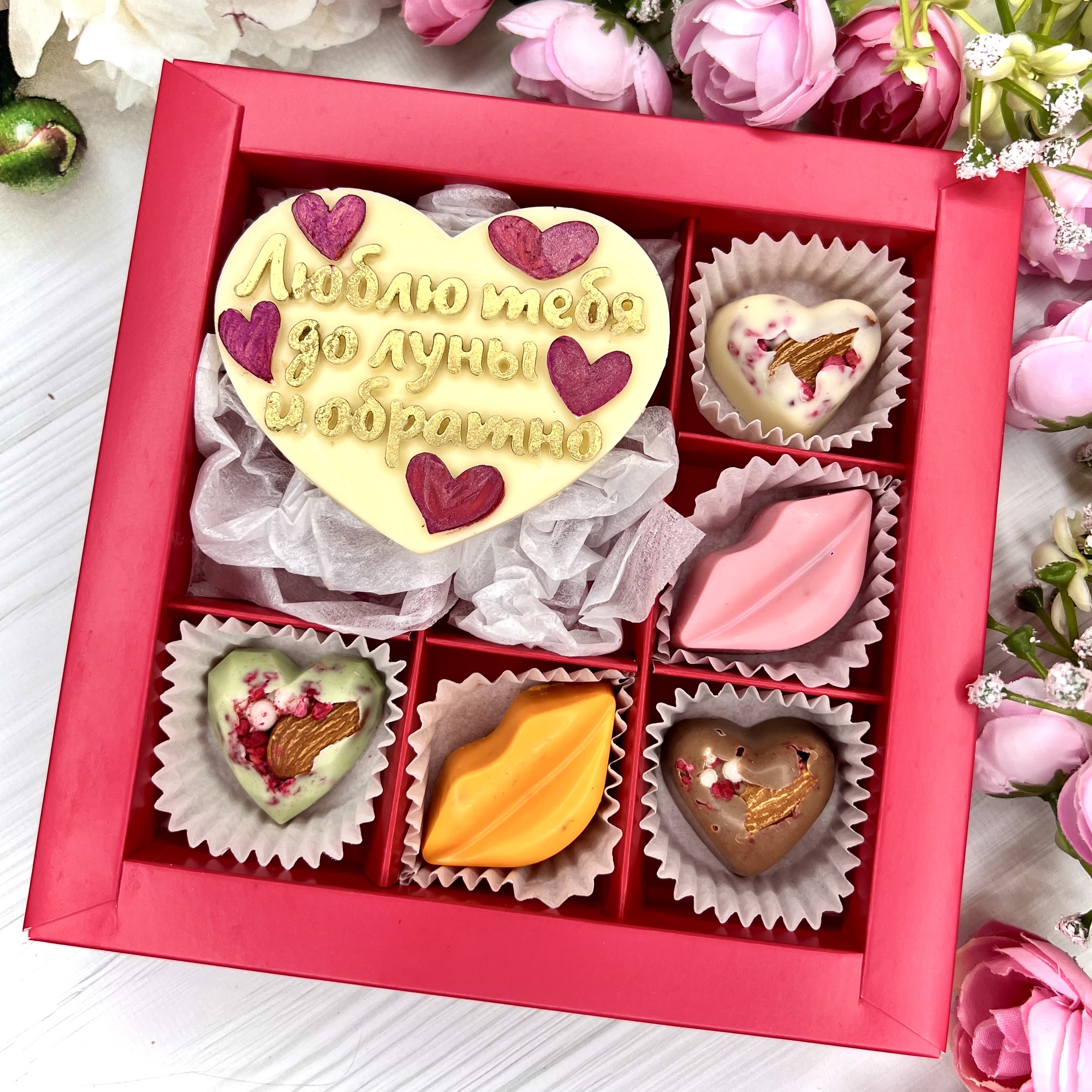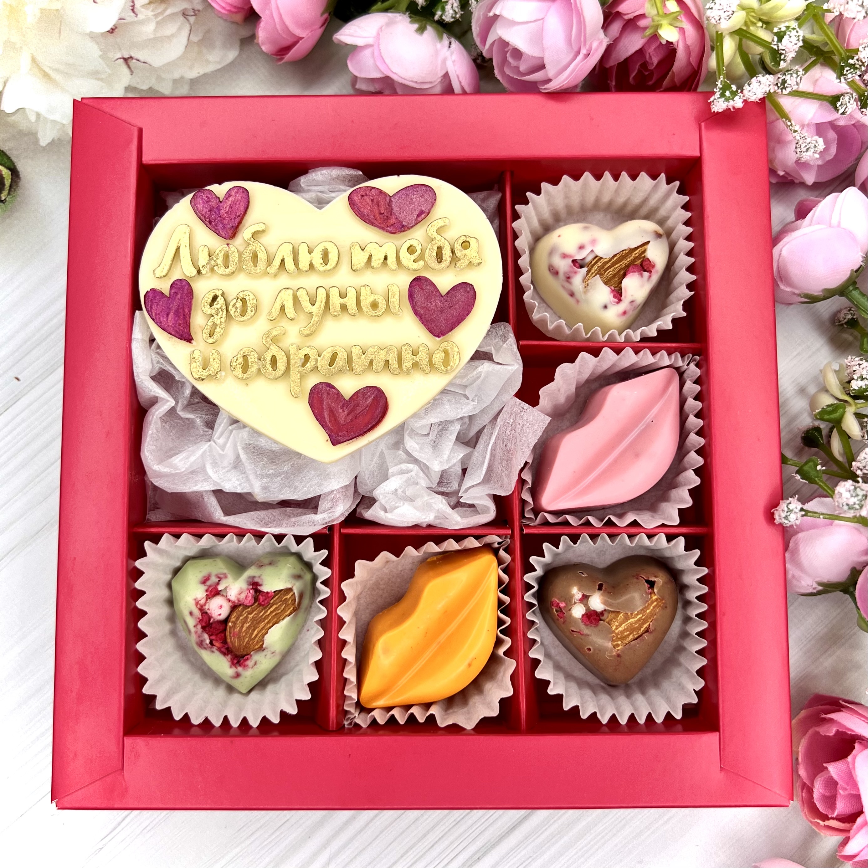 Шоколадный набор "Люблю тебя до луны и обратно": шоколадка-сердце и 5 конфет ручной работы - оригинальный и вкусный подарок на День Влюбленных из швейцарского и бельгийского шоколада.