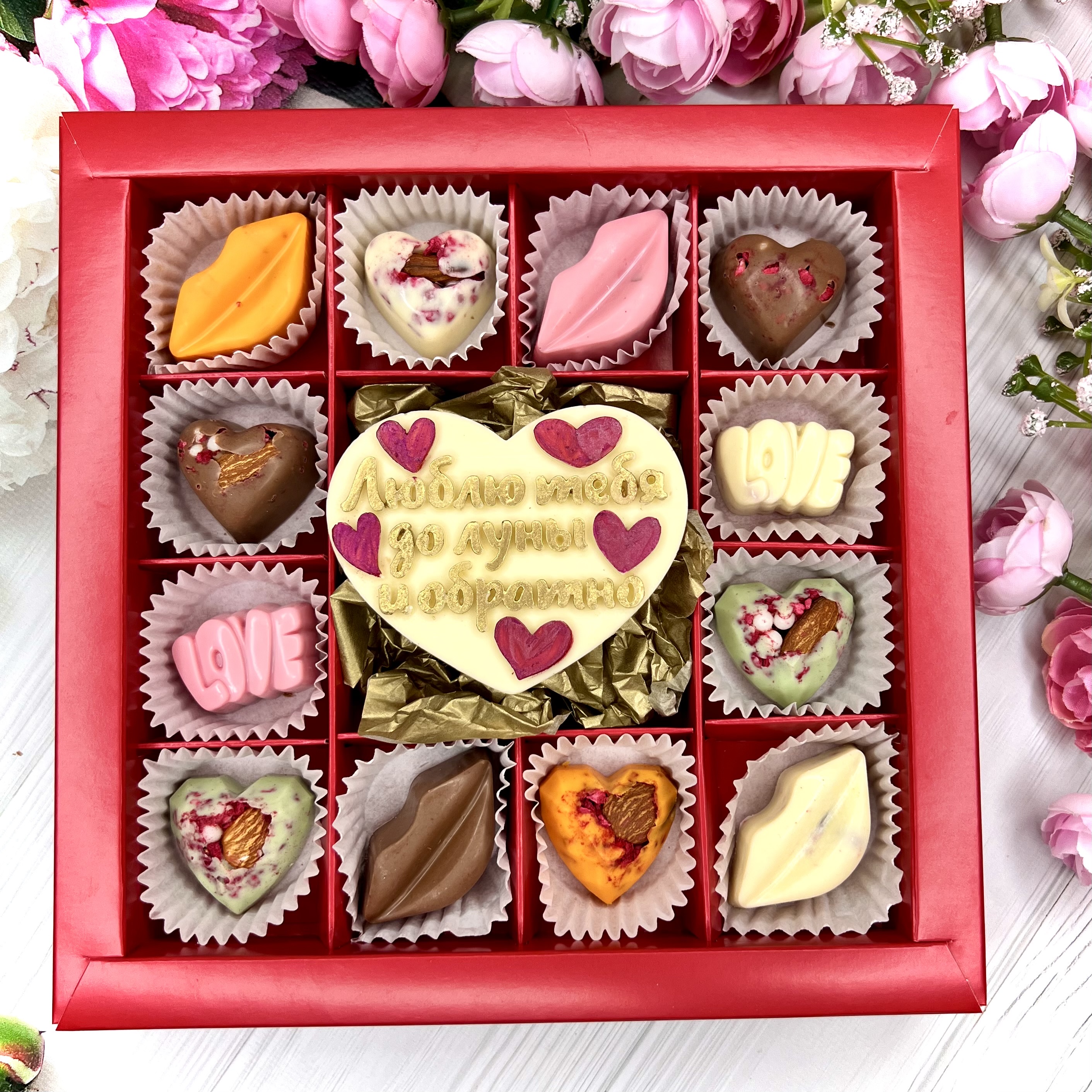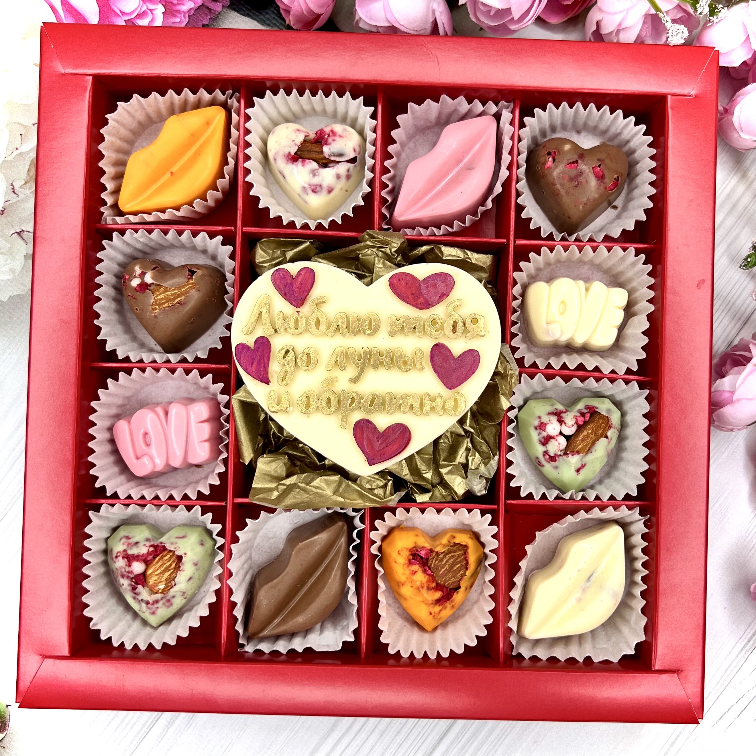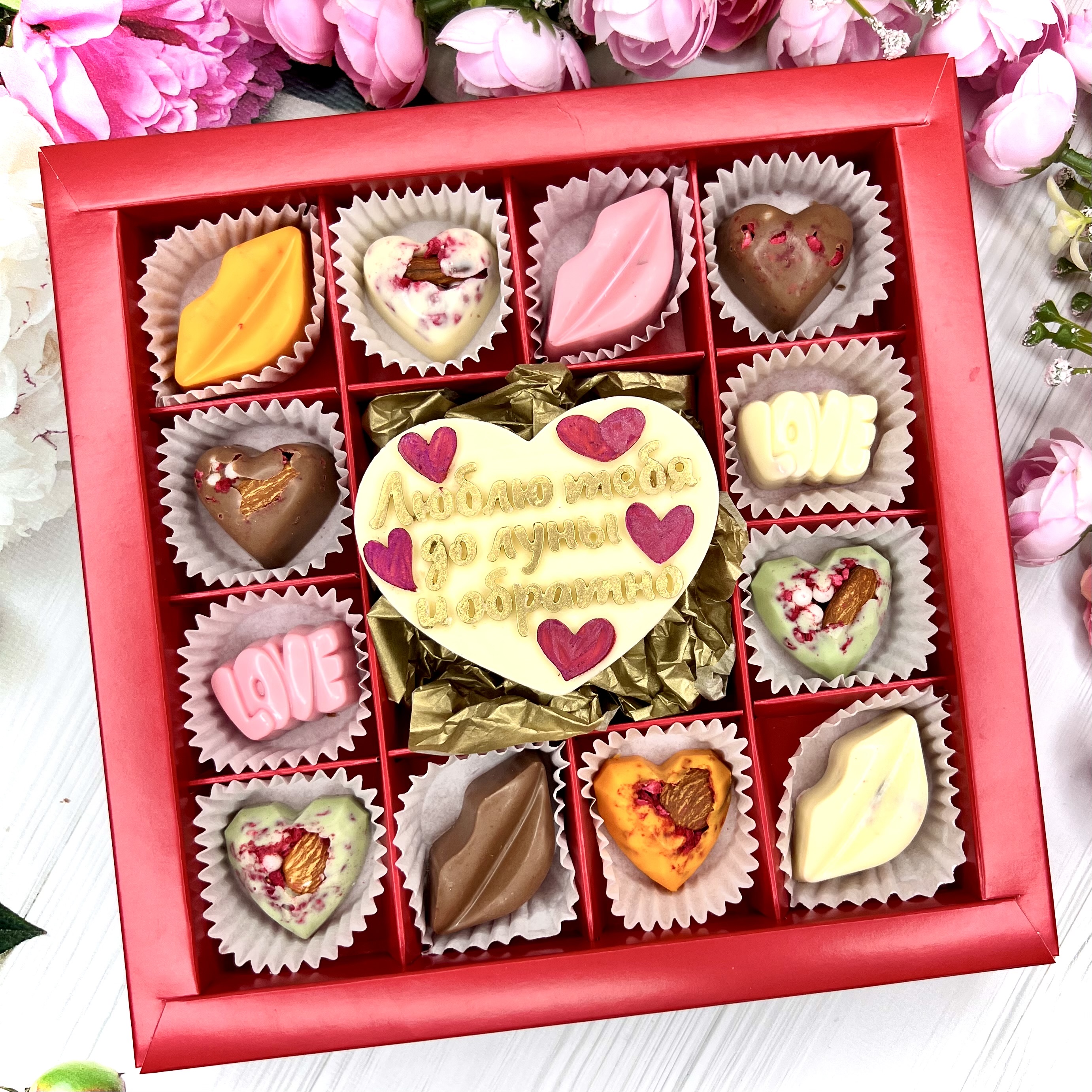 Шоколадный набор "Люблю тебя до луны и обратно": шоколадка-сердце и 12 конфет ручной работы - оригинальный и вкусный подарок на День Влюбленных из швейцарского и бельгийского шоколада.