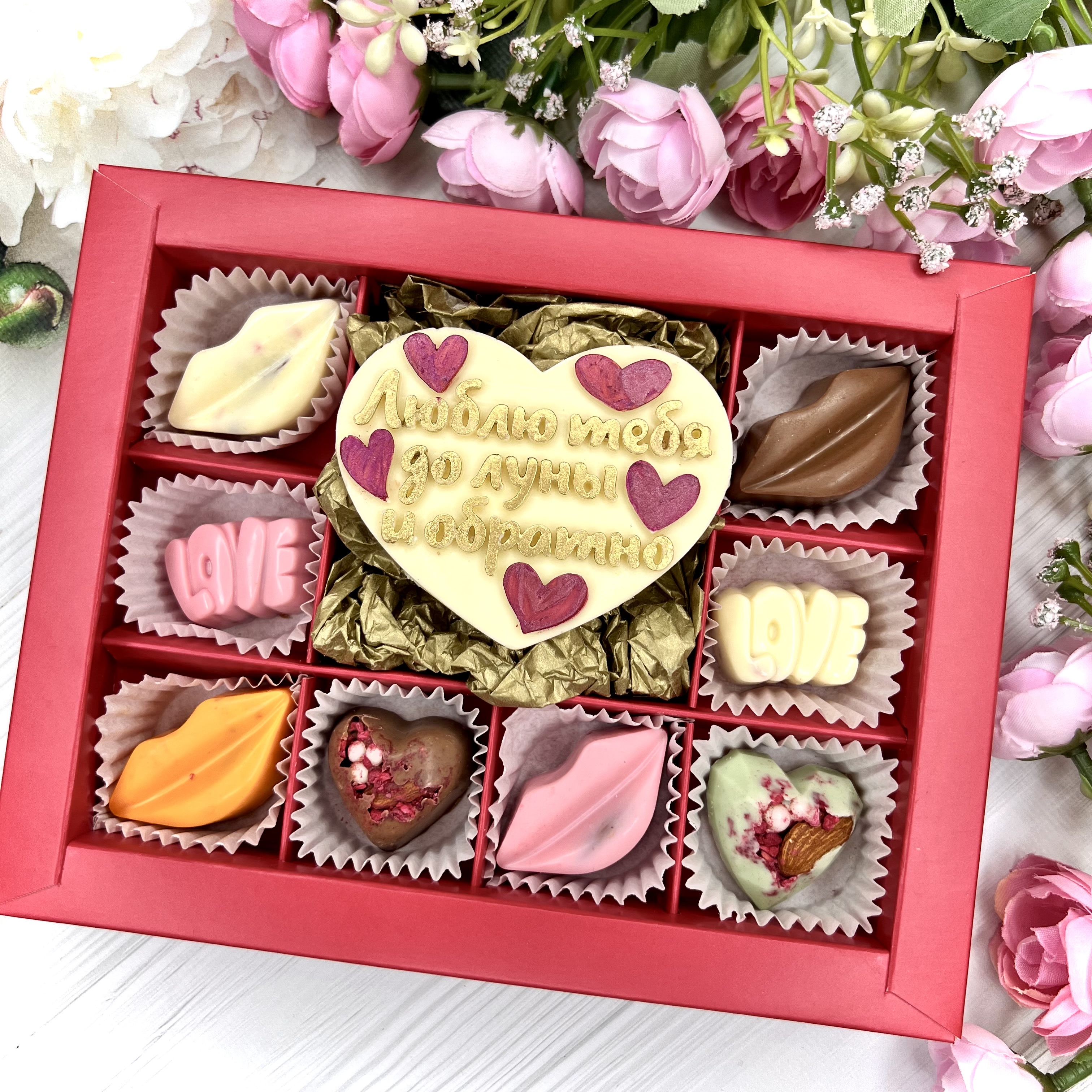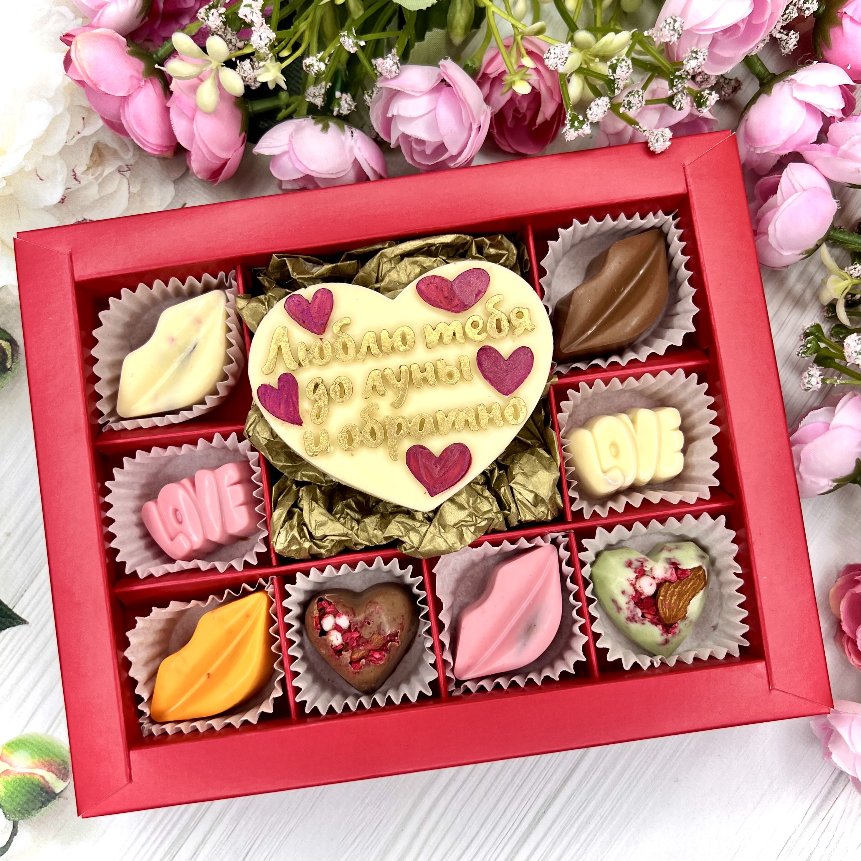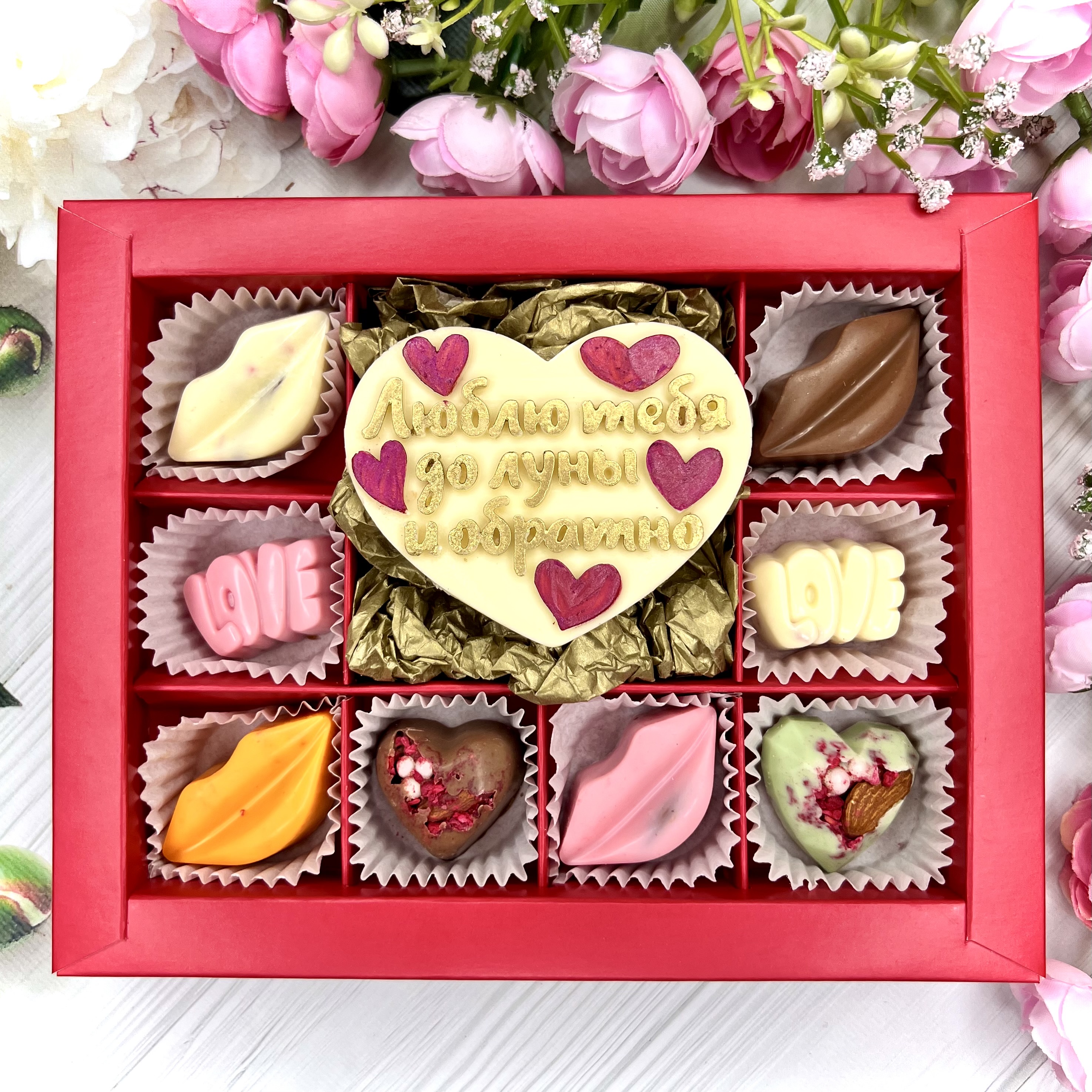 Шоколадный набор "Люблю тебя до луны и обратно": шоколадка-сердце и 8 конфет ручной работы - оригинальный и вкусный подарок на День Влюбленных из швейцарского и бельгийского шоколада.