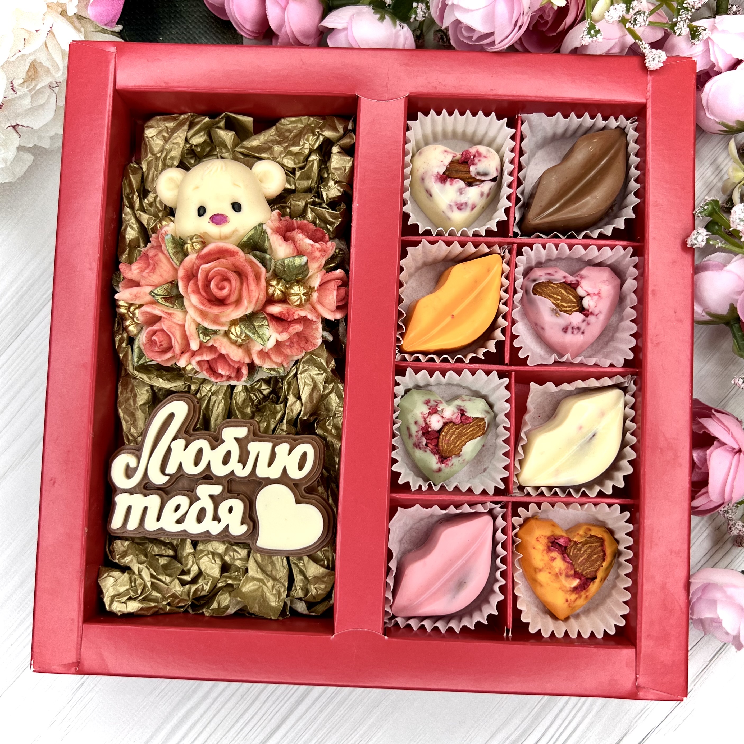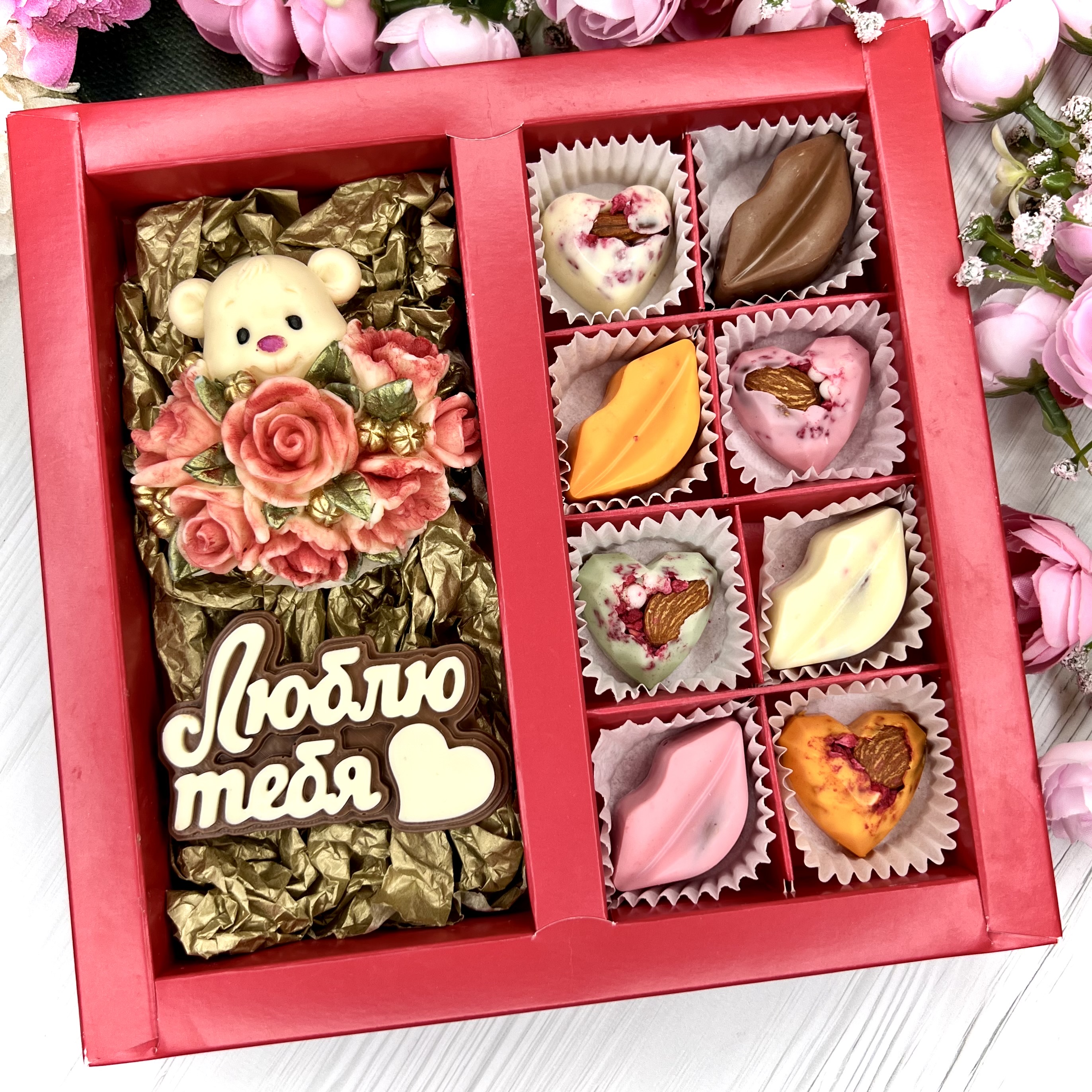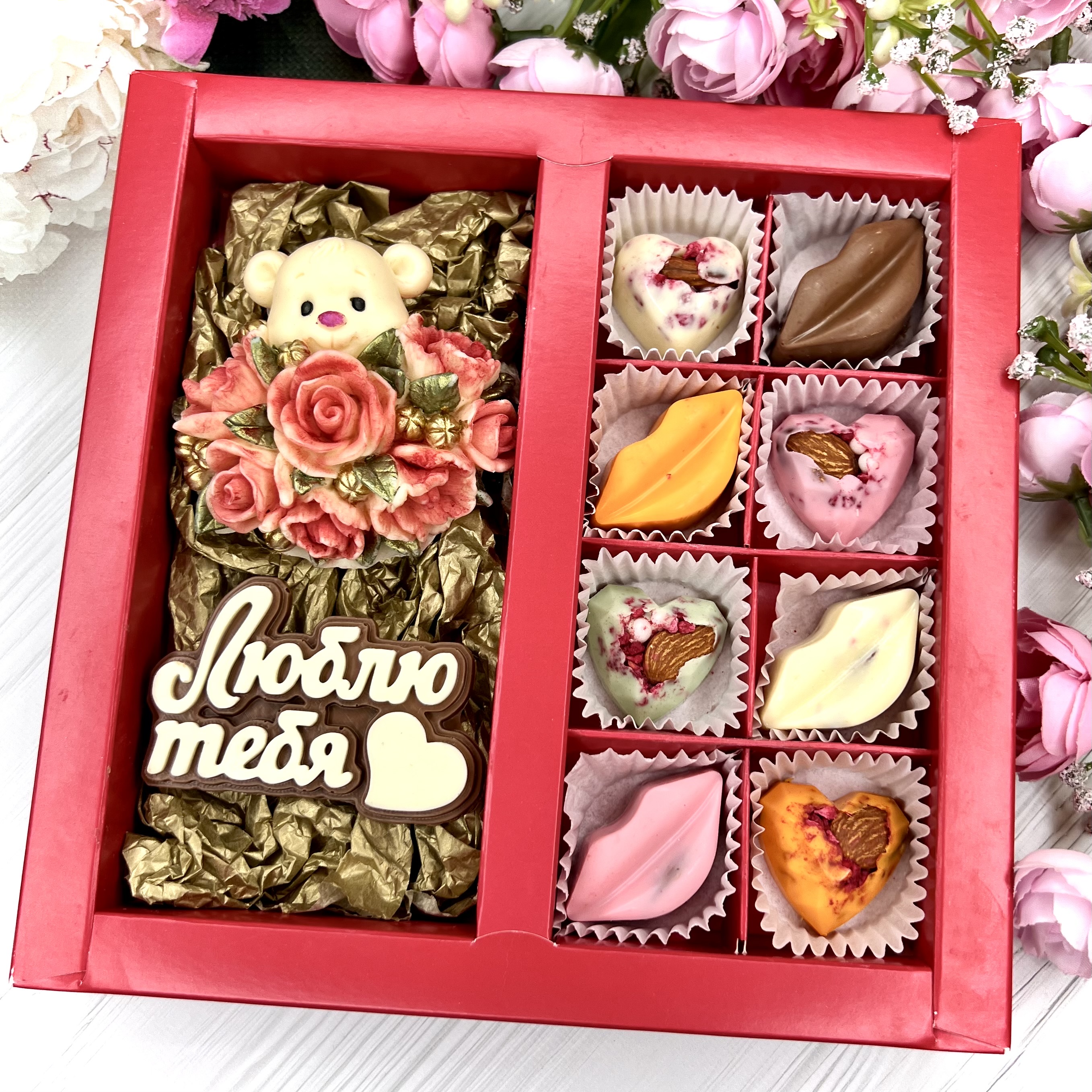 Шоколадный набор: "Люблю тебя. Мишка с розами": шоколадка-надпись и 8 конфет ручной работы - оригинальный и вкусный подарок на День Влюбленных из швейцарского и бельгийского шоколада.