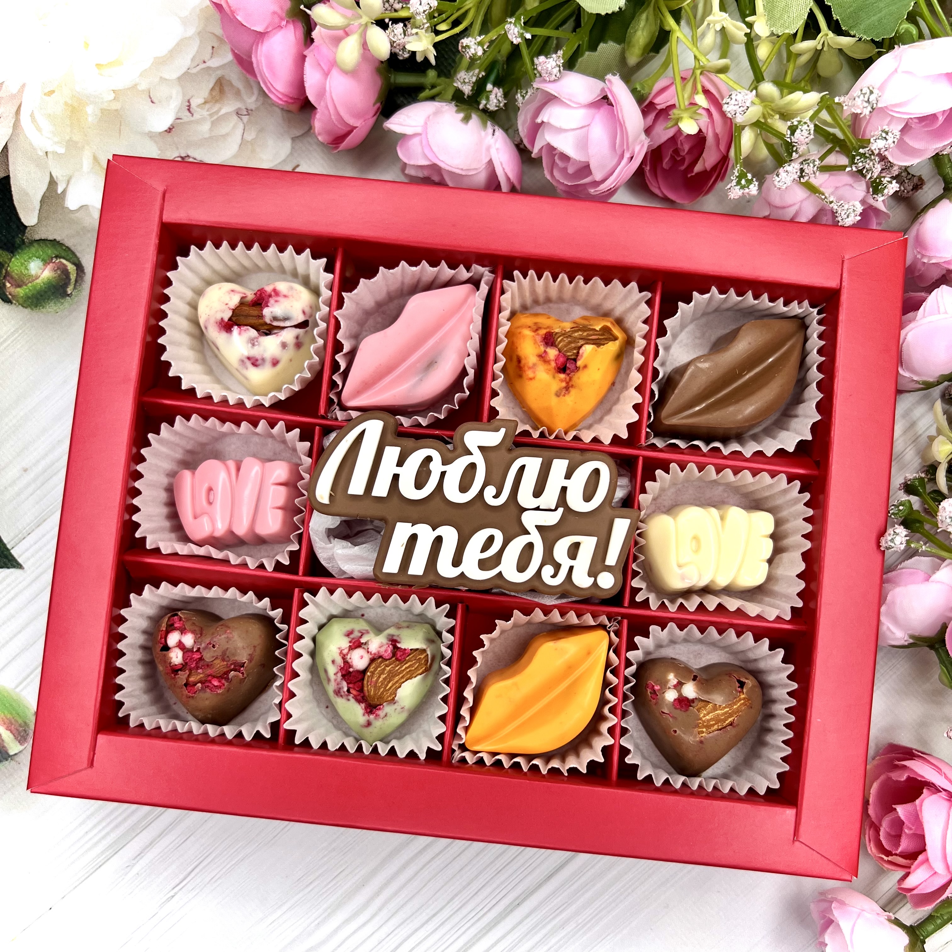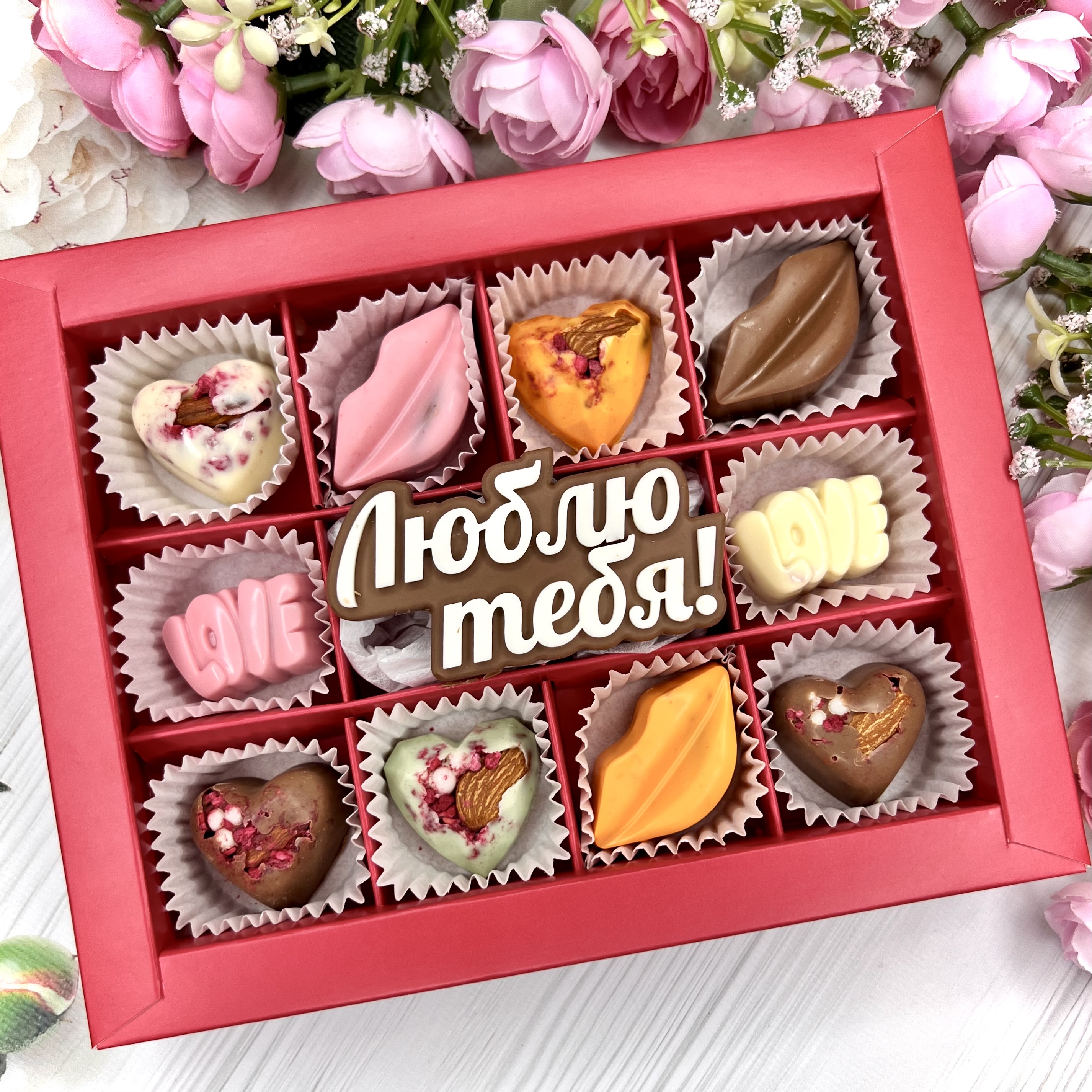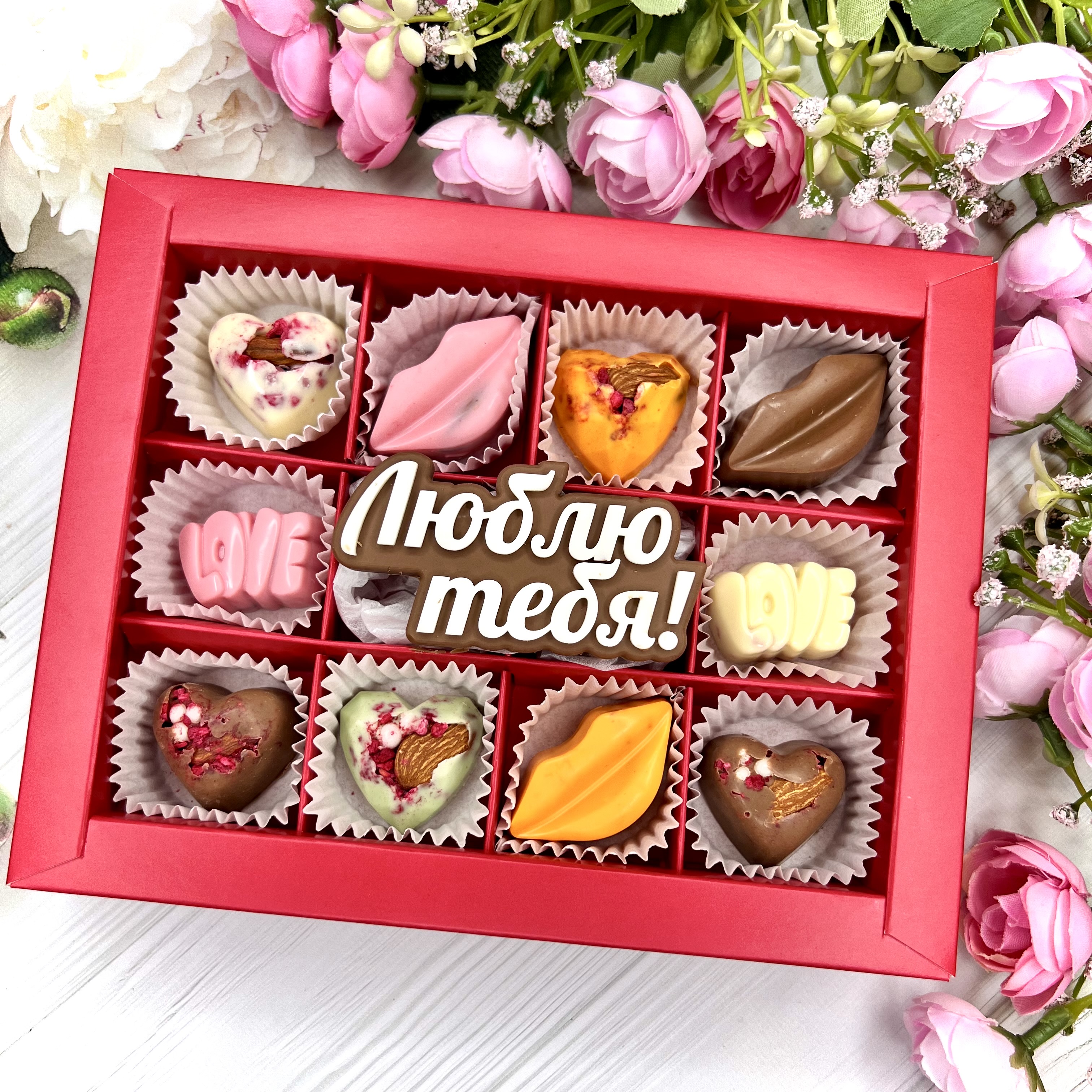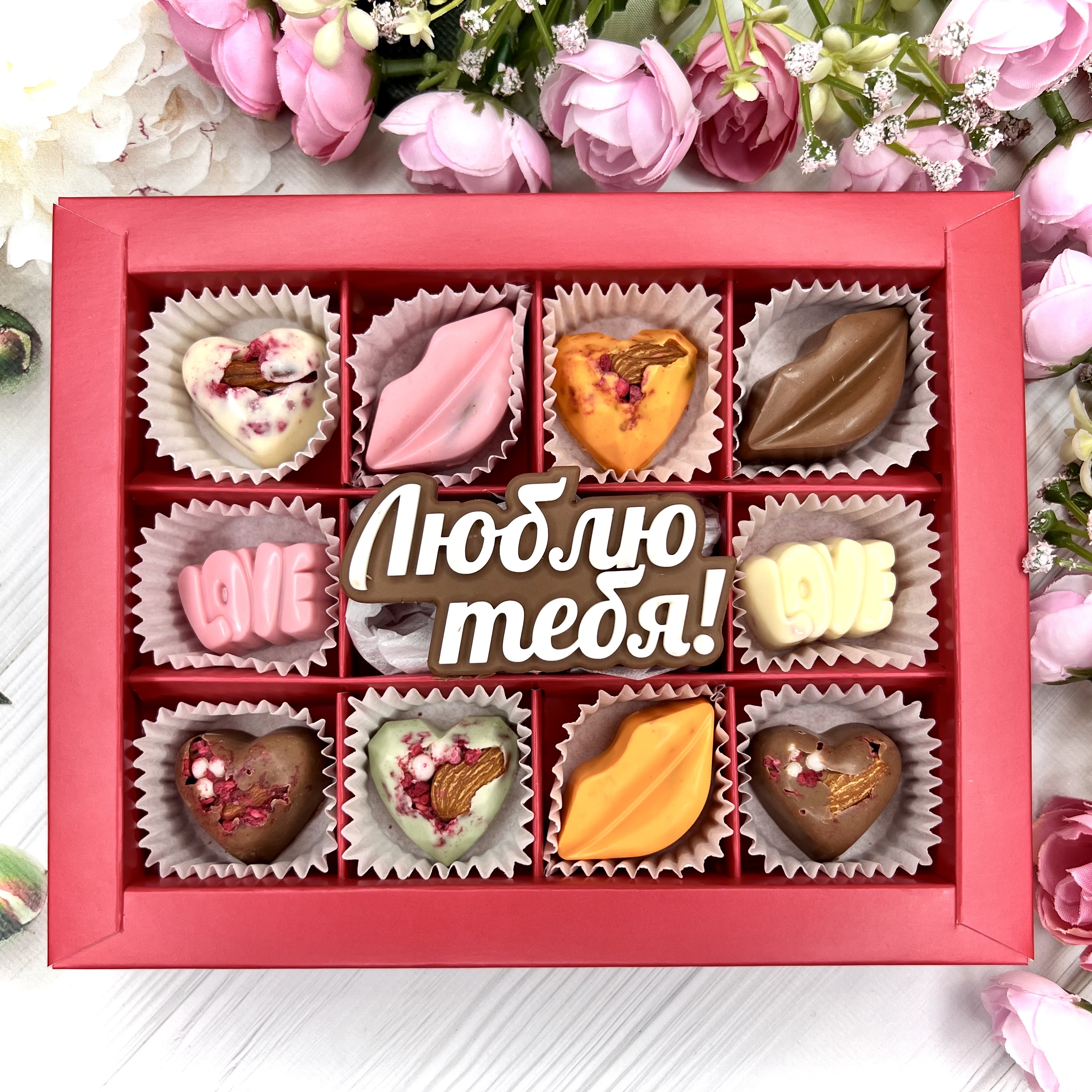 Шоколадный подарок "Люблю тебя": надпись и 10 конфет ручной работы. - оригинальный и вкусный подарок на День Влюбленных.