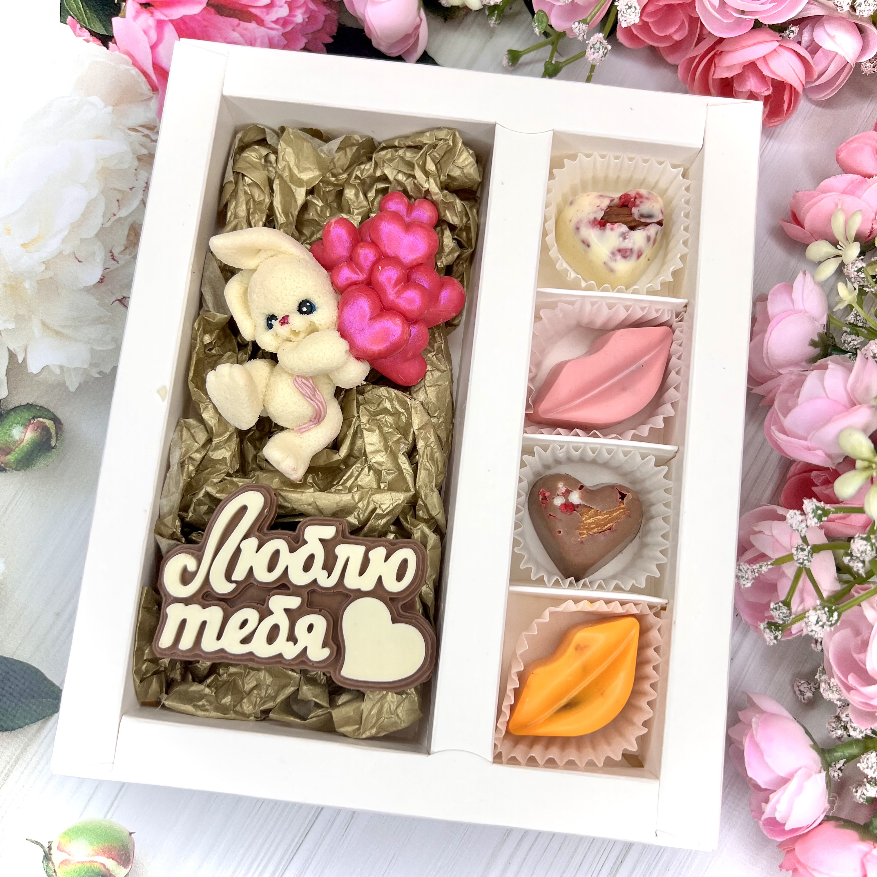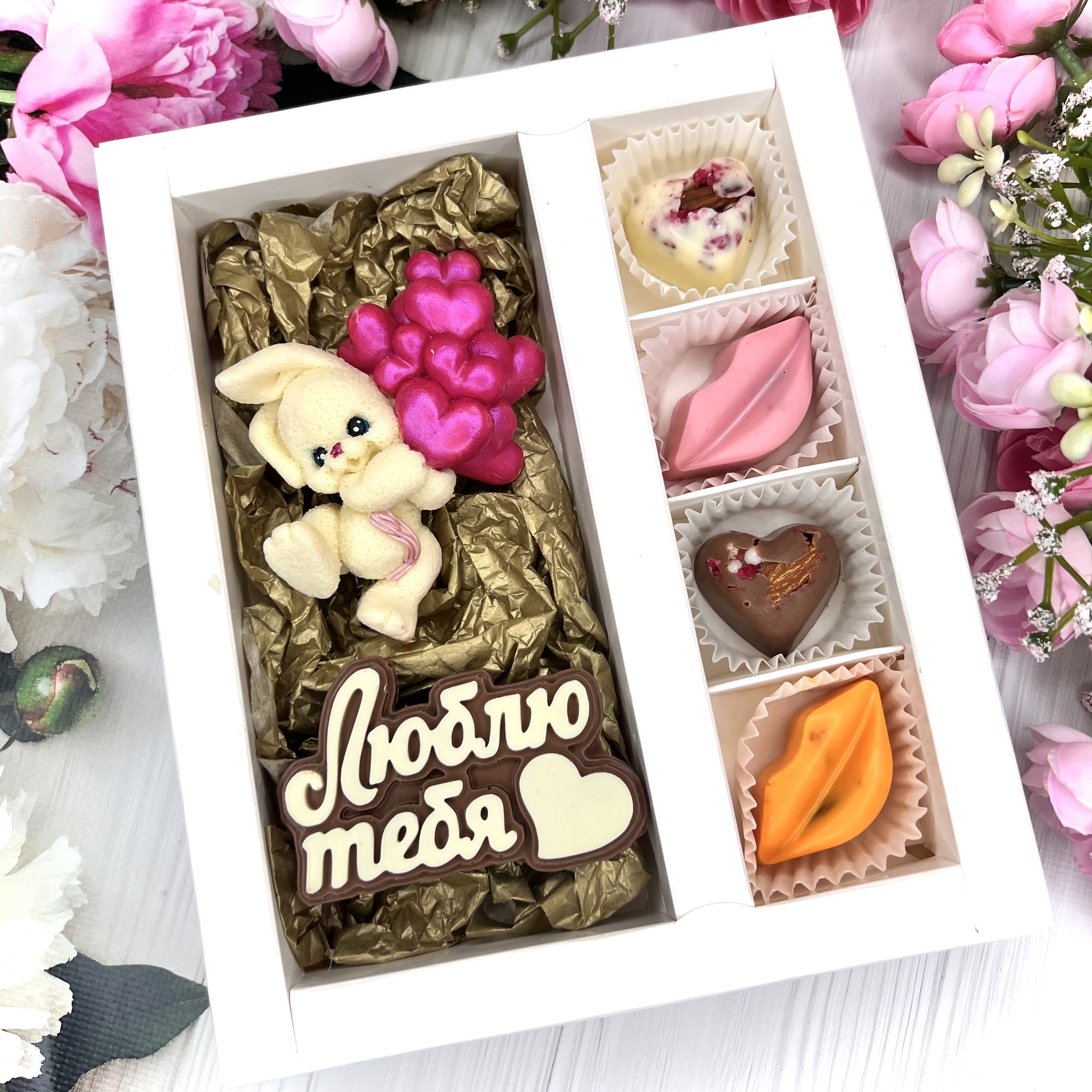 Шоколадный набор: "Люблю тебя. Зайчик с шариками": шоколадка-надпись и 4 конфеты ручной работы - оригинальный и вкусный подарок на День Влюбленных из швейцарского и бельгийского шоколада.