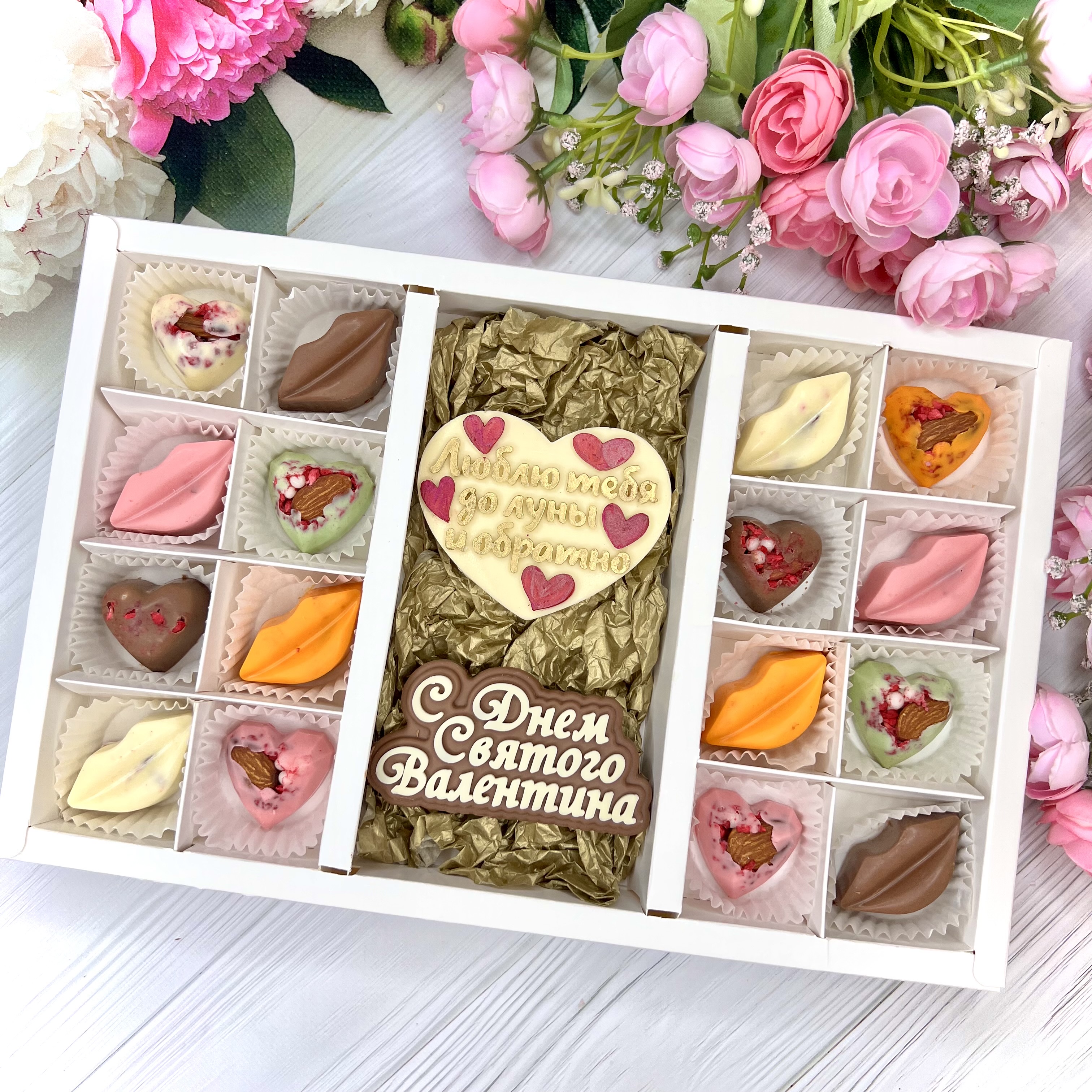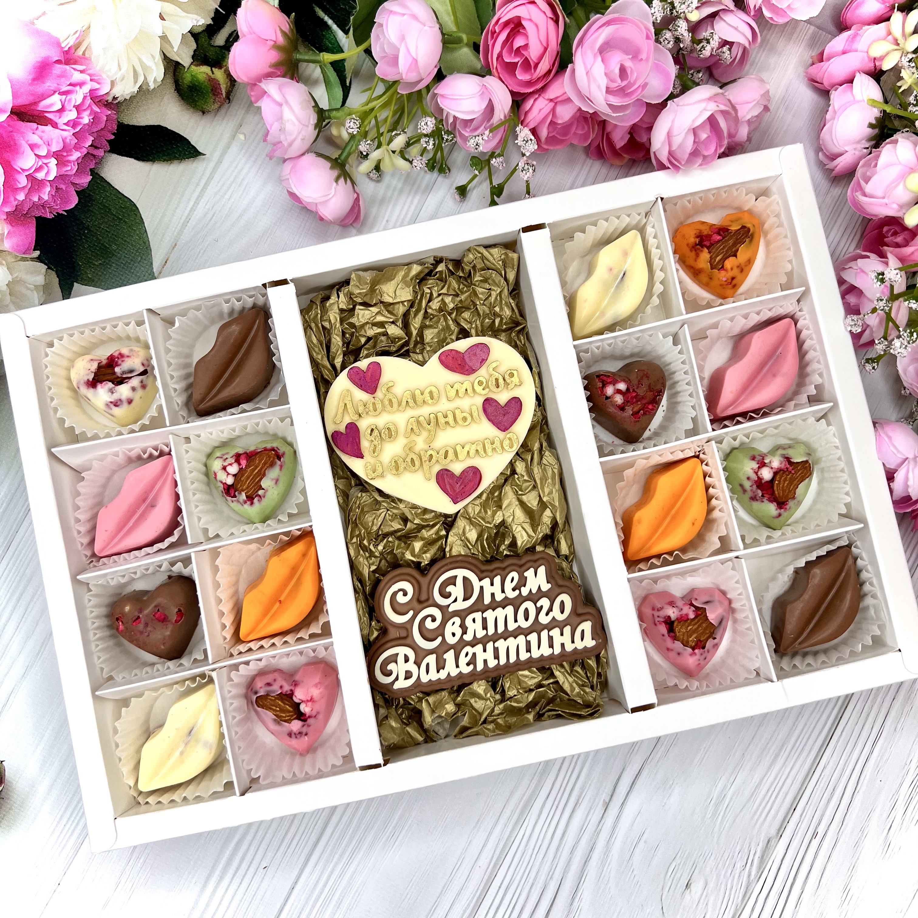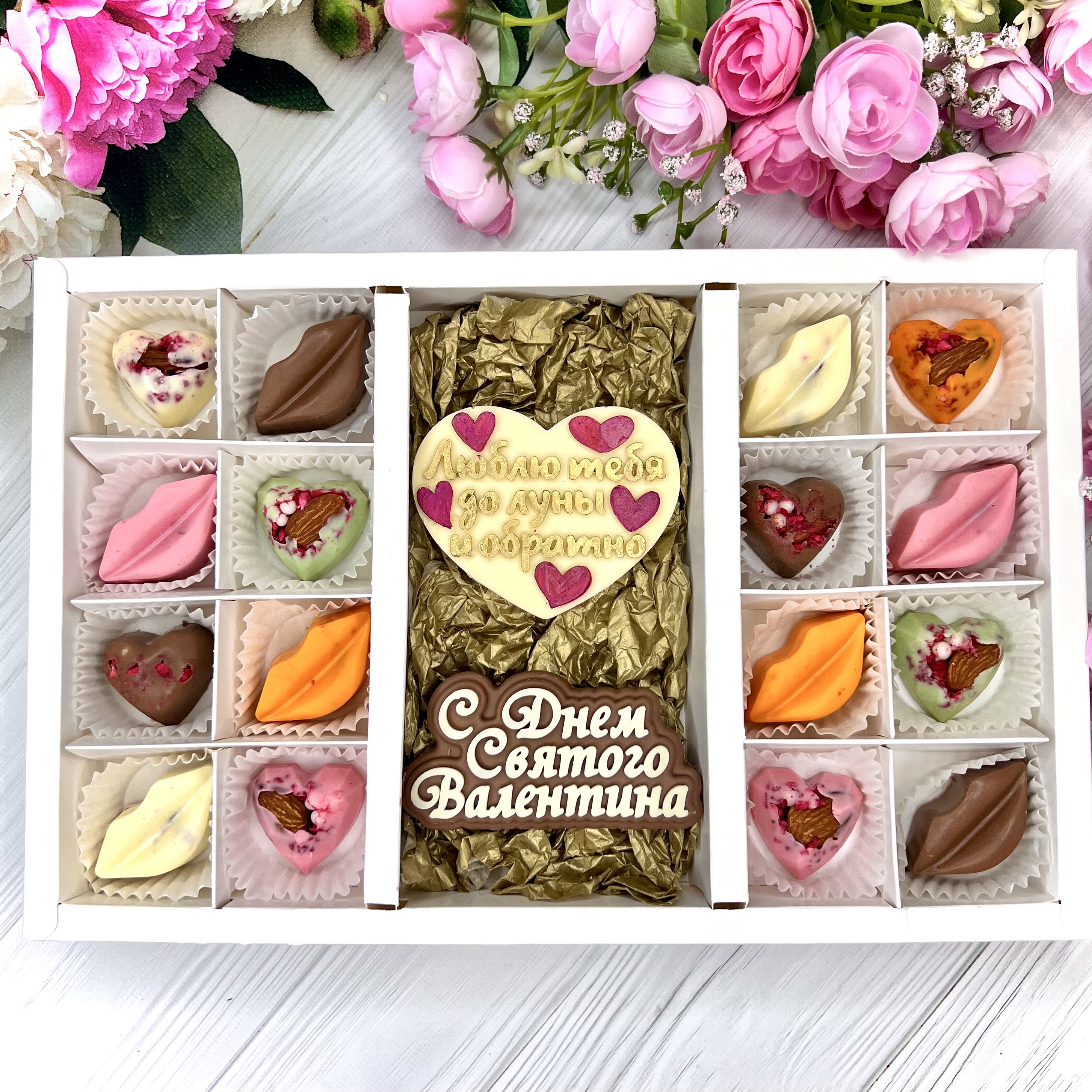 Шоколадный набор: "С Днем Святого Валентина. Люблю тебя до луны и обратно": шоколадка-сердце и 16 конфет ручной работы - оригинальный и вкусный подарок на День Влюбленных из швейцарского и бельгийского шоколада.