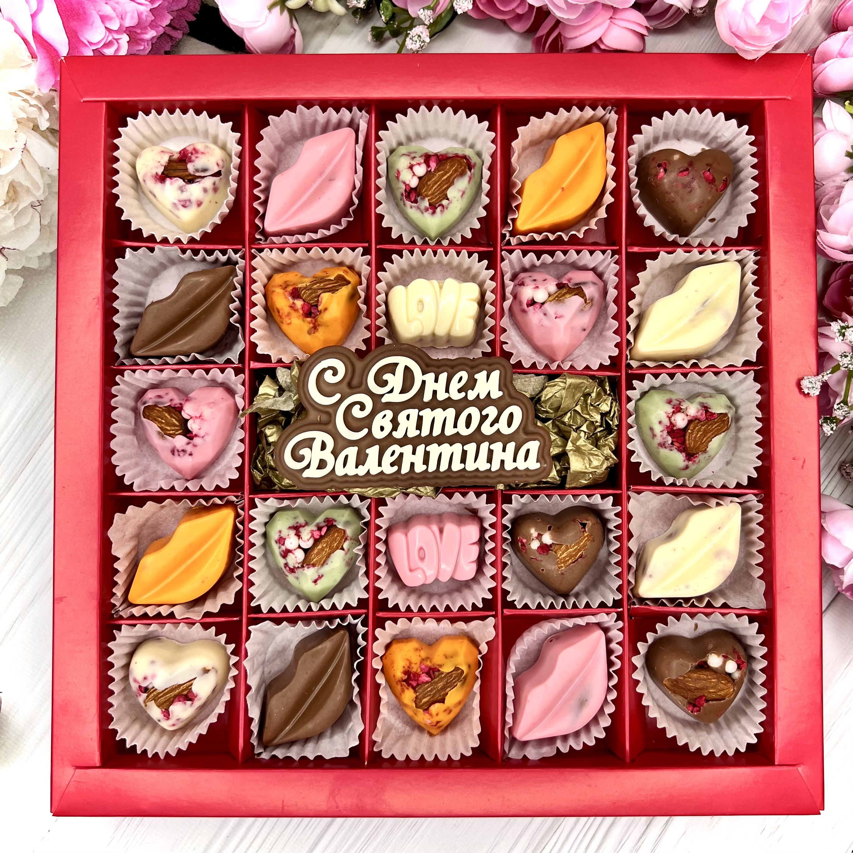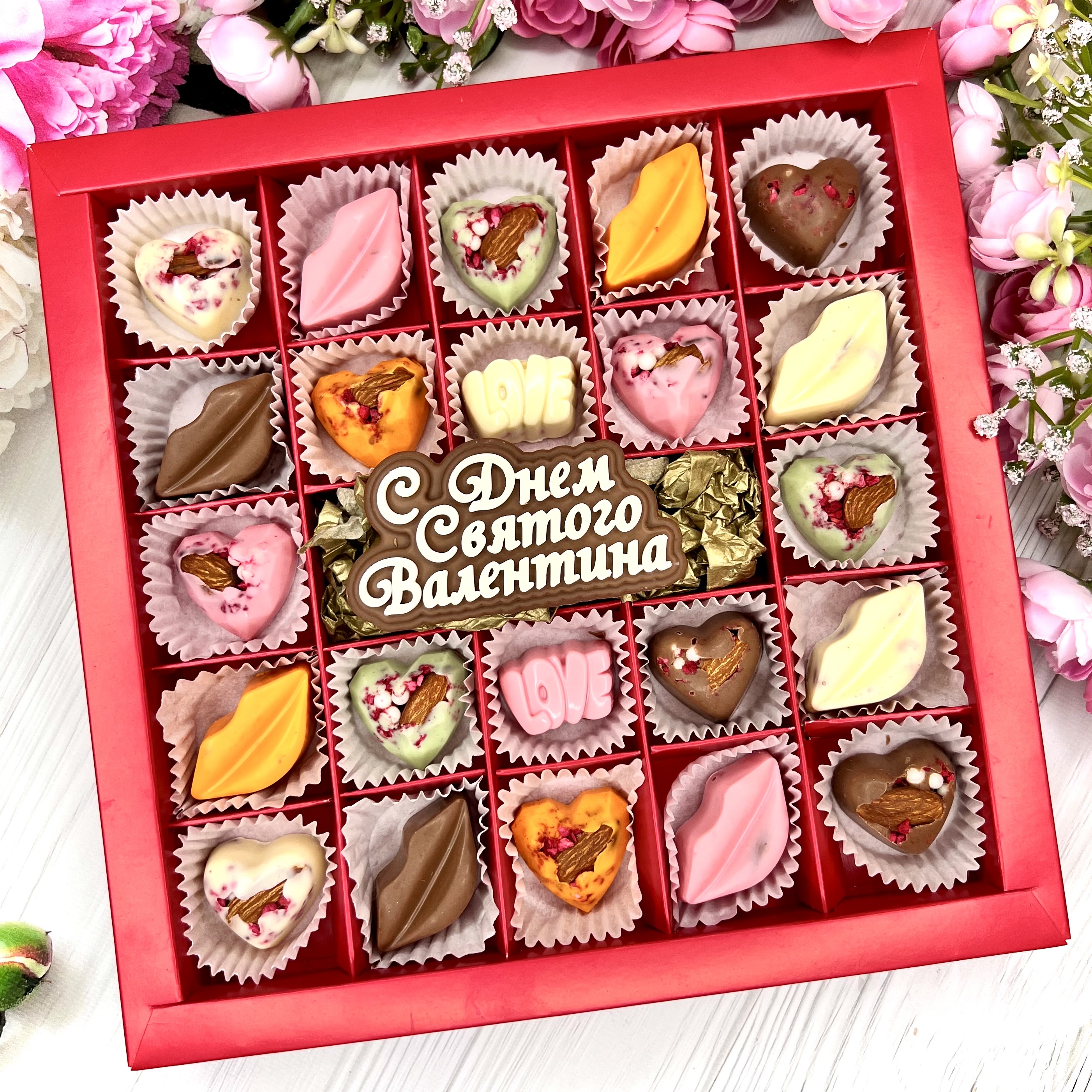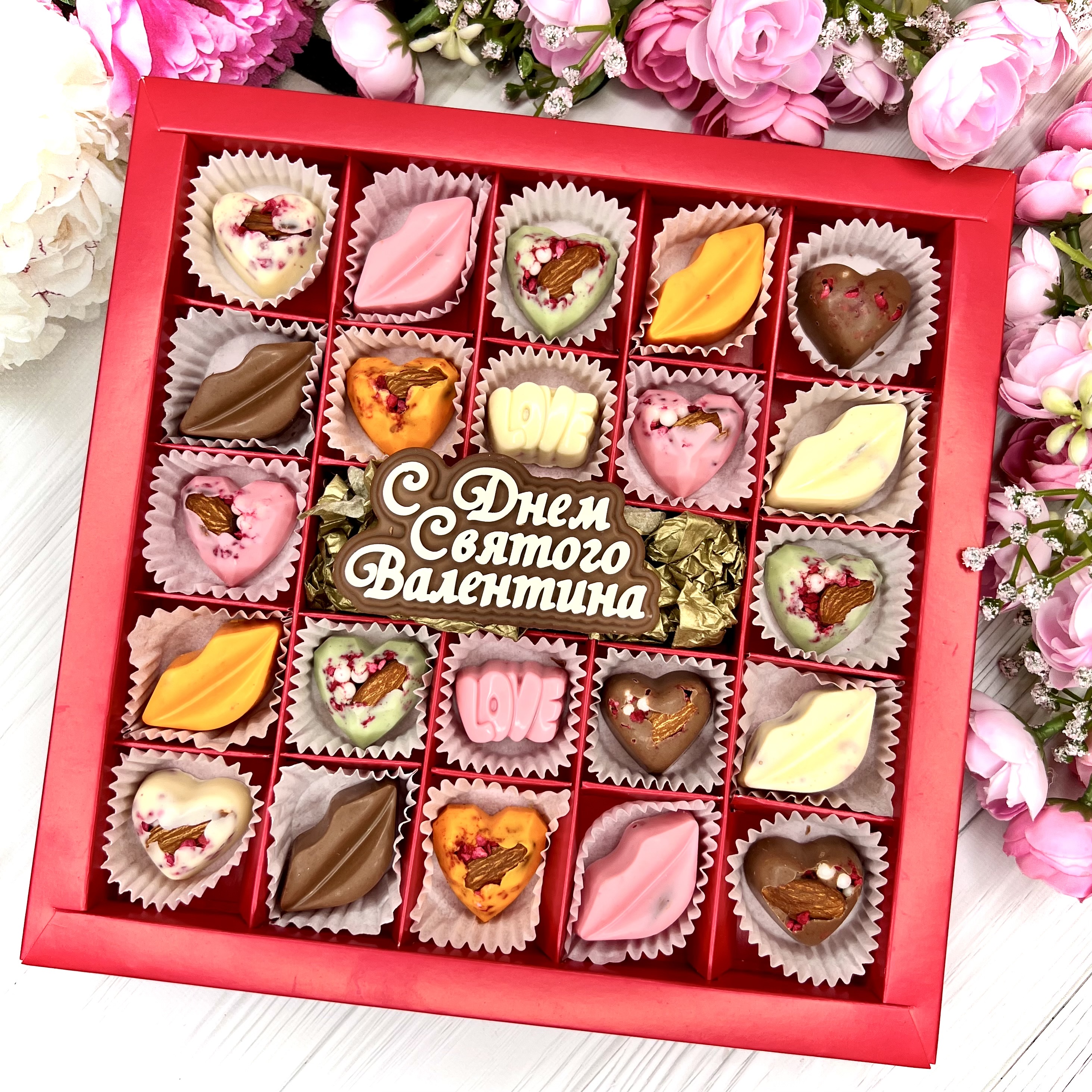 Шоколадный набор "С Днем Святого Валентина": шоколадка-надпись и 22 конфеты ручной работы - оригинальный и вкусный подарок на День Святого Валентина - 14 февраля - из швейцарского и бельгийского шоколада.
