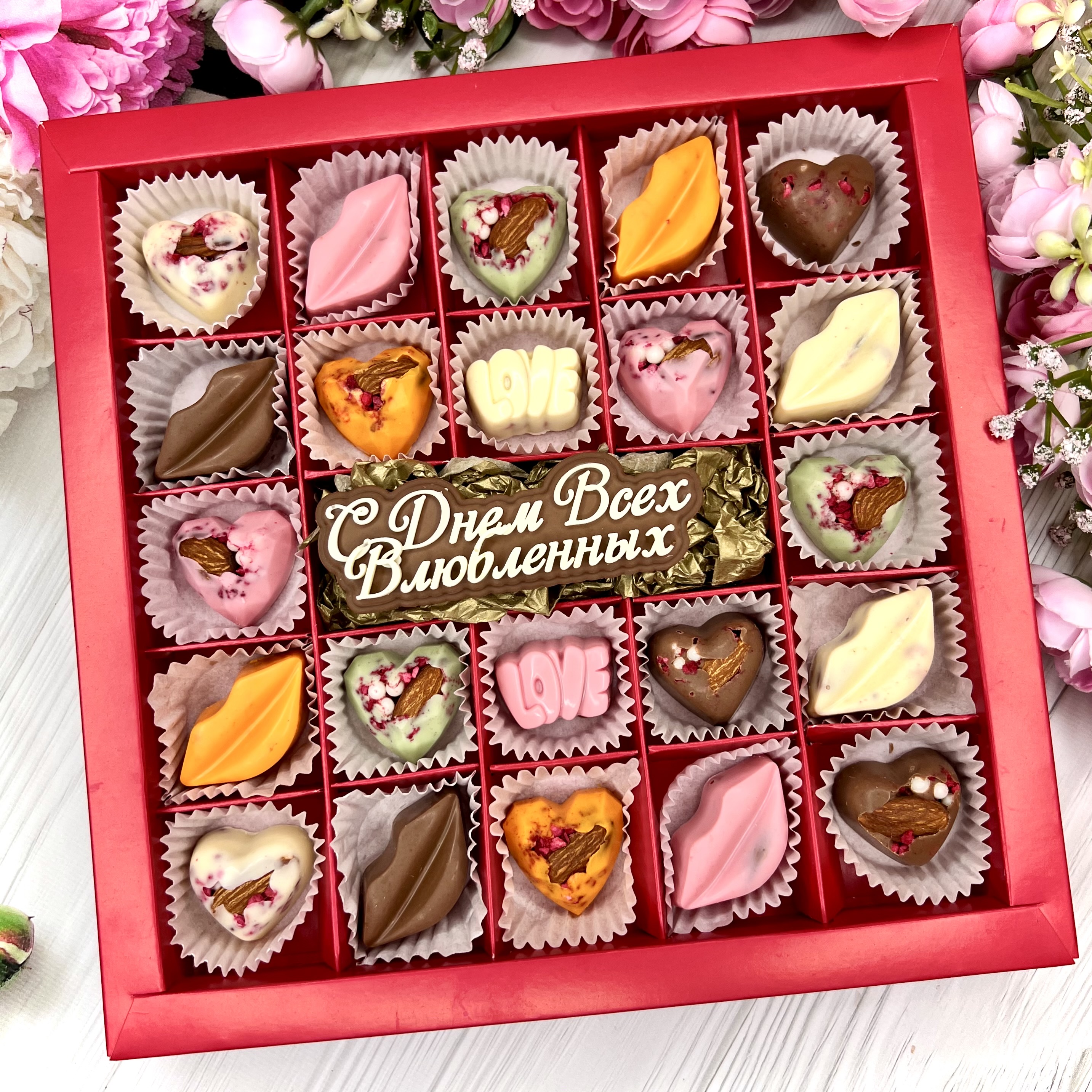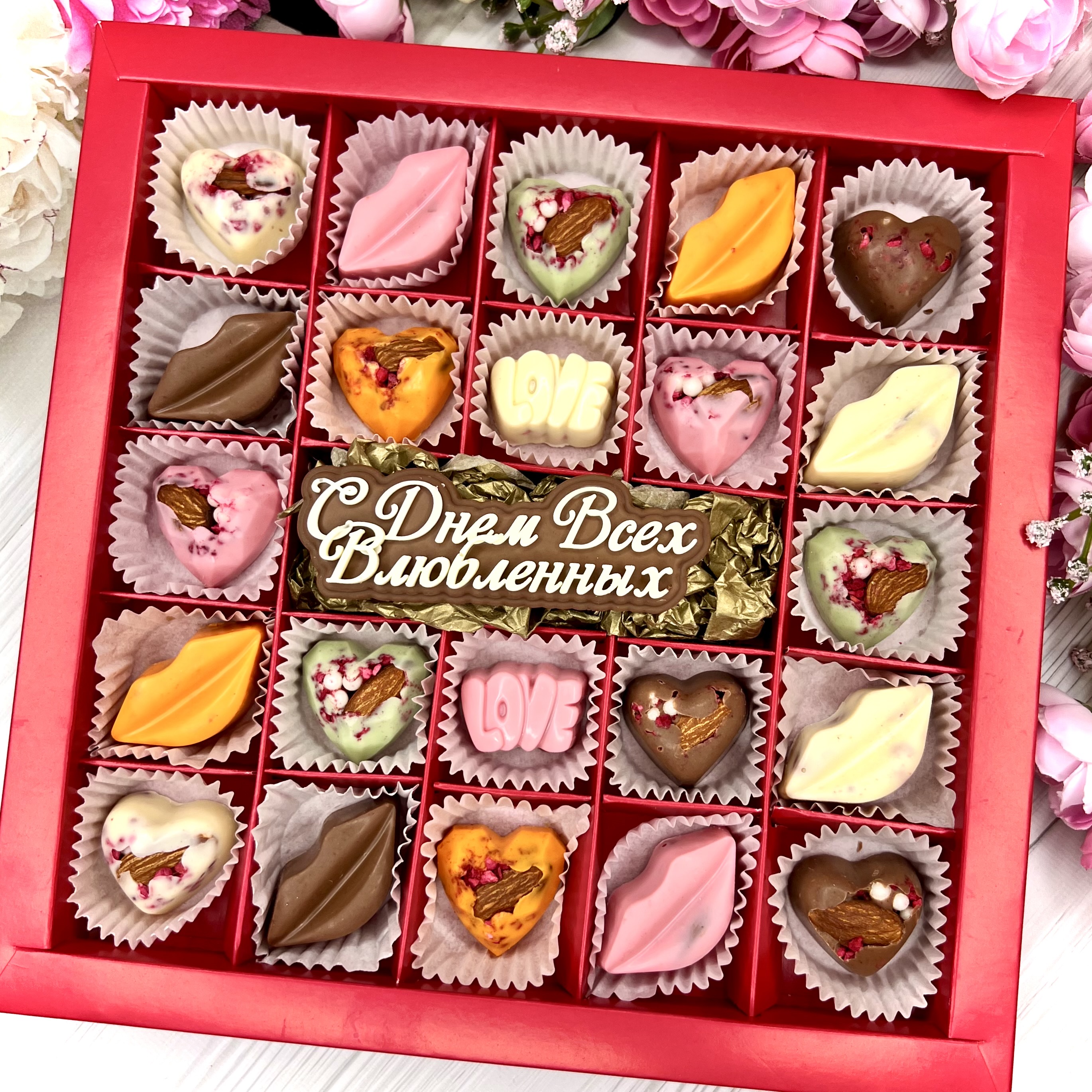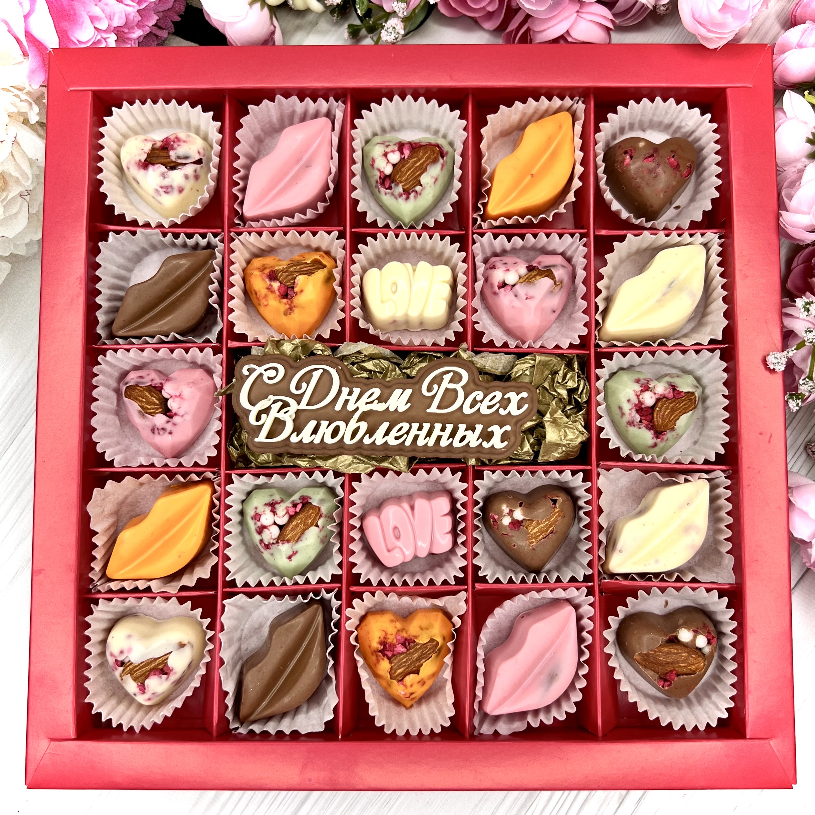 Шоколадный набор "С Днем Всех Влюбленных ": шоколадка-надпись и 22 конфеты ручной работы - оригинальный и вкусный подарок на День Святого Валентина - 14 февраля - из швейцарского и бельгийского шоколада.