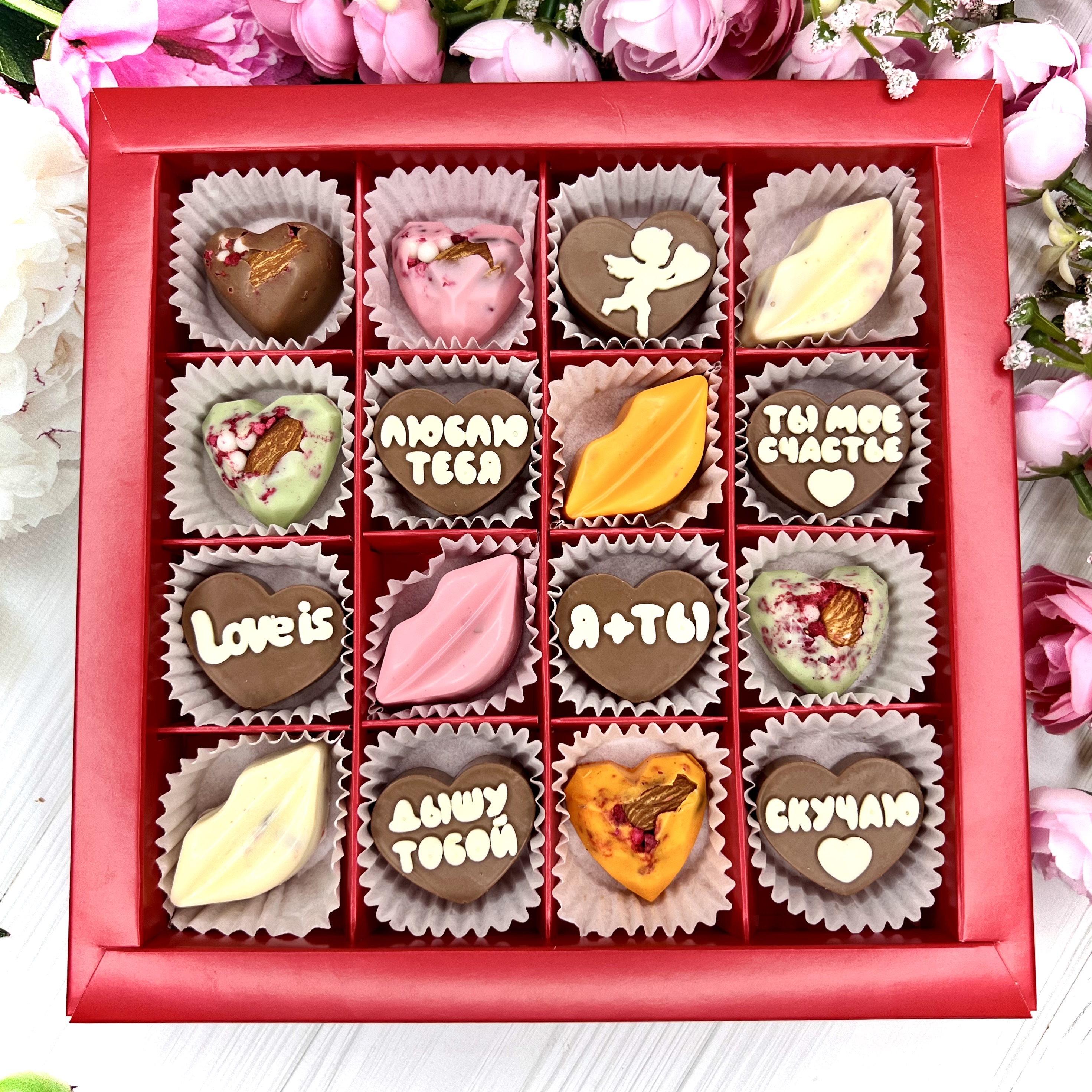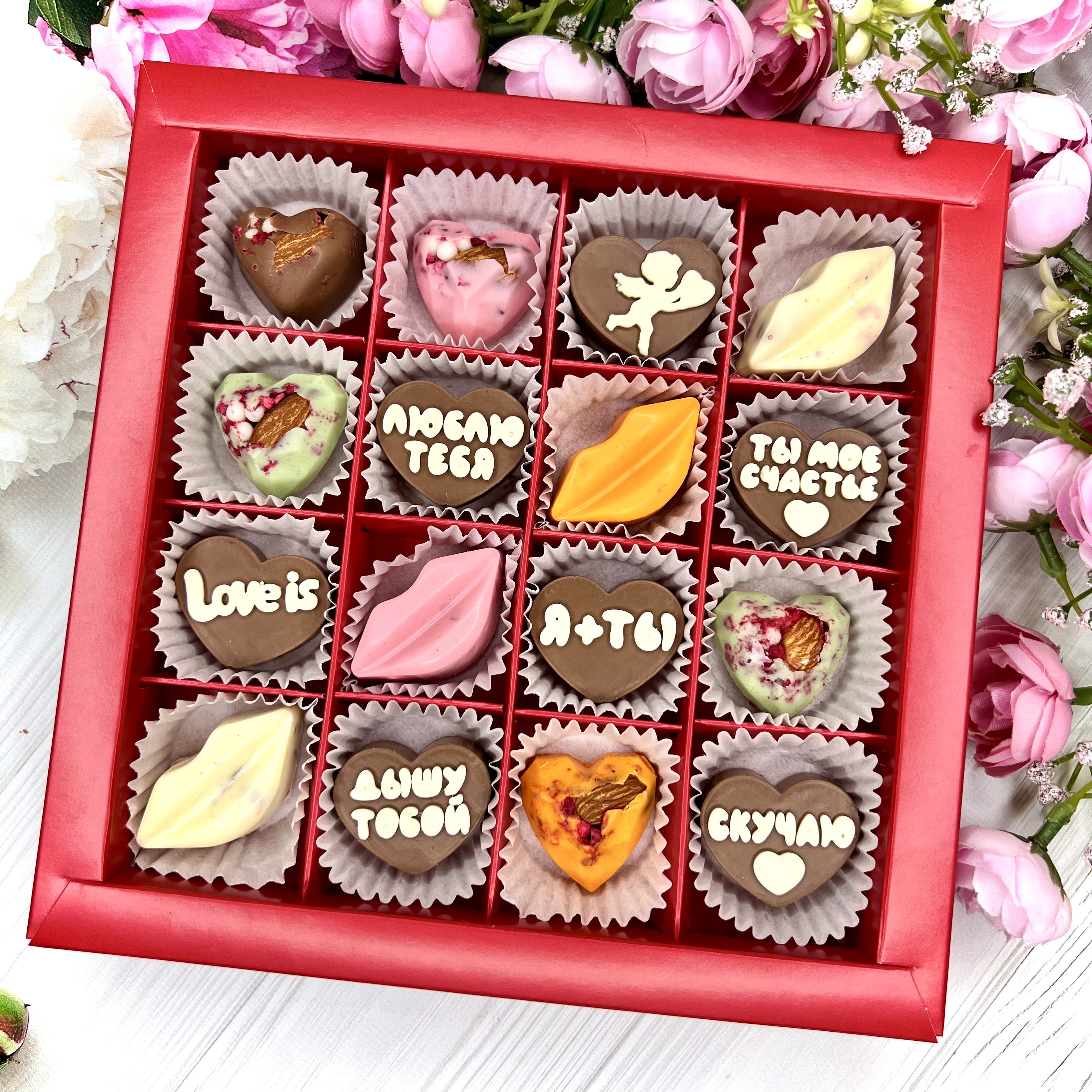 Шоколадный подарок "Любовь": 16 конфет ручной работы - оригинальный и вкусный подарок из бельгийского и швейцарского шоколада на День Влюбленных.