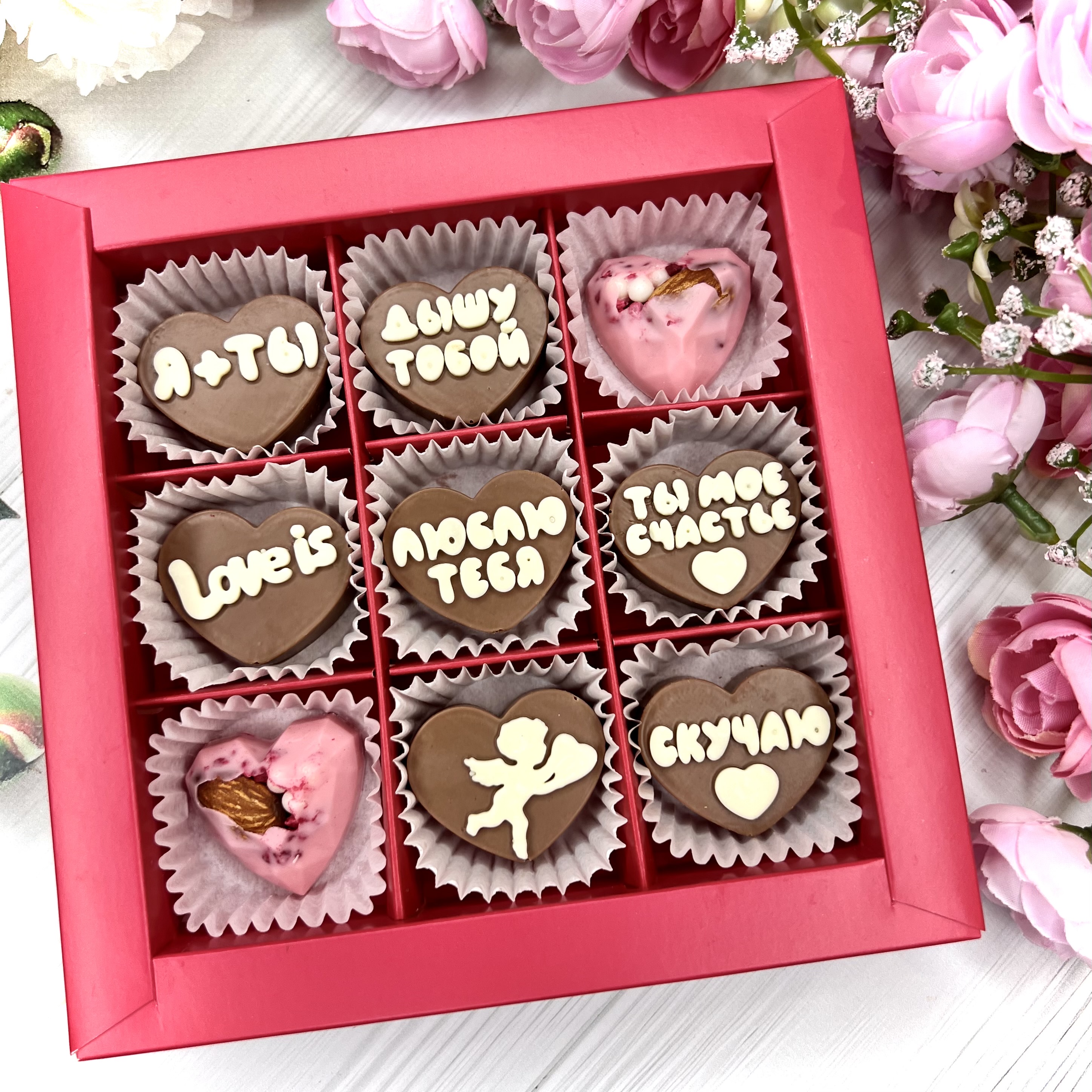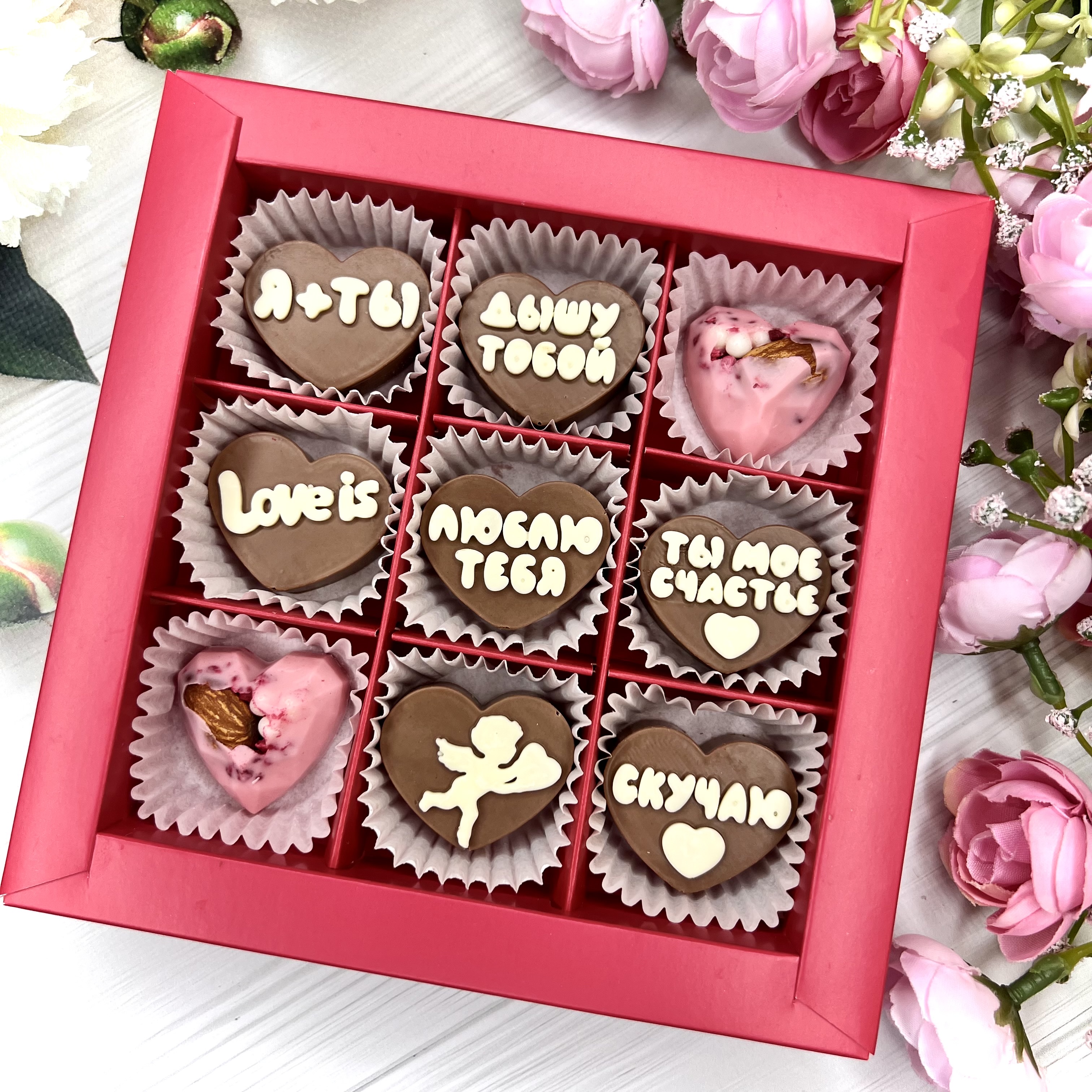 Шоколадный подарок "Любовь": 9 конфет ручной работы - оригинальный и вкусный подарок из бельгийского и швейцарского шоколада на День Влюбленных.