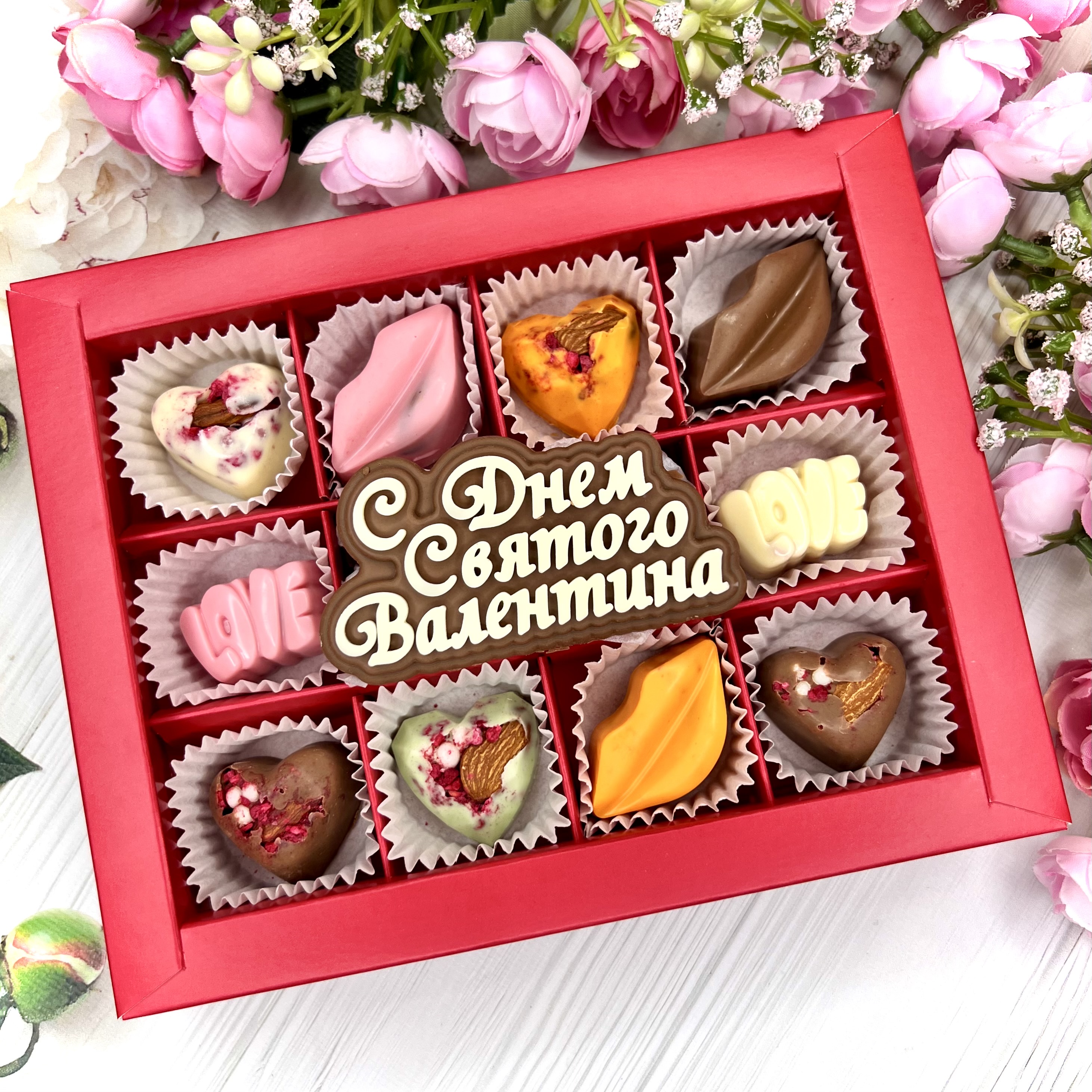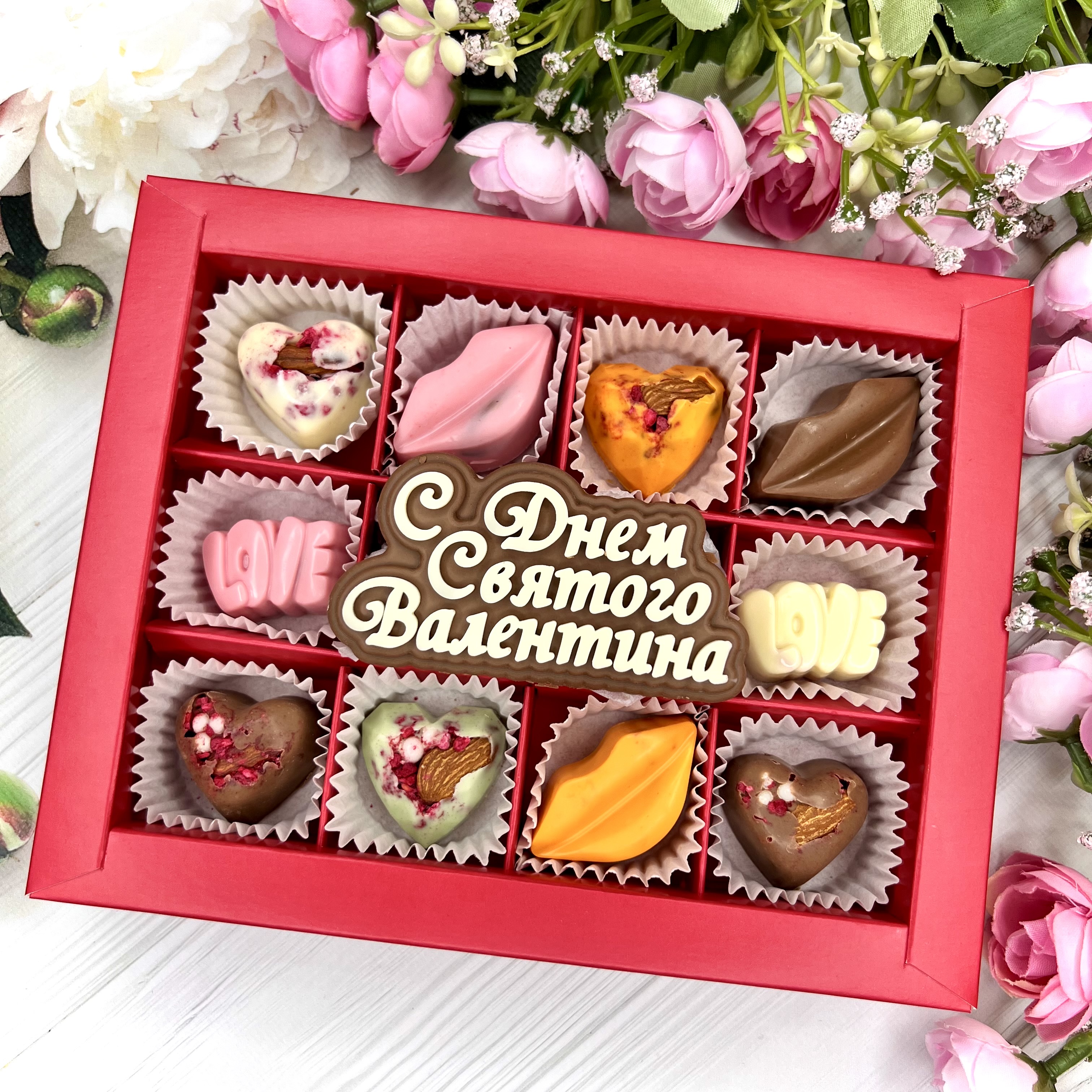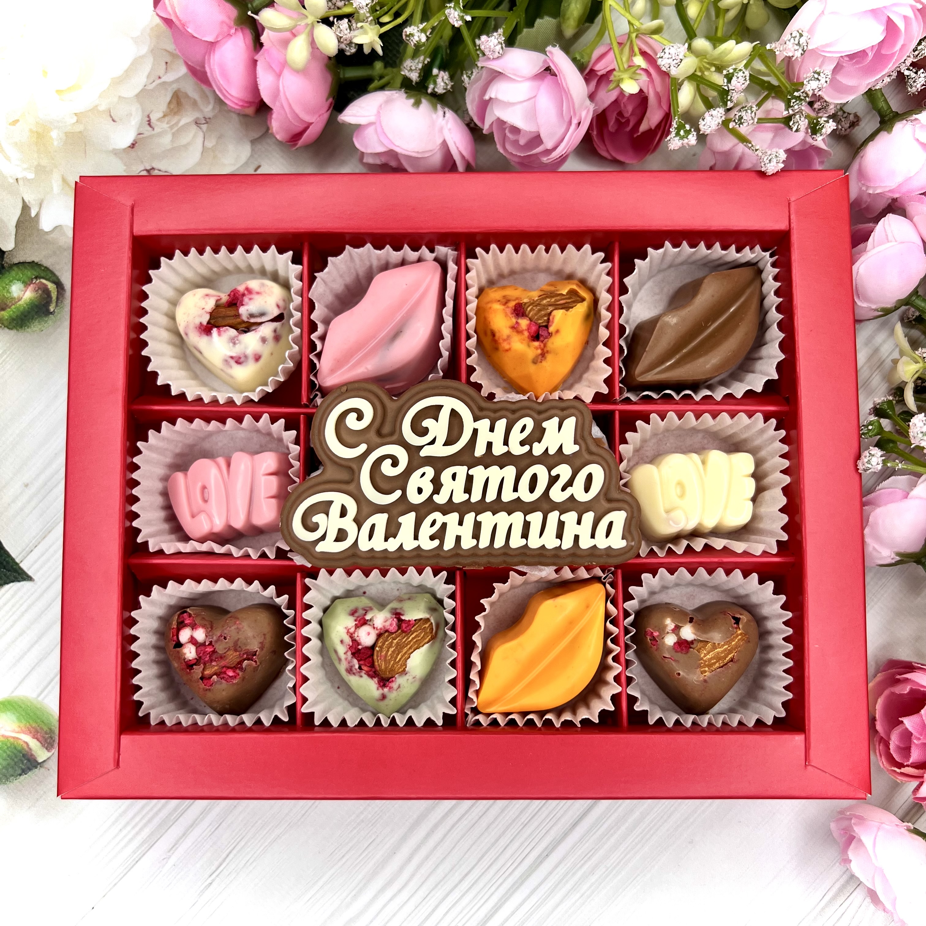 Шоколадный подарок "С Днём Святого Валентина": шоколадка-надпись и 10 конфет ручной работы - оригинальный и вкусный подарок на День Влюбленных из швейцарского и бельгийского шоколада.