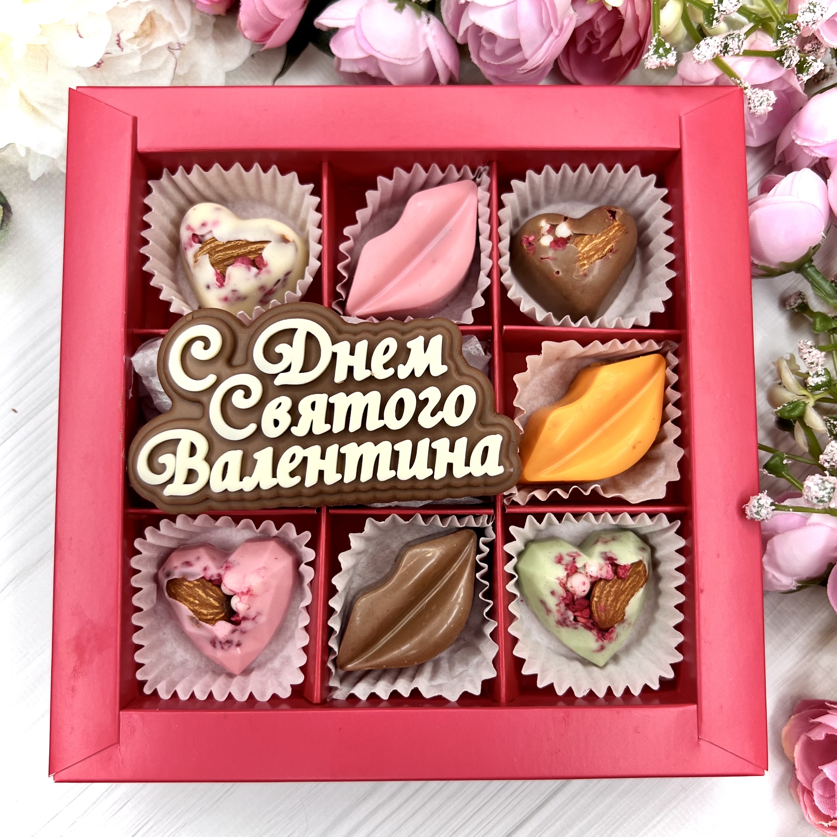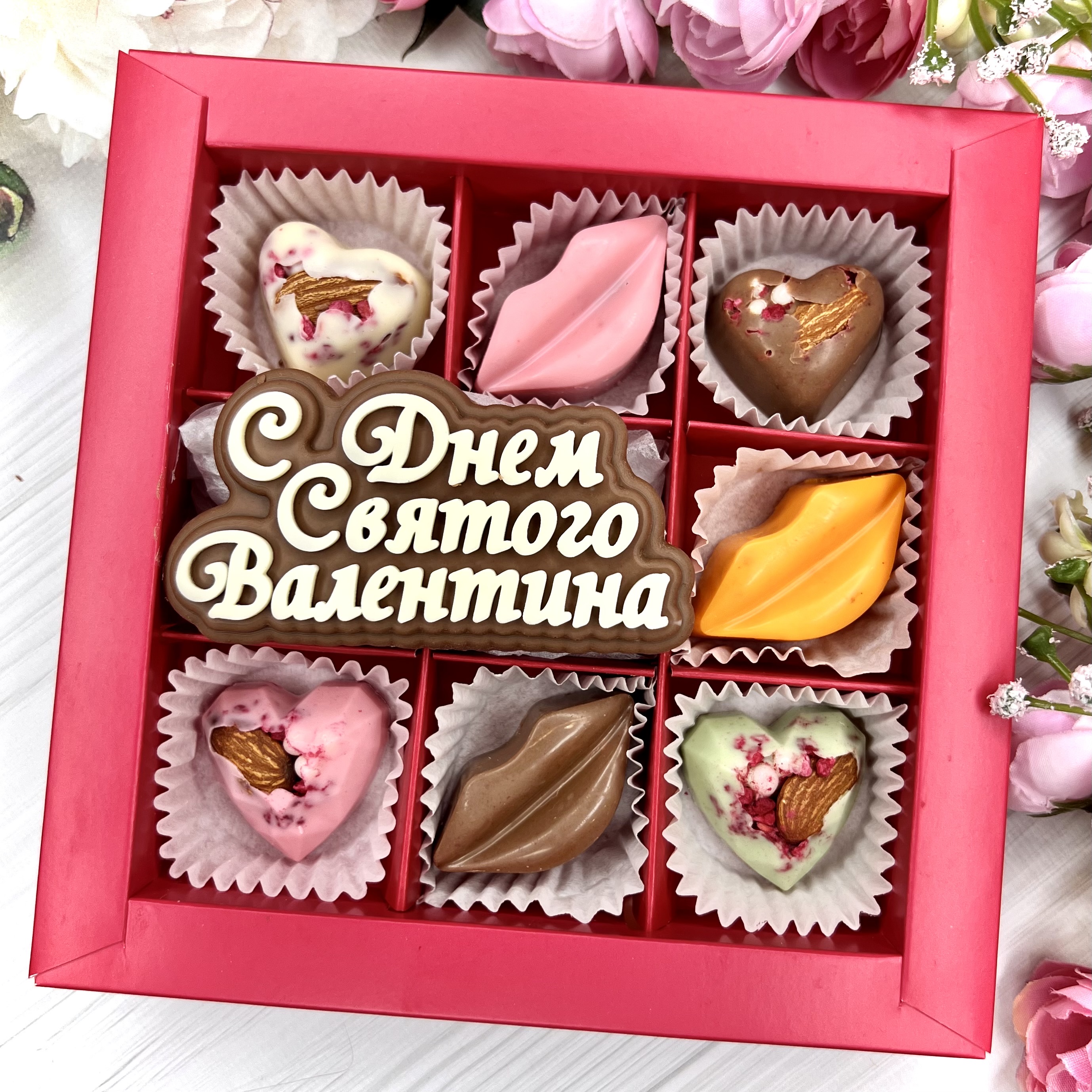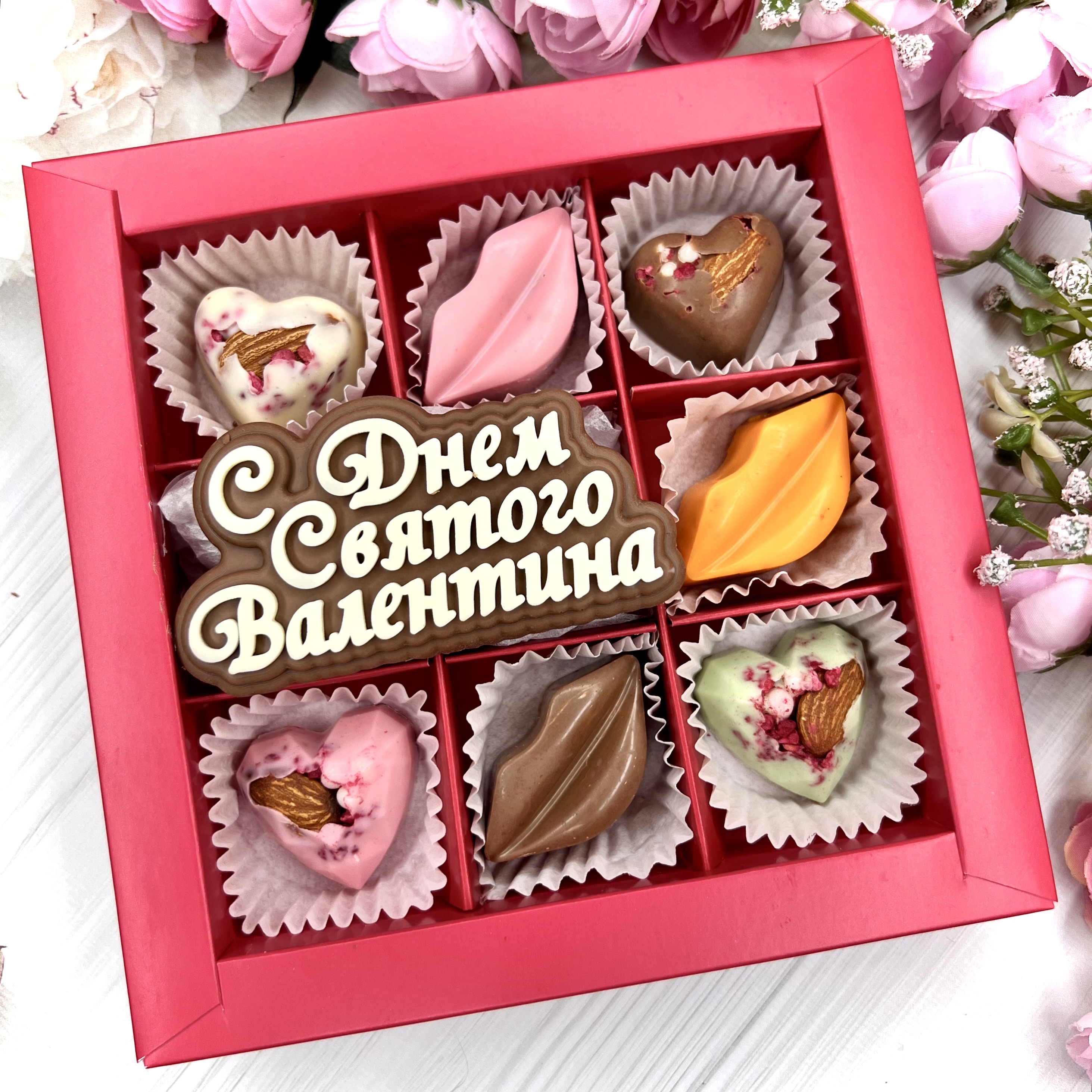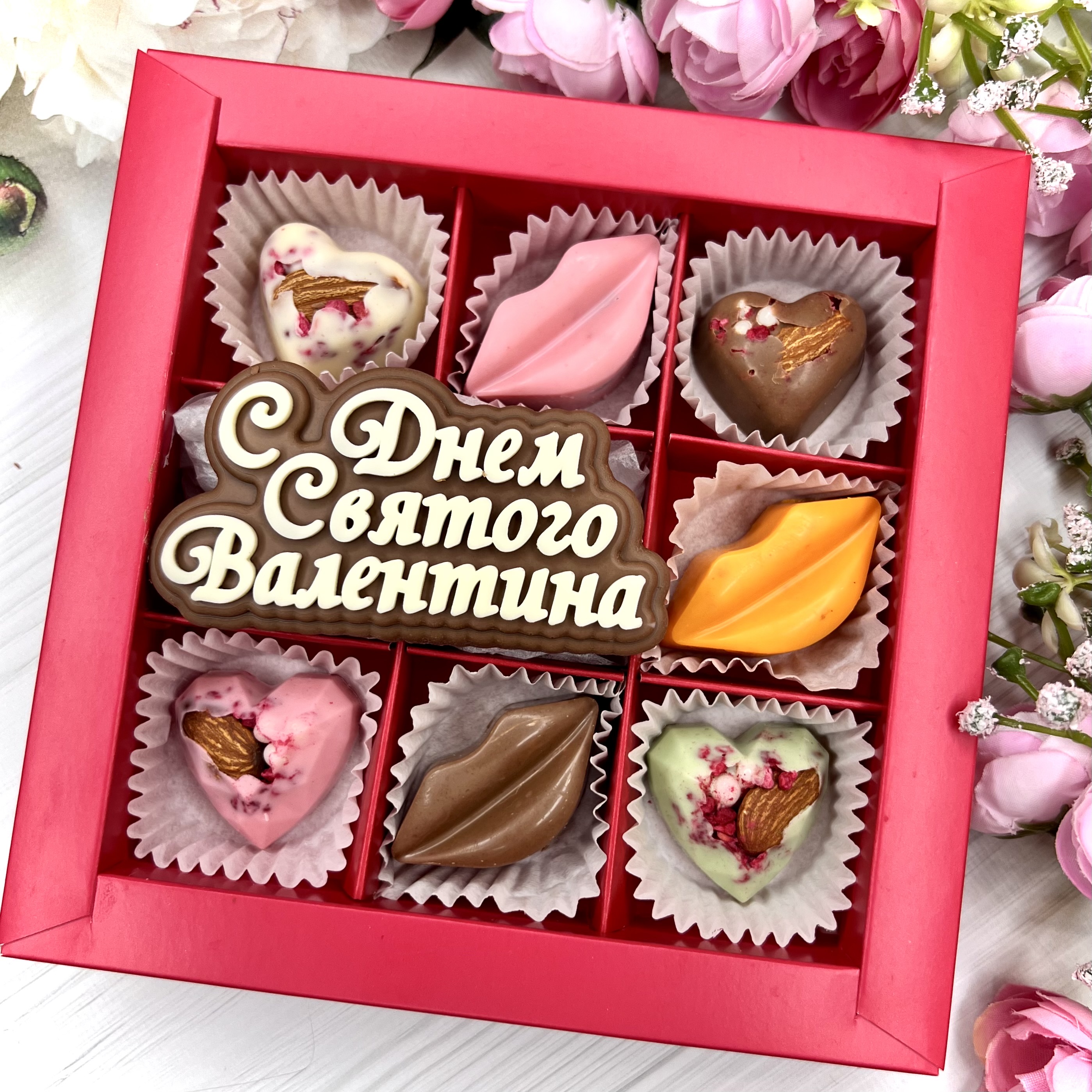 Шоколадный подарок "С Днём Святого Валентина": шоколадка-надпись и 7 конфет ручной работы - оригинальный и вкусный подарок на День Влюбленных из швейцарского и бельгийского шоколада.