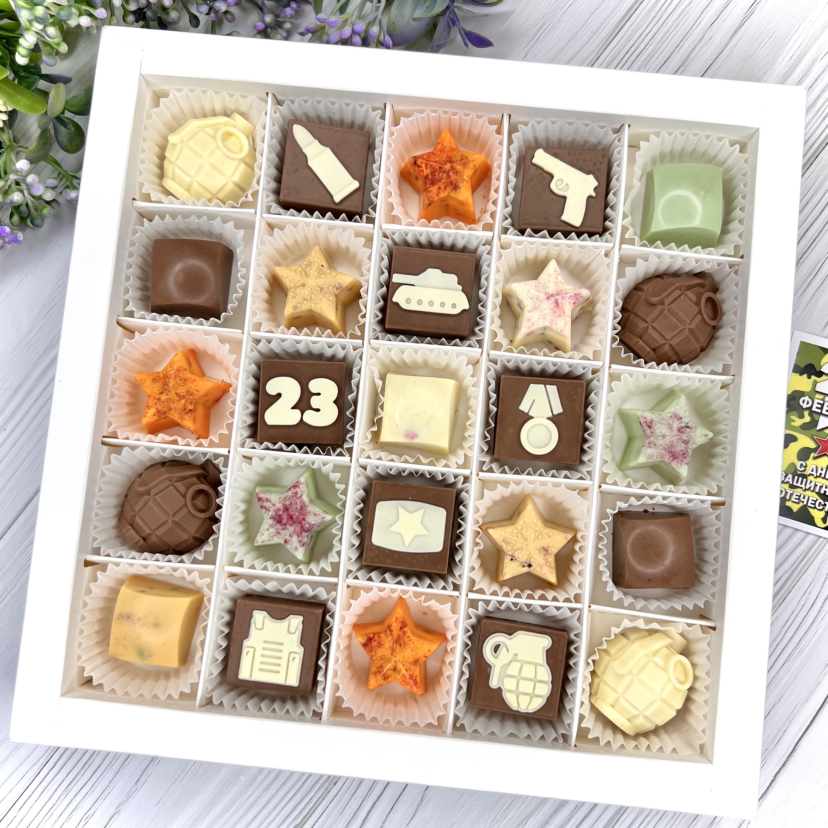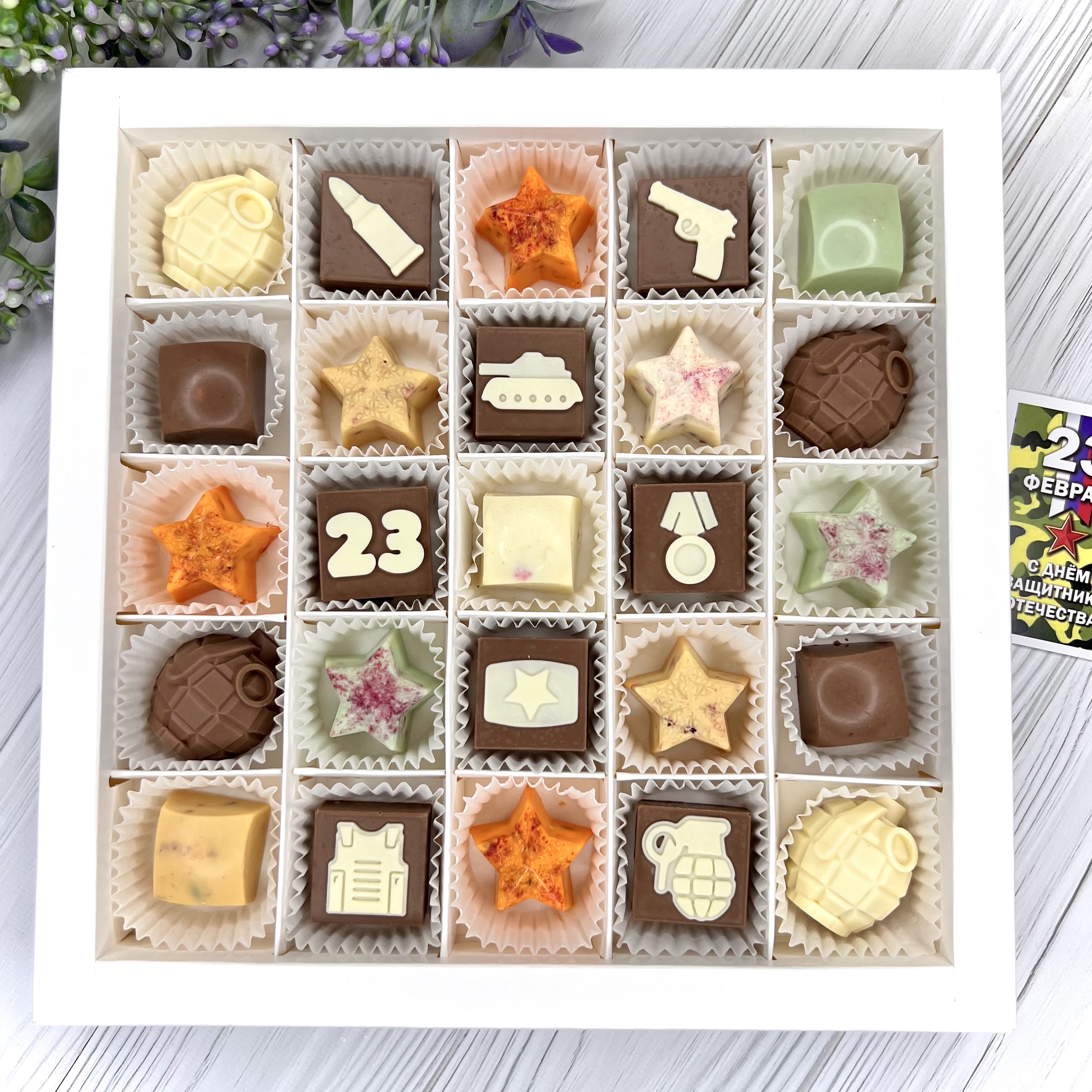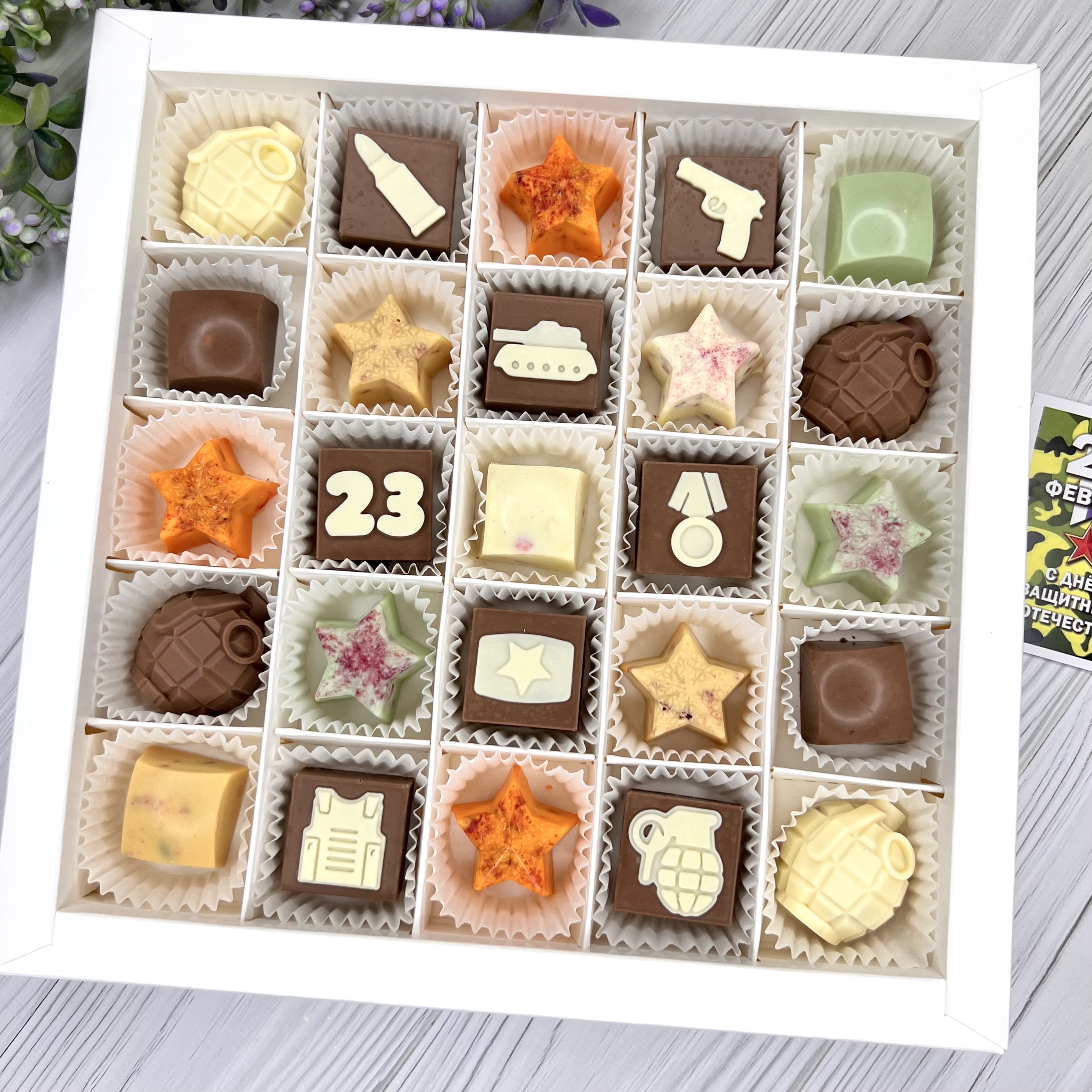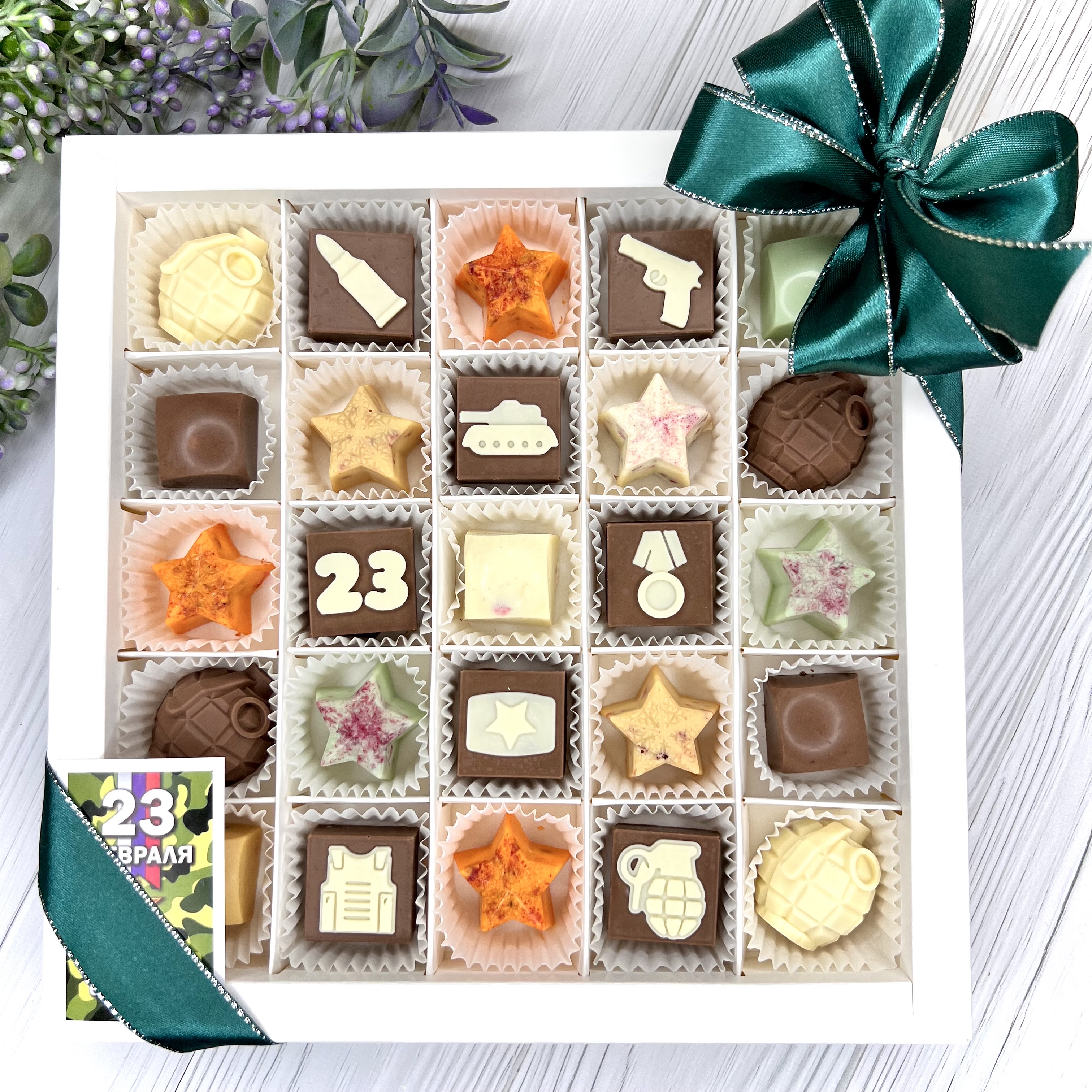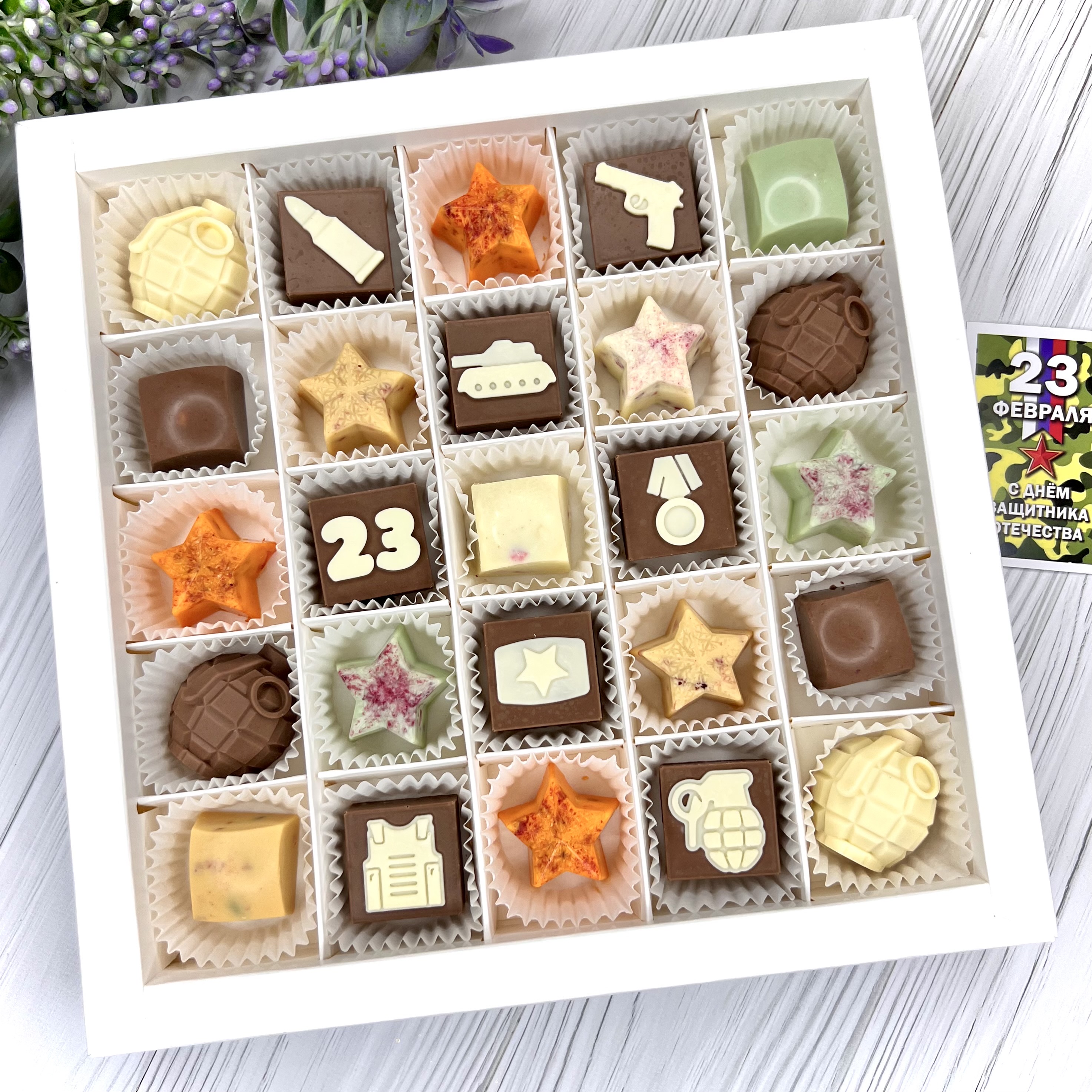 Шоколадный набор "23 февраля: 25 конфет ручной работы" - вкусный и оригинальный подарок на День Защитника Отечества.