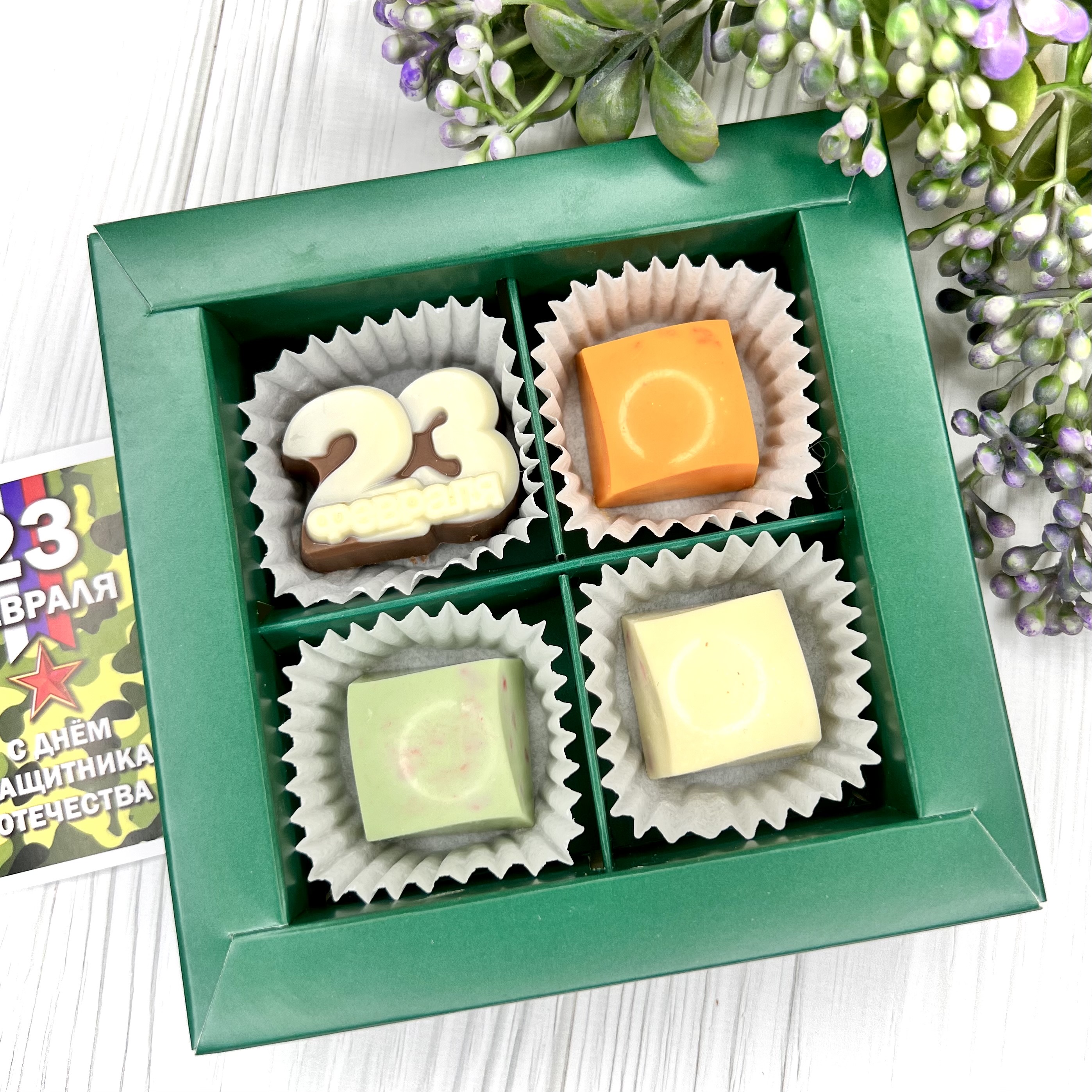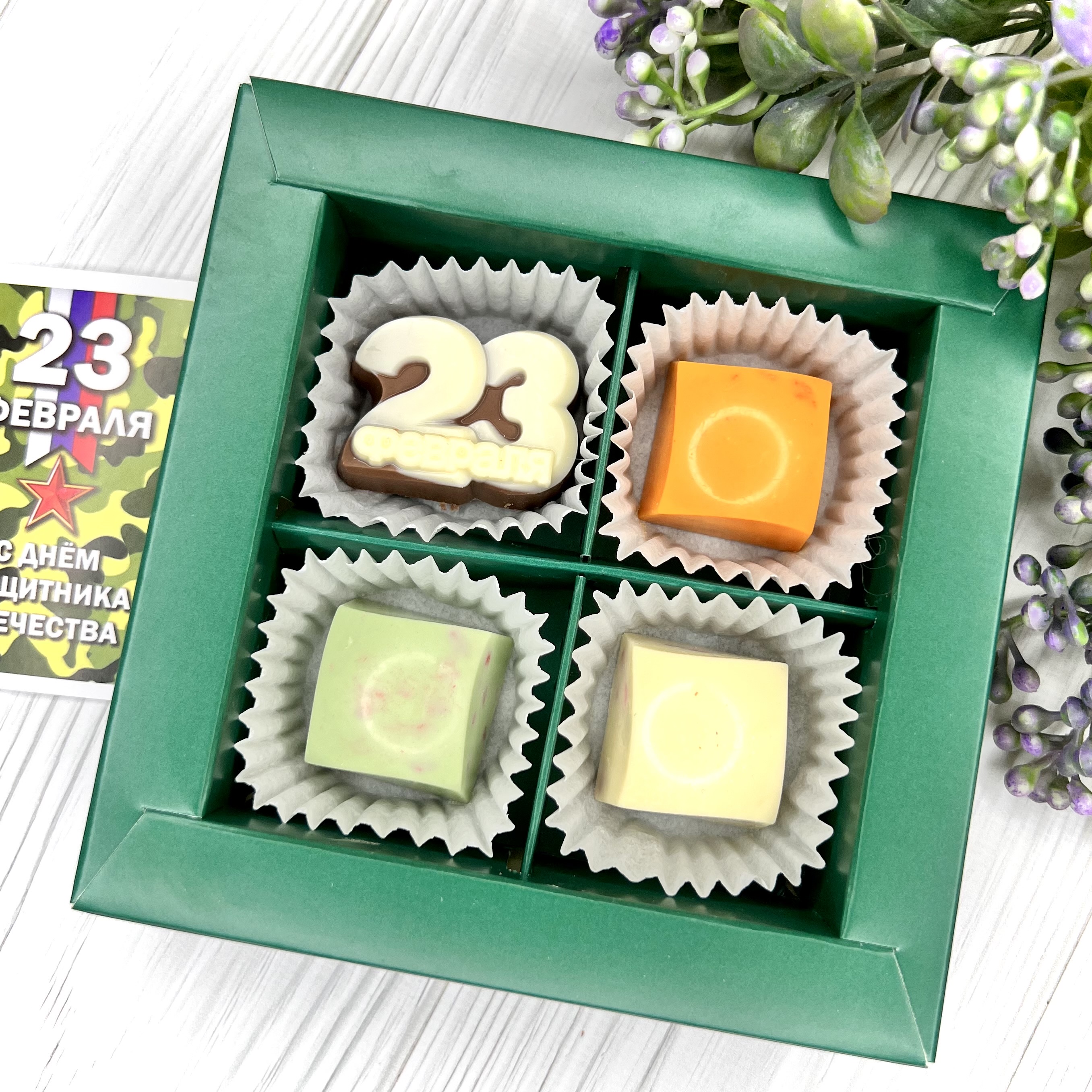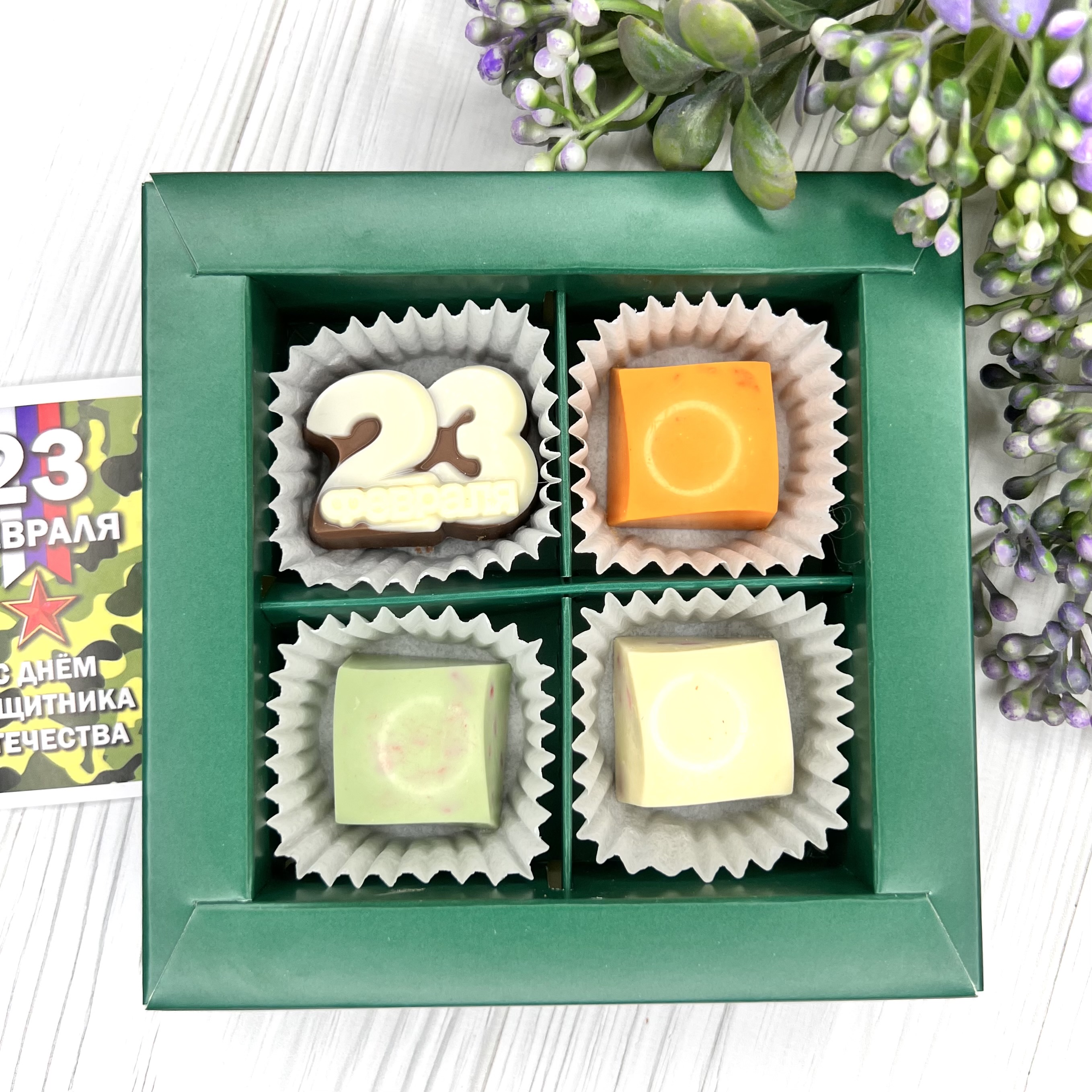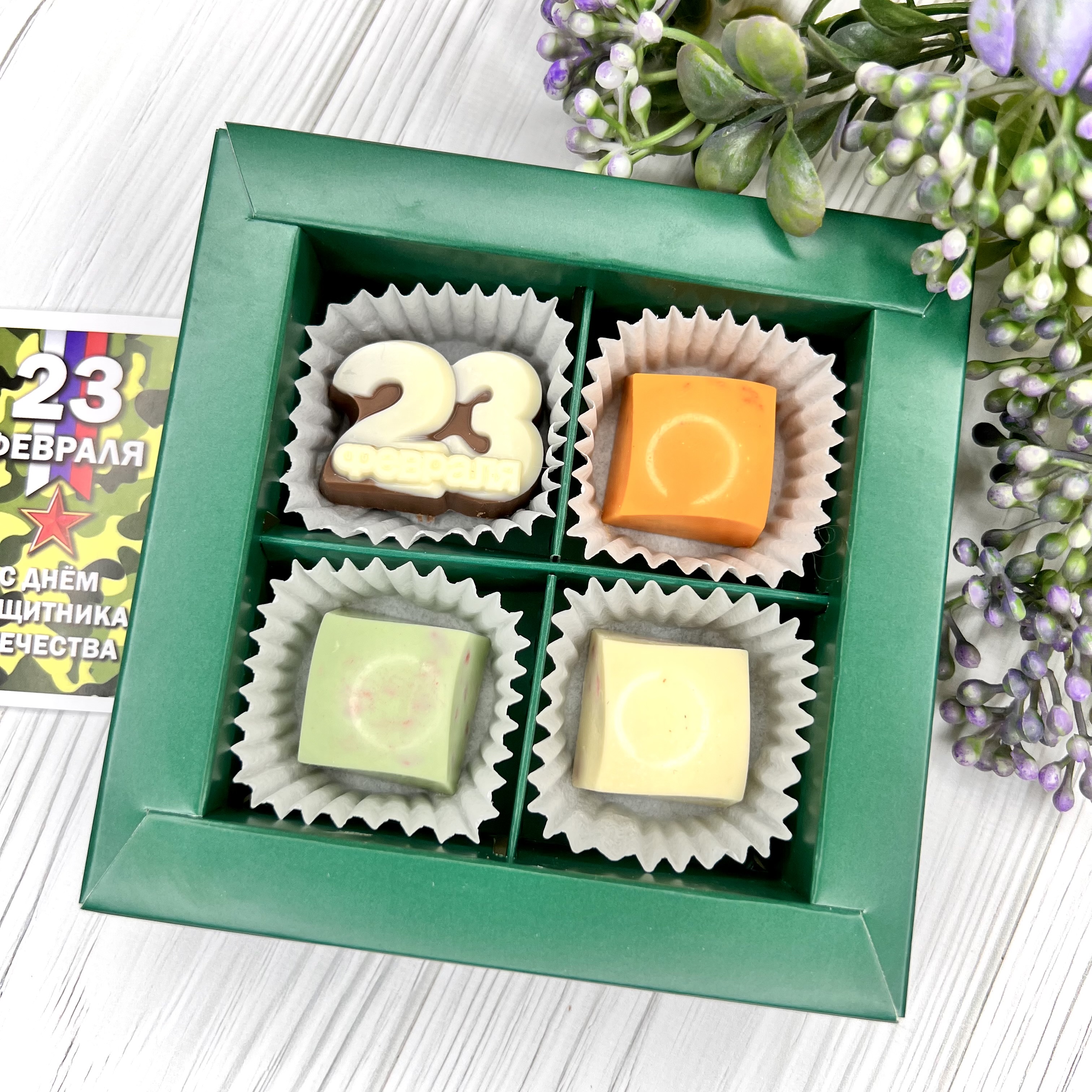 Шоколадный набор "23 февраля: 4 конфеты ручной работы" - вкусный и оригинальный подарок на День Защитника Отечества - 14 февраля