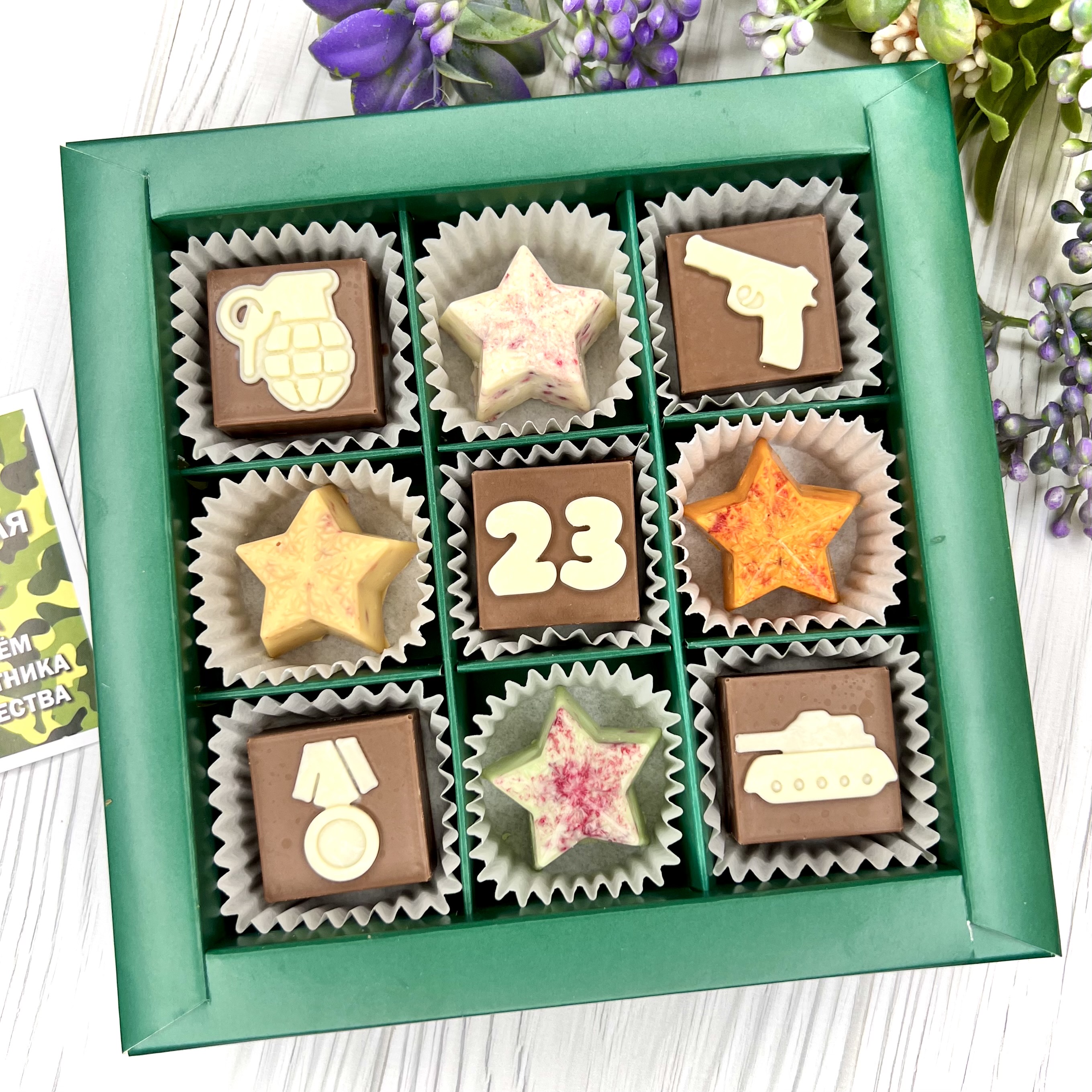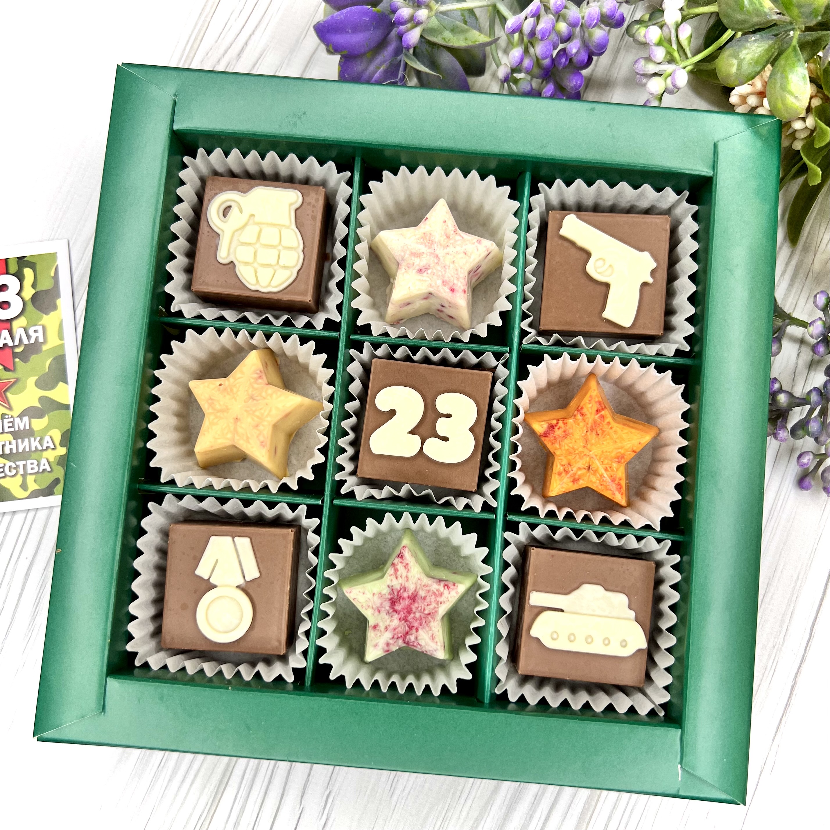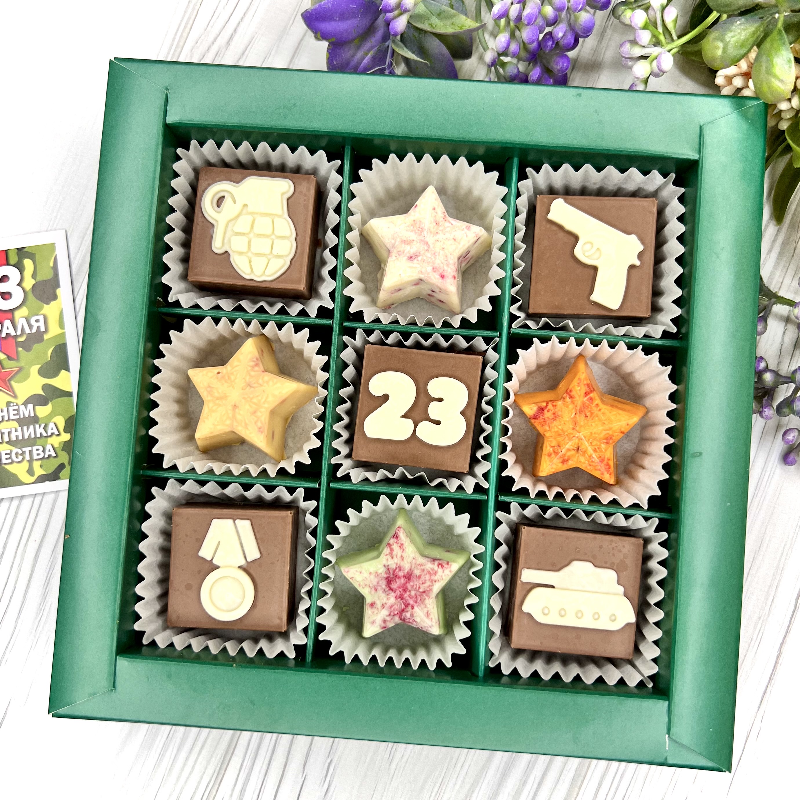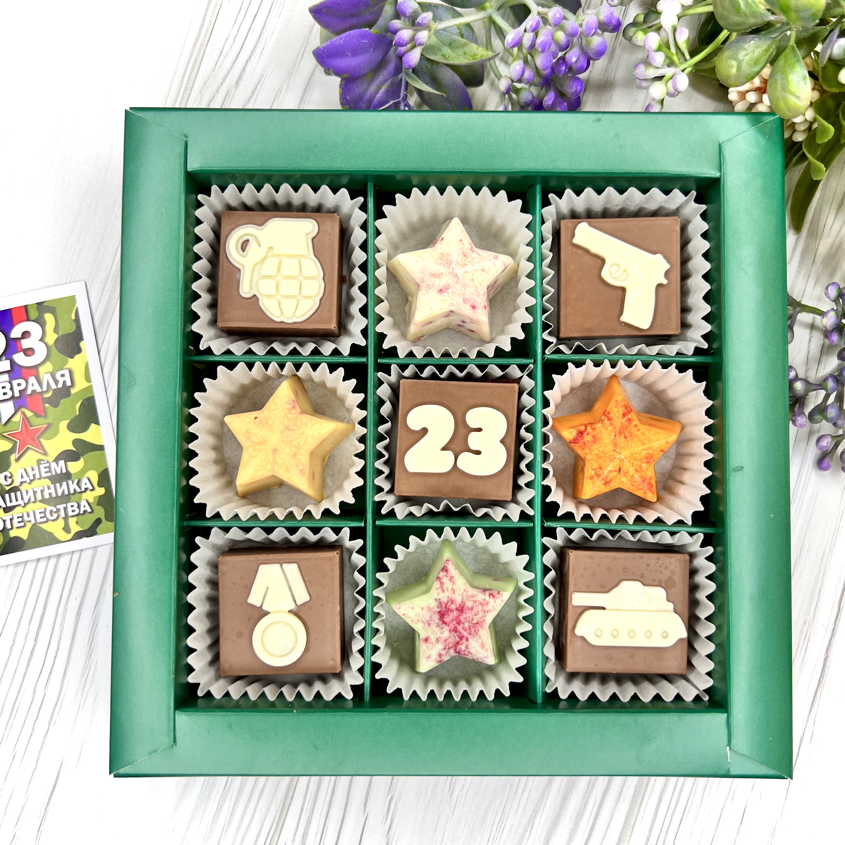 Шоколадный набор "23 февраля": 9 конфет ручной работы - вкусный и оригинальный подарок на День Защитника Отечества.
