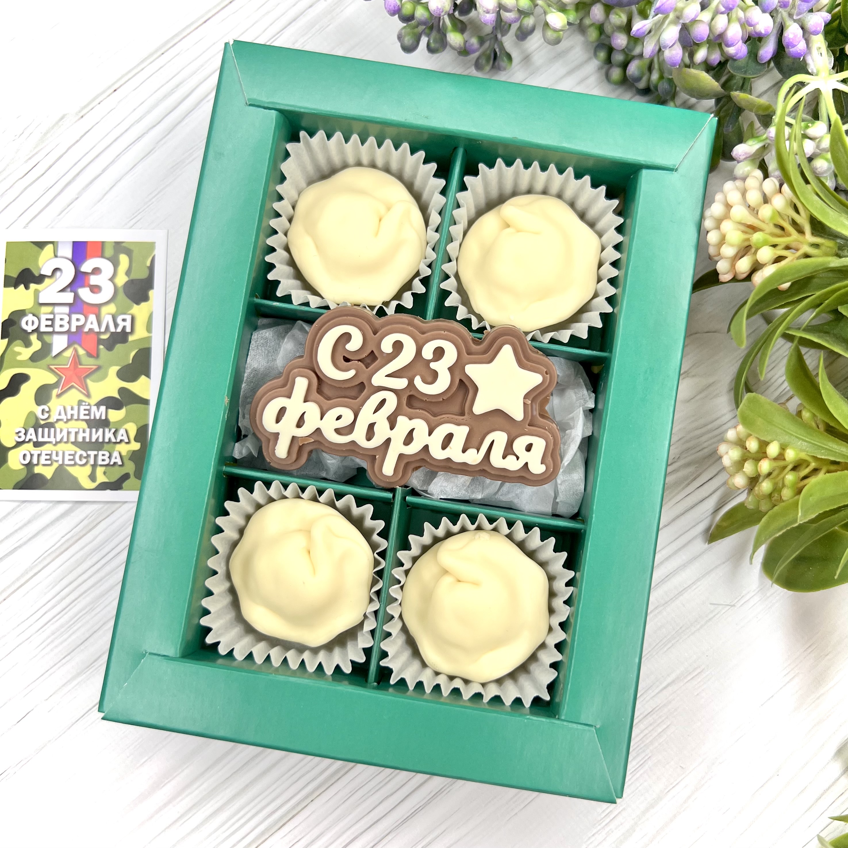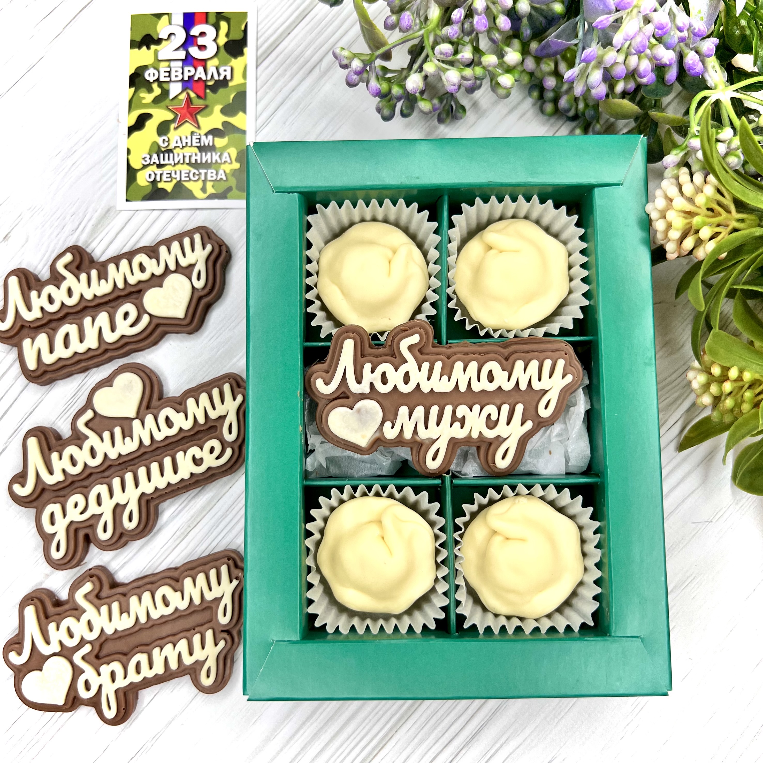 Шоколадный подарок "23 февраля. Пельмени": надпись и 4 конфеты ручной работы - оригинальный, достойный и поистине вкусный подарок на день защитника отечества.