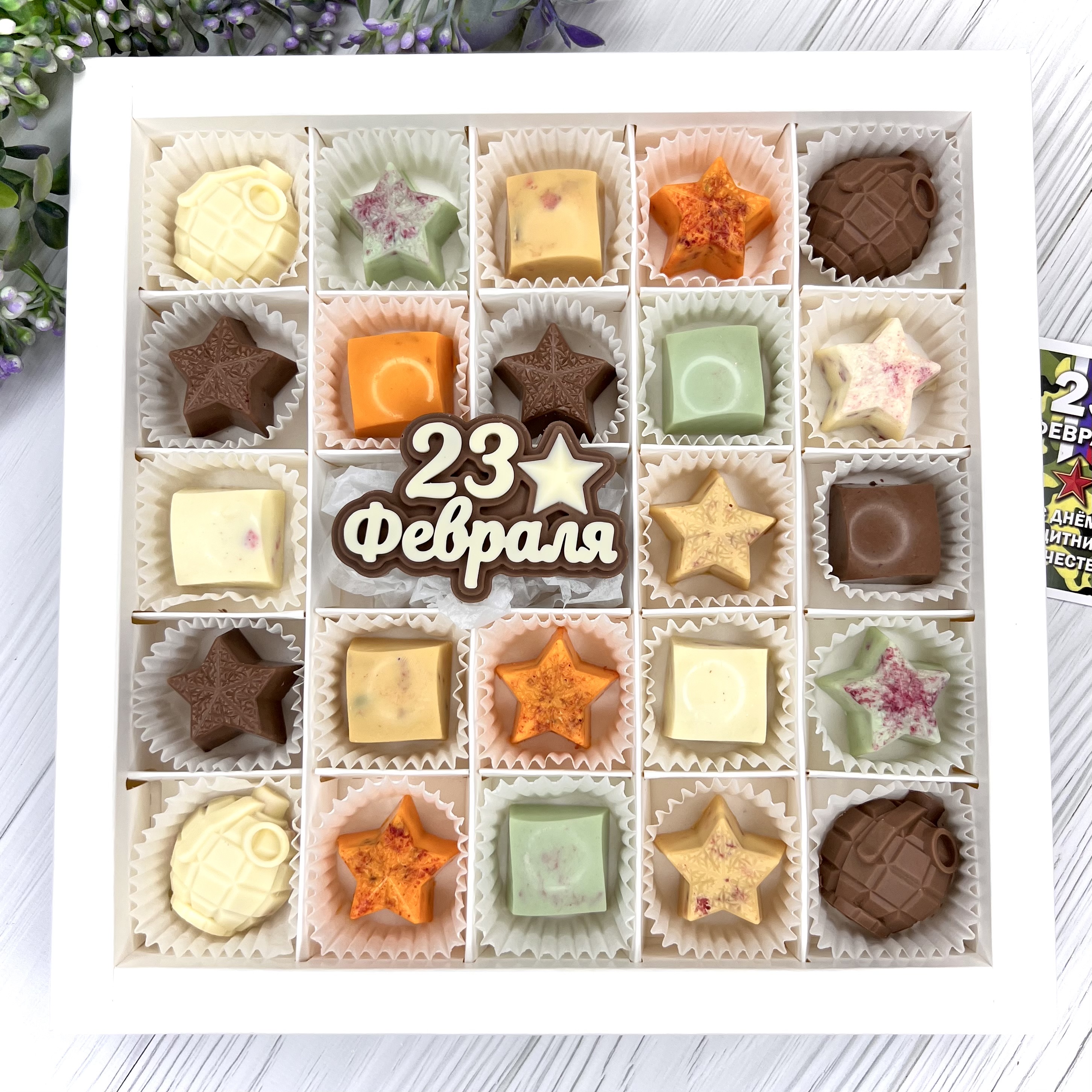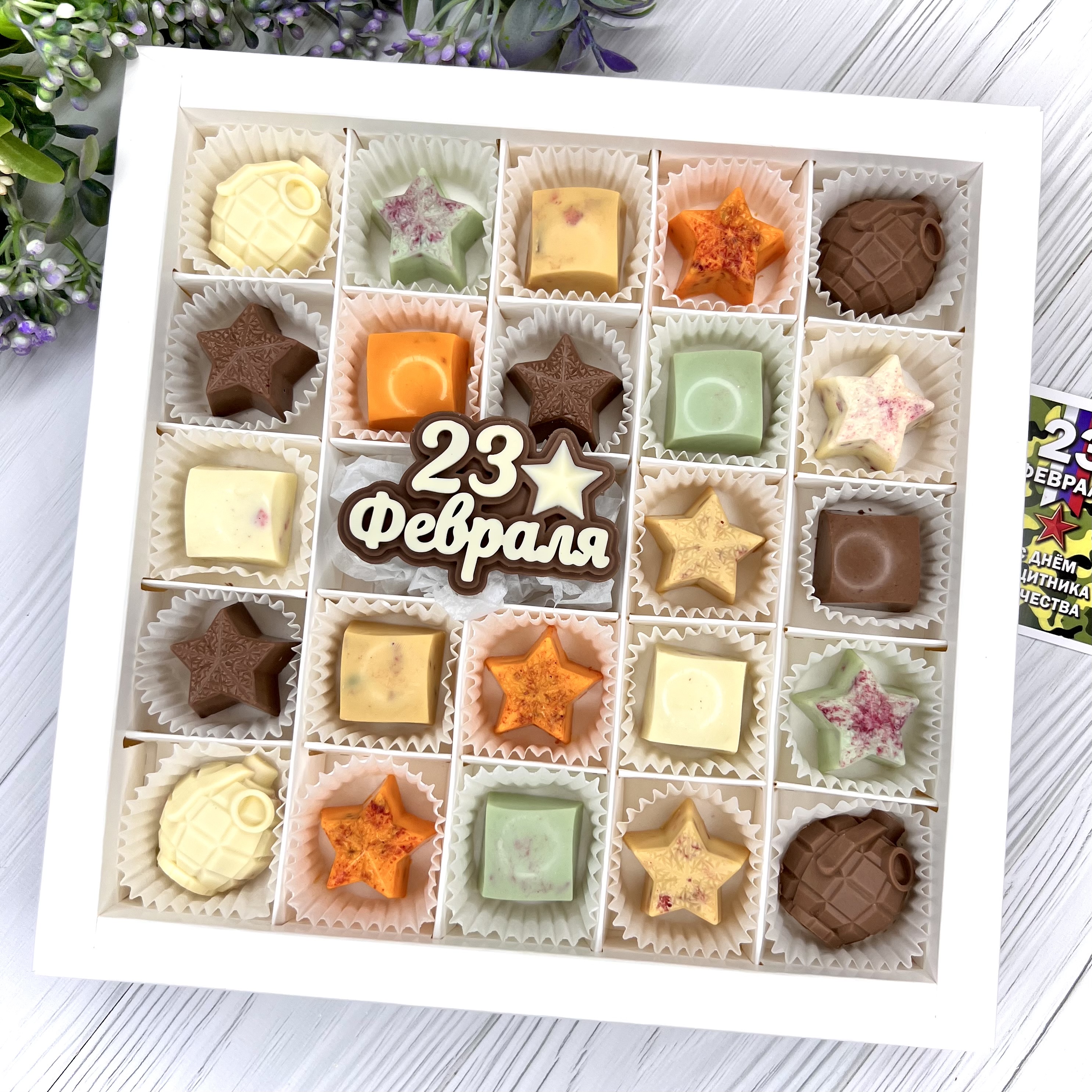 Шоколадный набор "23 февраля": шоколадка и 22 конфеты ручной работы - вкусный и оригинальный подарок на День Защитника Отечества.