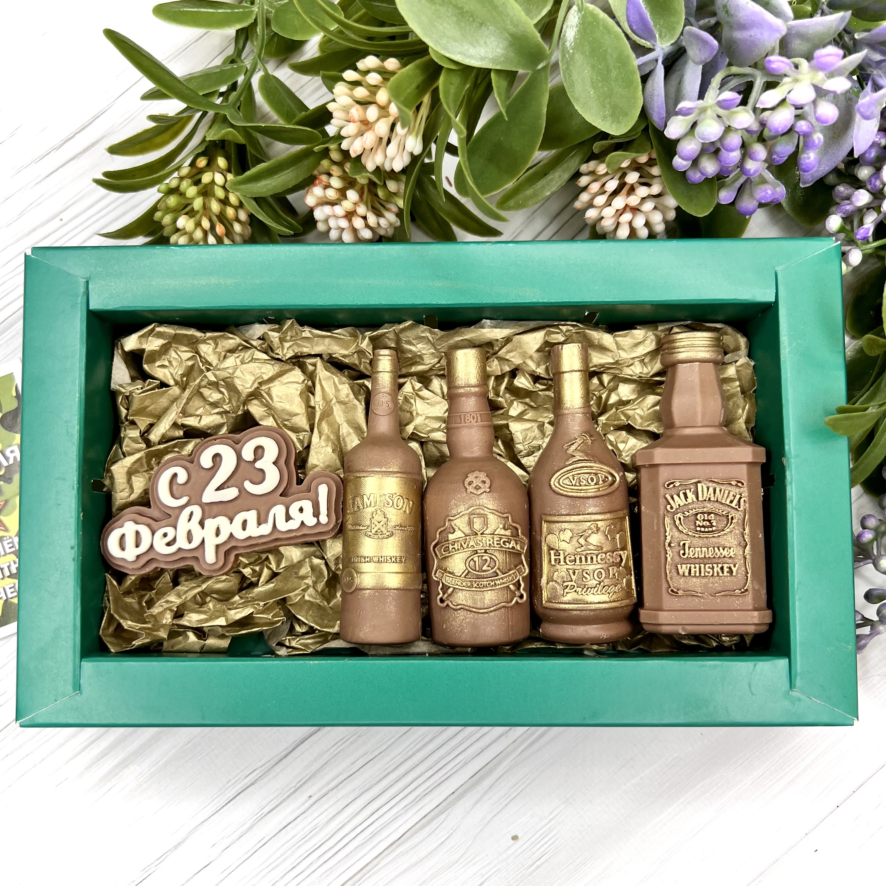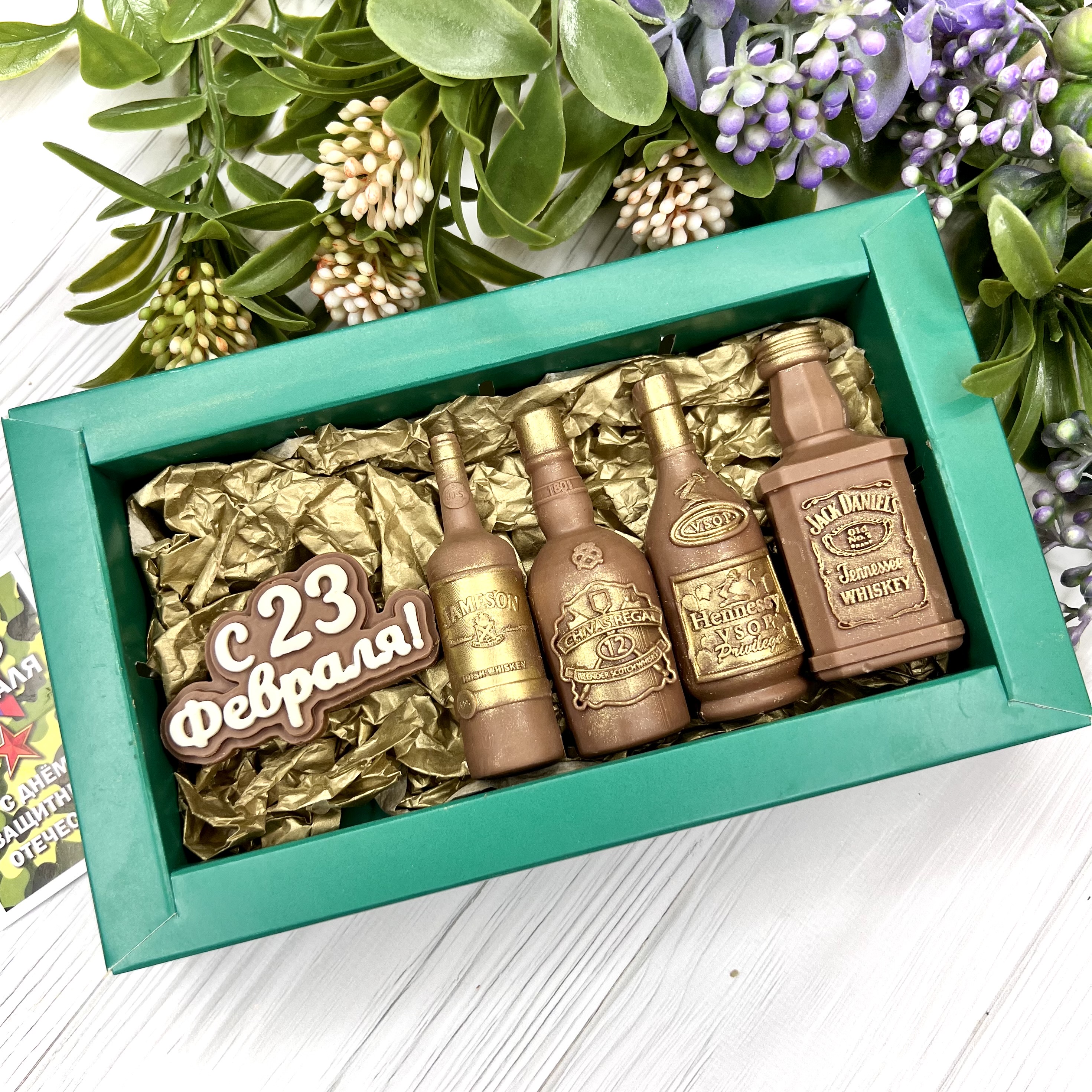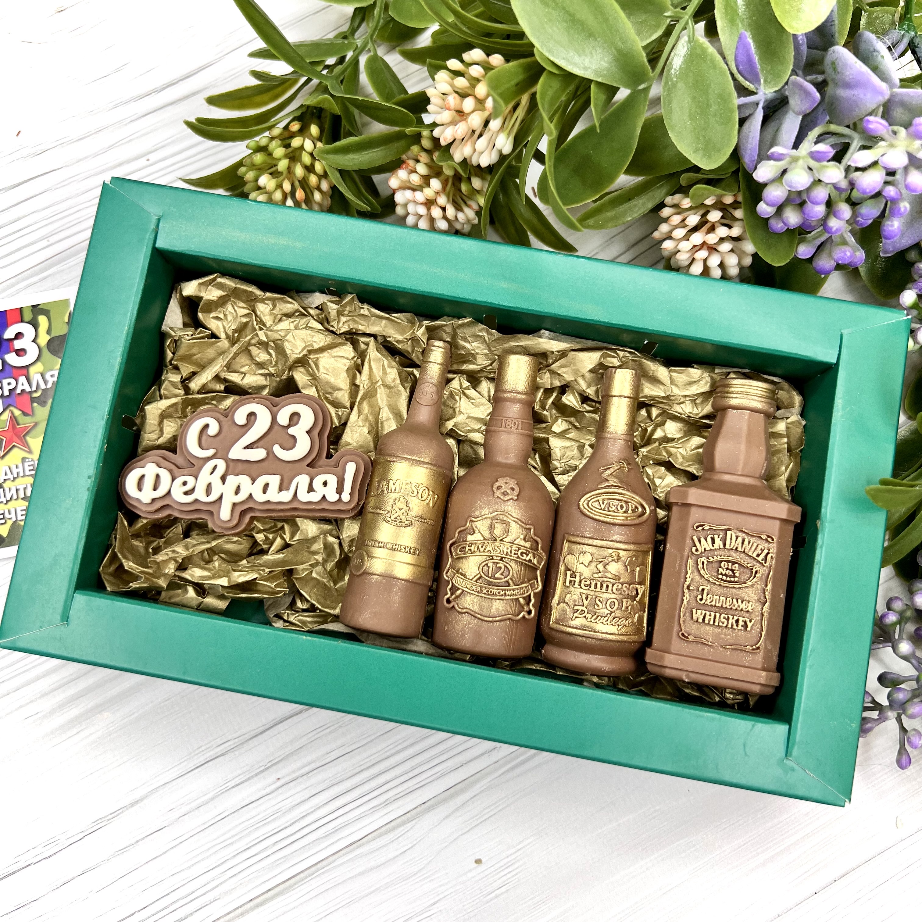 Шоколадный подарок "C 23 февраля. Бутылочки" - оригинальный, достойный и поистине вкусный подарок настоящему мужчине на День защитника Отечеству.