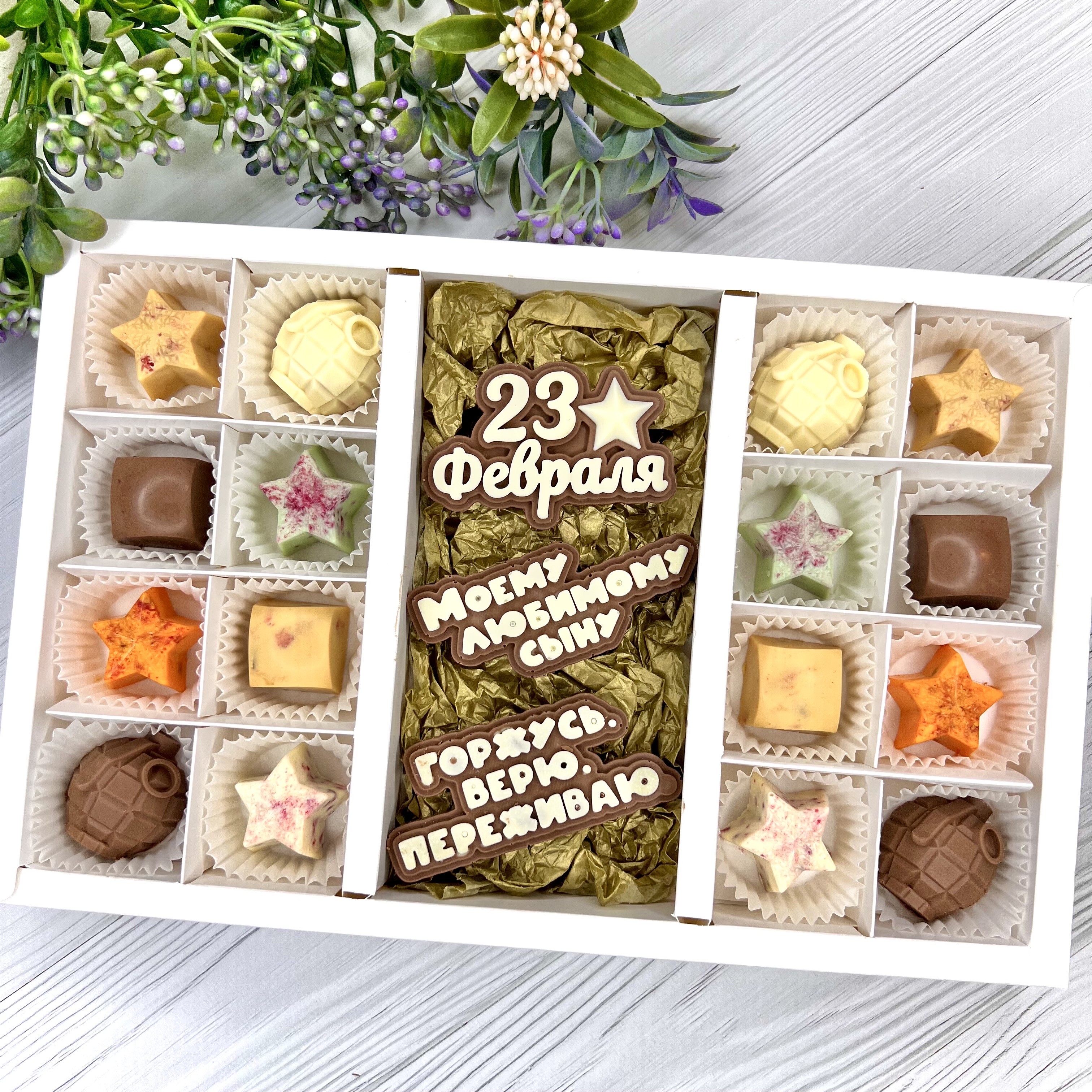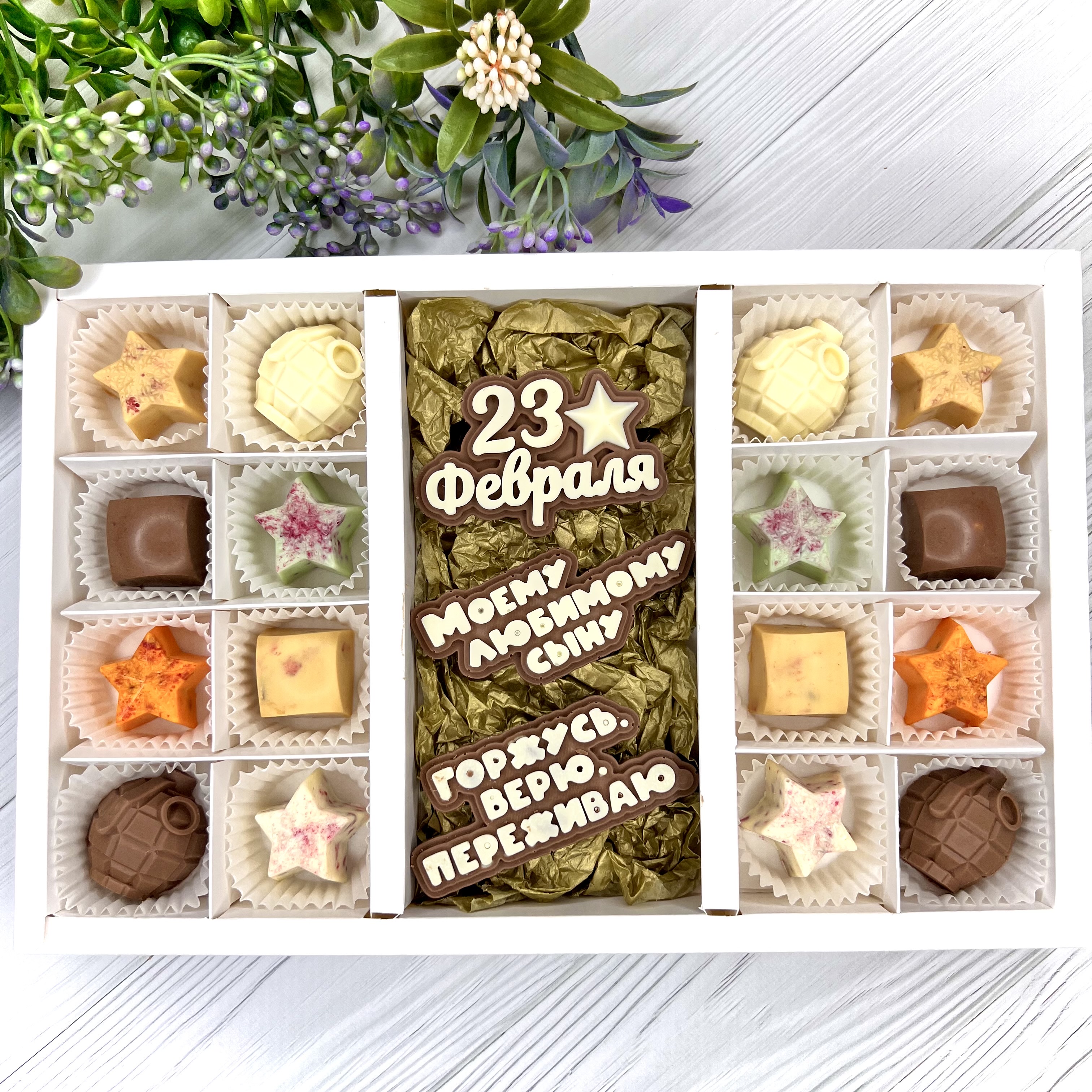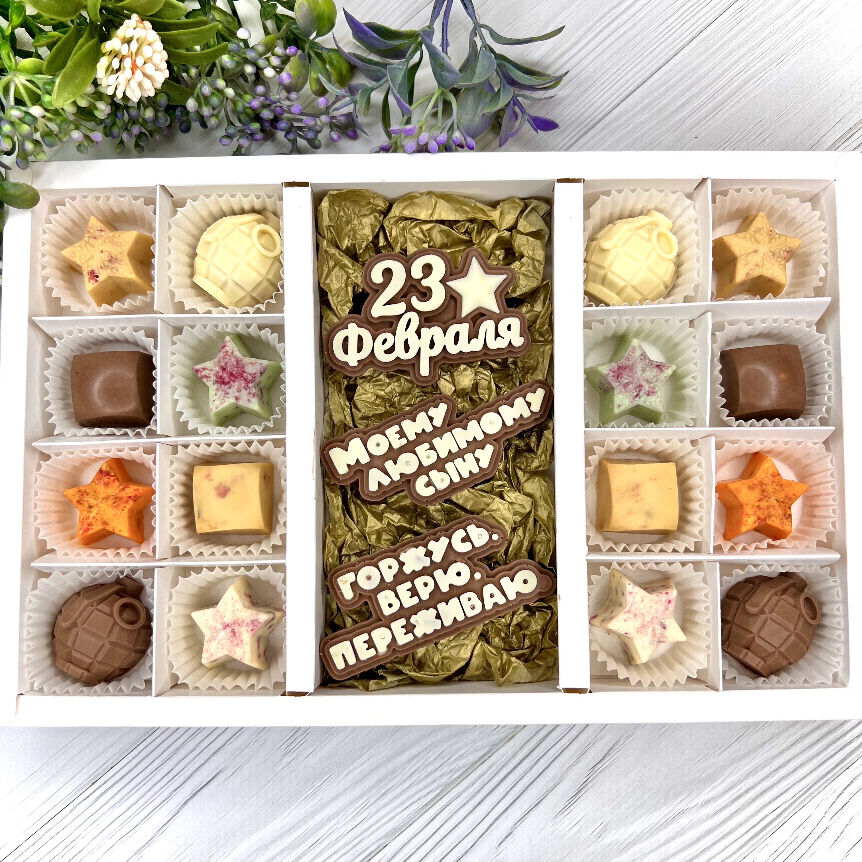 Шоколадный набор "С 23 февраля. Моему любимому сыну. Горжусь. Верю. Переживаю": 3 шоколадки и 16 конфет ручной работы - вкусный и оригинальный подарок любимому сыну - настоящему Герою - на День Защитника Отечества.