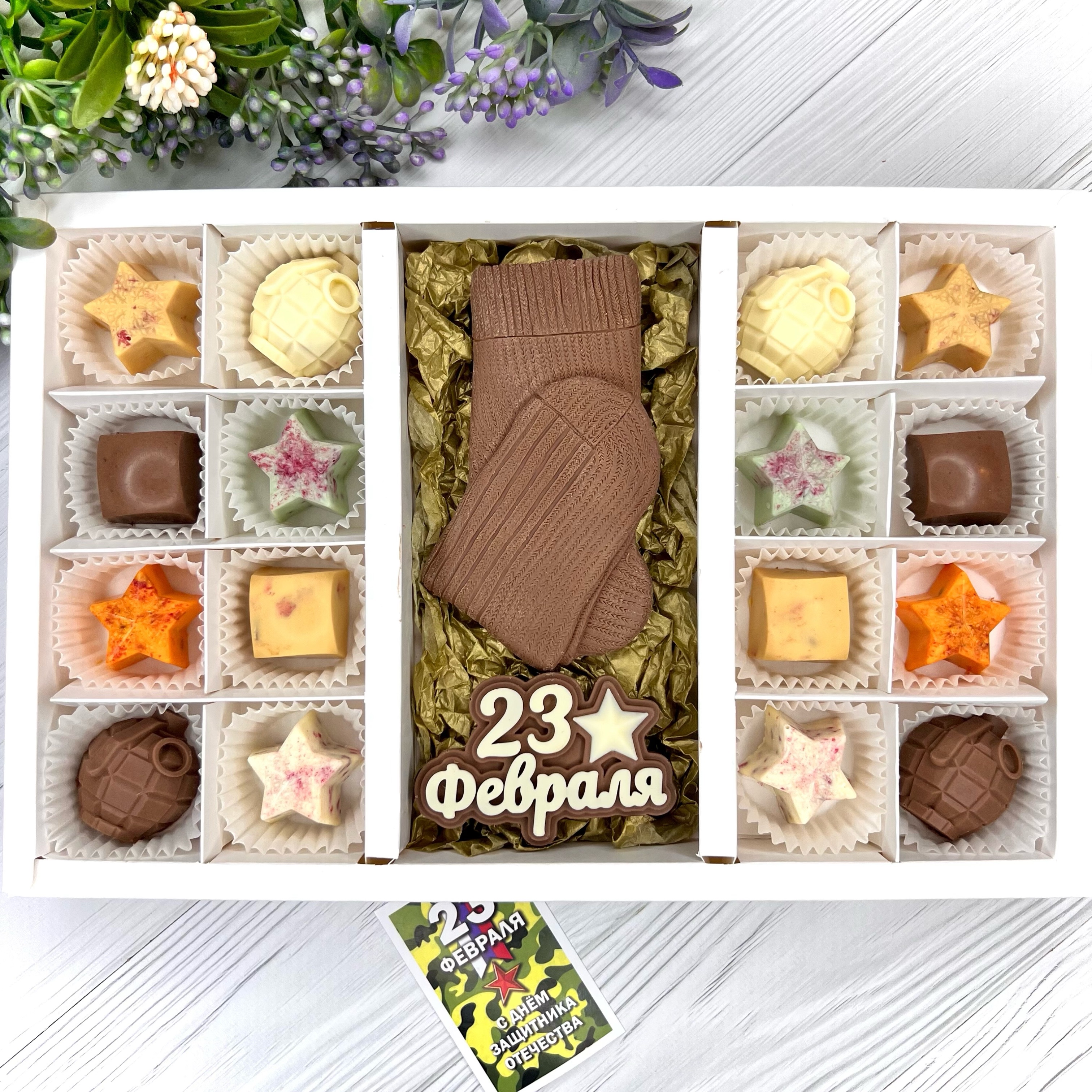 Шоколадный набор "С 23 февраля. Мужские носки": 2 шоколадки и 16 конфет ручной работы - вкусный и оригинальный подарок на 23 февраля из премиального бельгийского шоколада.