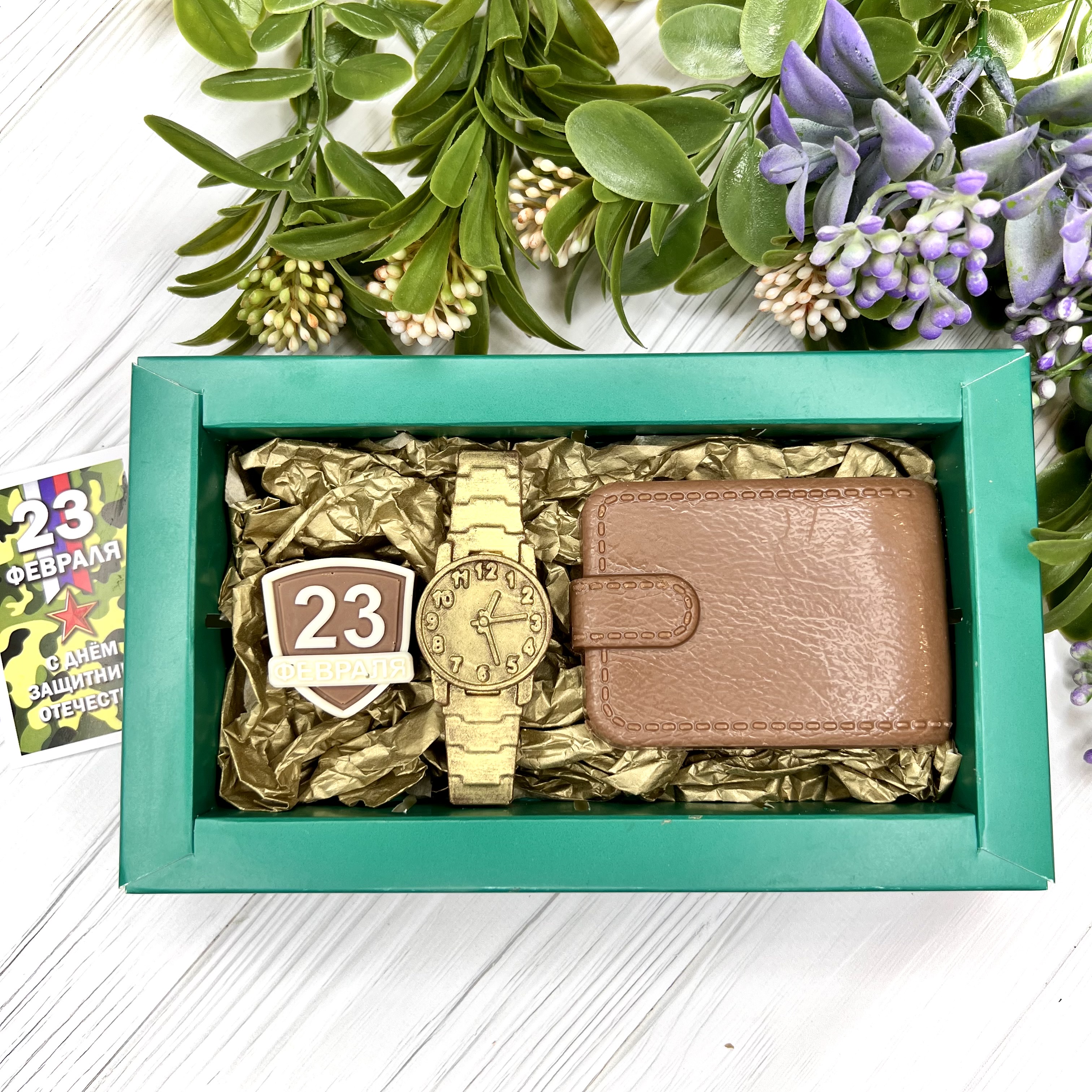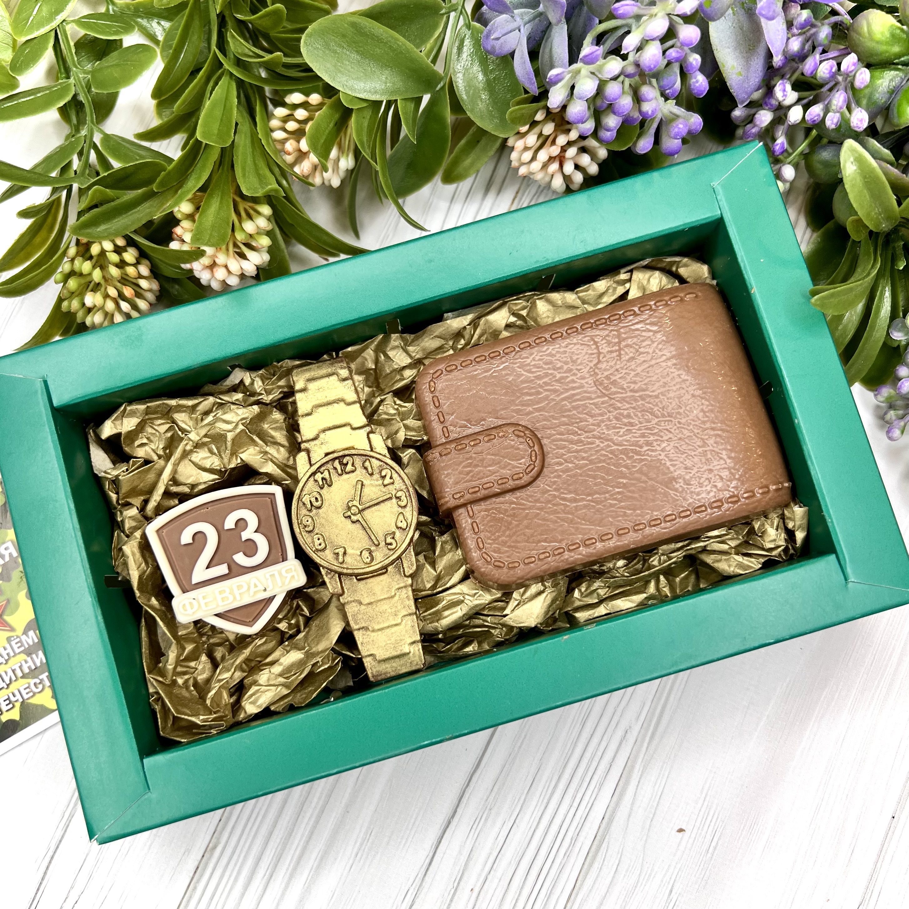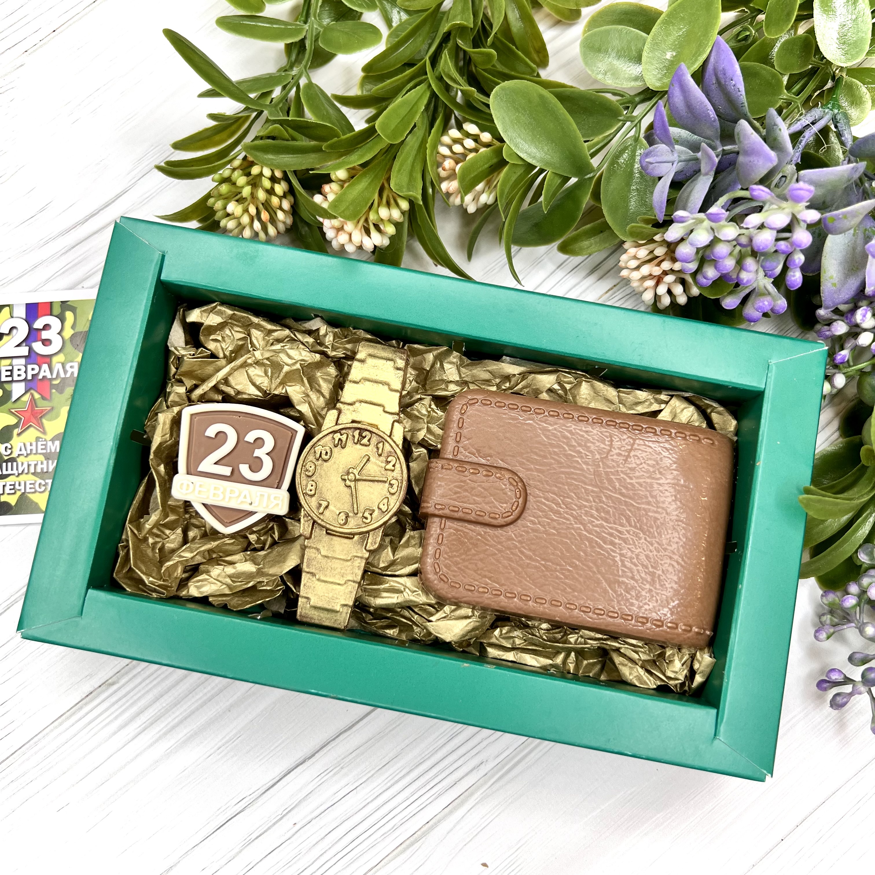 Шоколадный подарок "23 февраля. Портмоне. Часы" - оригинальный, достойный и поистине вкусный подарок на 23 февраля из вкуснейшего бельгийского шоколада.
