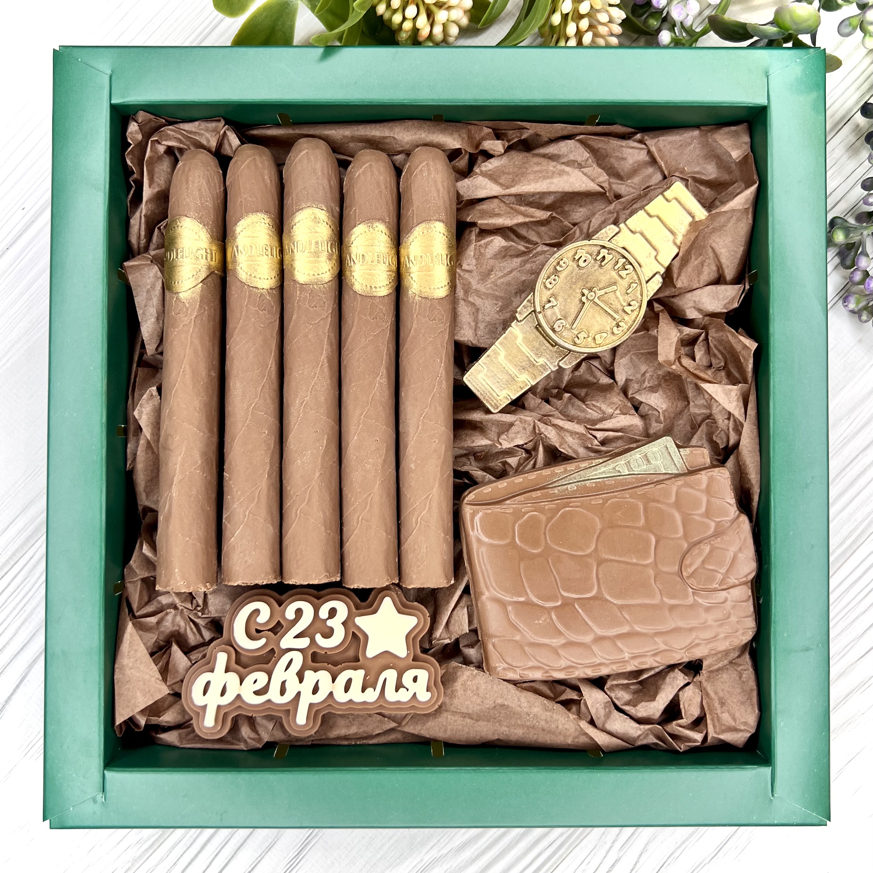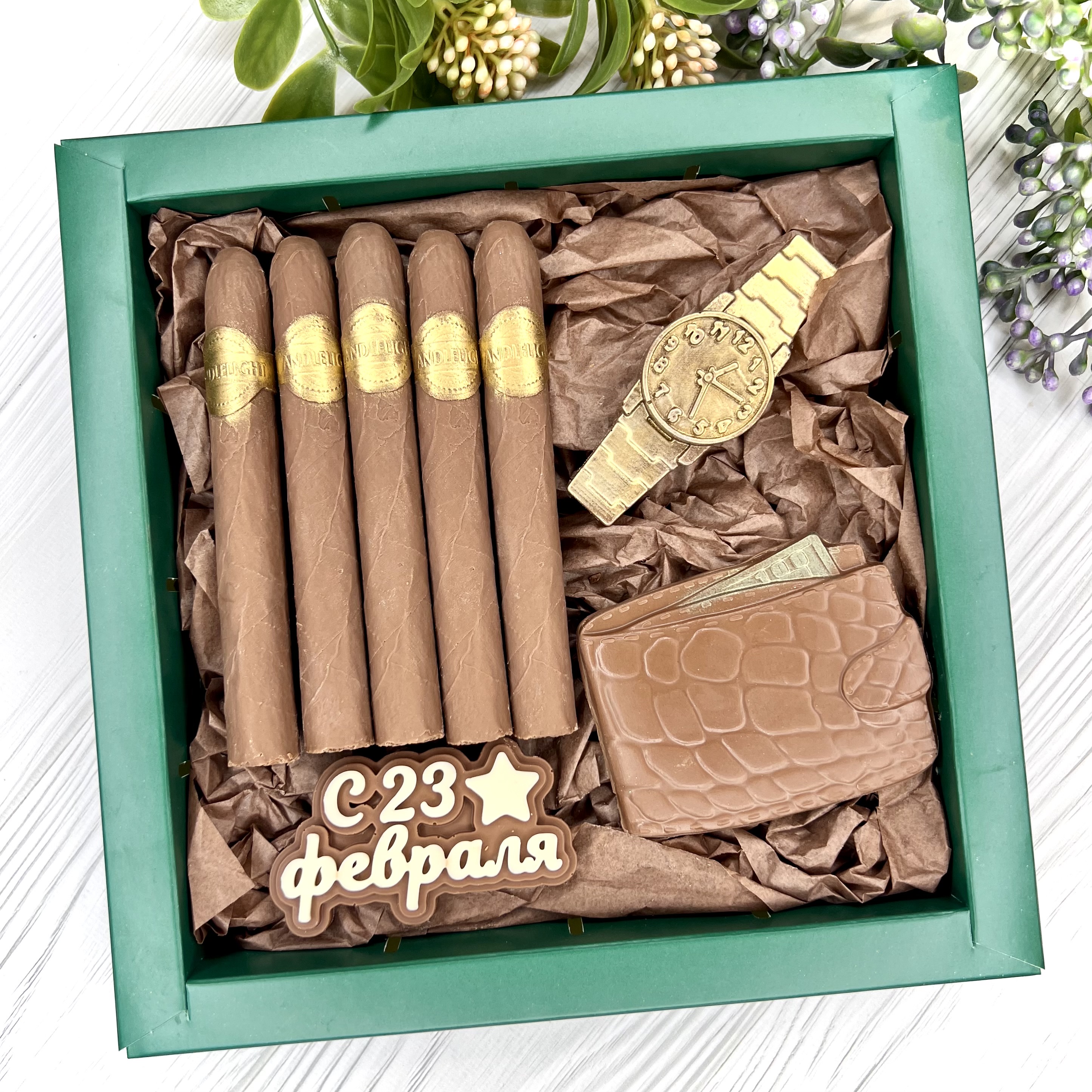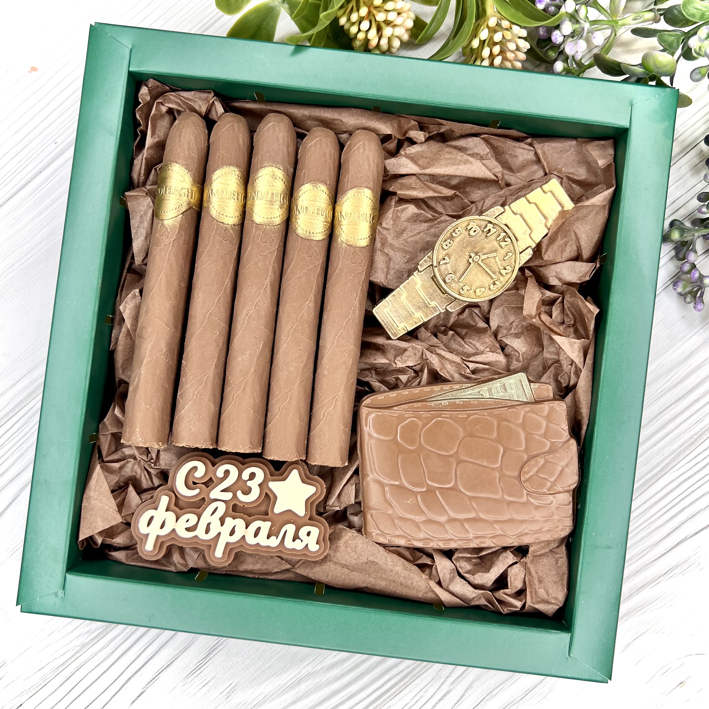 Шоколадный набор "23 февраля: сигары, портмоне и часы" - оригинальный, достойный и поистине вкусный подарок брутальному мужчине.