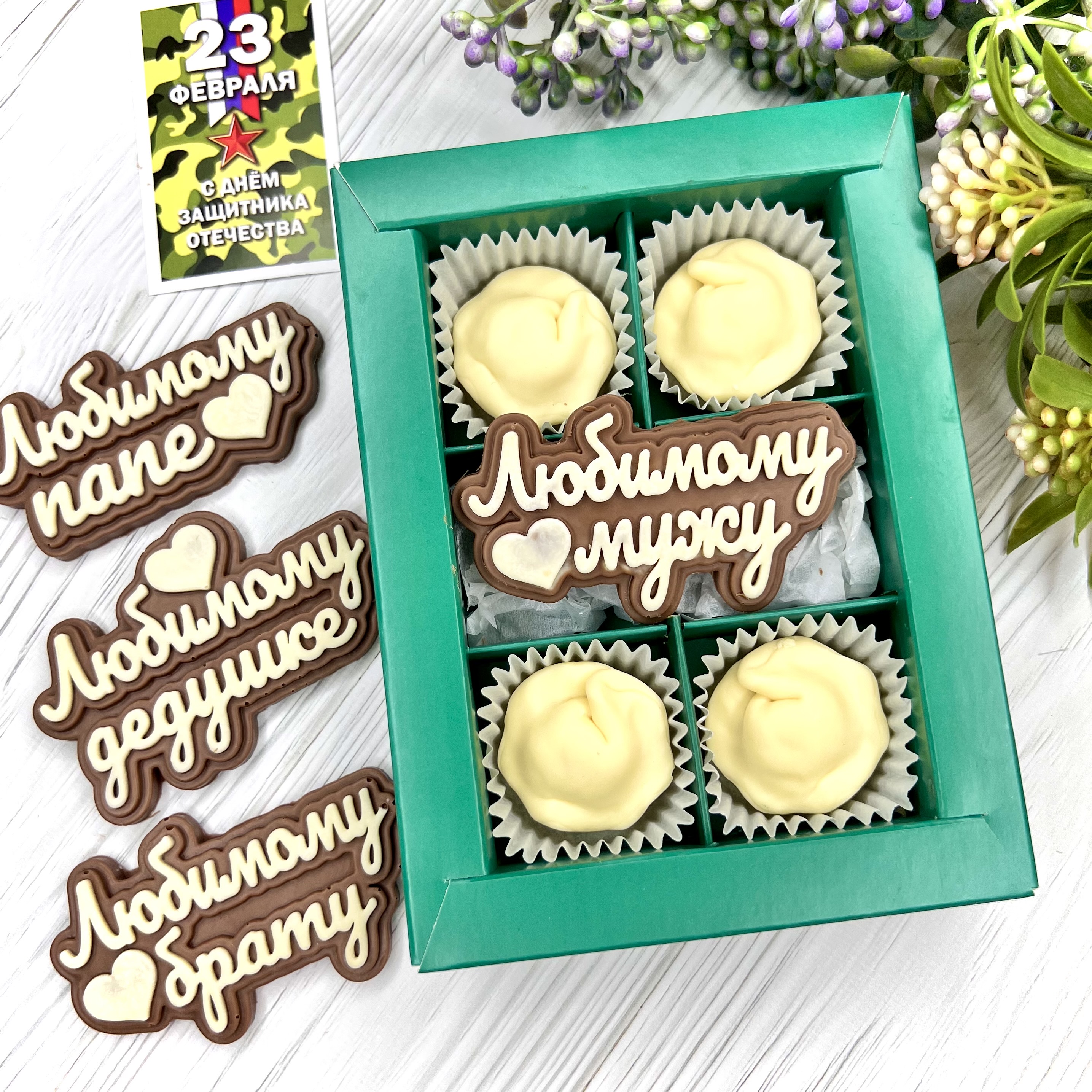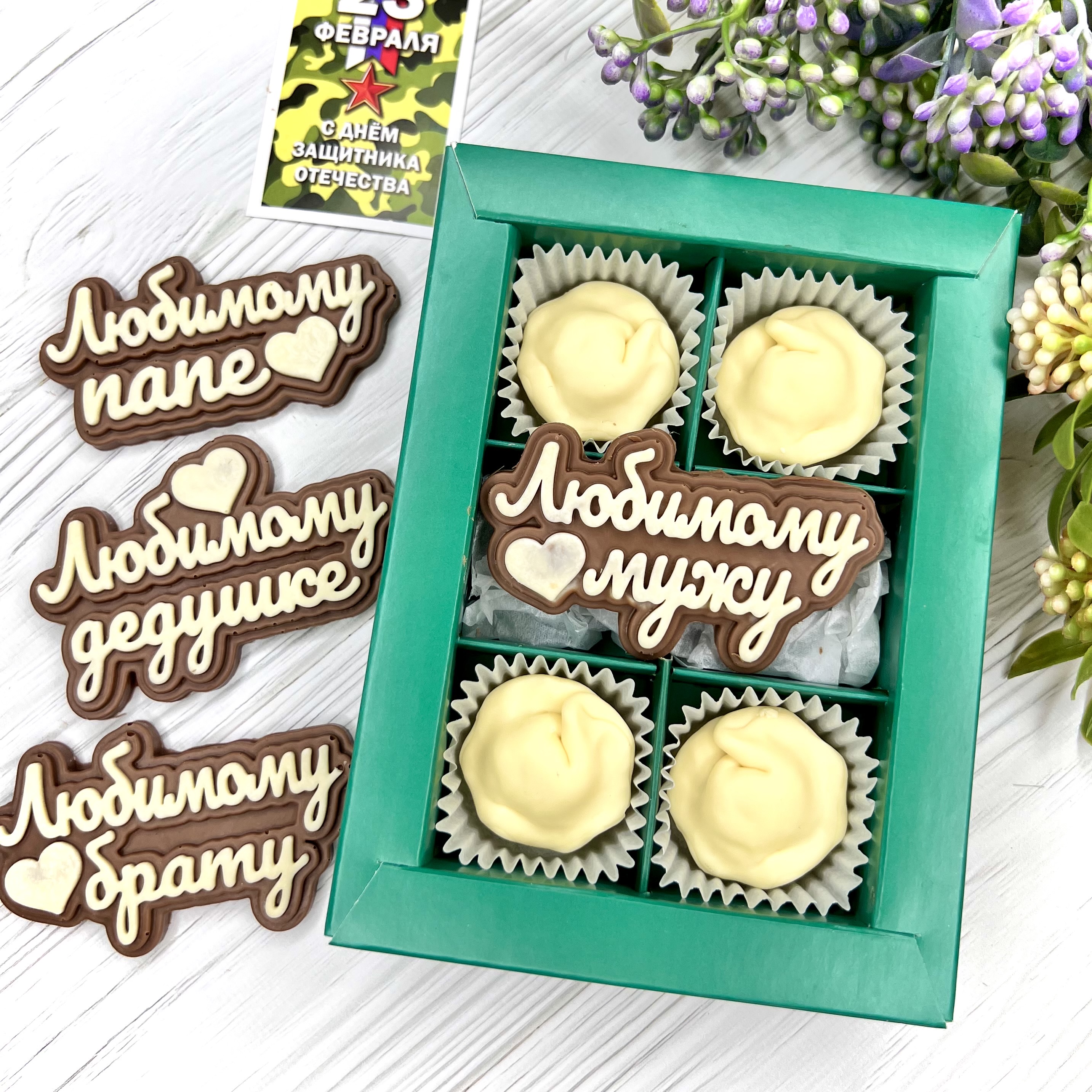 Шоколадный подарок "Любимому мужу/папе/брату. Пельмени": надпись и 4 конфеты ручной работы - оригинальный, достойный и поистине вкусный подарок мужчине.