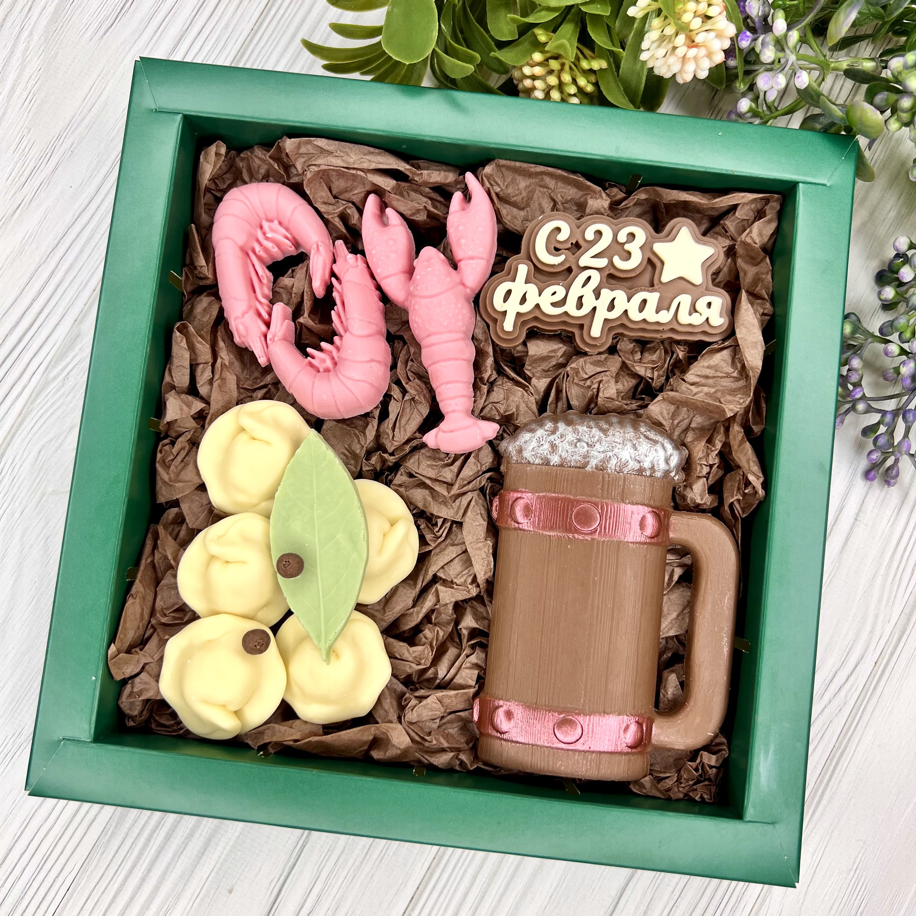 Шоколадный подарок "С 23 февраля: пиво, раки и пельмени"- оригинальный, достойный и поистине вкусный подарок настоящему мужчине.