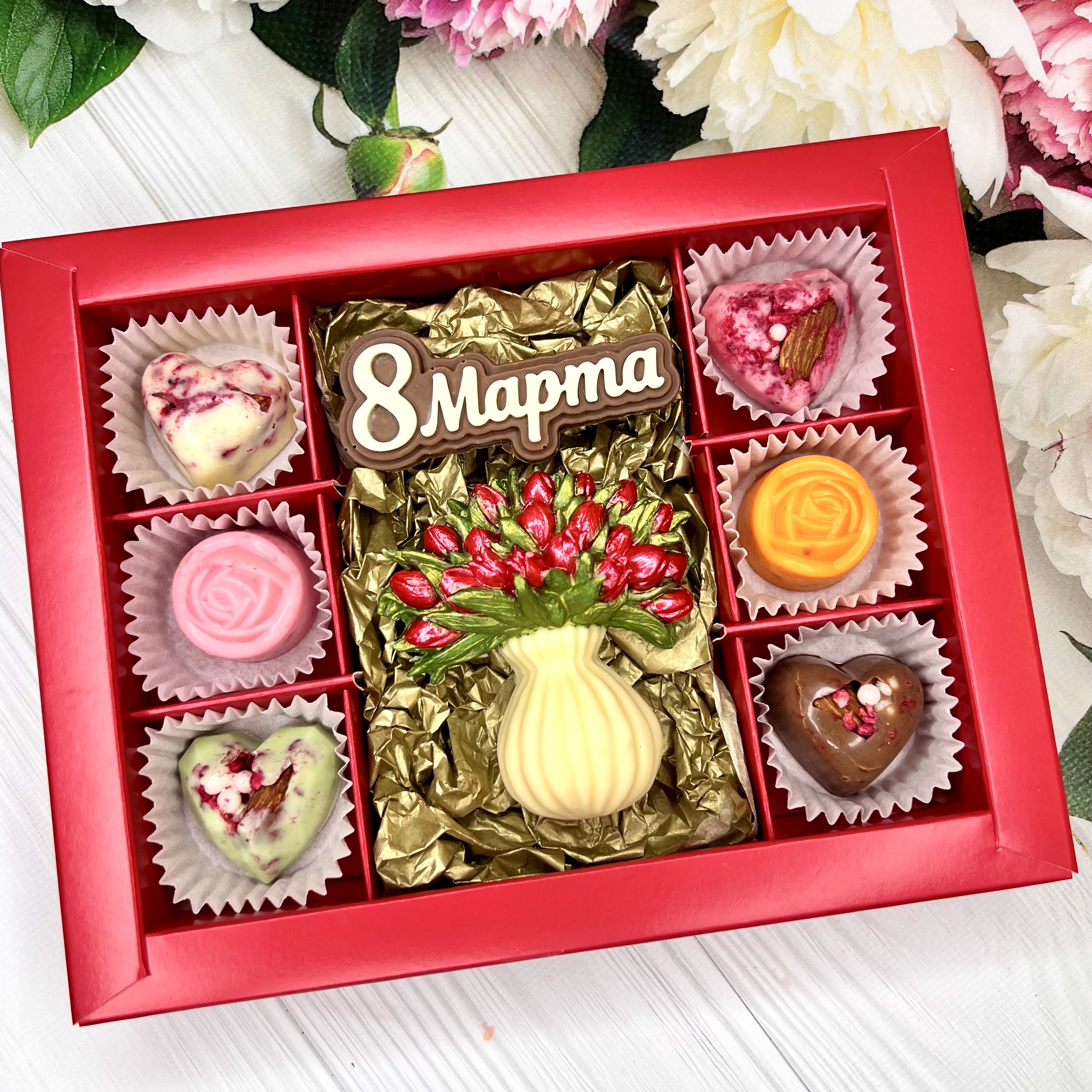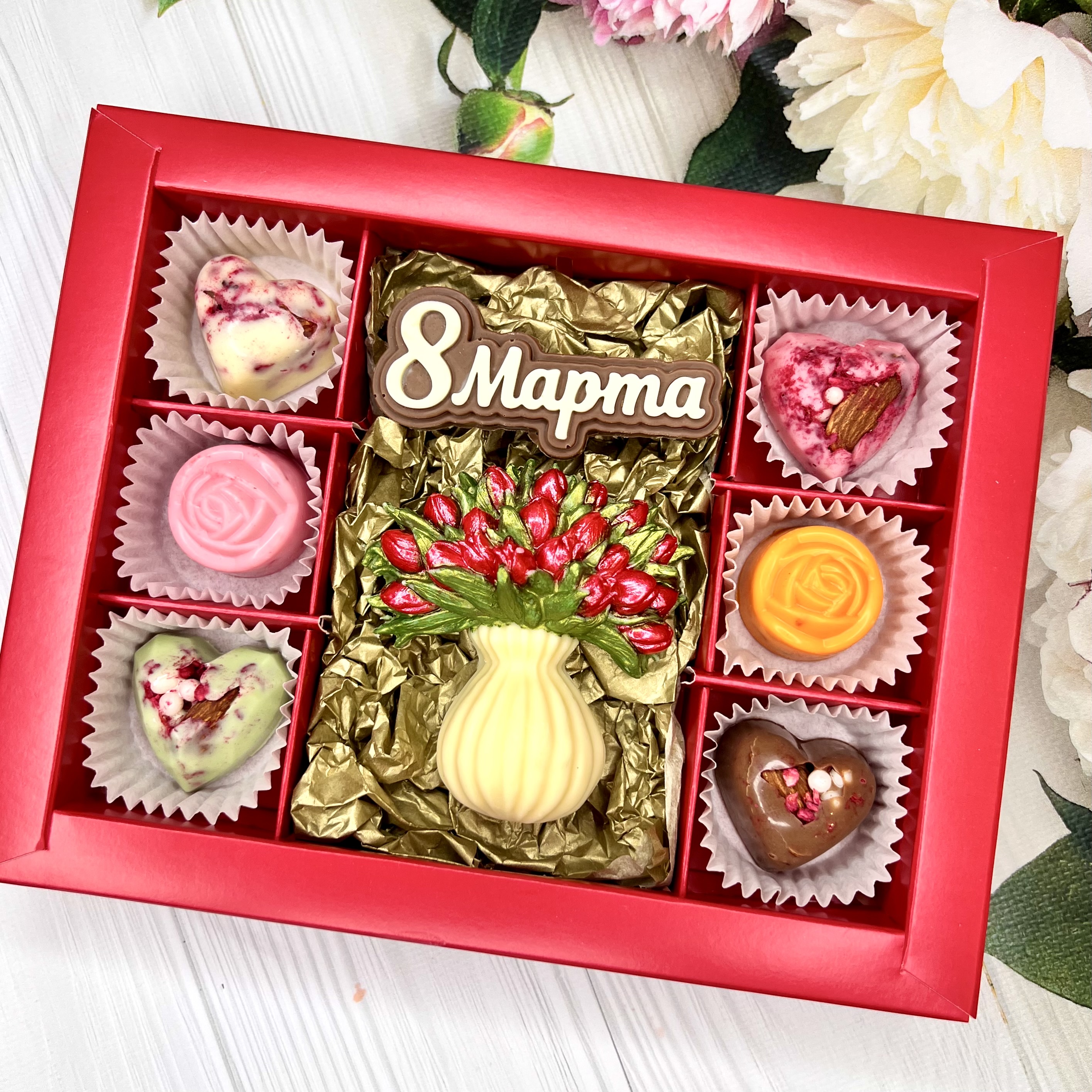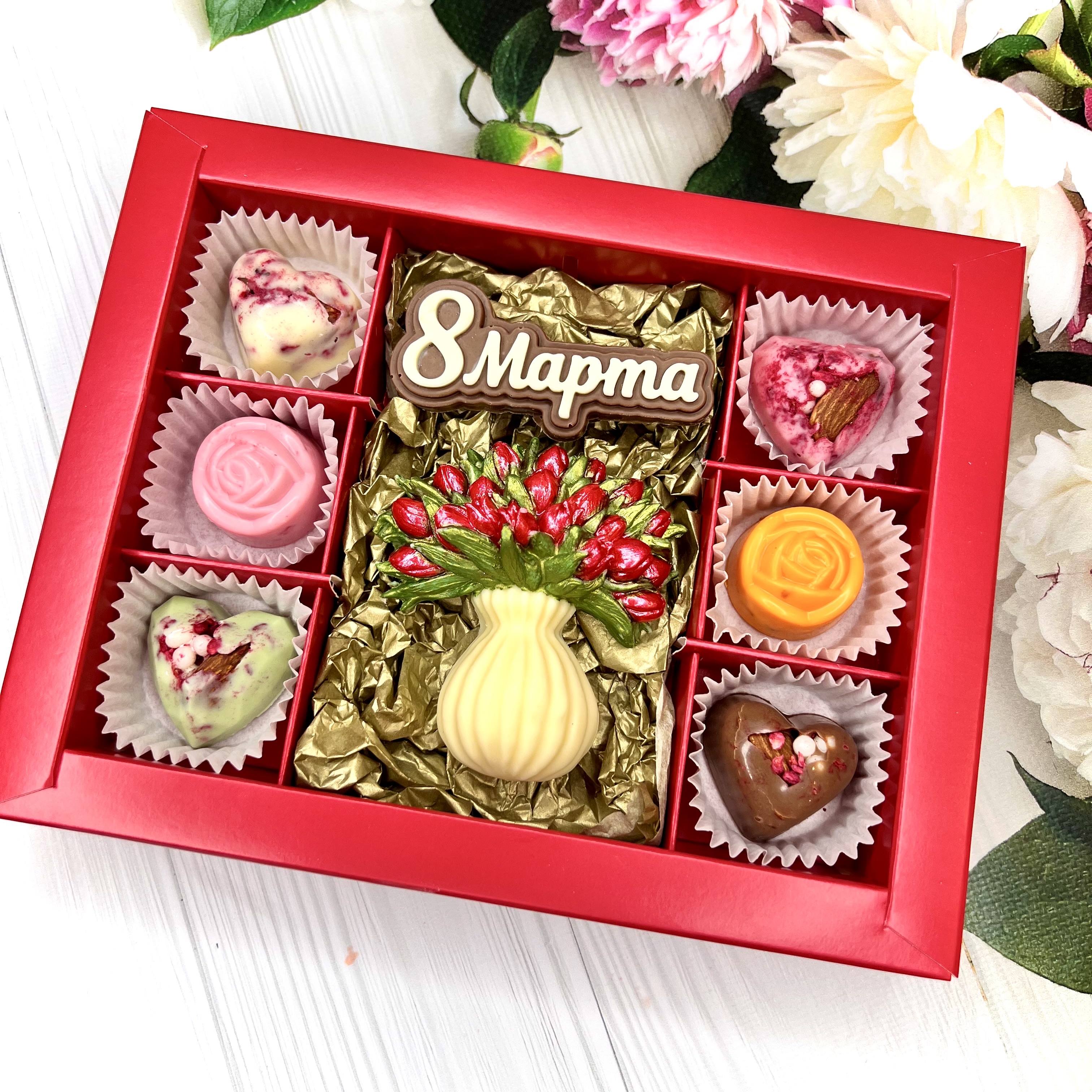 Шоколадный набор "8 марта": ваза с тюльпанами, шоколадка-надпись и 6 конфет ручной работы - вкусный и оригинальный подарок из бельгийского и швейцарского шоколада в Международный женский день.