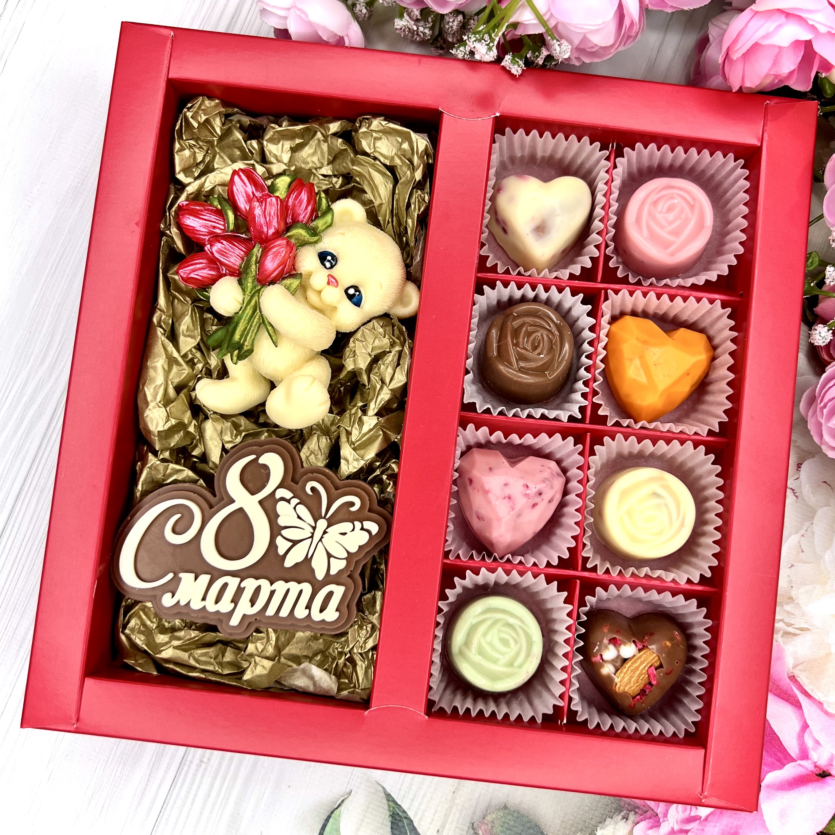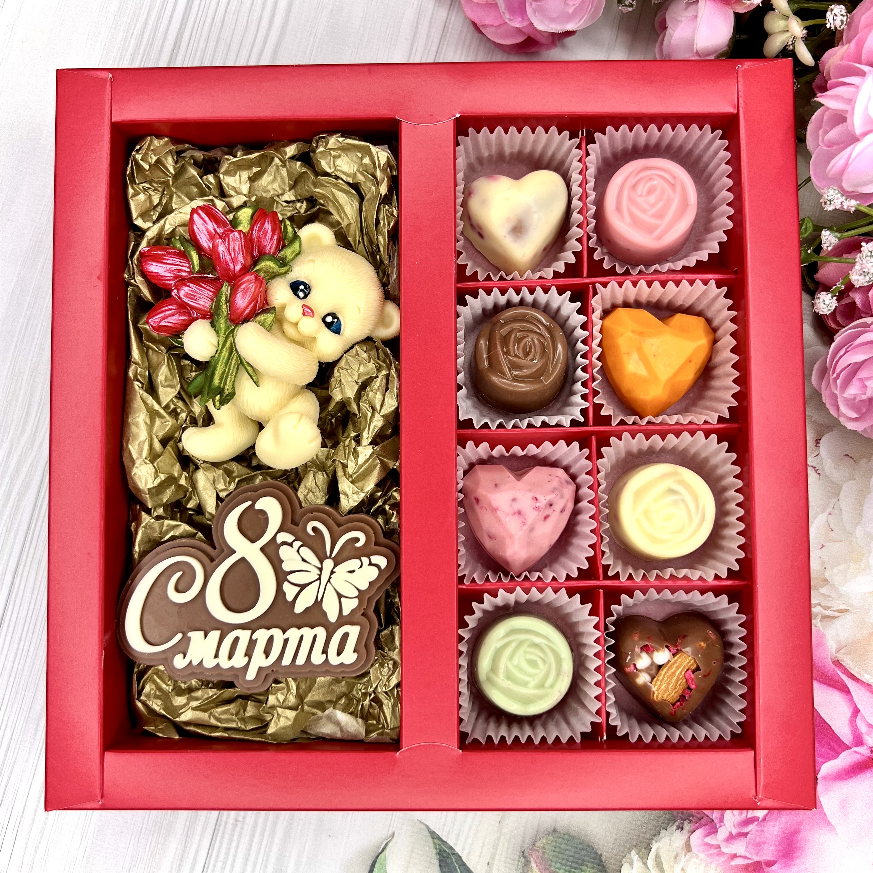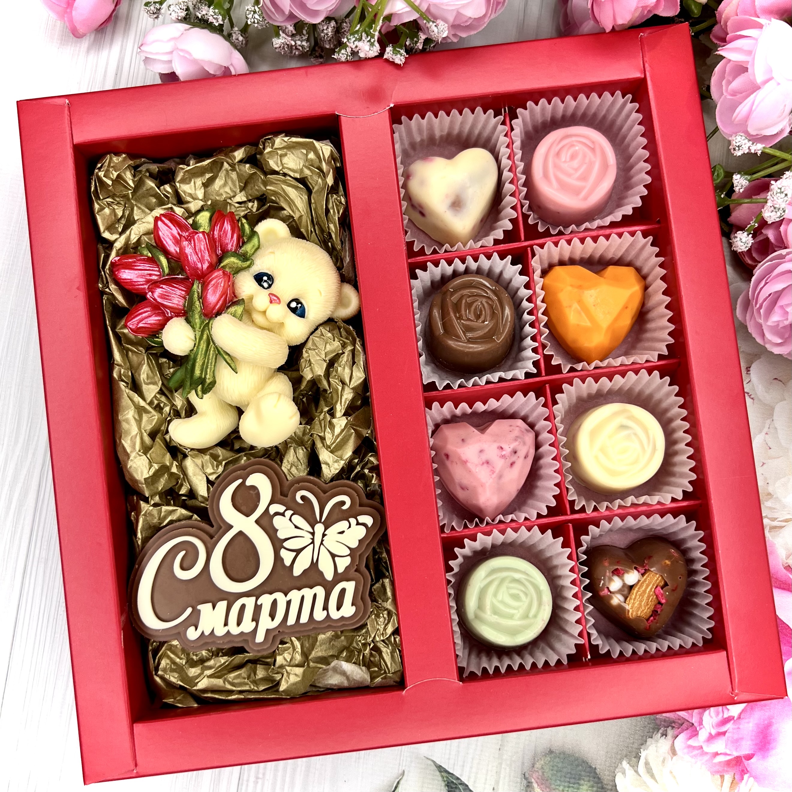 Шоколадный набор "С 8 марта. Мишка с тюльпанами": шоколадка-надпись, фигурка и 8 конфеты ручной работы - оригинальный и вкусный подарок в Международный женский день.