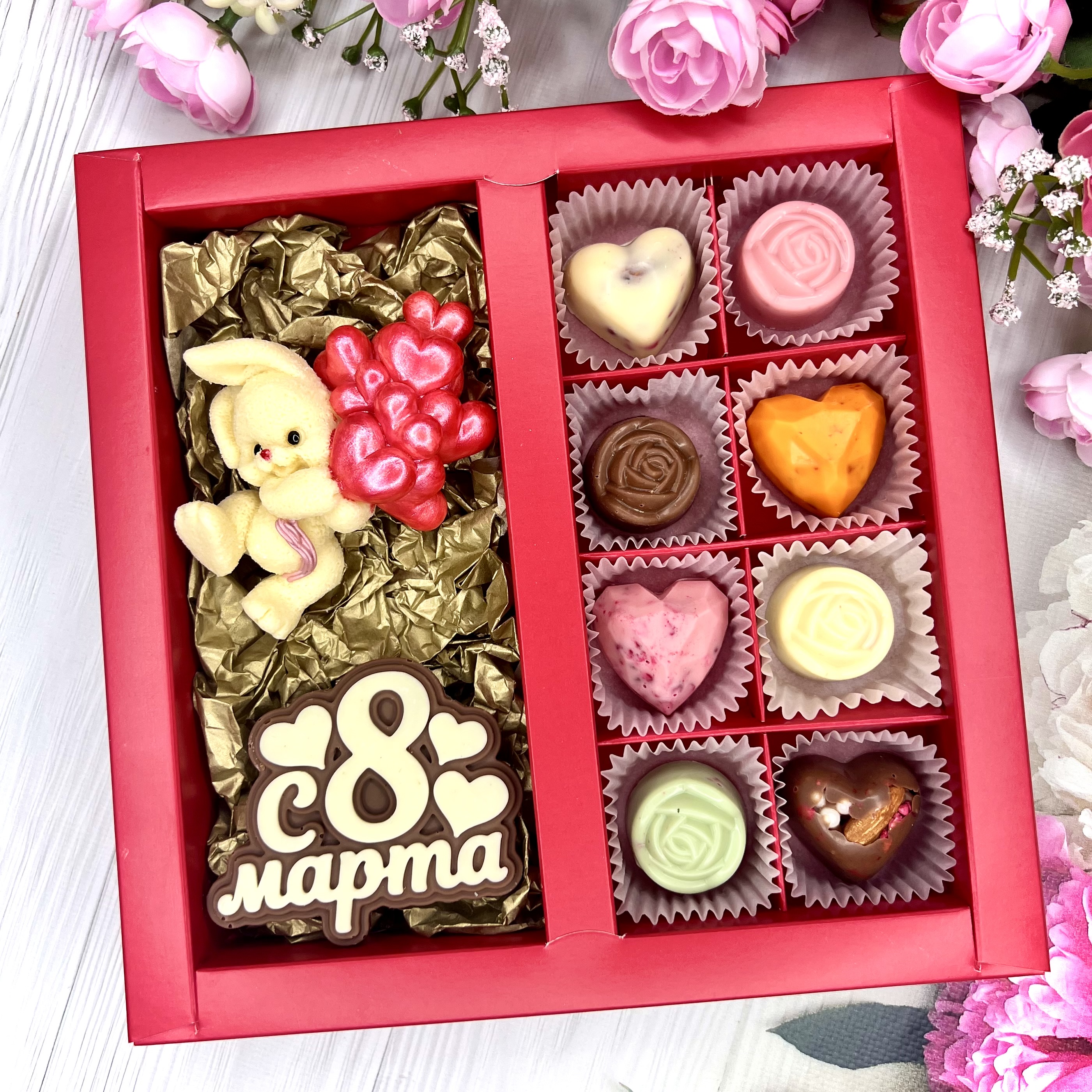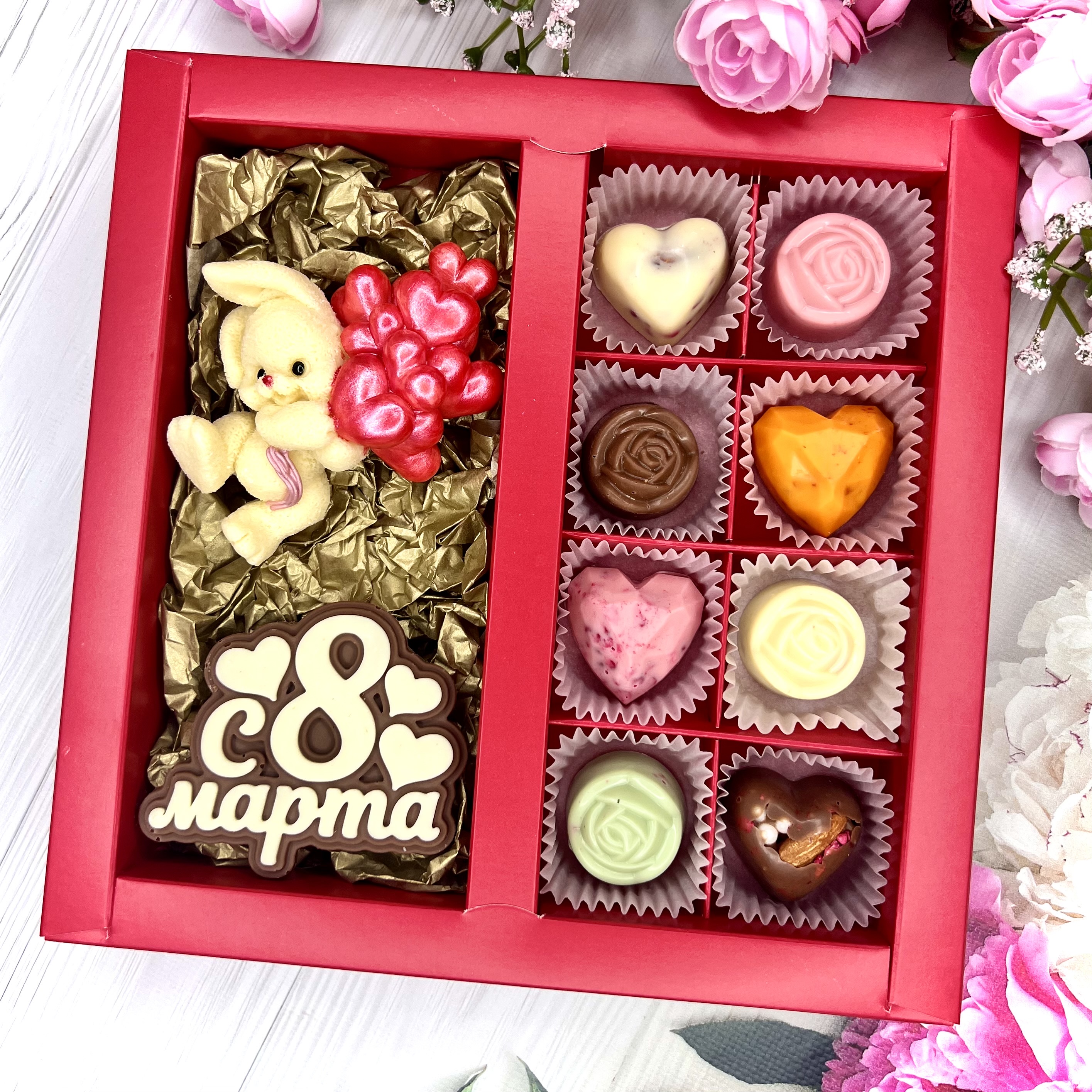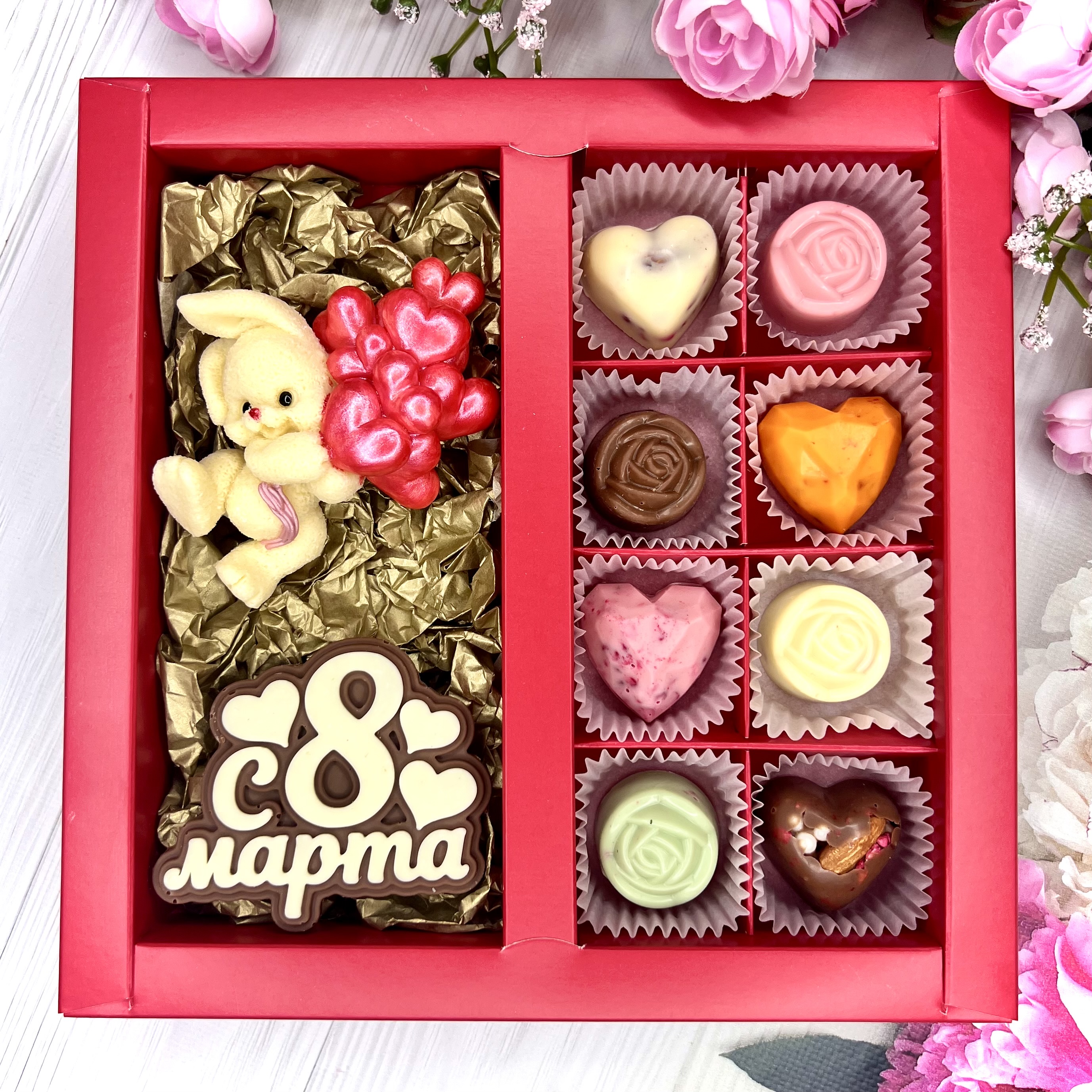 Шоколадный подарок "С 8 марта. Зайчик с шариками": шоколадка-надпись, фигурка и 8 конфеты ручной работы - оригинальный и вкусный подарок из бельгийского и швейцарского шоколада в Международный женский день.
