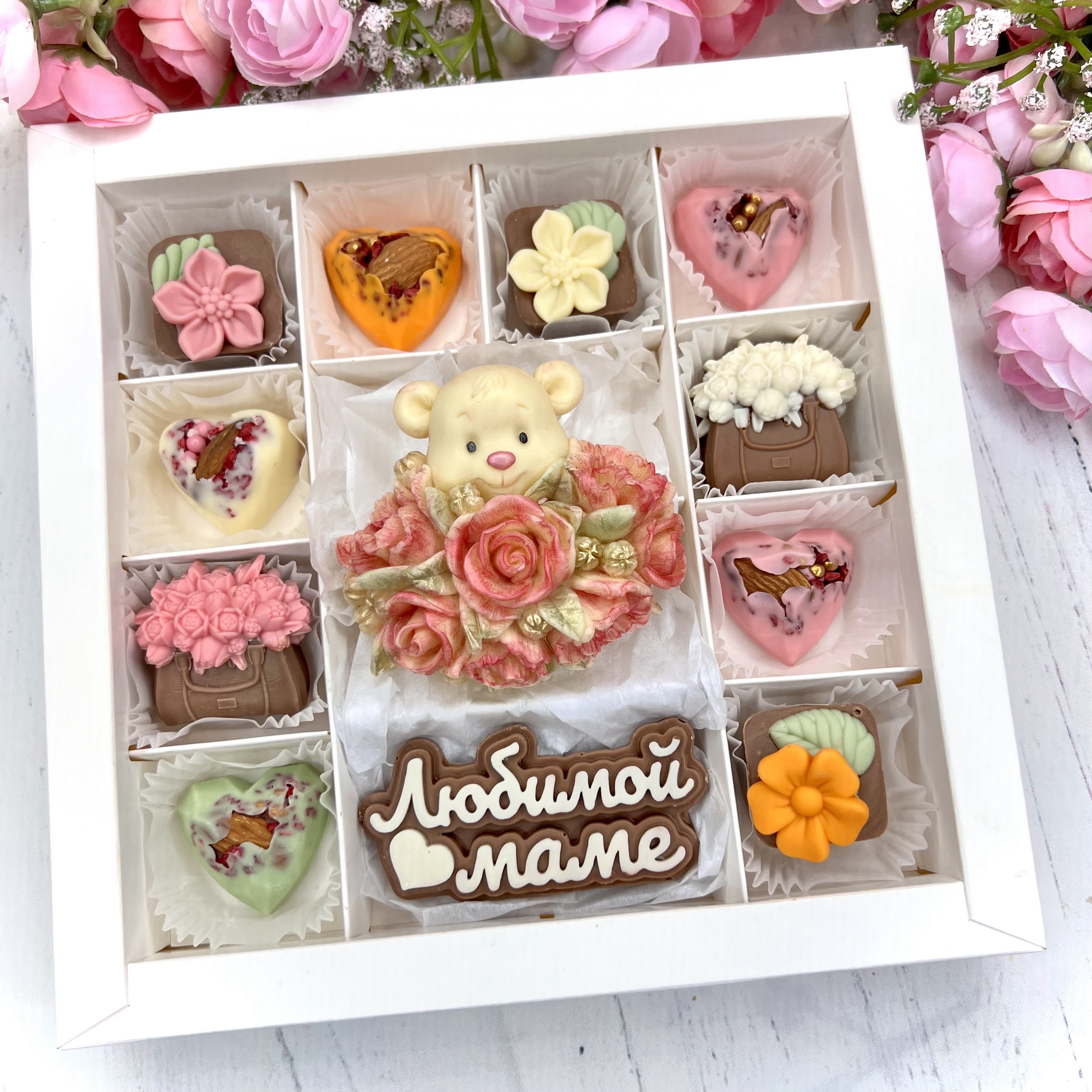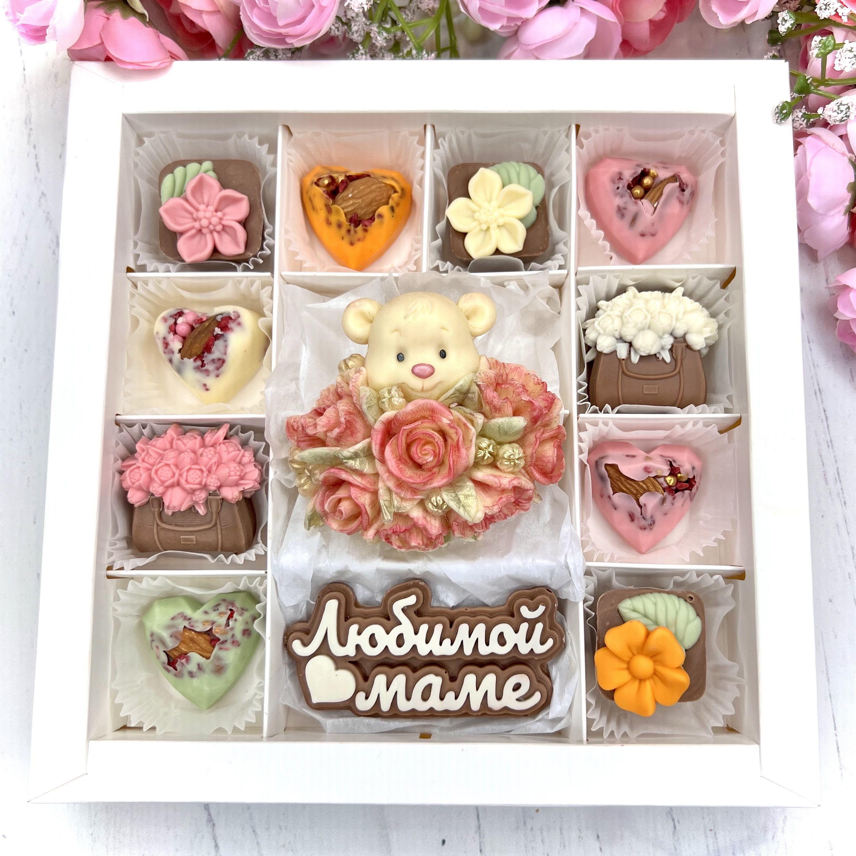 Шоколадный набор "Любимой маме. Мишка с розами": фигурка и 10 конфет ручной работы - оригинальный, достойный и поистине вкусный подарок любимой маме из премиального бельгийского и швейцарского шоколада.