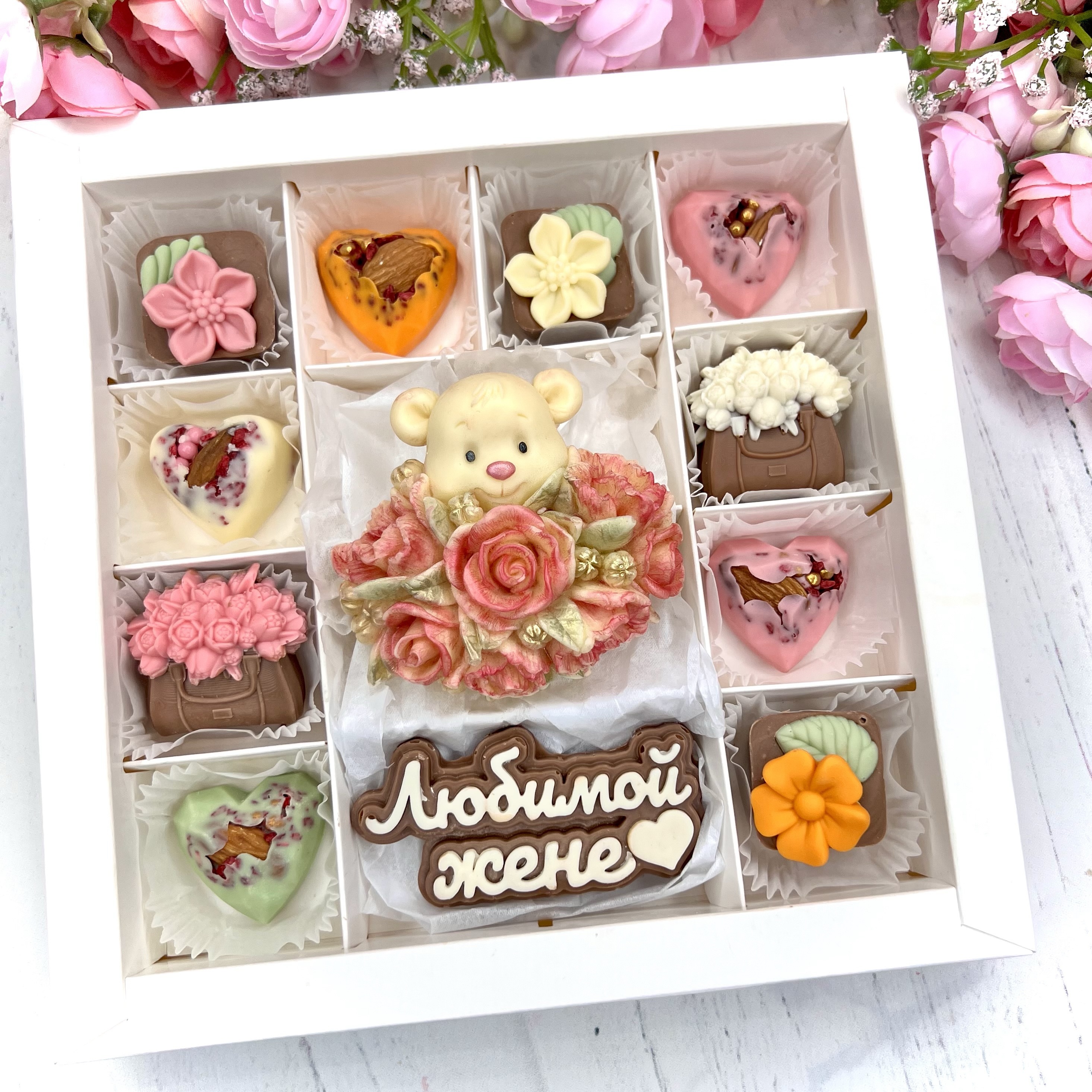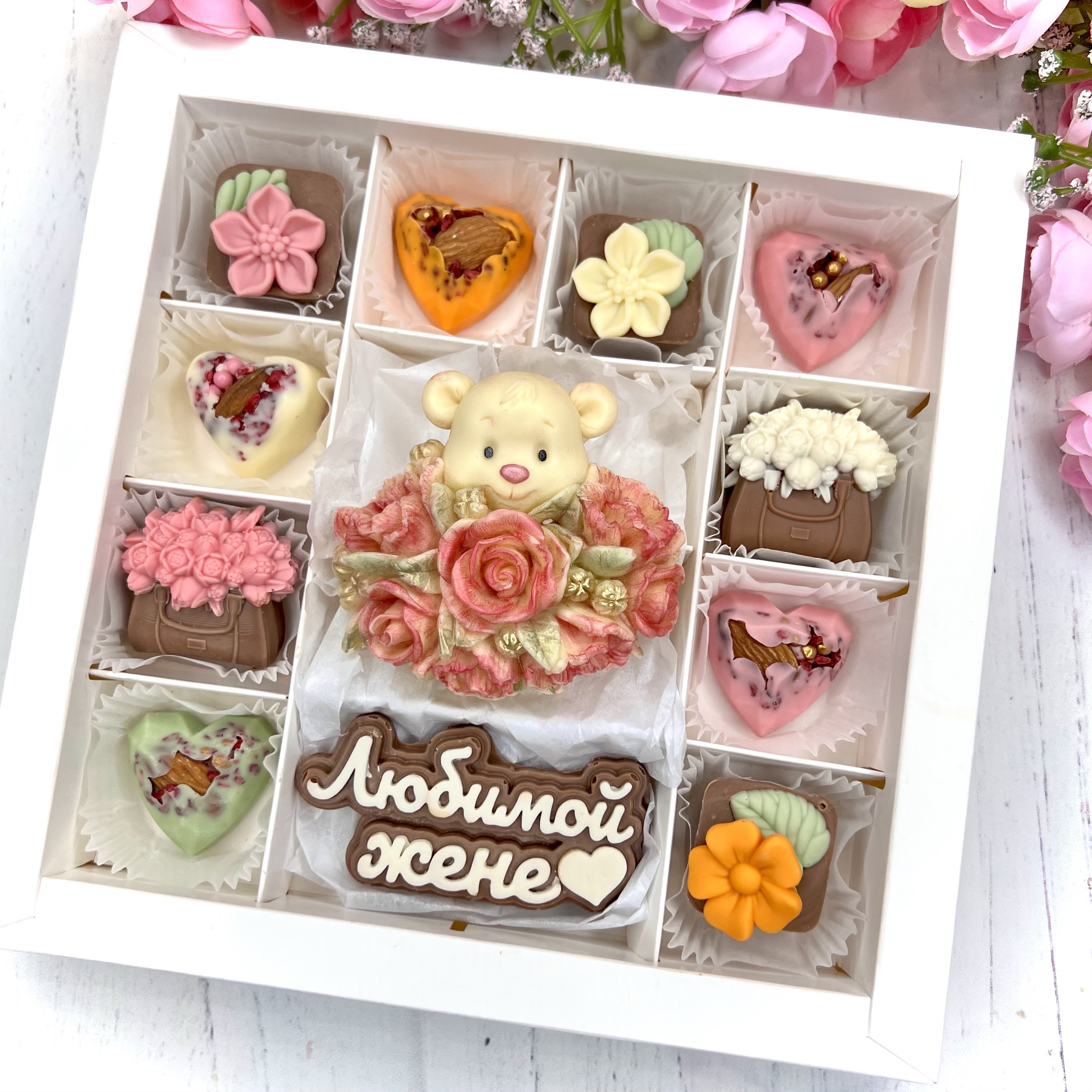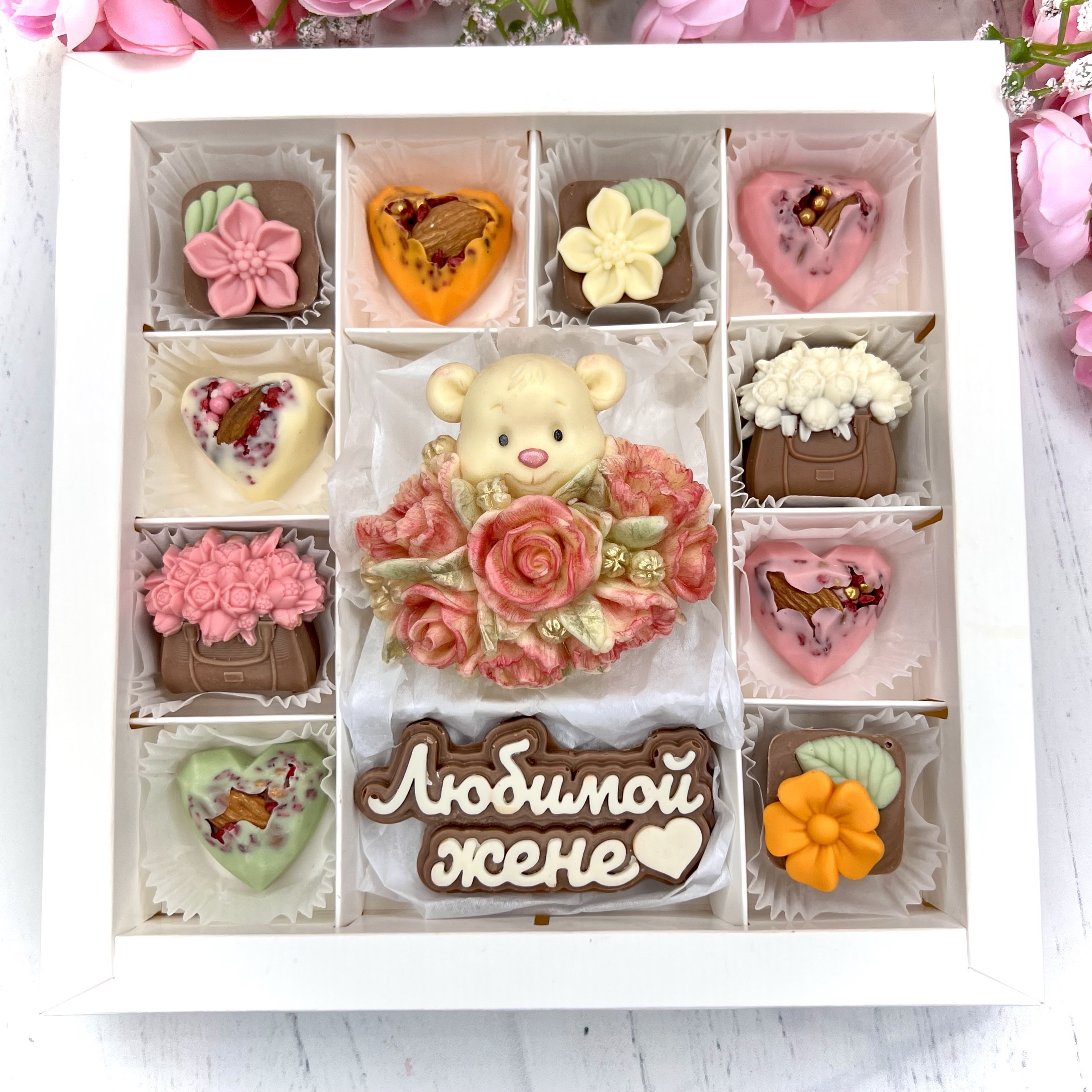 Шоколадный набор "Любимой жене. Мишка с розами": фигурка и 10 конфет ручной работы