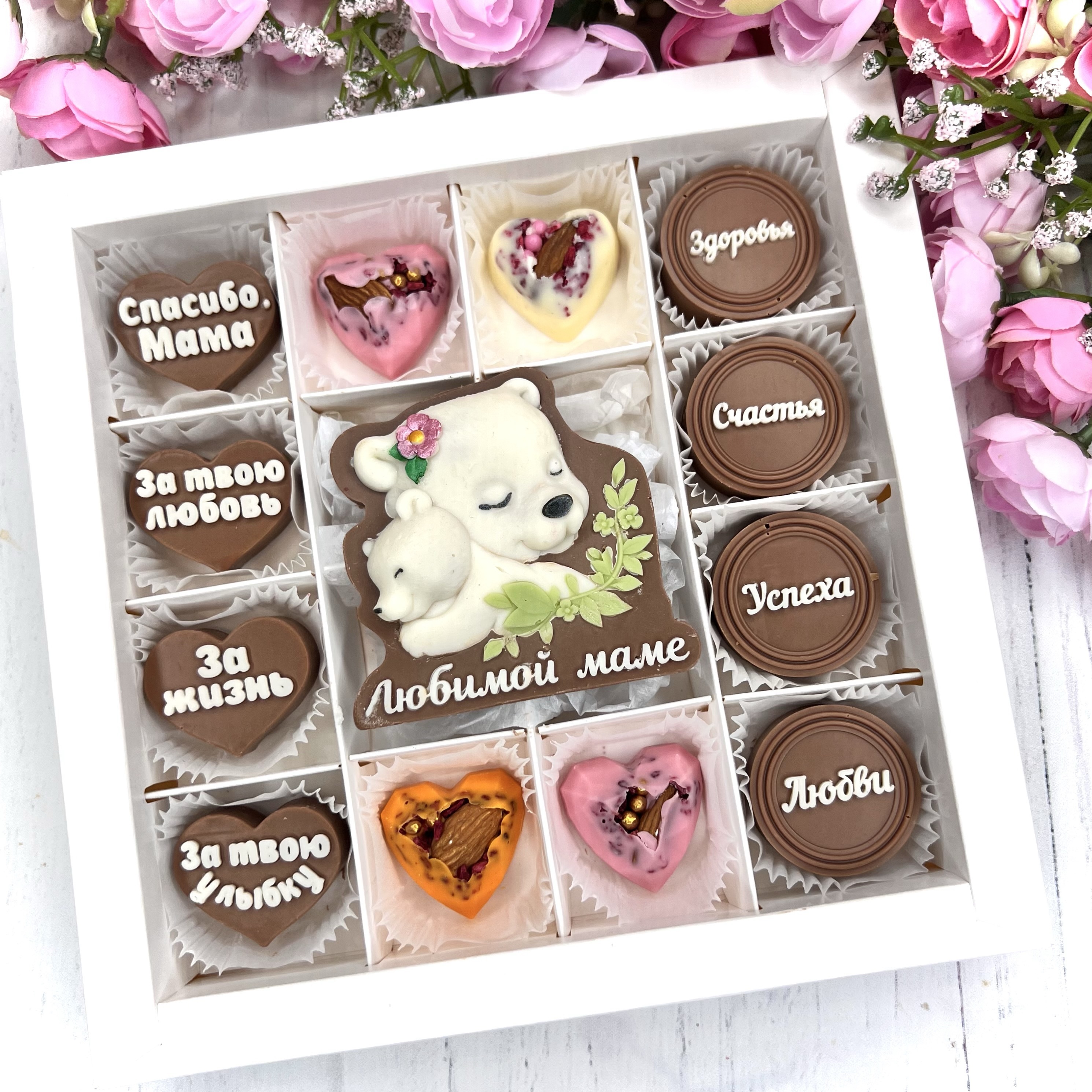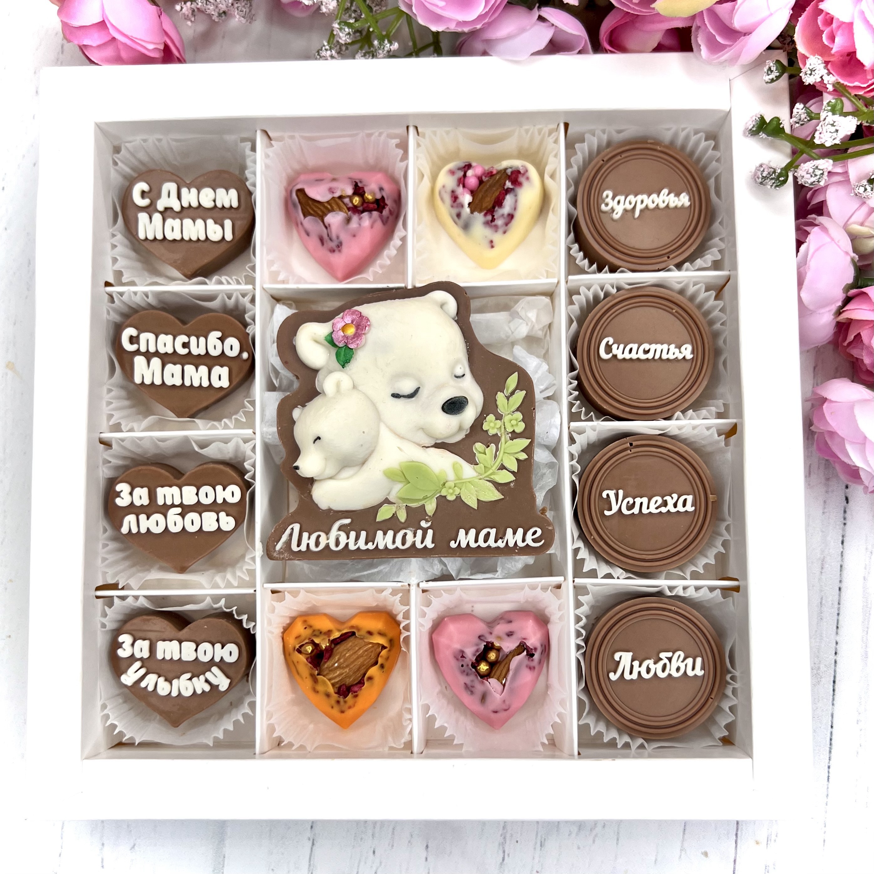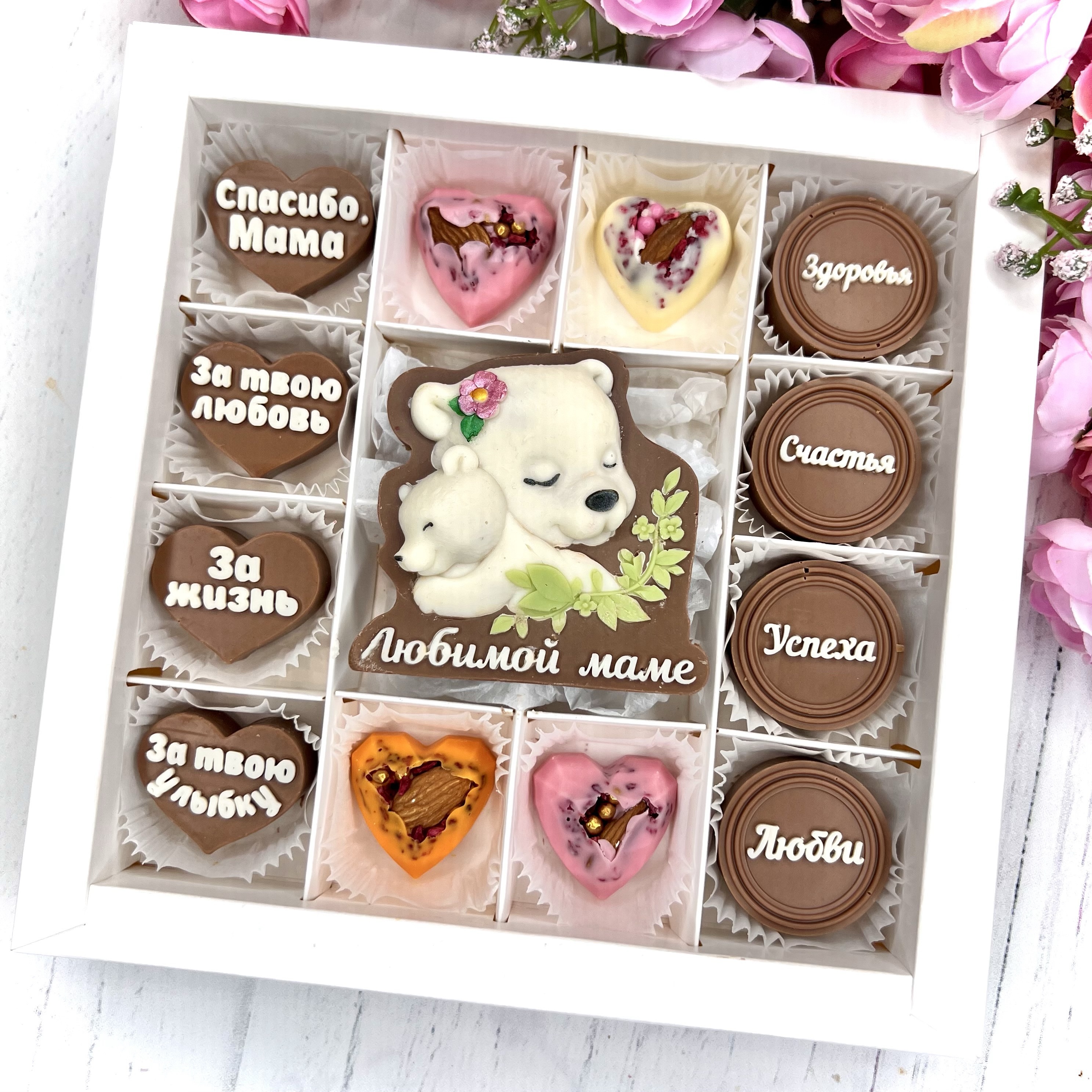 Шоколадный набор "С Днём Мамы. Мишки.Пожелания": шоколадка и 12 конфет ручной работы - оригинальный, достойный и поистине вкусный подарок любимой маме из премиального бельгийского и швейцарского шоколада.