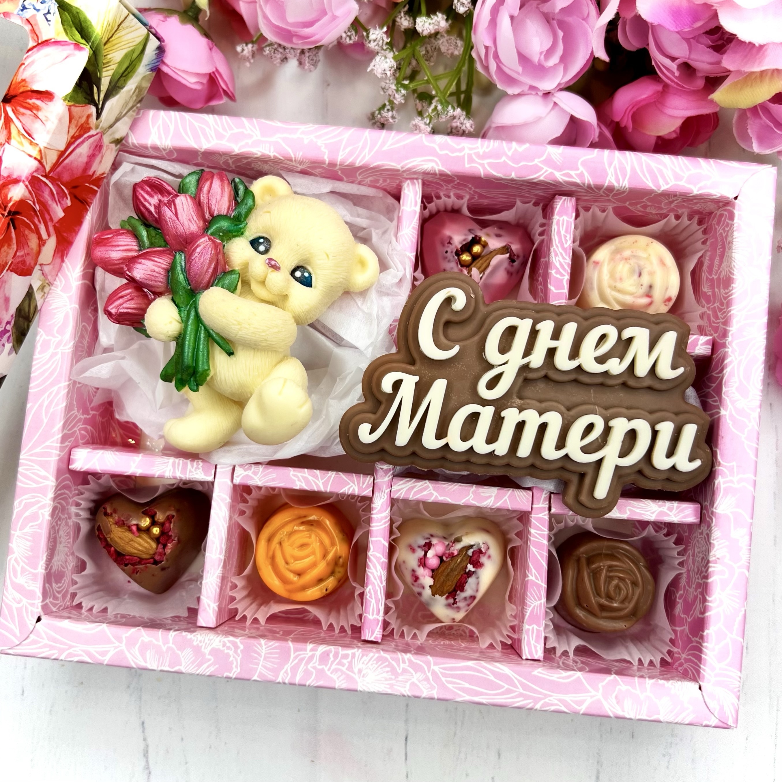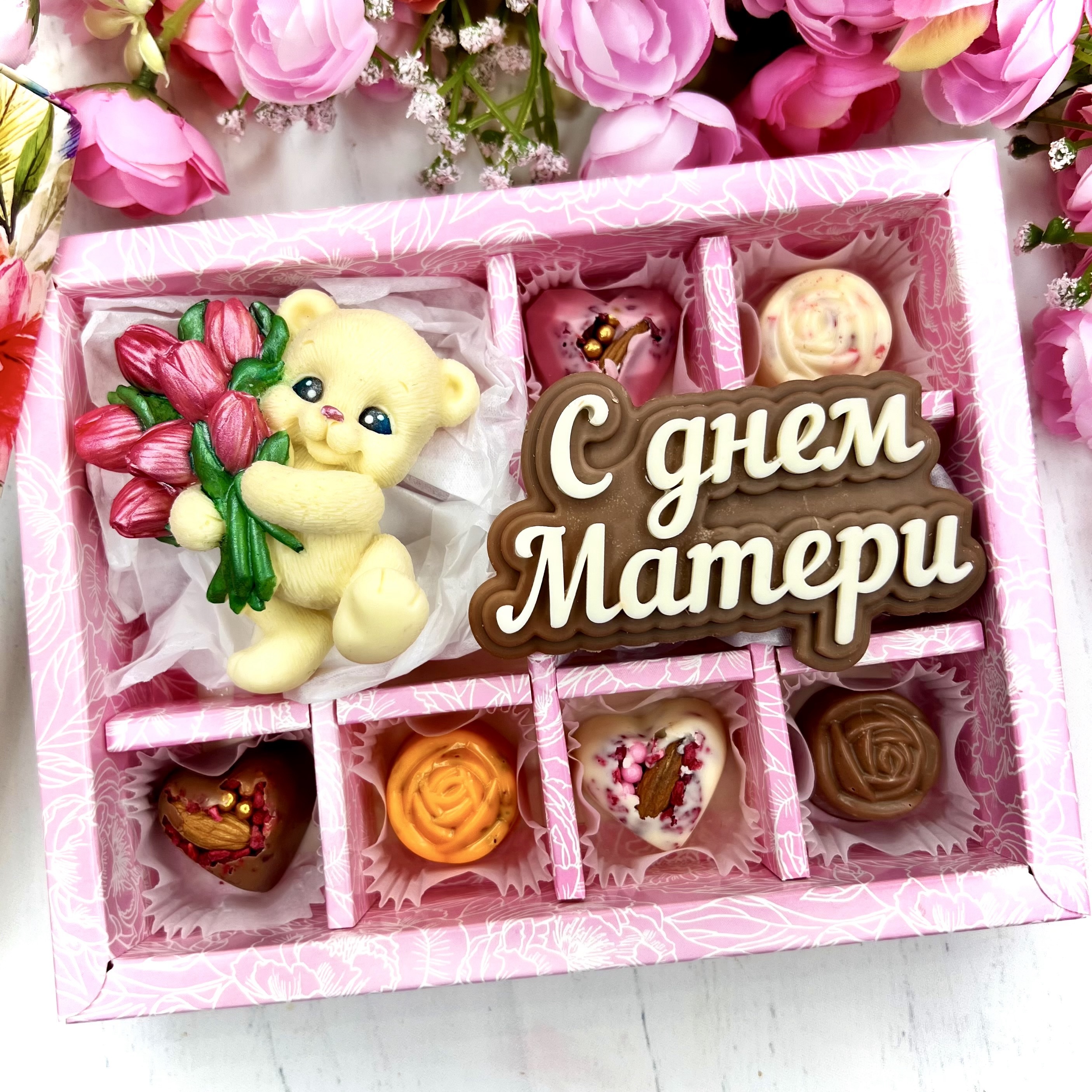 Шоколадный набор "С Днём Матери. Мишка с тюльпанами": фигурка и 8 конфет ручной работы - оригинальный, достойный и поистине вкусный подарок любимой маме из премиального бельгийского и швейцарского шоколада со словами благодарности.