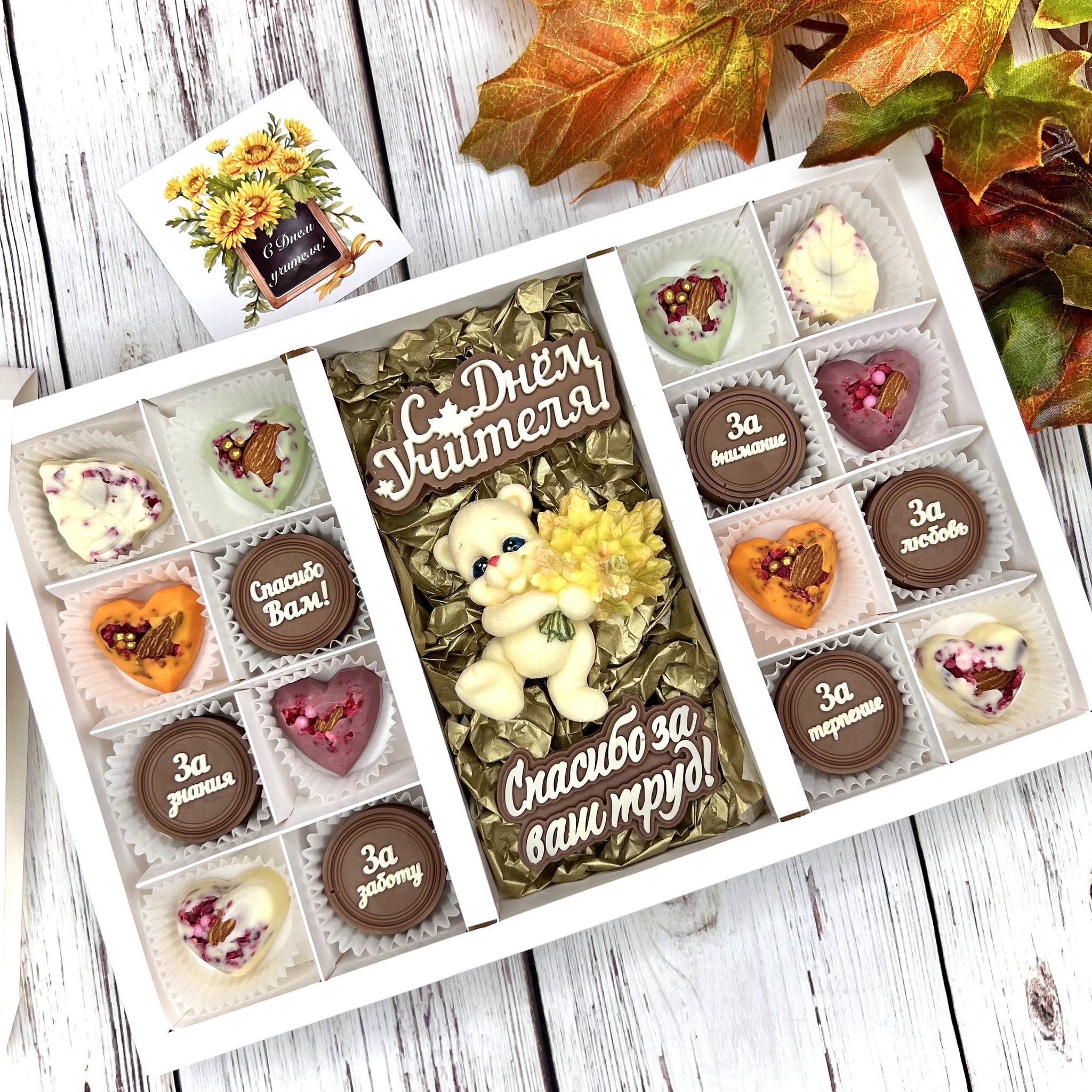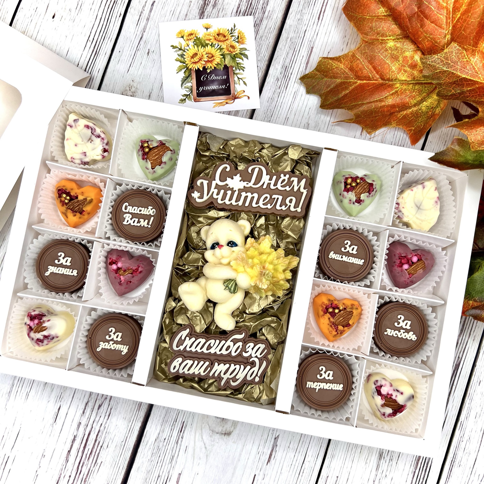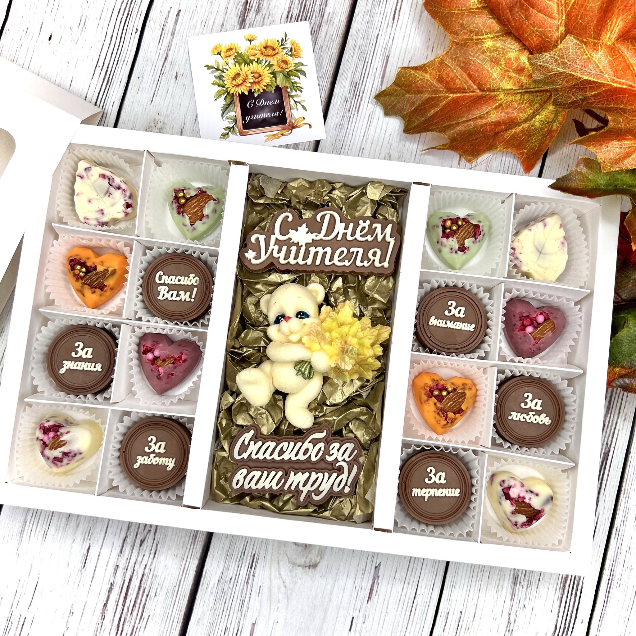 Шоколадный подарок "С Днем учителя. Мишка с кленовыми листьями»: 2 шоколадки-надписи и 16 конфет ручной работы: 2 шоколадки-надписи и 16 конфет ручной работы - оригинальный, достойный и поистине вкусный подарок на День учителя из швейцарского и бельгийского шоколада.
