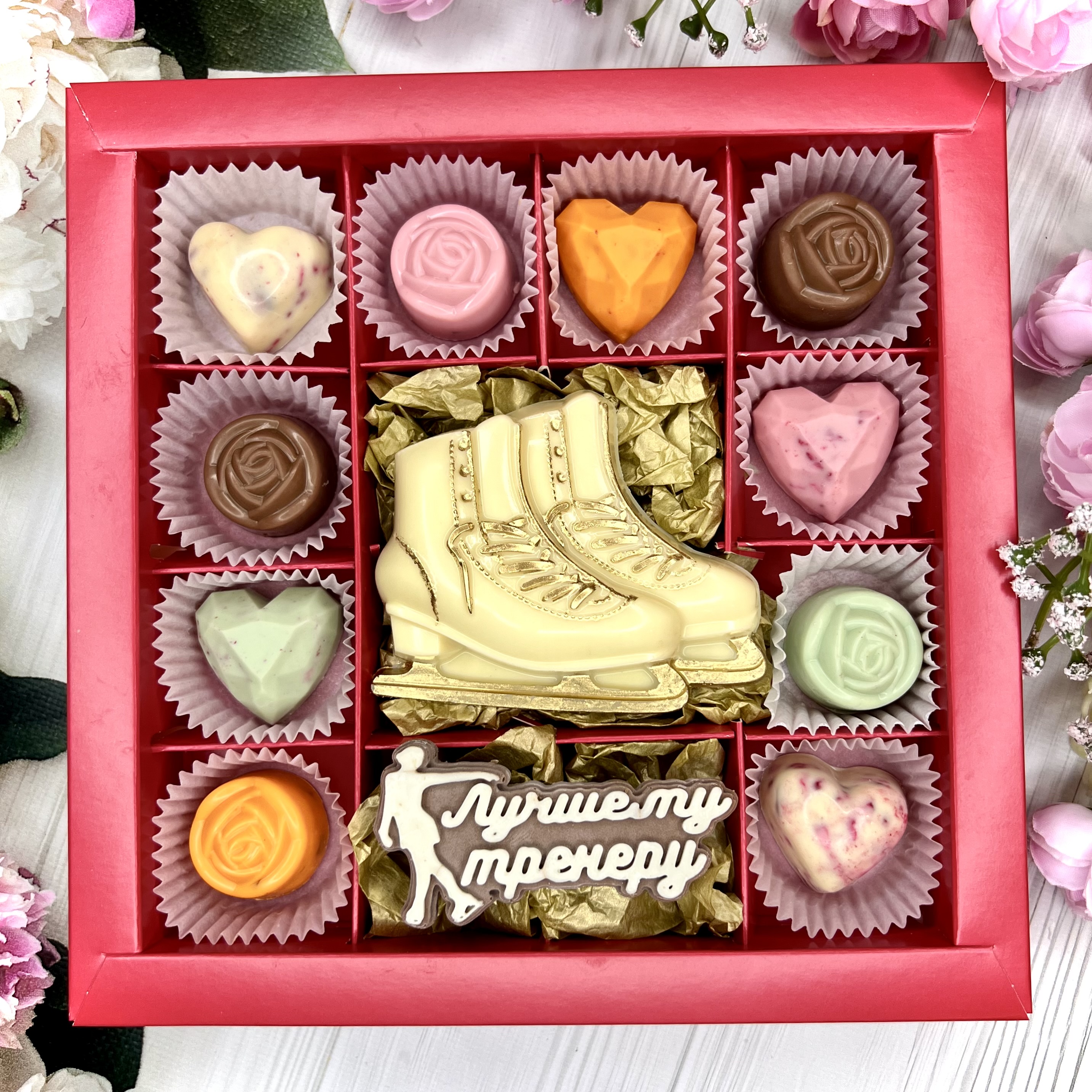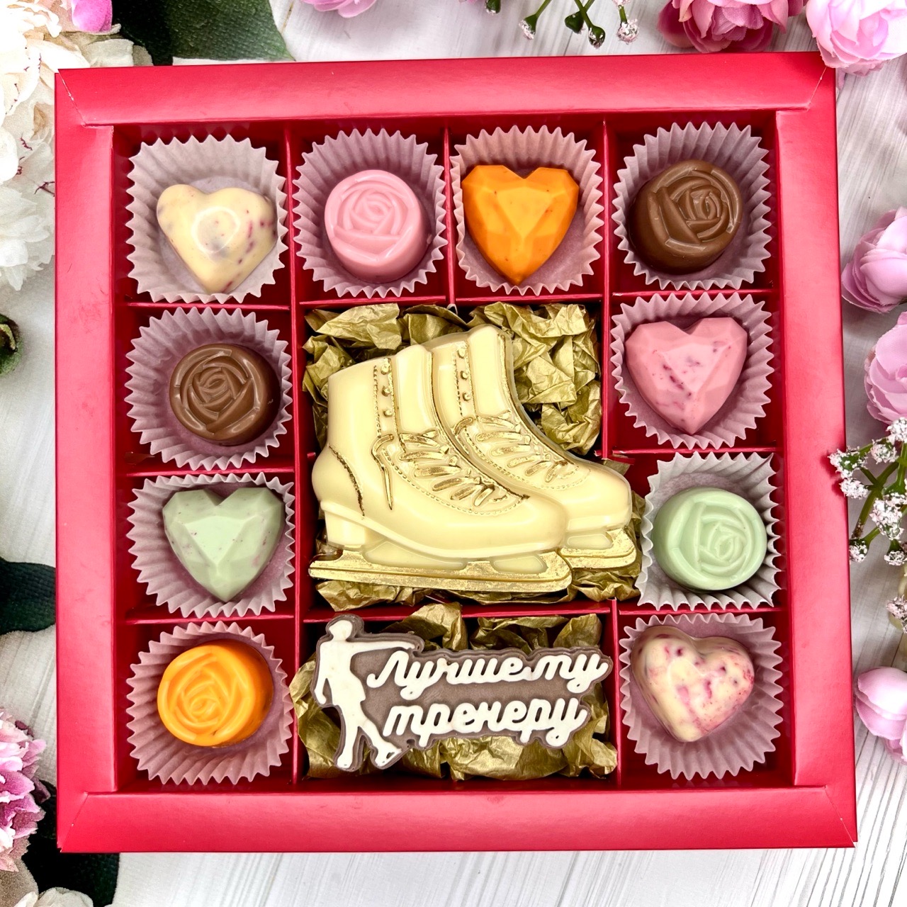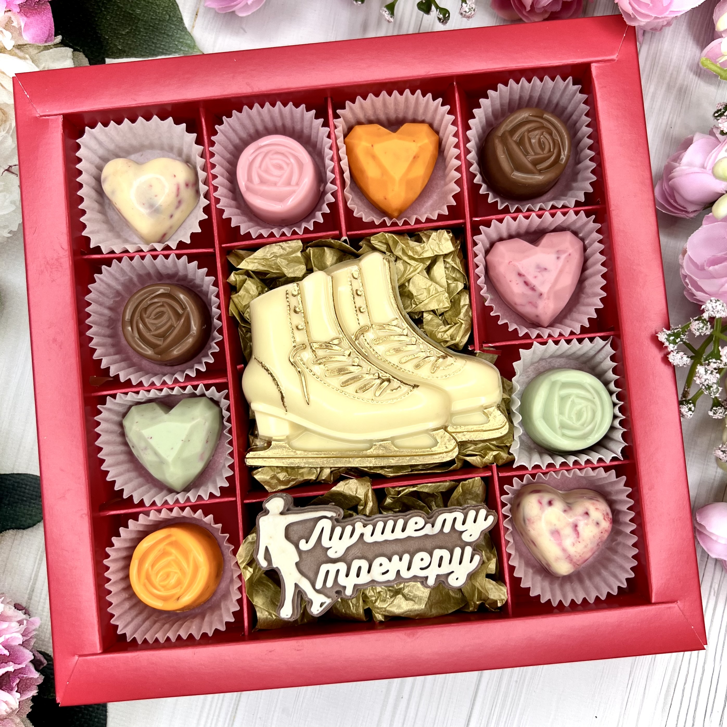Шоколадный подарок "Лучшему тренеру: женское фигурное катание": шоколадка и 10 конфет ручной работы - оригинальный, достойный и поистине вкусный подарок тренеру.