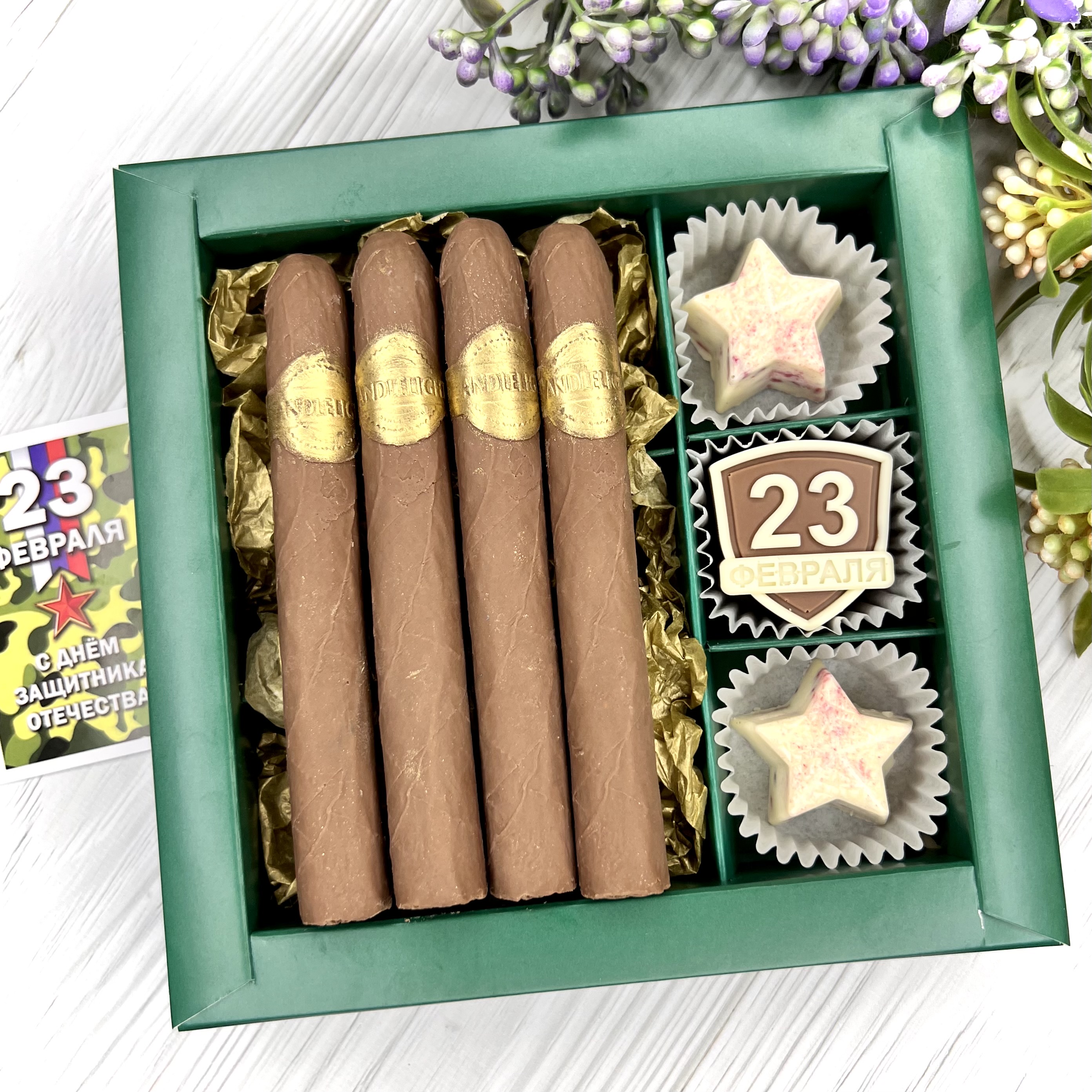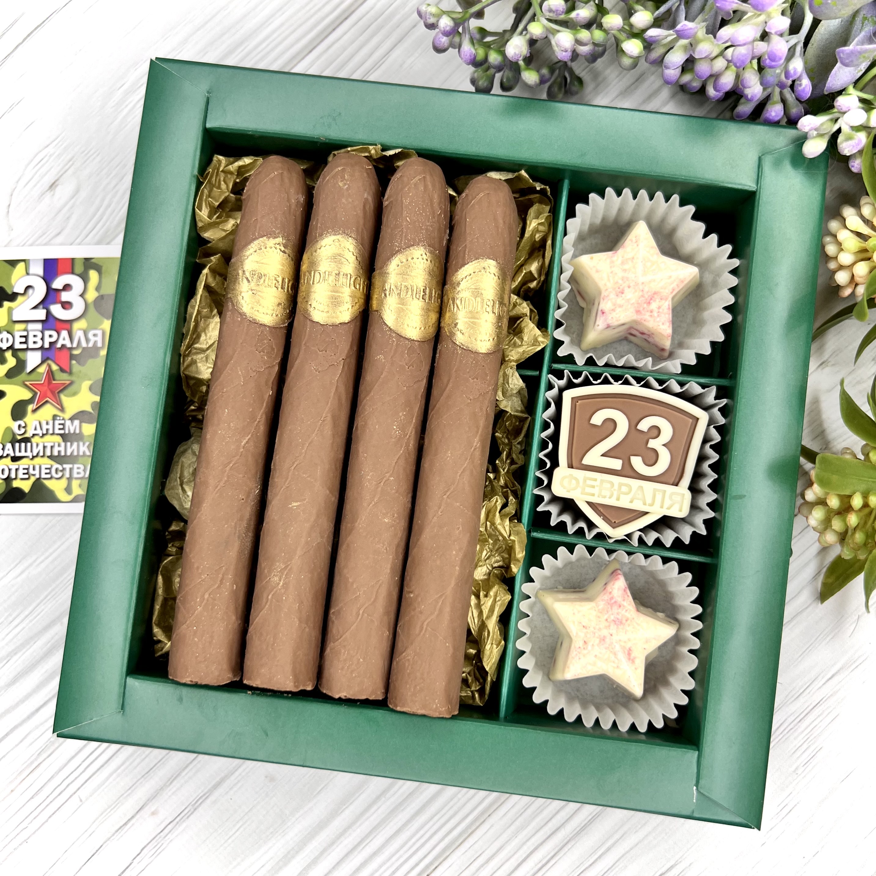 Шоколадный набор "23 февраля": сигары и 3 конфеты ручной работы - оригинальный, достойный и поистине вкусный подарок брутальному мужчине на день защитника отечества.