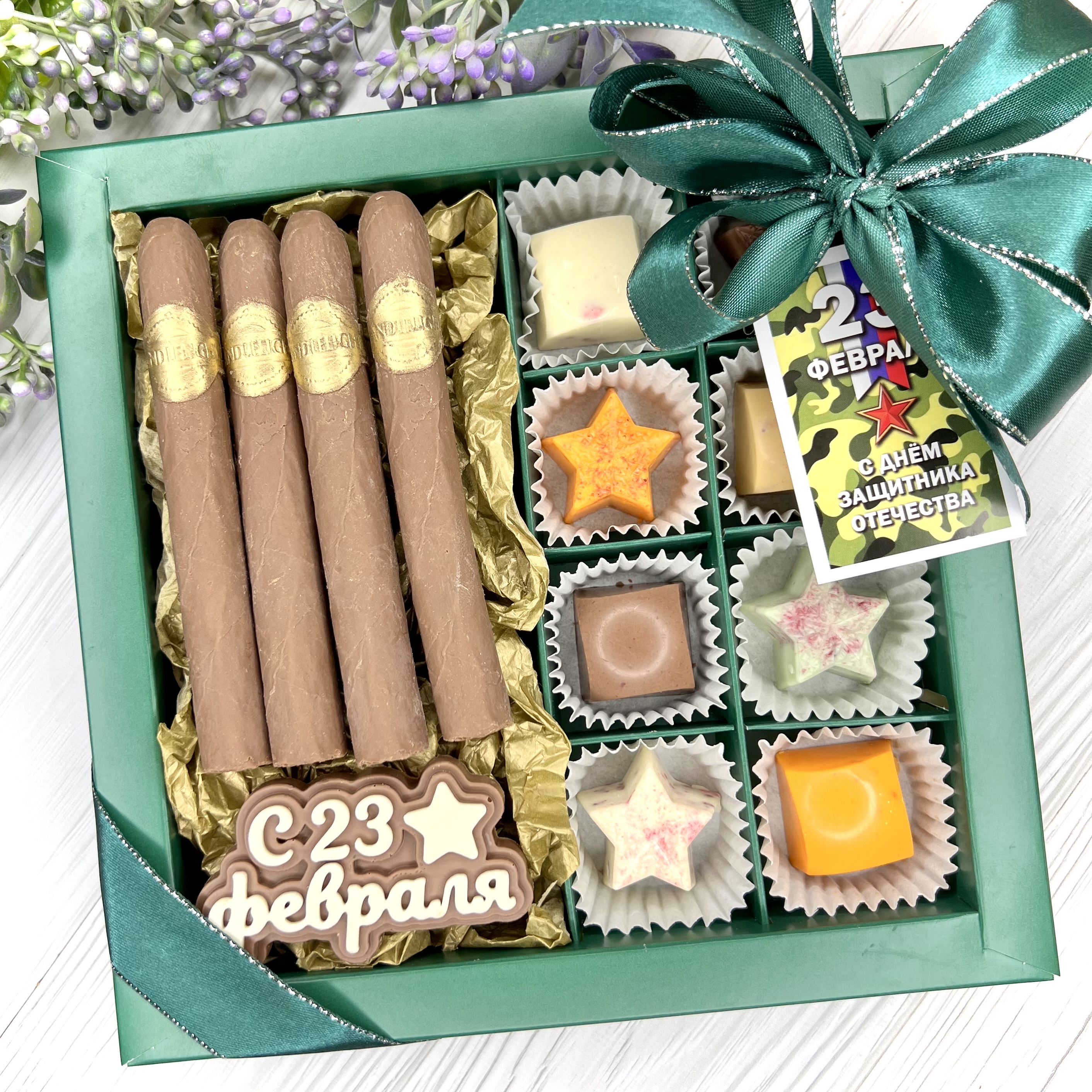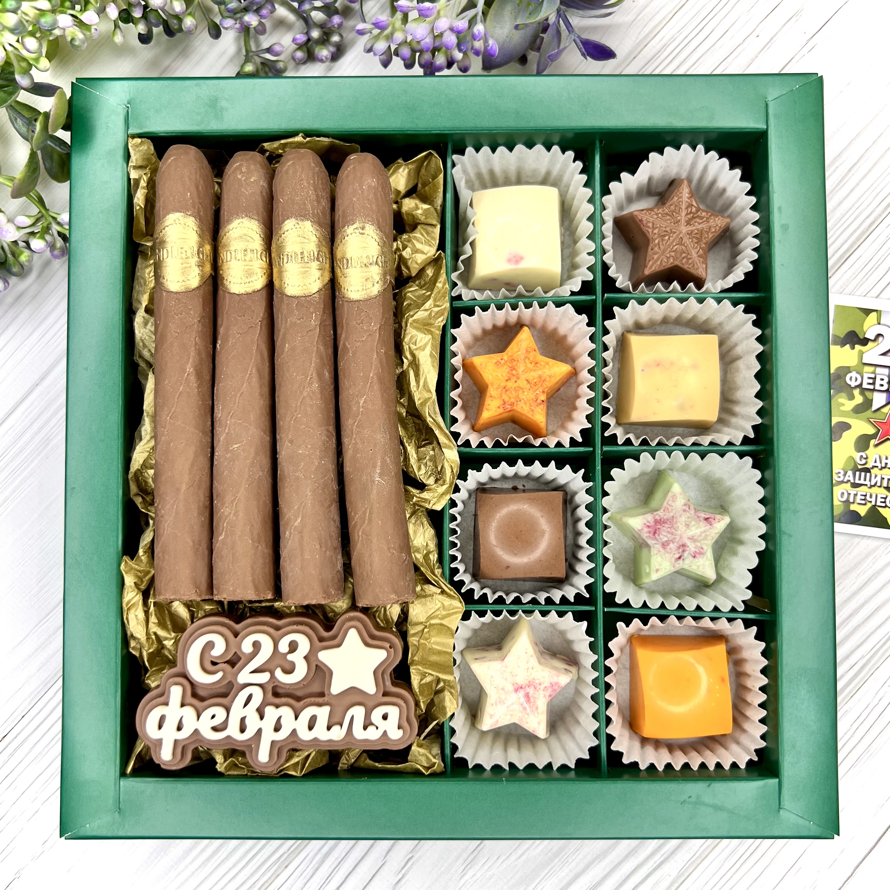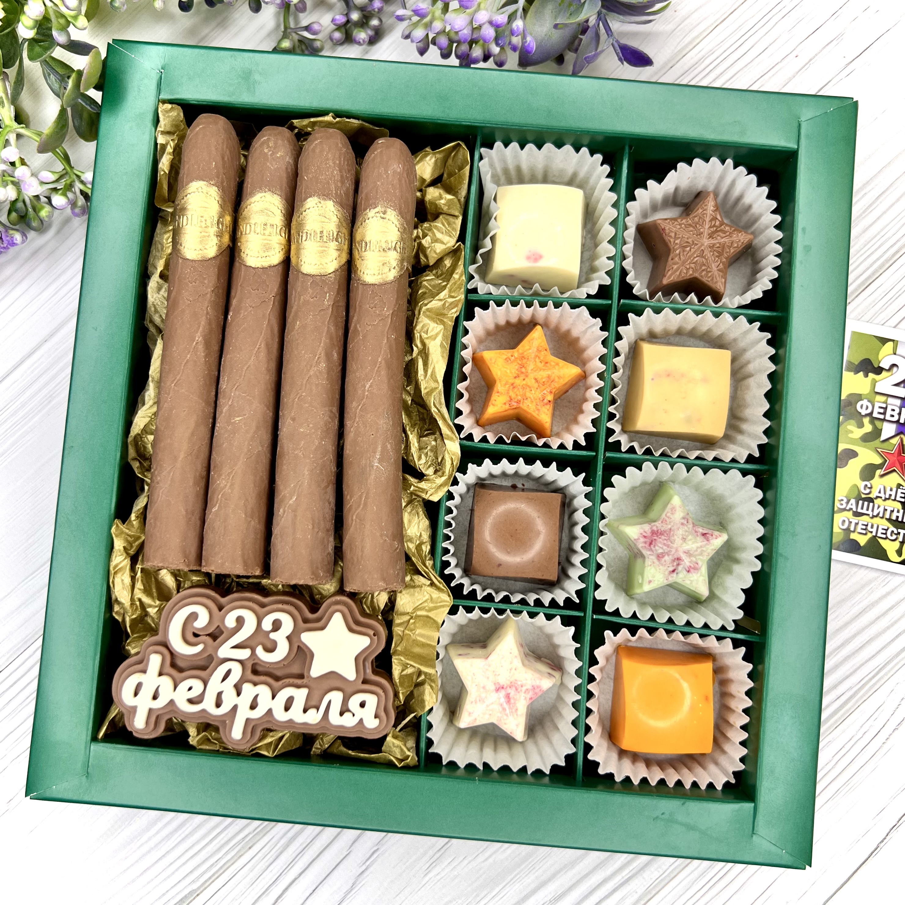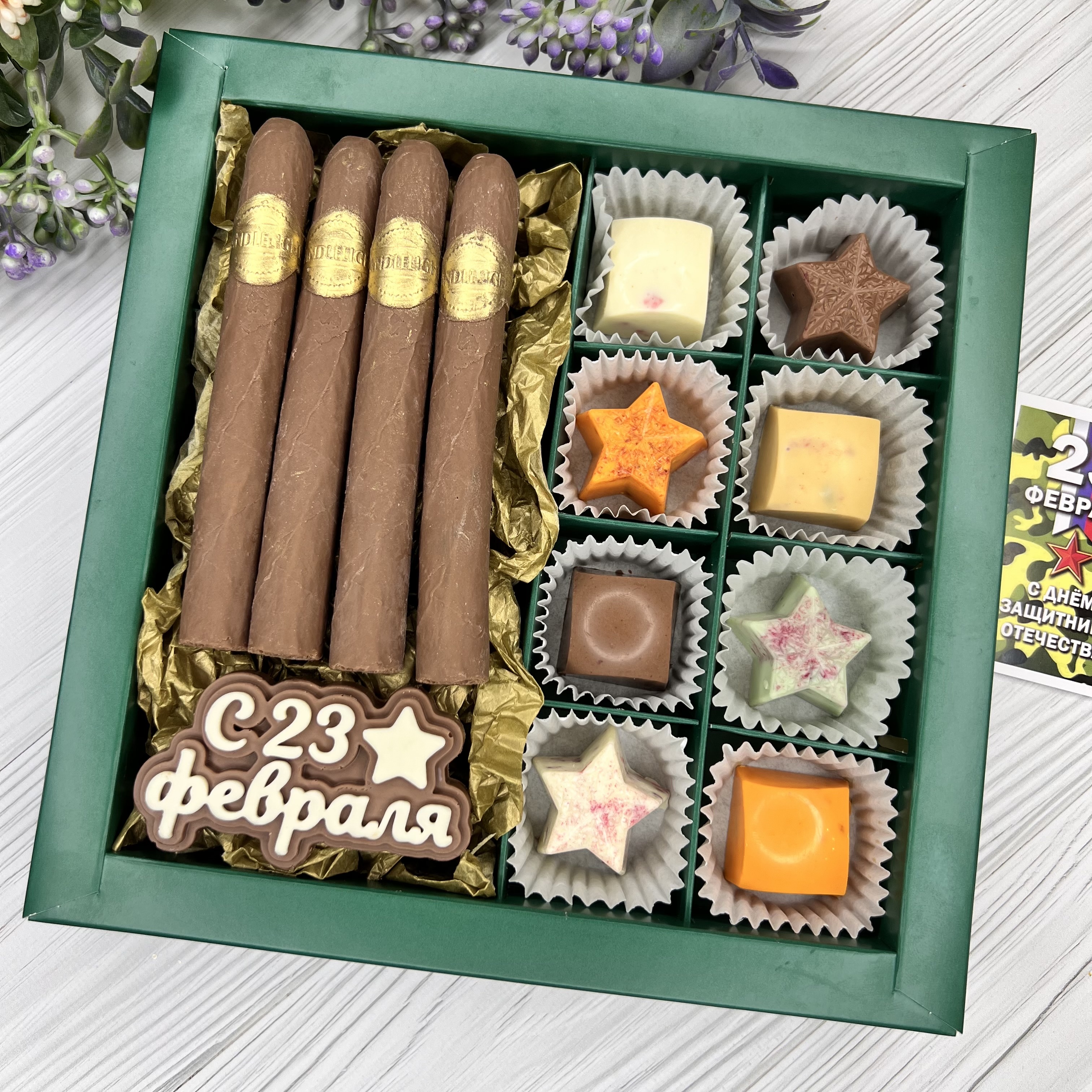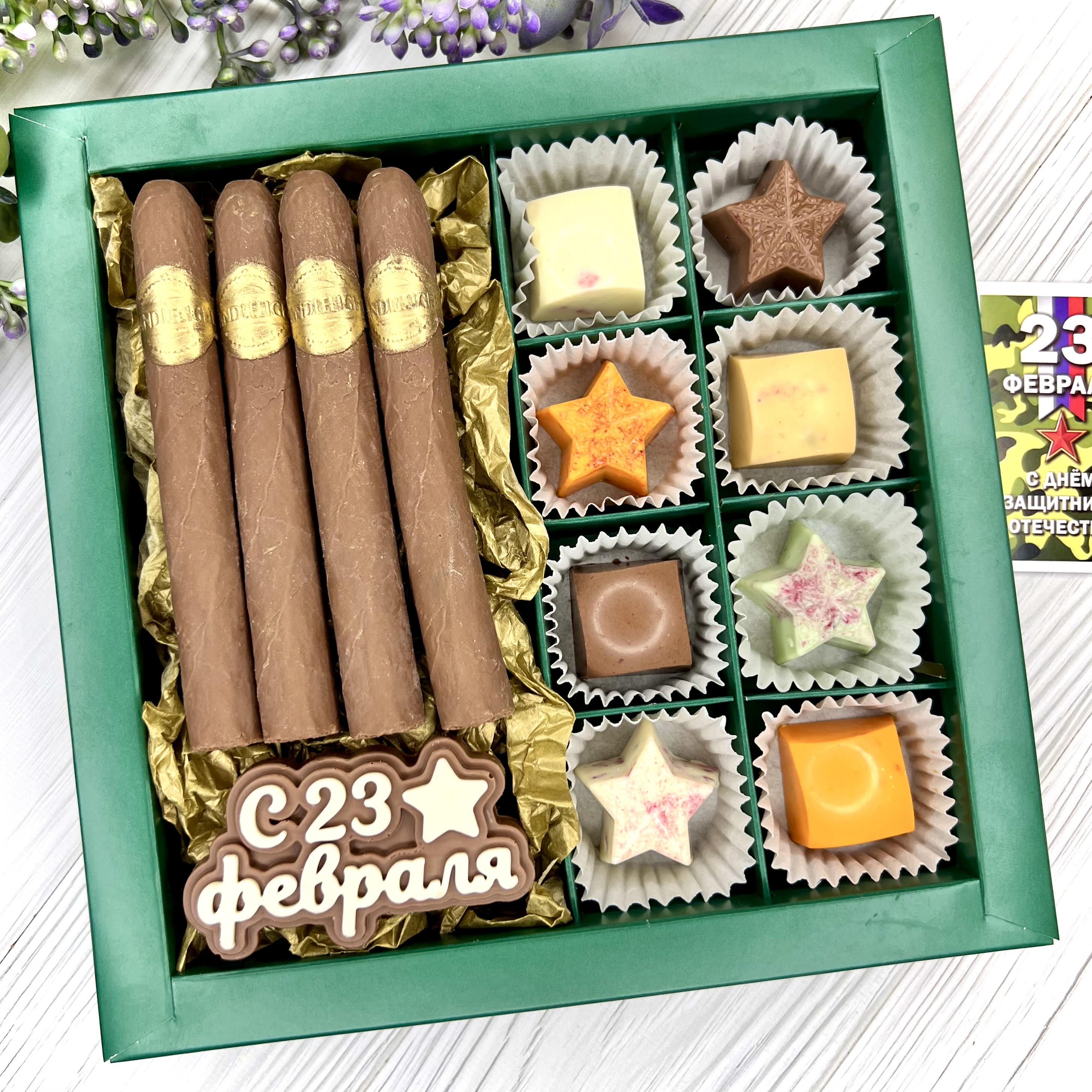 Шоколадный набор "23 февраля": сигары и 8 конфет ручной работы - оригинальный, достойный и поистине вкусный подарок брутальному мужчине на День Защитника Отечества.