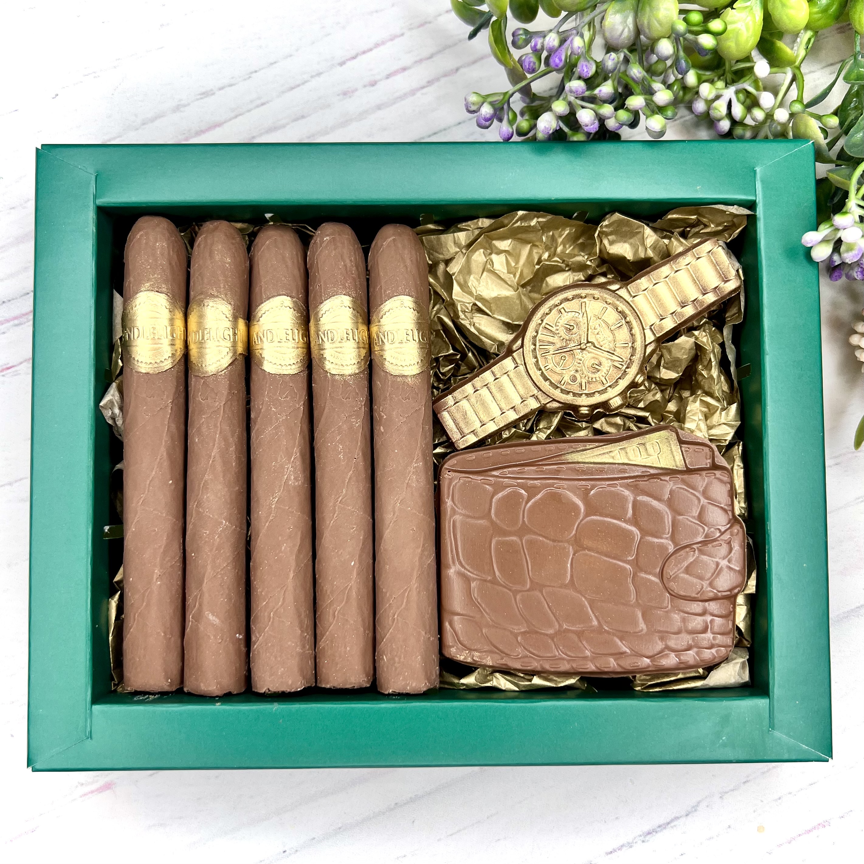 Сигары, портмоне и часы выглядят как настоящие! Получатель такого наборы будет приятно удивлен, узнав, что они из шоколада!