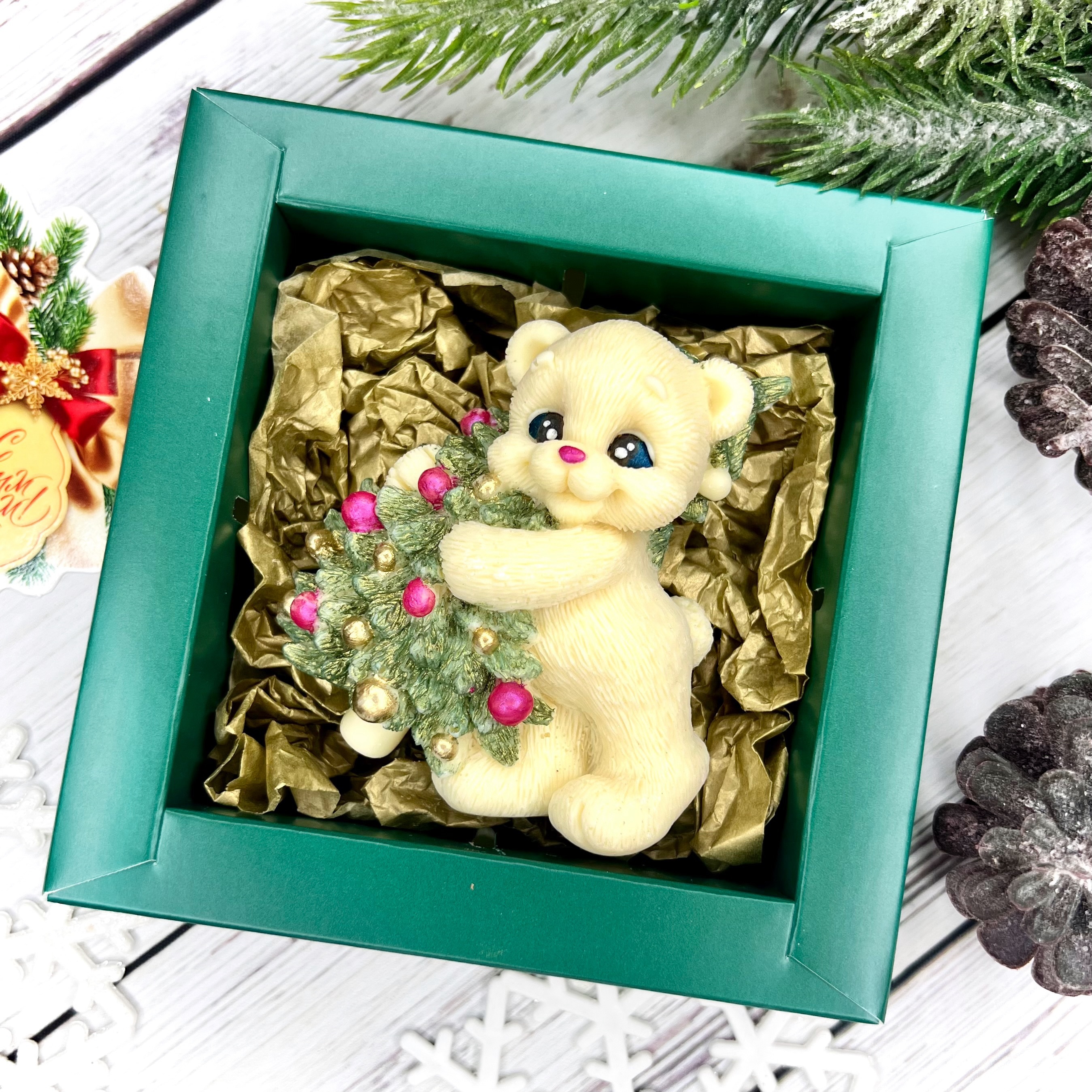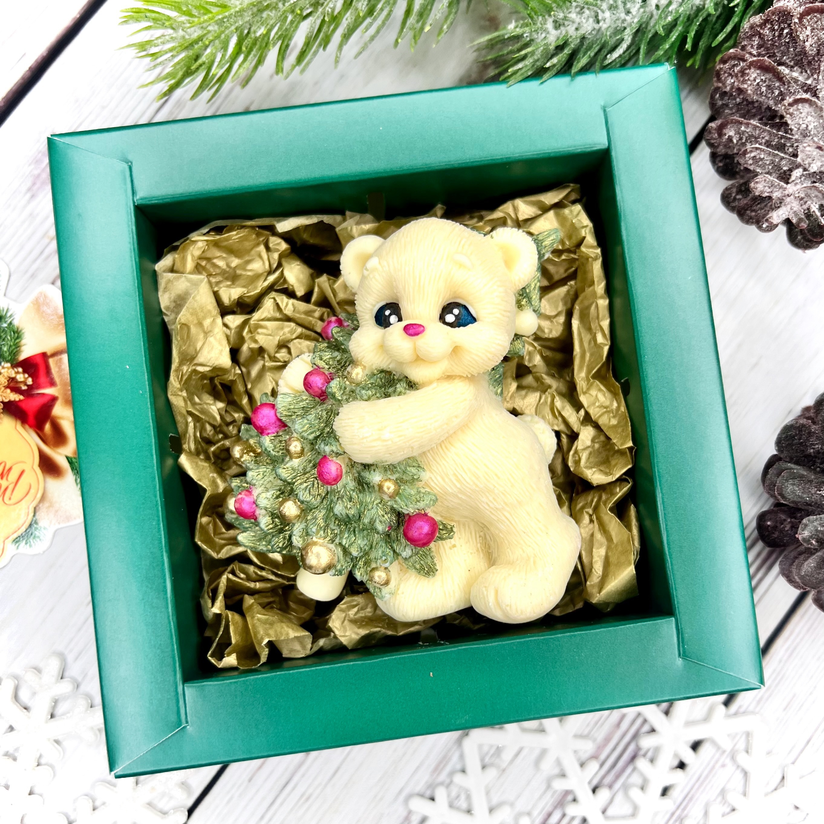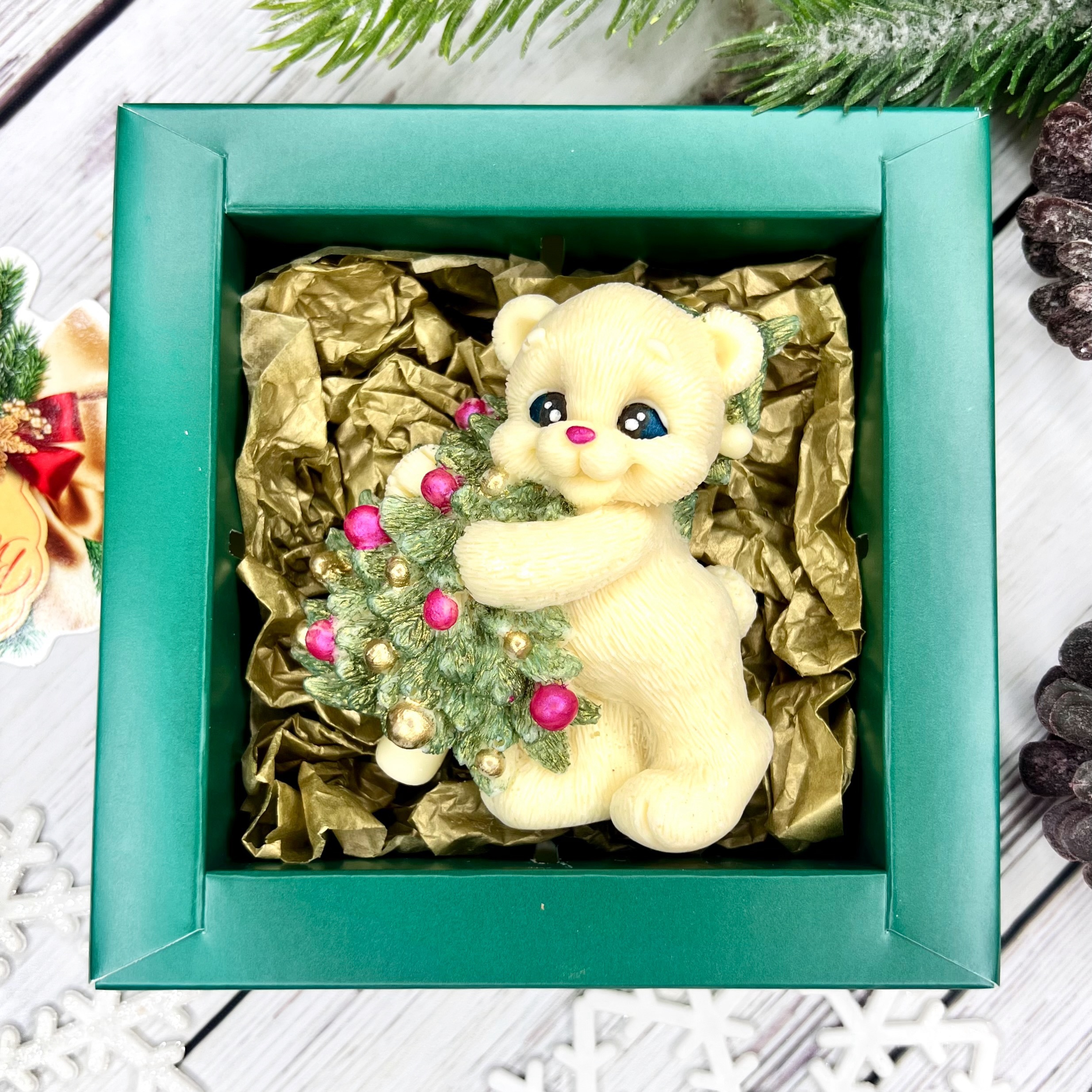 Шоколадная фигурка "Мишка с ёлкой" - оригинальный и вкусный подарок на Новый 2026 год из премиального белого швейцарского шоколада.
