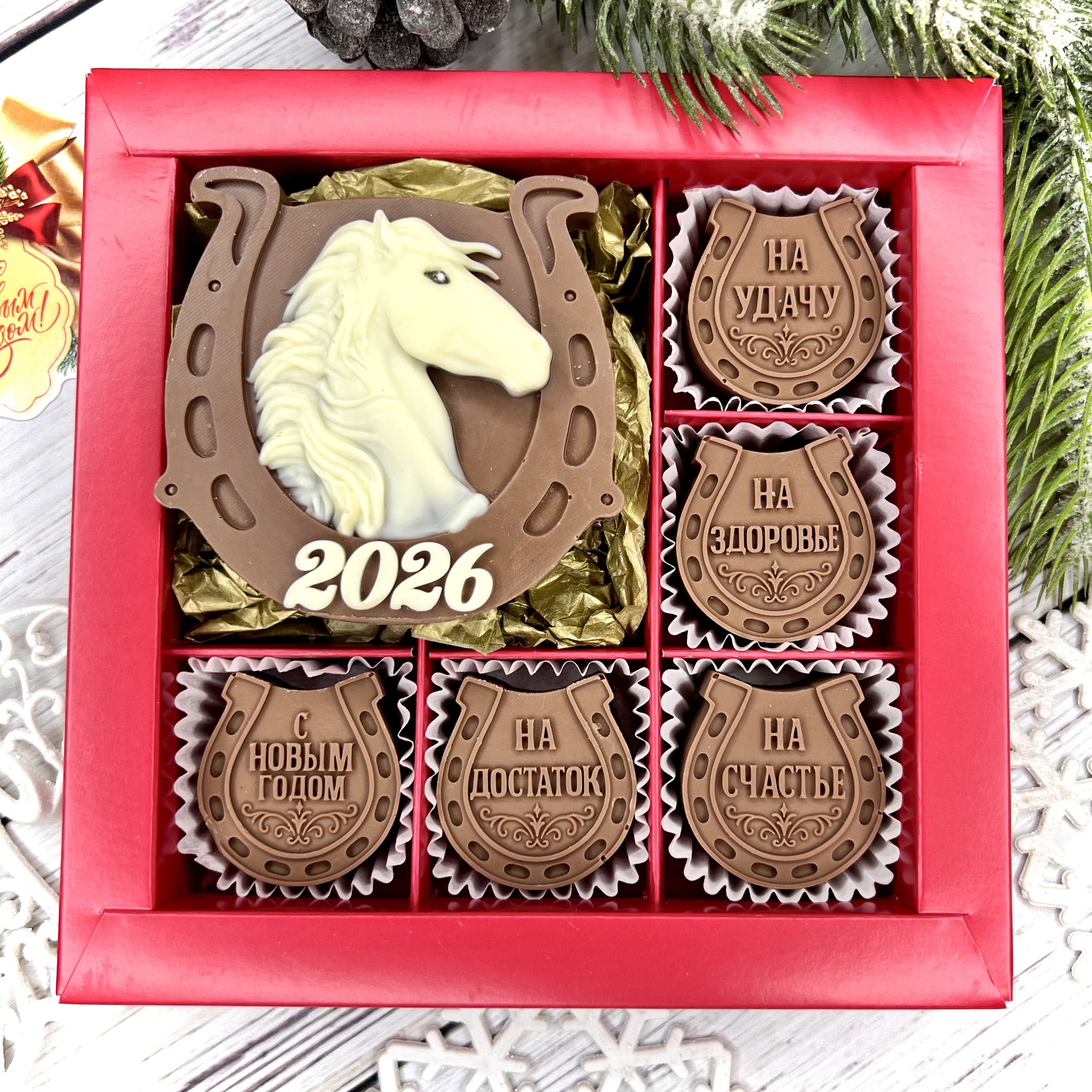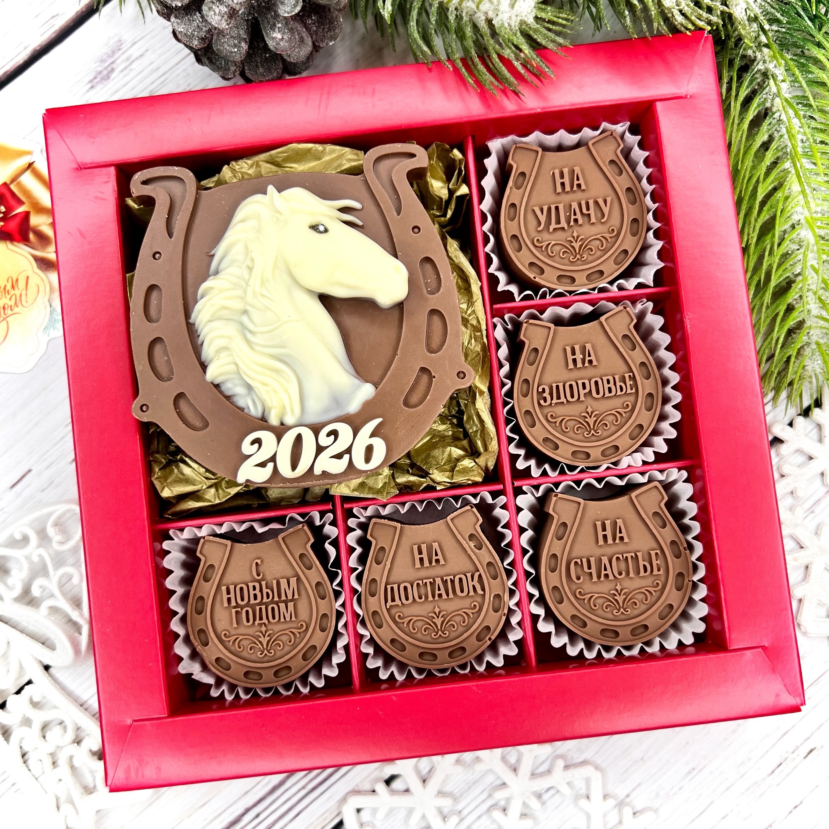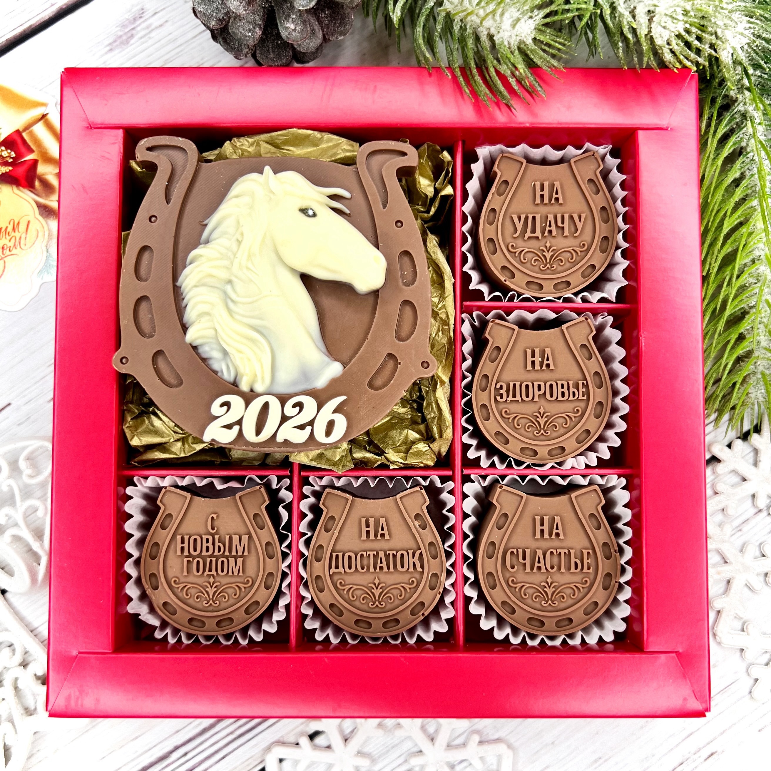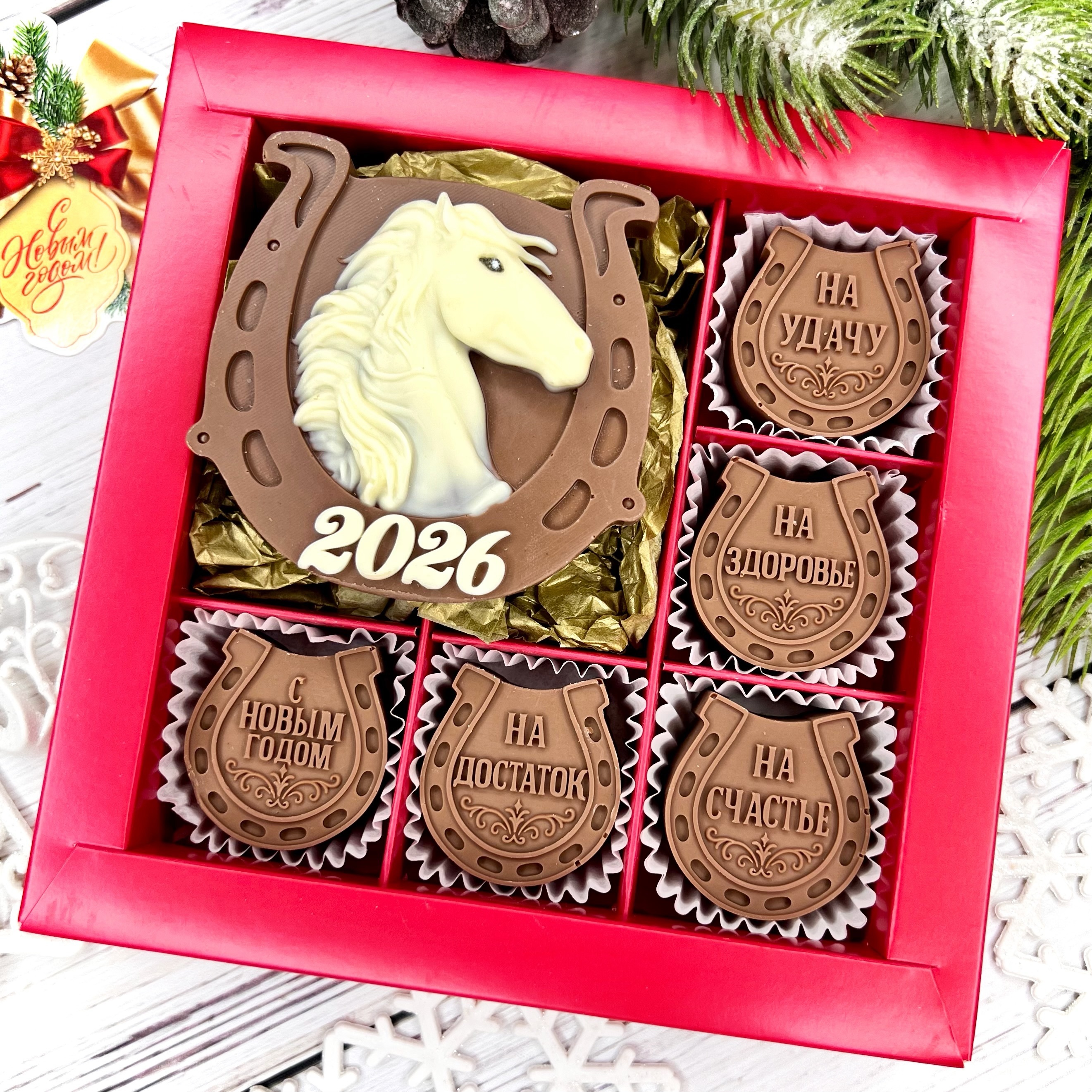 Новый 2026 год начинается со сладости и удачи! Шоколадка в виде символ 2026 года Лошадь и конфеты-подковы - очаровательный талисман с добрыми пожеланиями! Идеальный подарок для тех, кому желаете самого лучшего в Новом 2026 году!