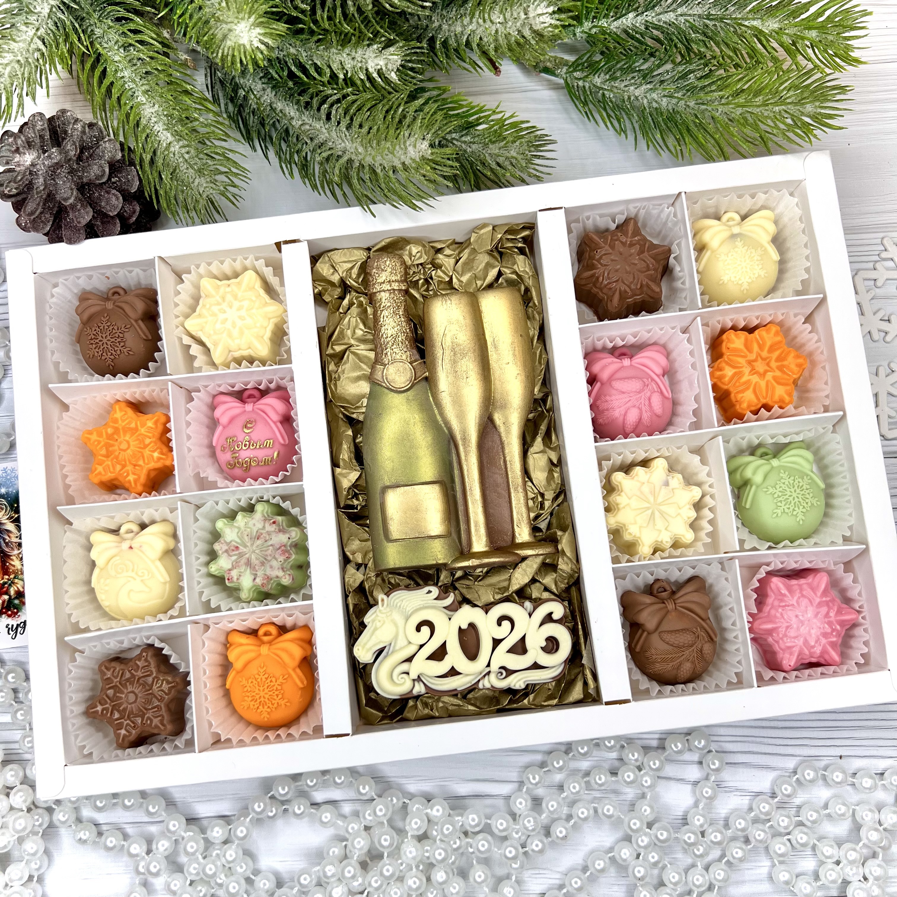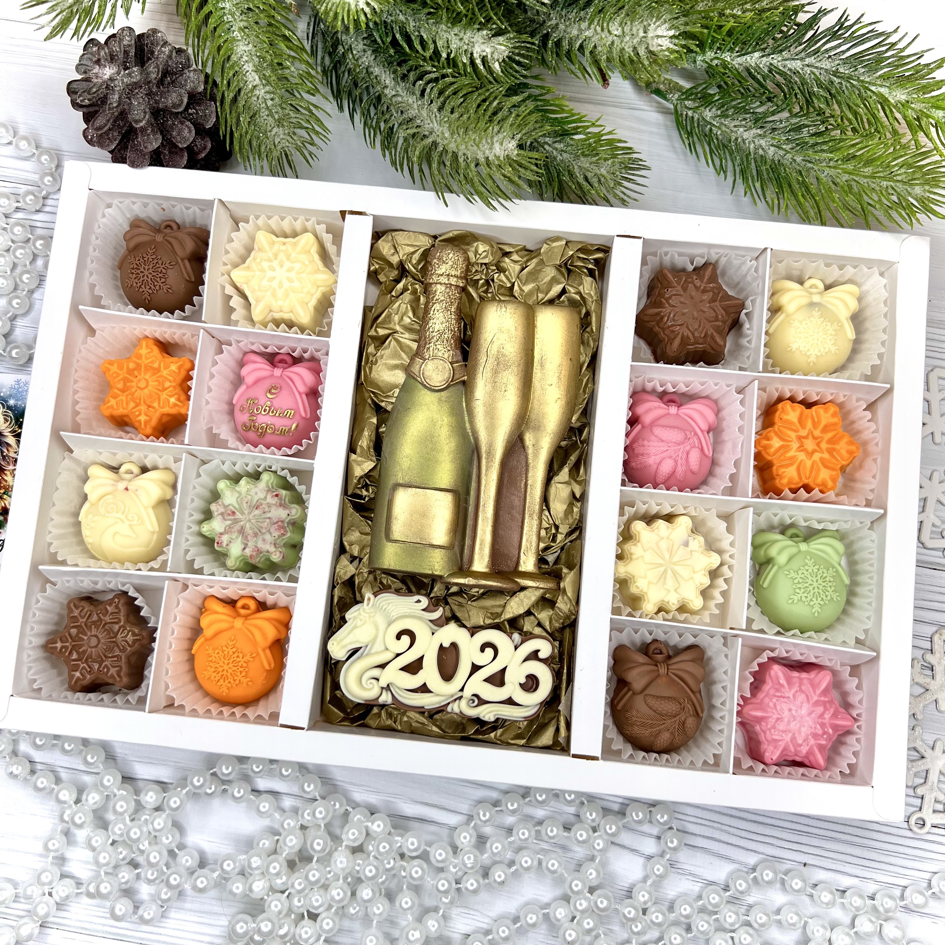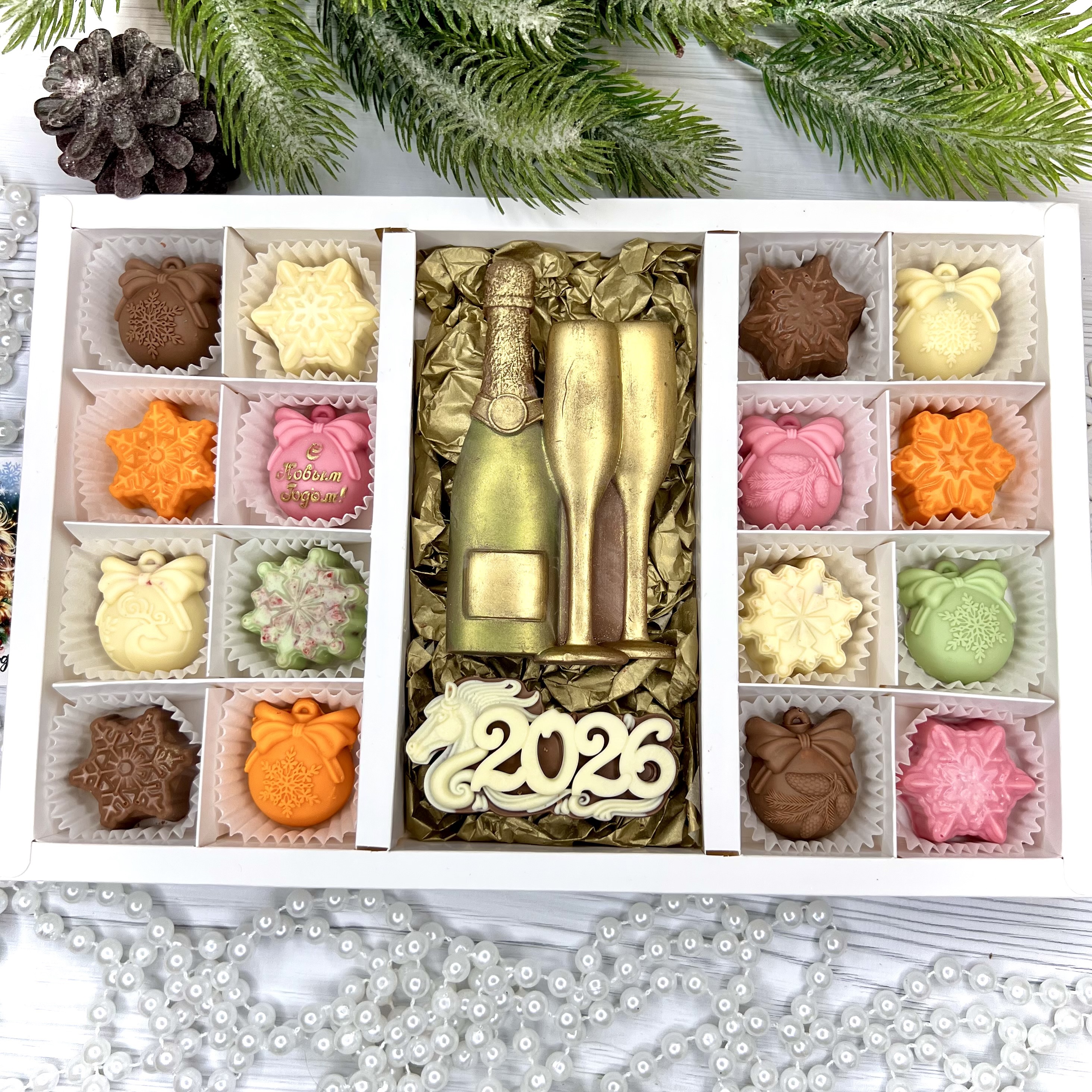 Шоколадный набор "С новым годом 2026. Шампанское": 2 шоколадки и 16 конфет ручной работы - оригинальный, достойный и поистине вкусный подарок на Новый год 2026 из премиального бельгийского и швейцарского шоколада.