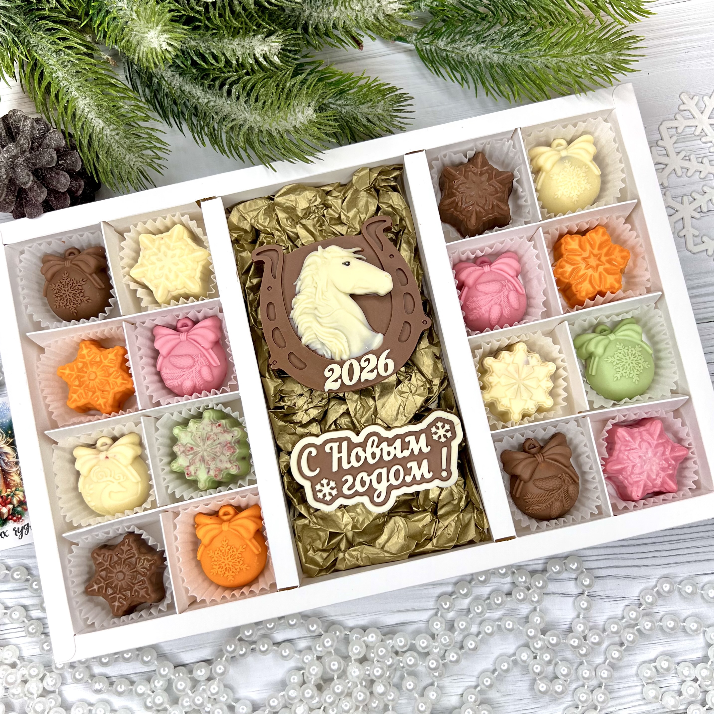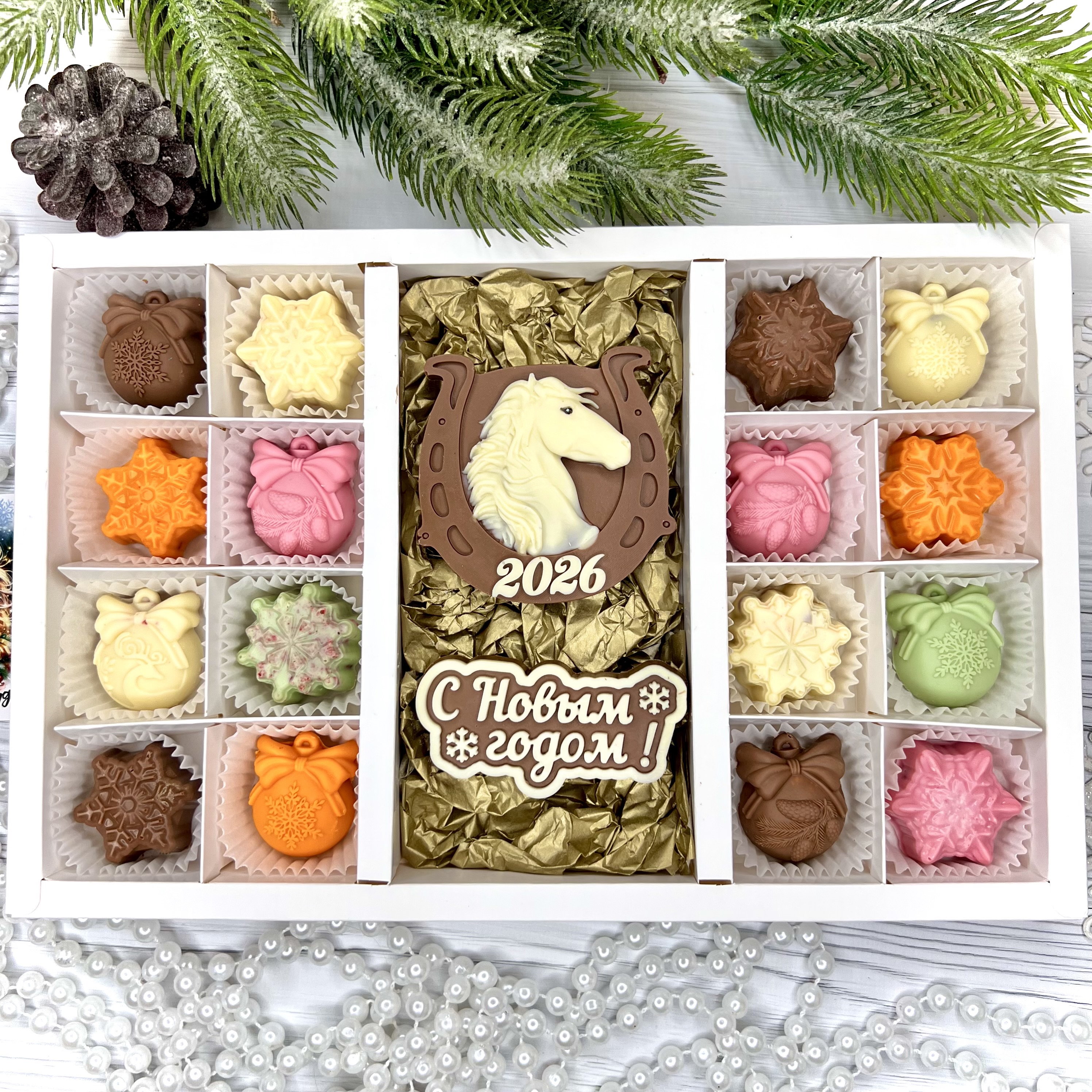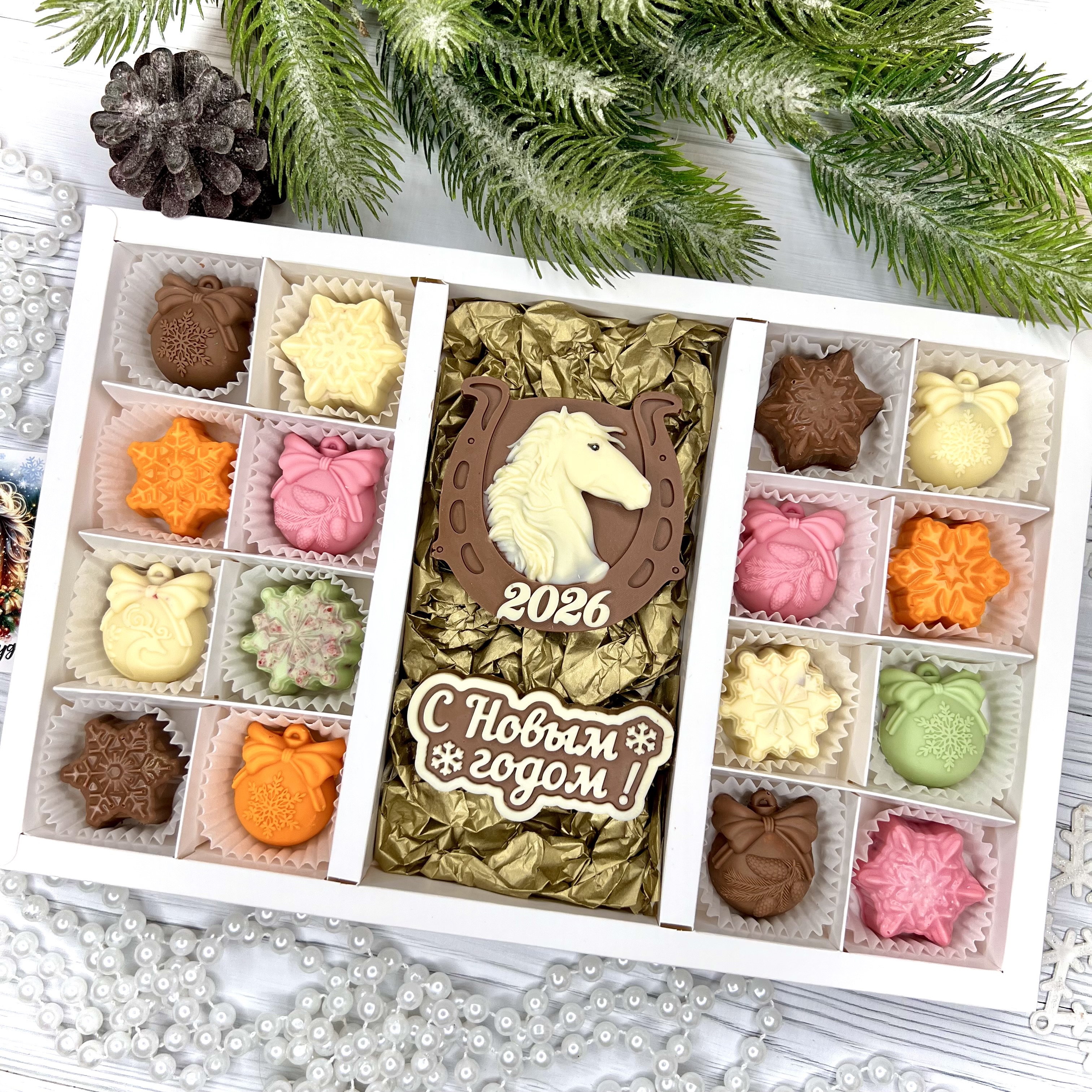 Шоколадный набор "С новым годом. Лошадь 2026": 2 шоколадки и 16 конфет ручной работы - оригинальный, достойный и поистине вкусный подарок на Новый год 2026 из премиального бельгийского и швейцарского шоколада.