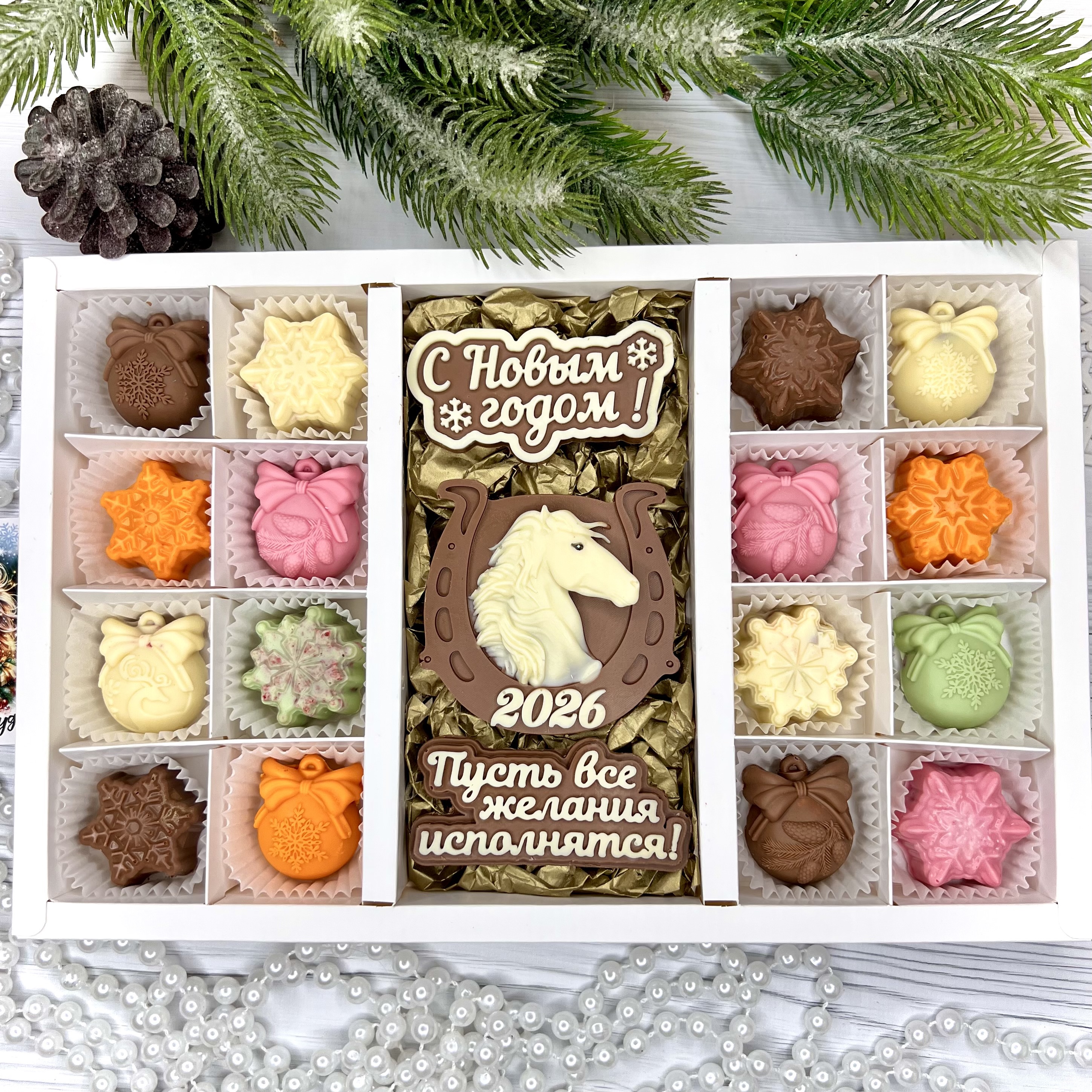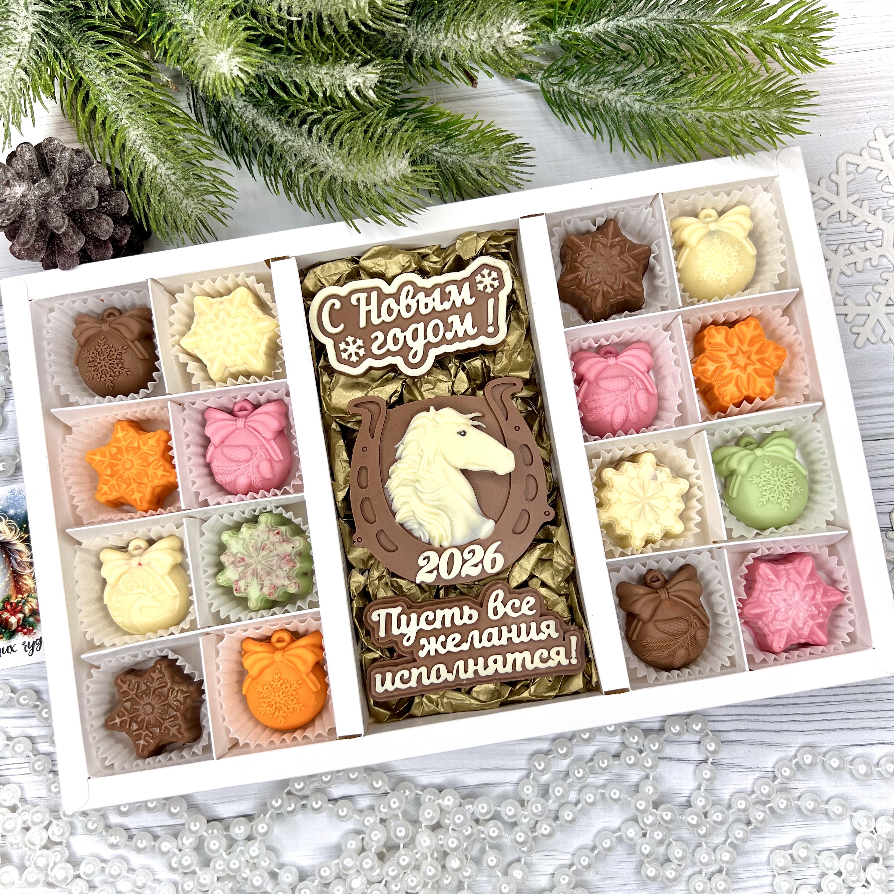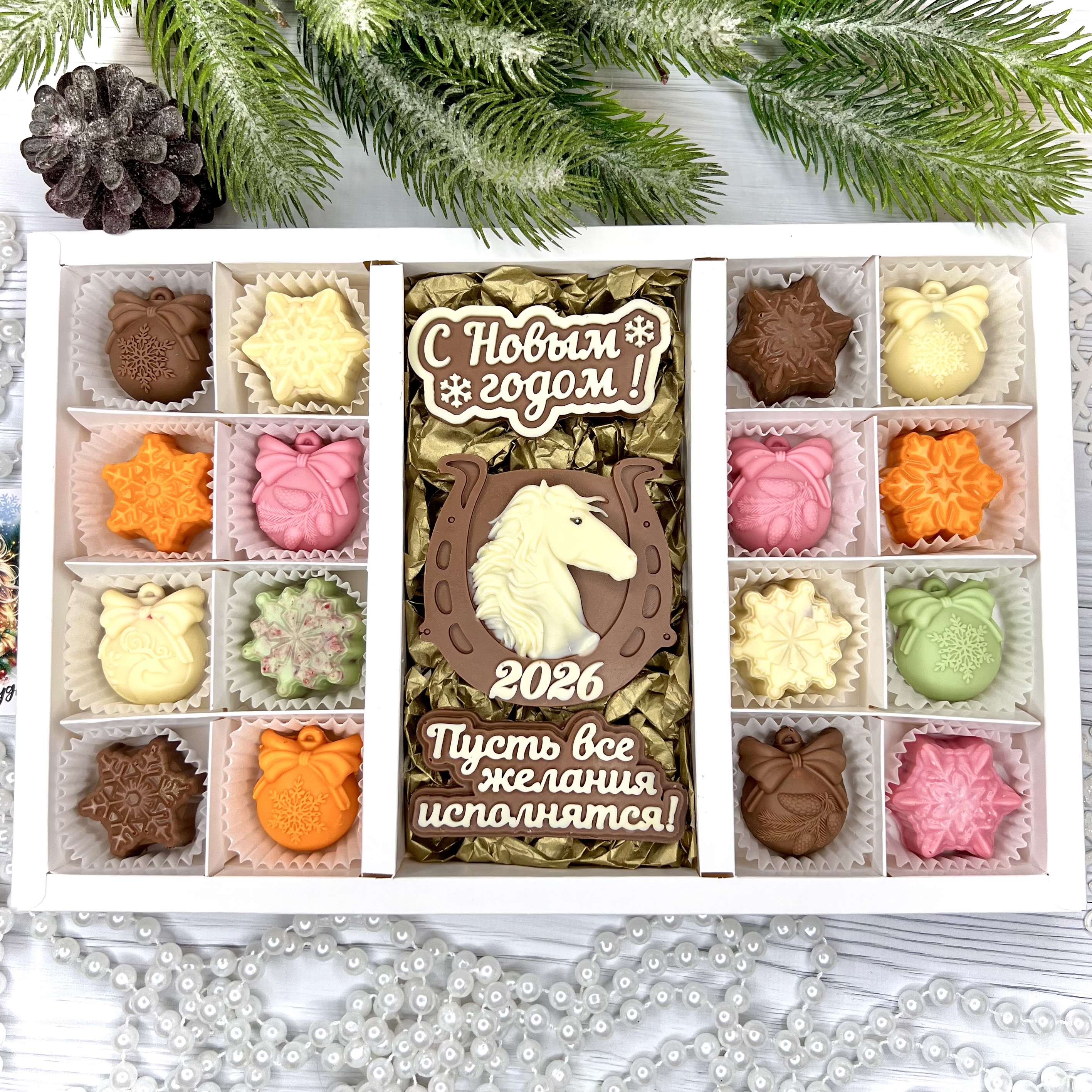 Шоколадный набор "С новым годом. Лошадь 2026. Пусть все желания исполняться": 3 шоколадки и 16 конфет ручной работы - оригинальный, достойный и поистине вкусный подарок на Новый год 2026 из премиального бельгийского и швейцарского шоколада.