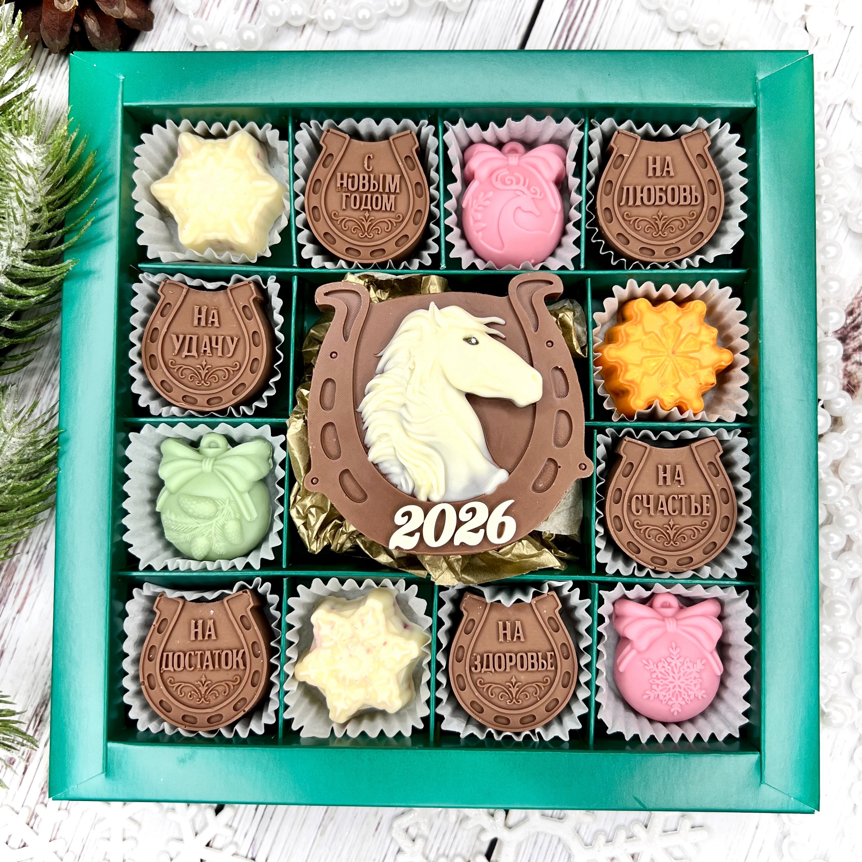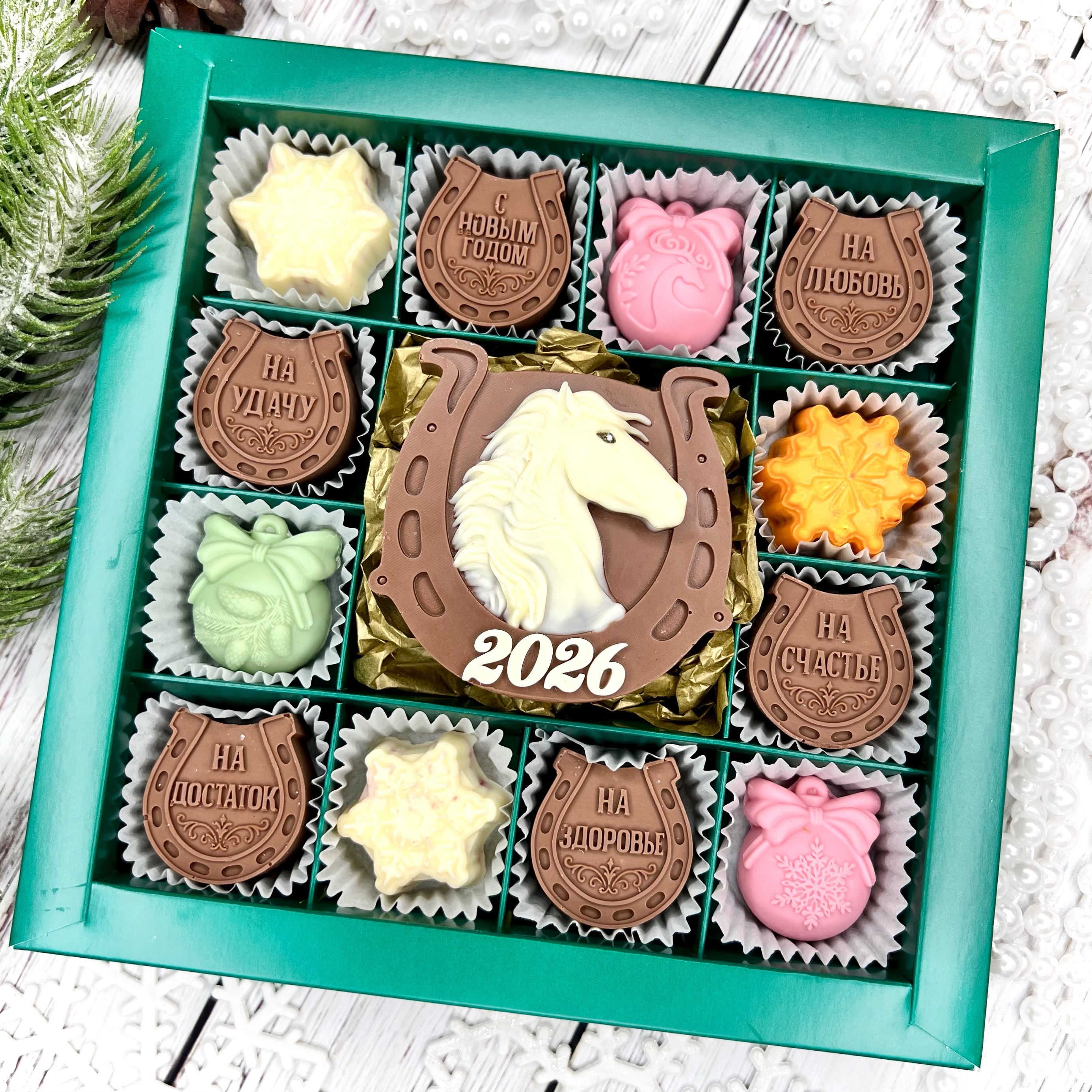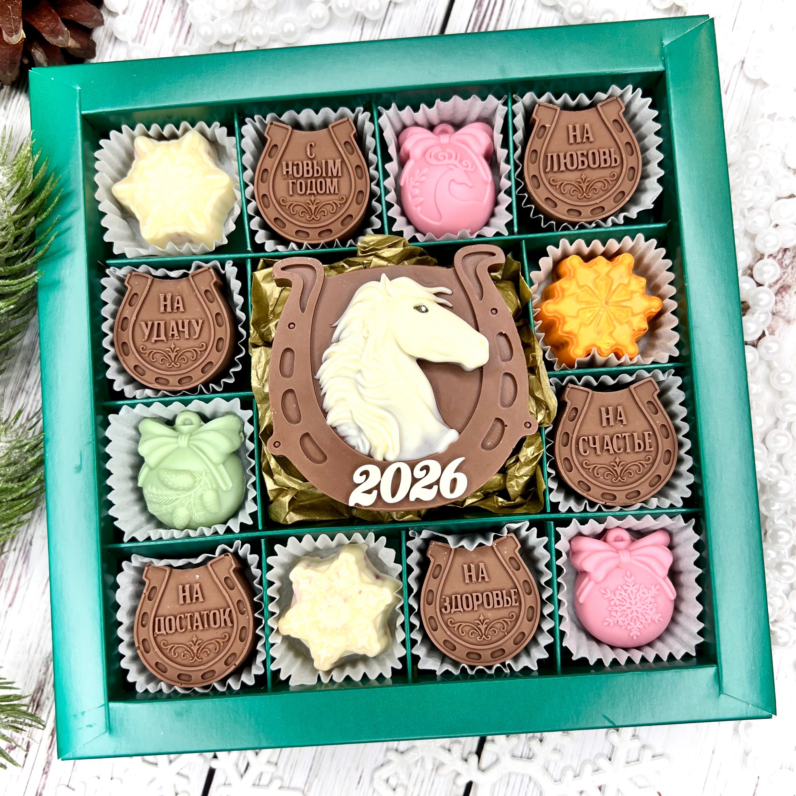Новый 2026 год начинается со сладости и удачи! Шоколадка в виде символ 2026 года Лошадь и конфеты-подковы - очаровательный талисман с добрыми пожеланиями! Идеальный подарок для тех, кому желаете самого лучшего в Новом 2026 году!
