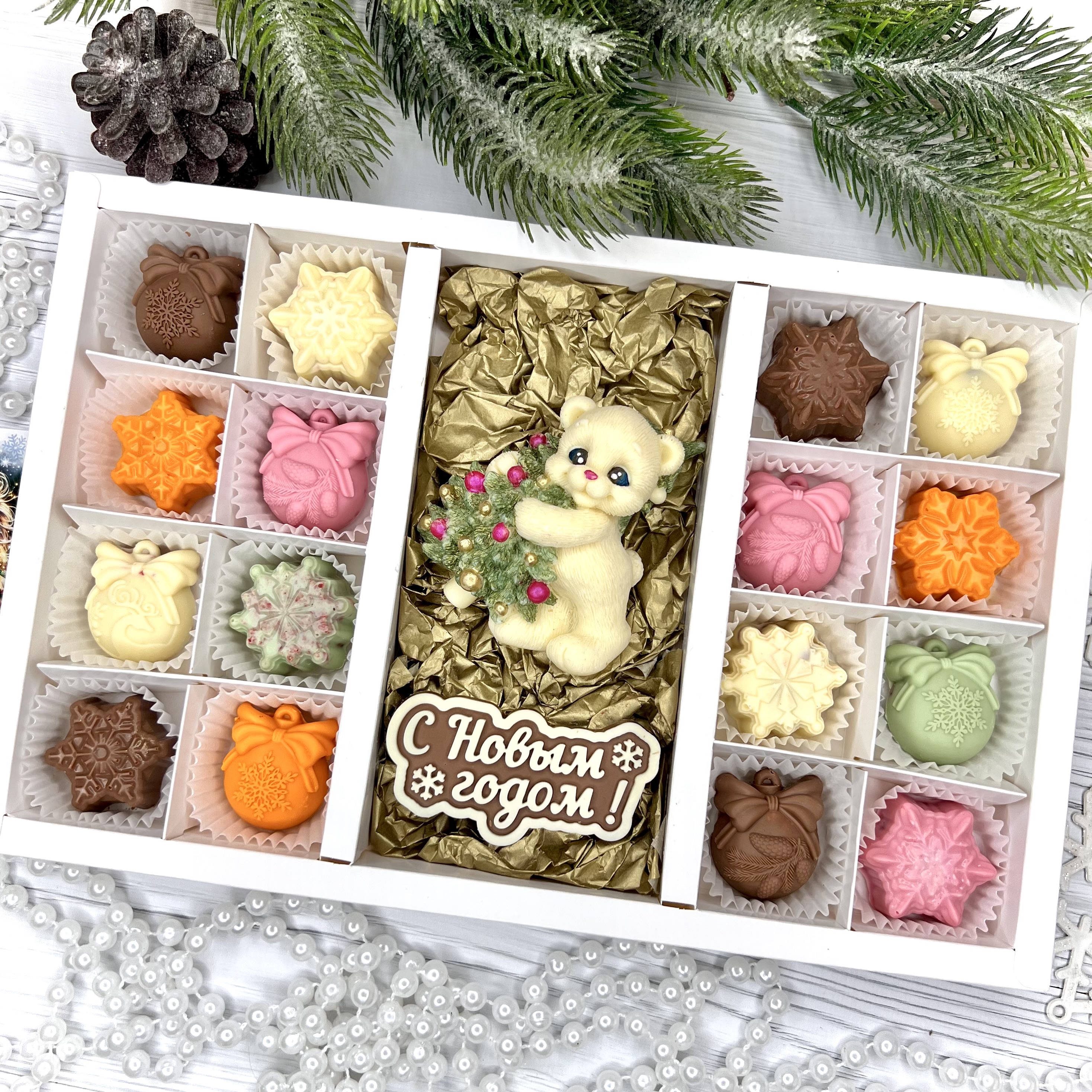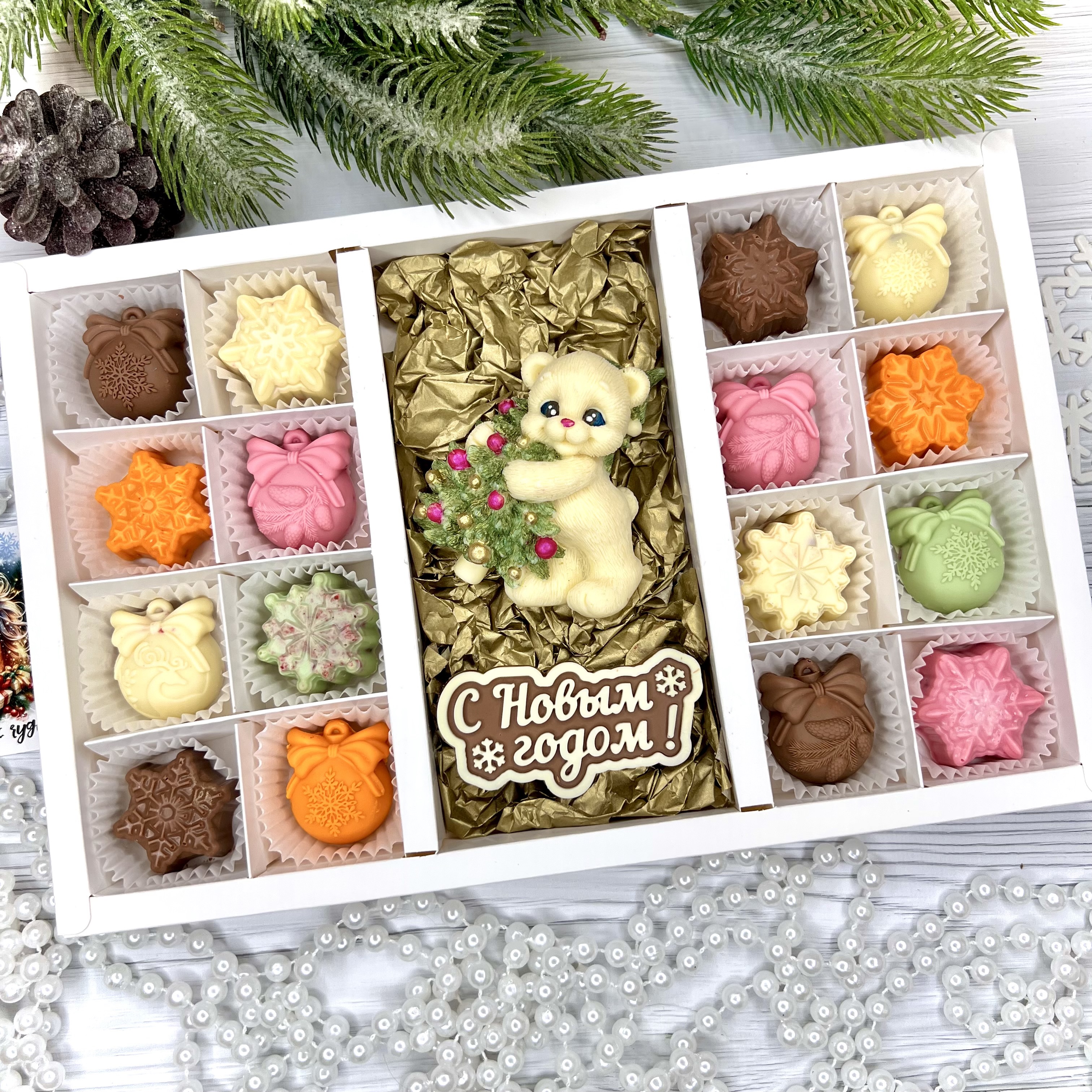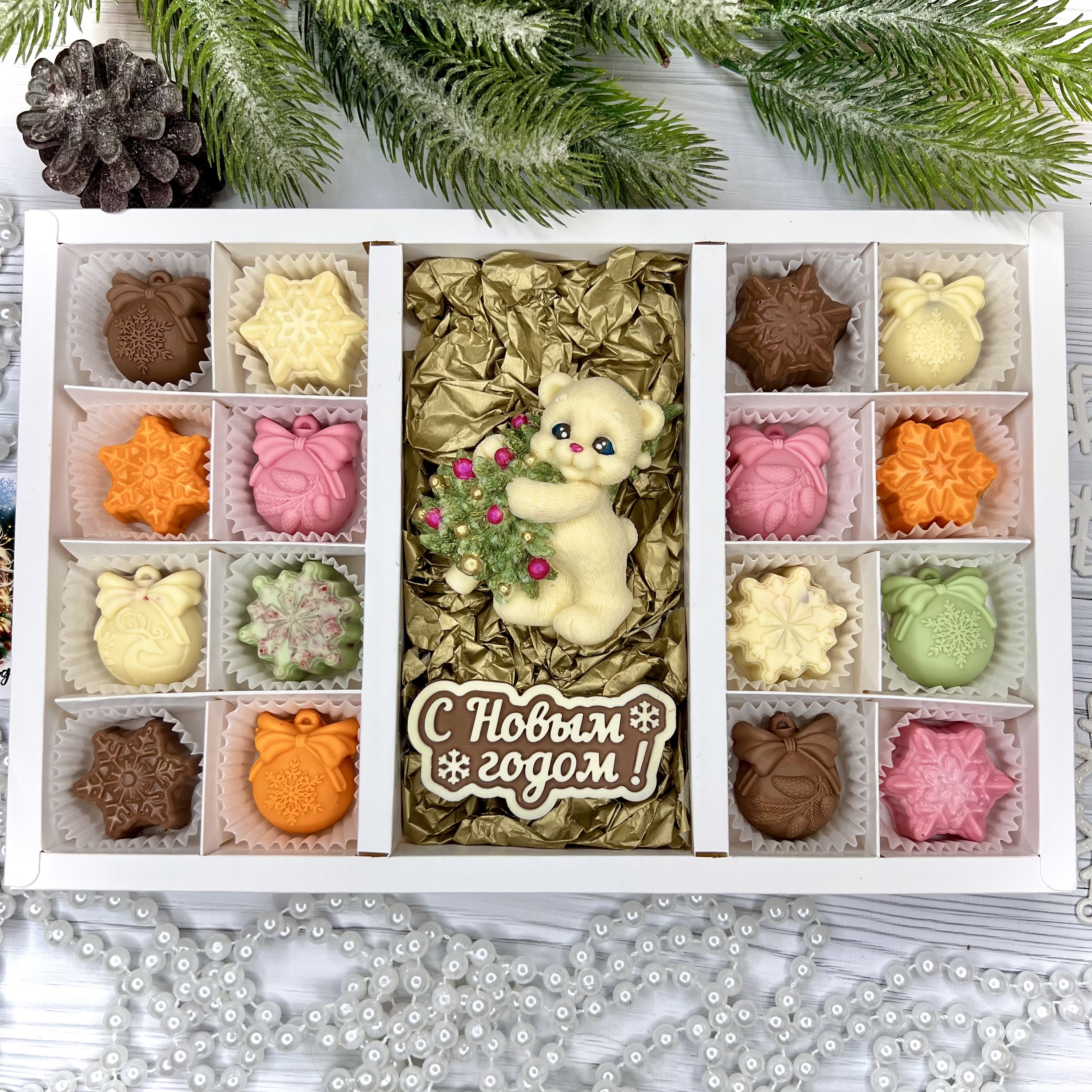 Шоколадный набор "С новым годом. Мишка с ёлкой. 2026": шоколадка и 5 конфет ручной работы - оригинальный, достойный и поистине вкусный подарок на Новый год 2026 из премиального бельгийского и швейцарского шоколада.