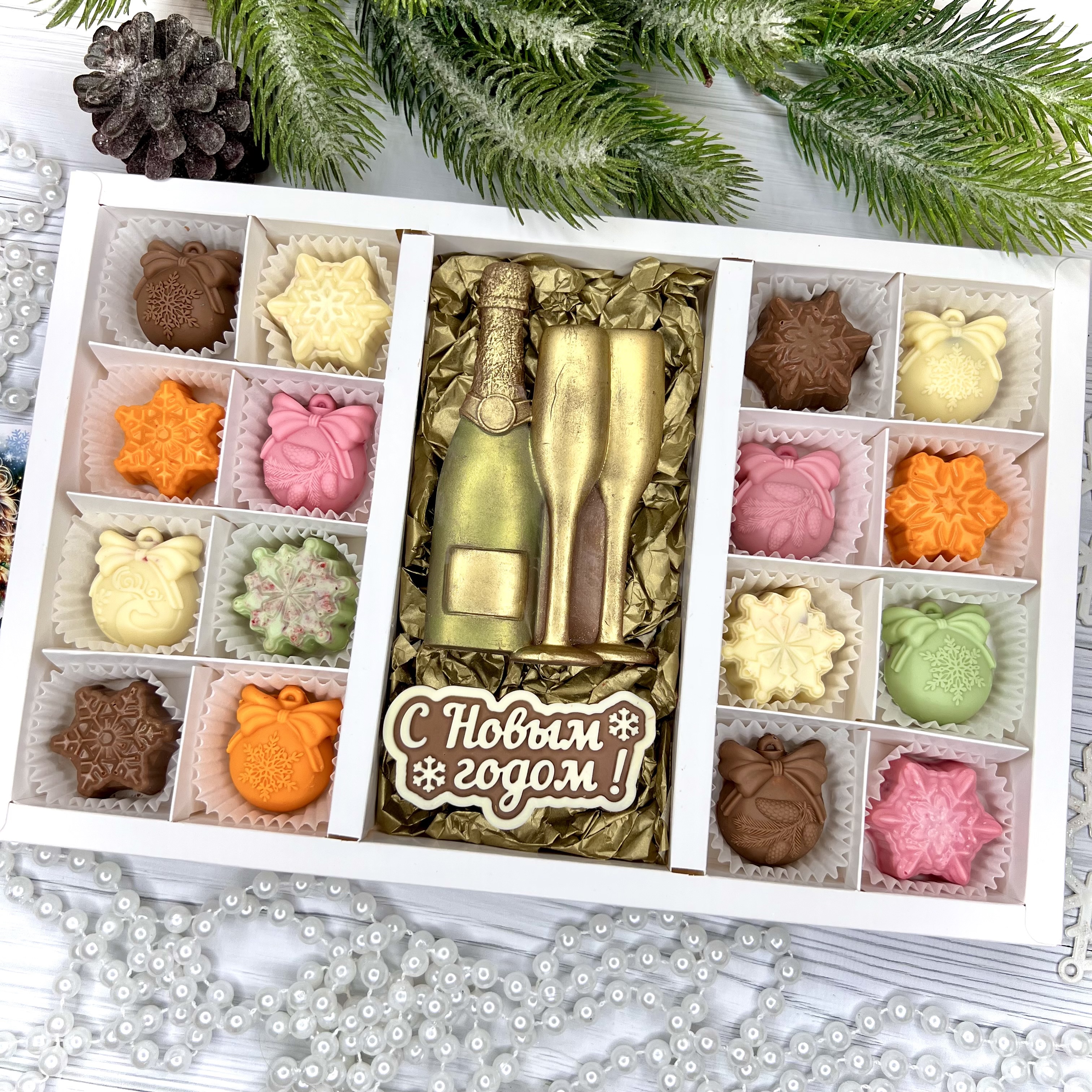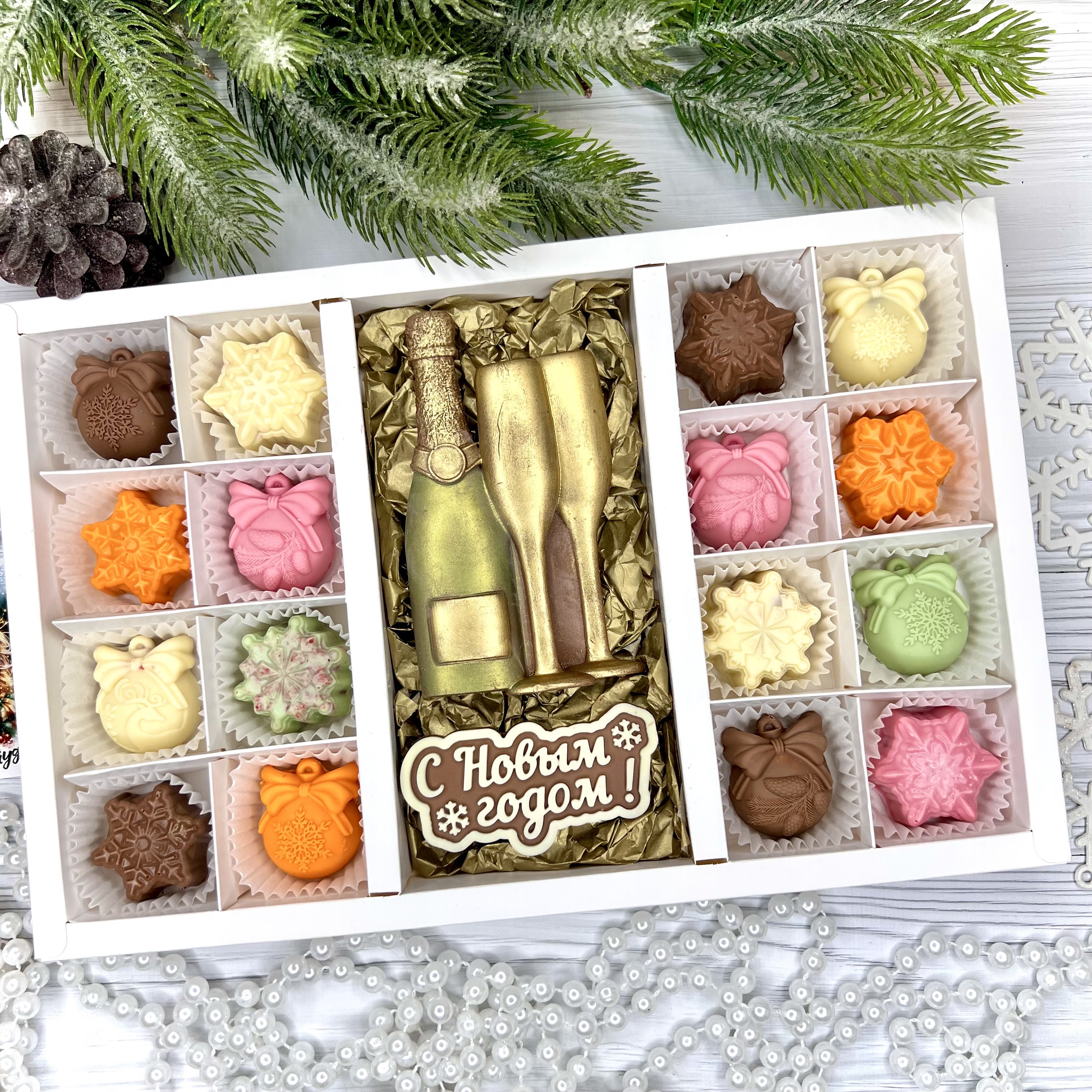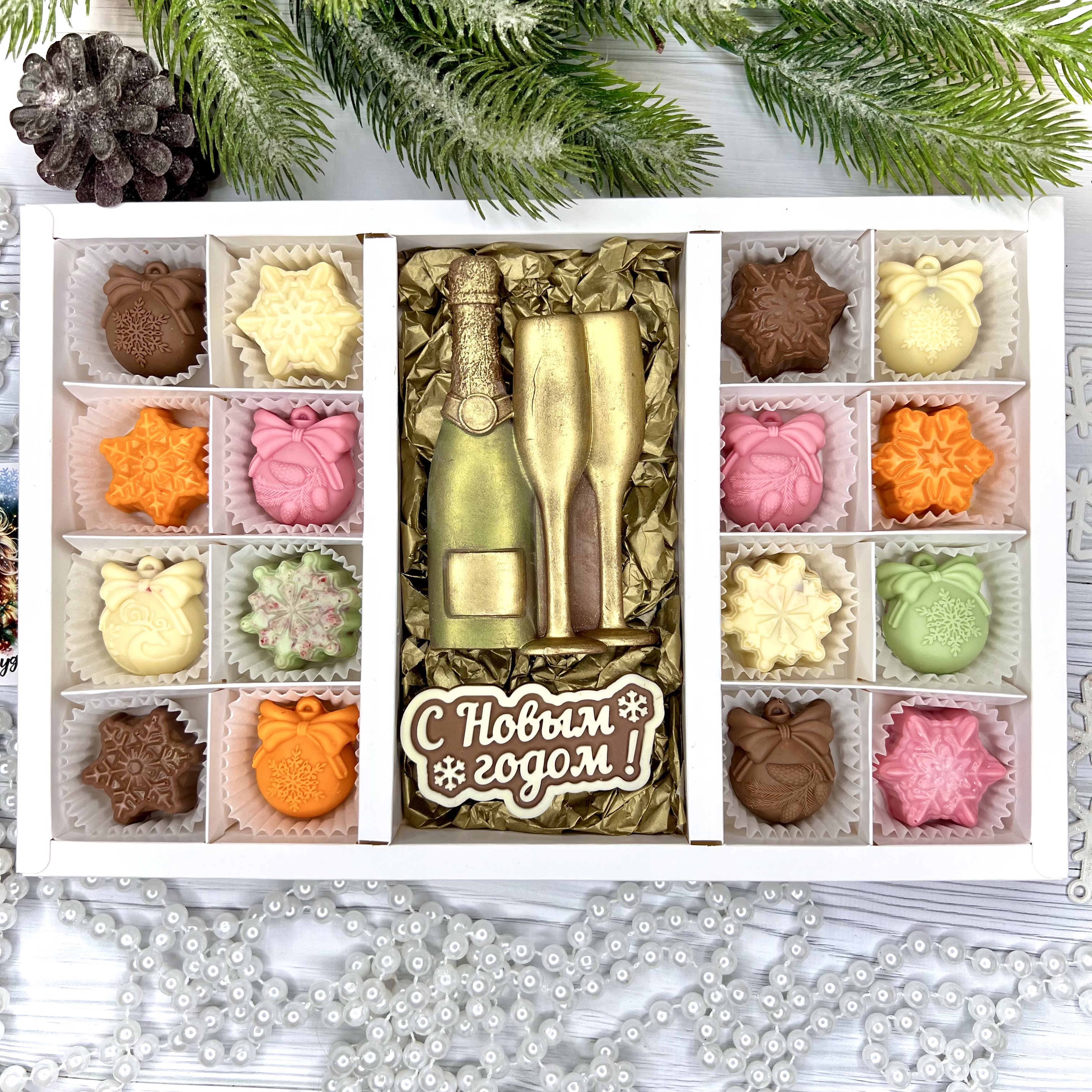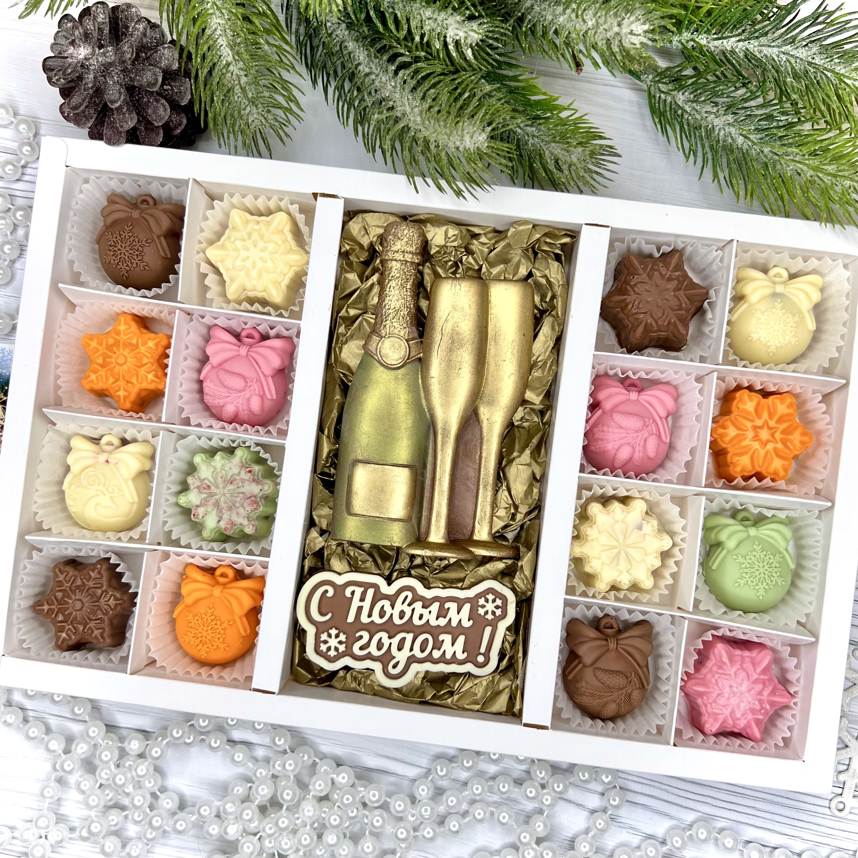 Шоколадный набор "С новым годом. Шампанское": 2 шоколадки и 16 конфет ручной работы - оригинальный, достойный и поистине вкусный подарок на Новый год 2026 из премиального бельгийского и швейцарского шоколада.