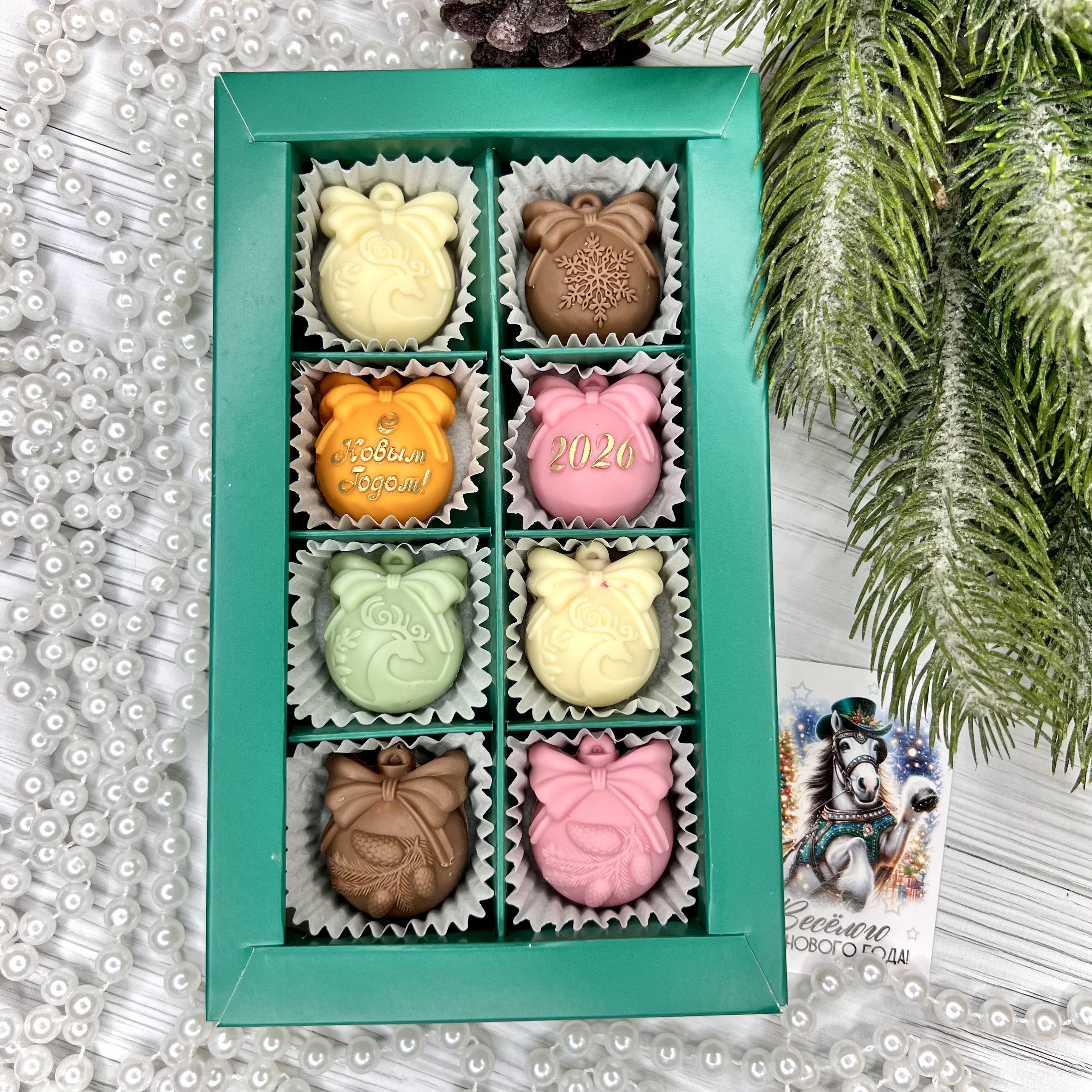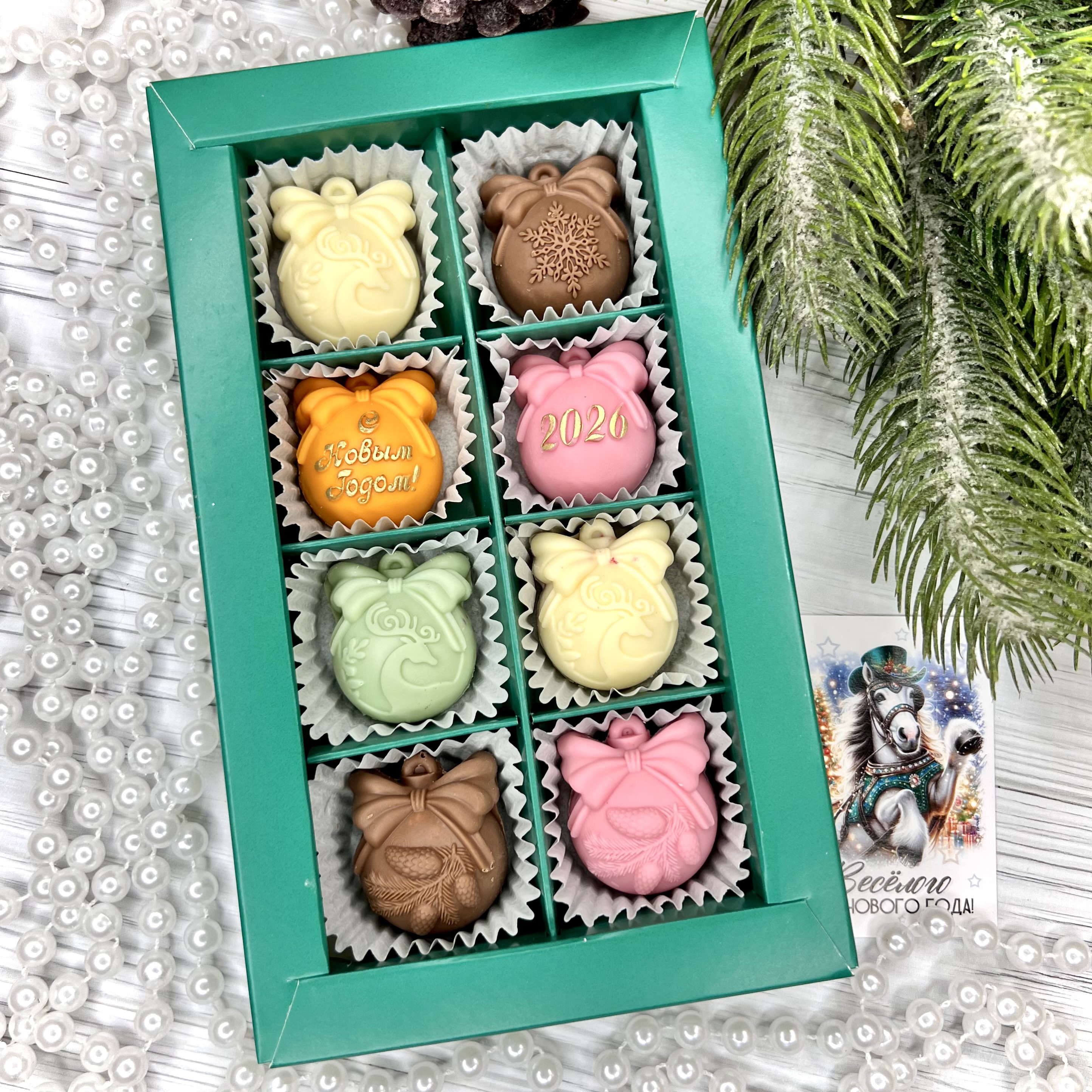 Шоколадный набор "С Новым Годом. Шары 2026": 8 конфет ручной работы - оригинальный, достойный и поистине вкусный подарок на Новый год 2026 из премиального бельгийского и швейцарского шоколада.