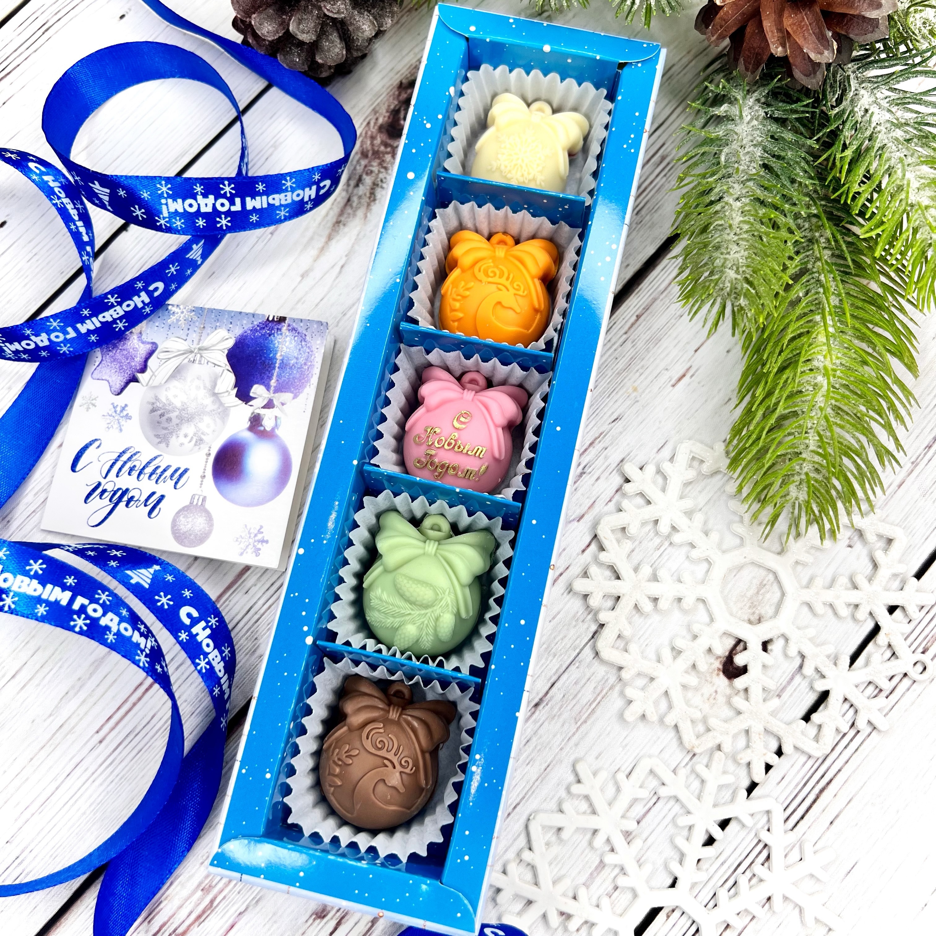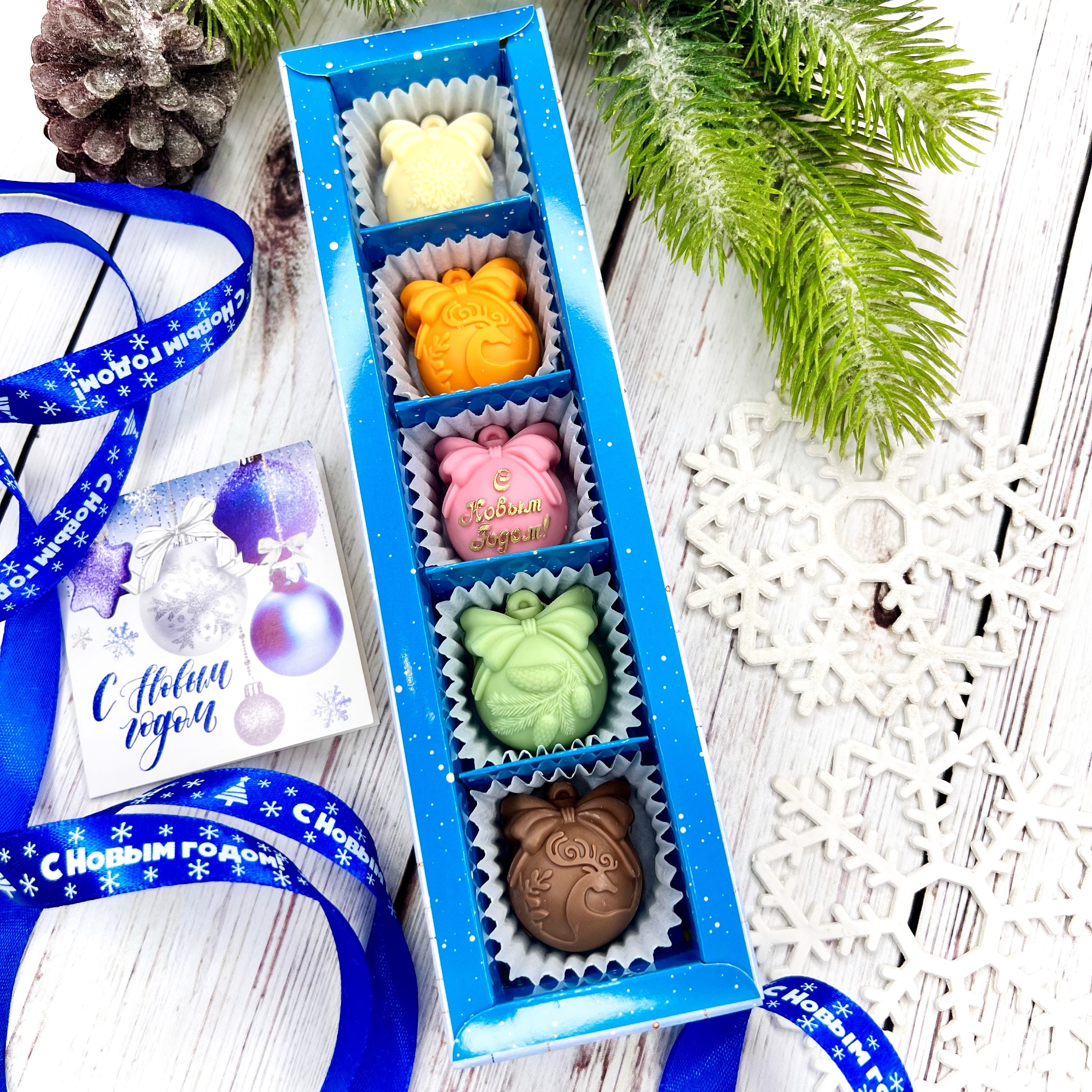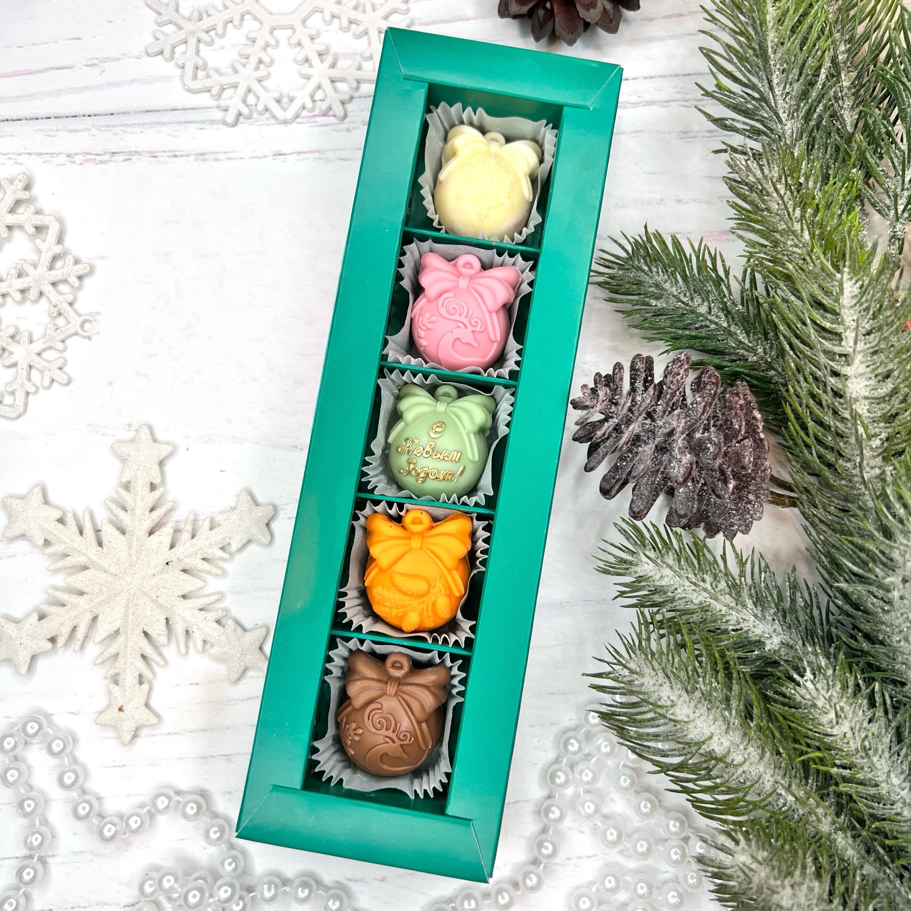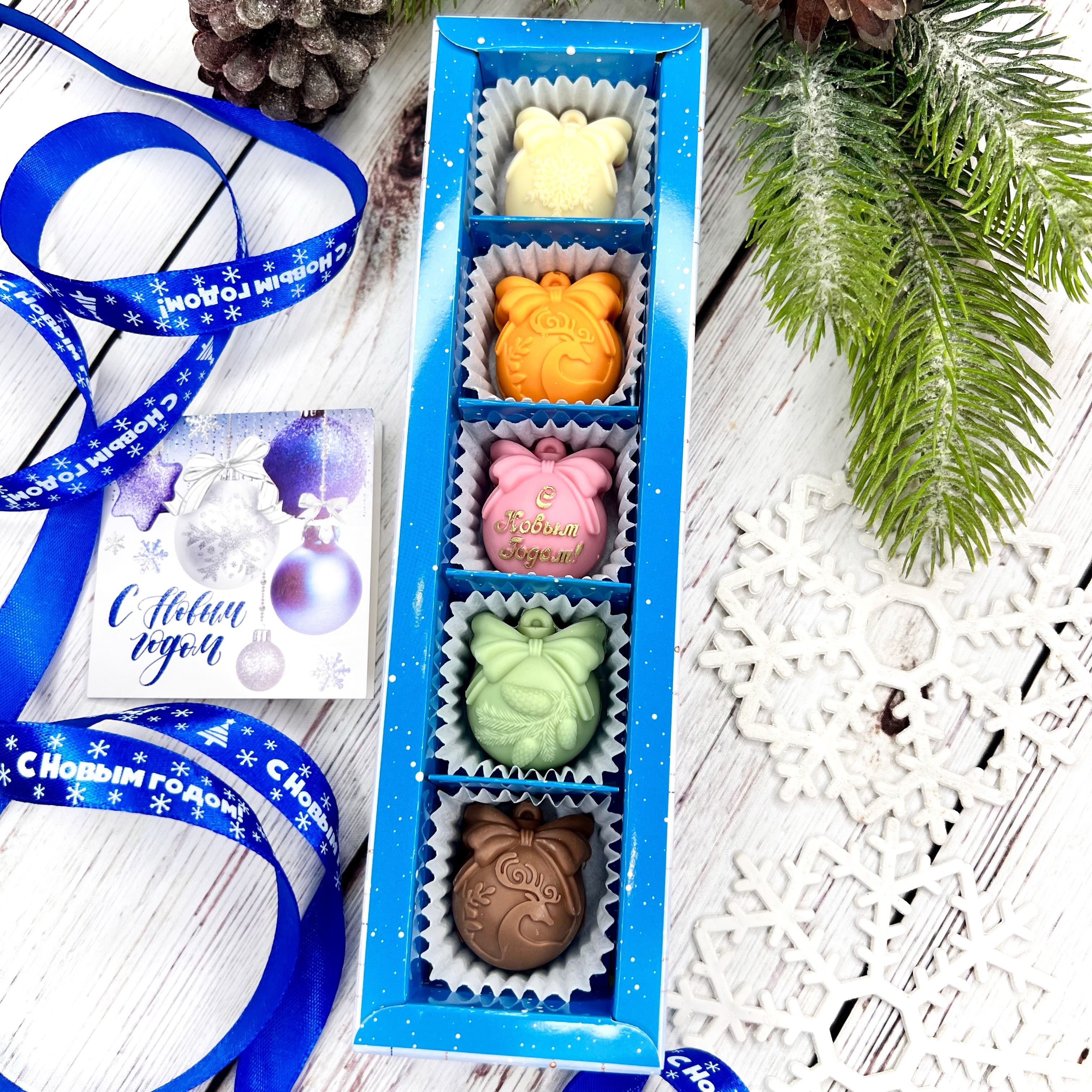 Шоколадный набор "С Новым годом. Шары": 5 конфет ручной работы - оригинальный, достойный и поистине вкусный подарок на Новый год 2026 из премиального бельгийского и швейцарского шоколада.