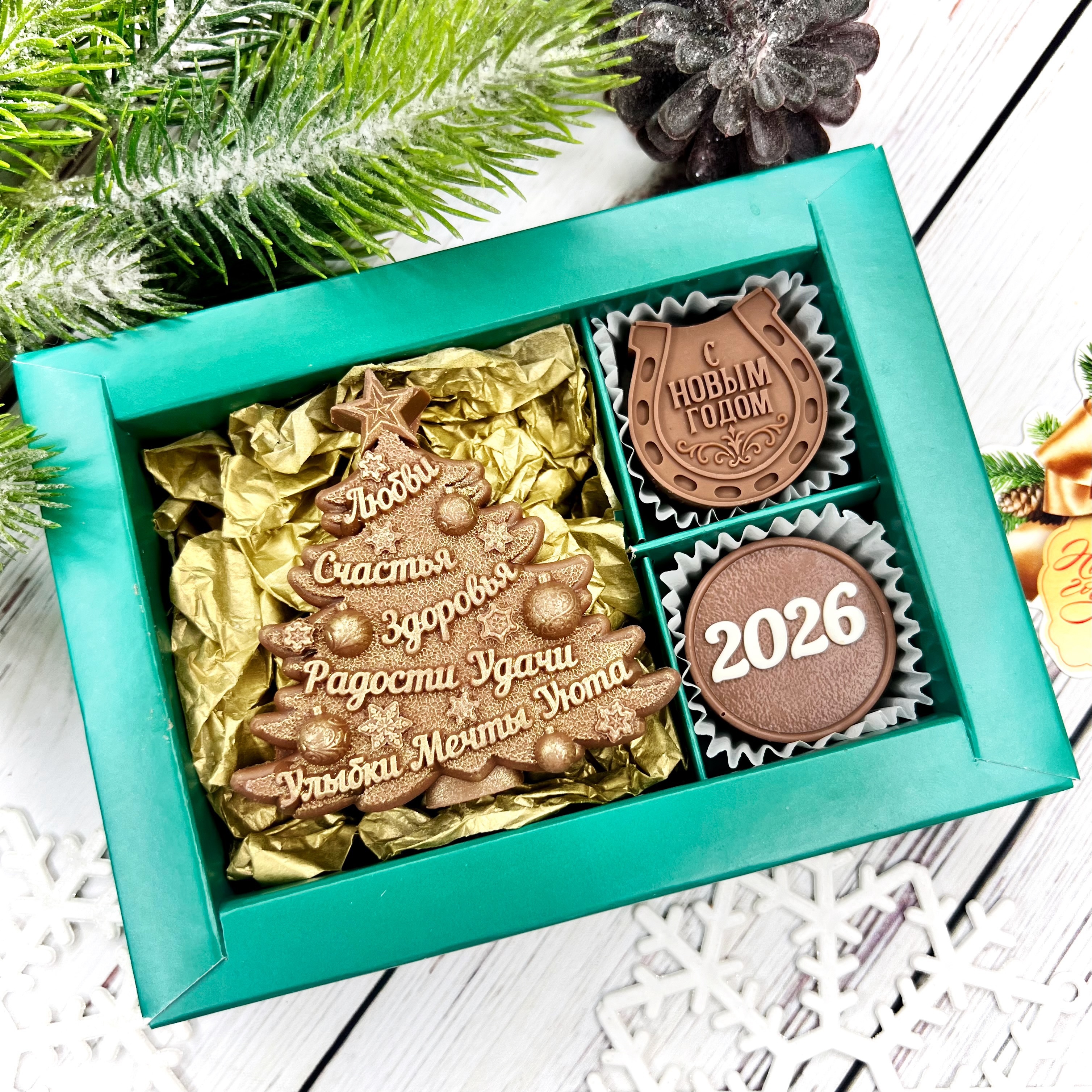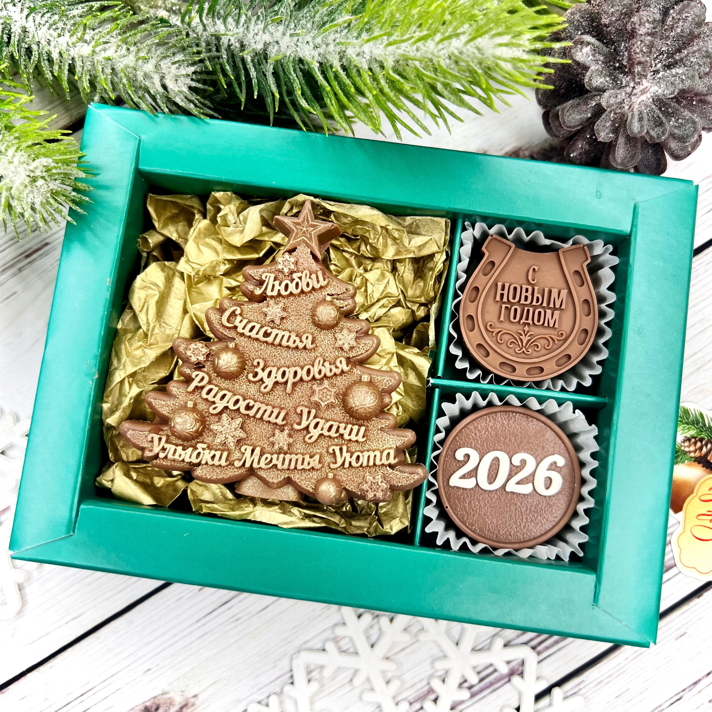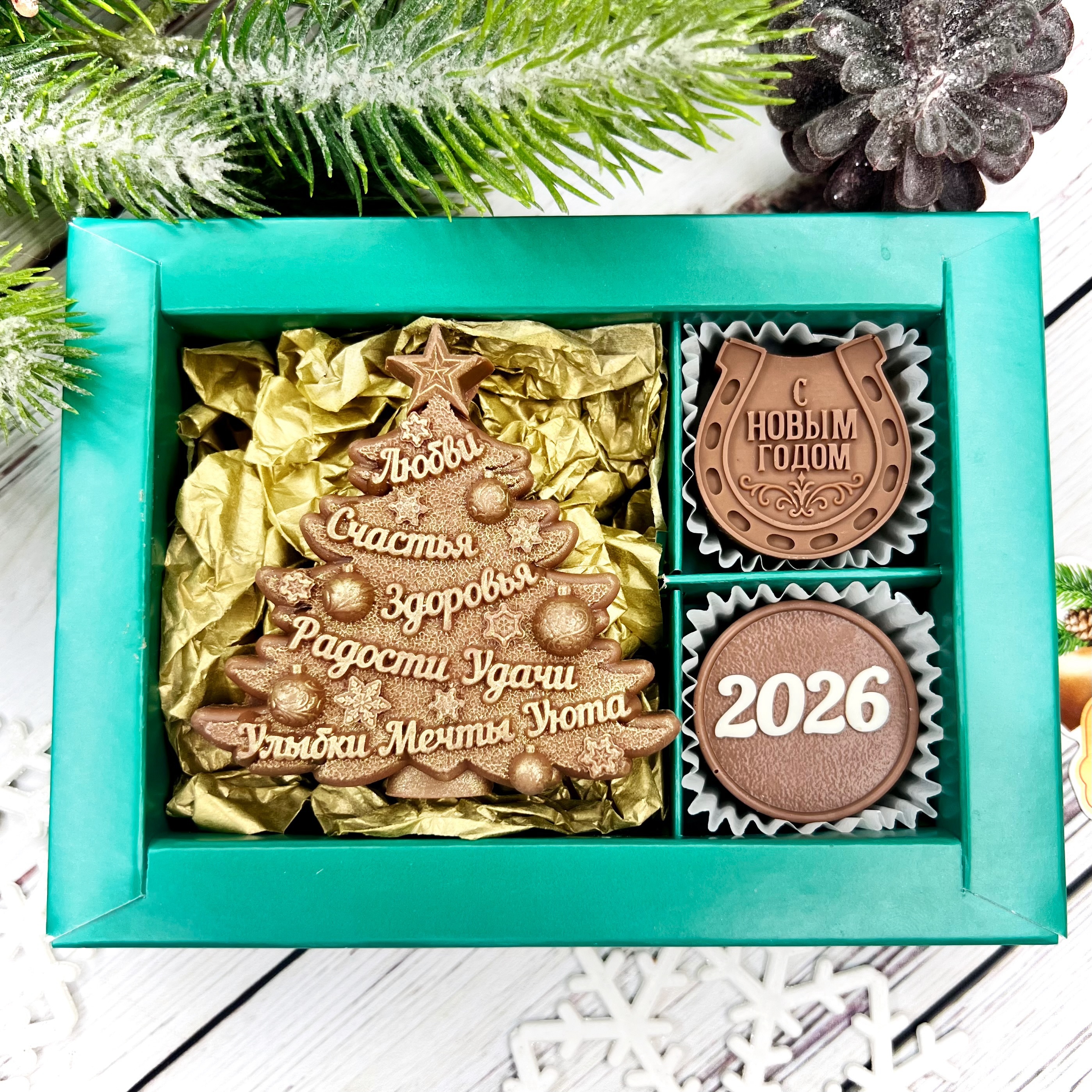 Шоколадный набор "Ёлка пожеланий Подкова 2026": шоколадка и 2 конфеты ручной работы - оригинальный и вкусный подарок на Новый 2026 год из премиального бельгийского шоколада.