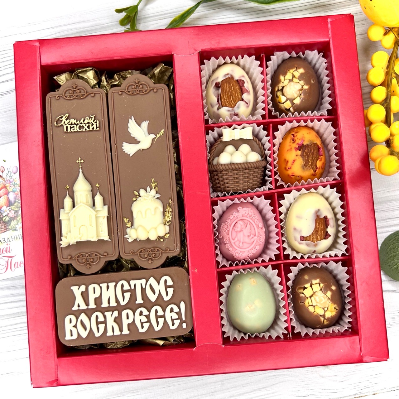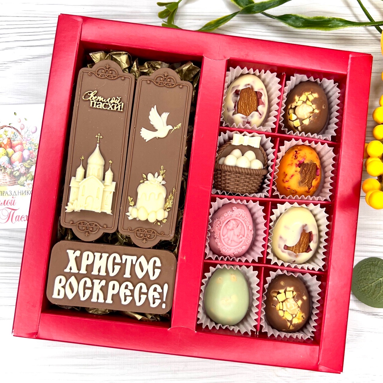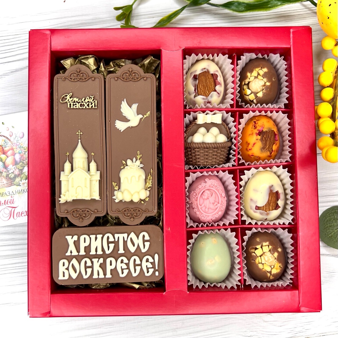 Шоколадный набор "Христос Воскресе": 3 шоколадки и 8 конфет ручной работы - вкусный и оригинальный подарок на Светлый Праздник Пасхи.
