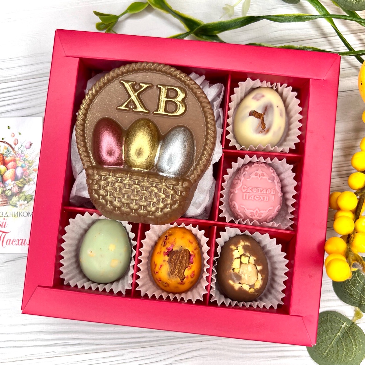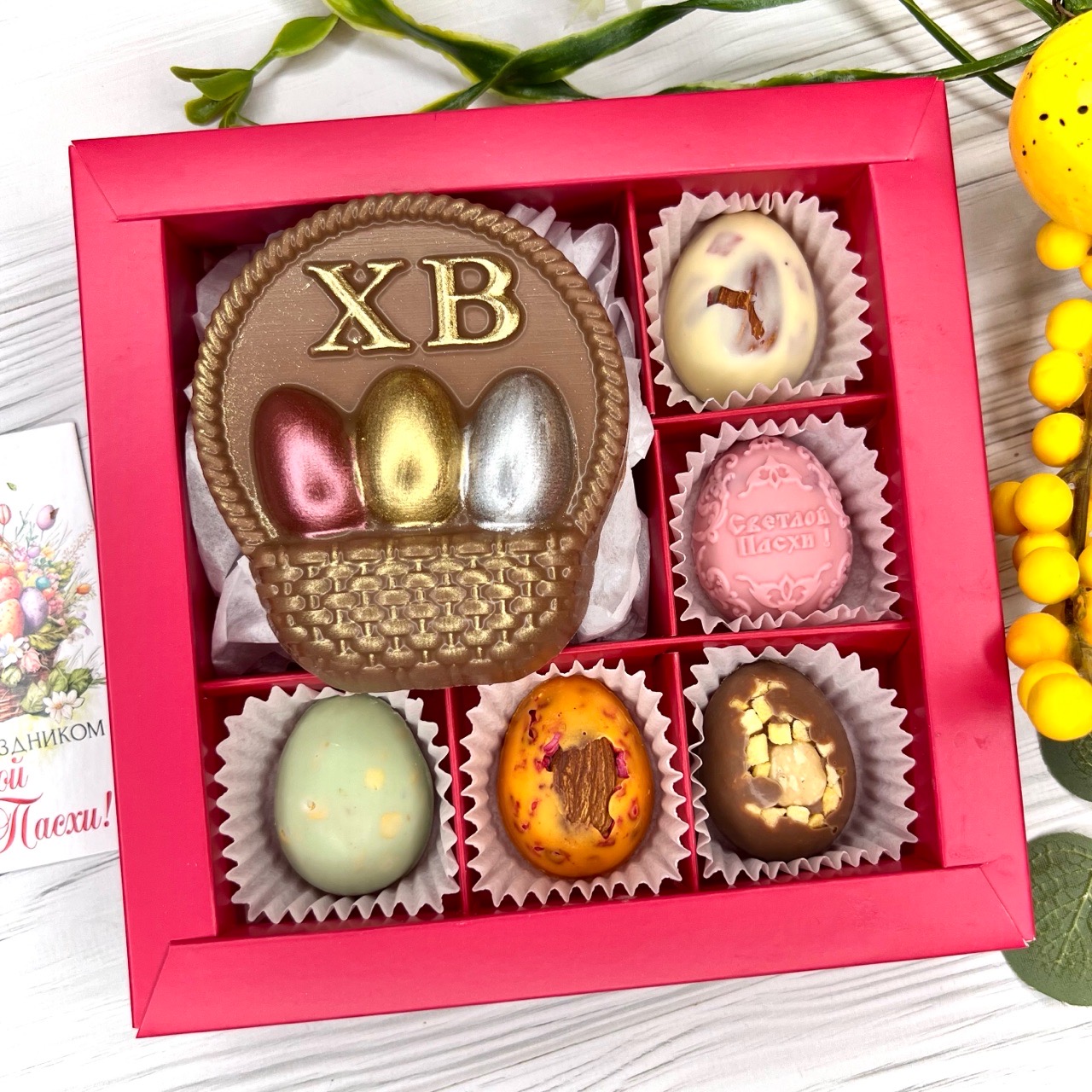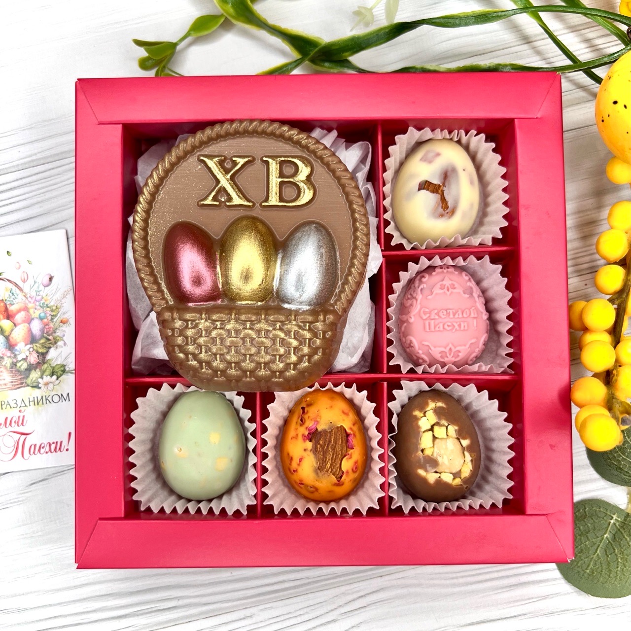 Шоколадный набор "Пасхальная корзина с яйцами": шоколадка и 5 конфет ручной работы - вкусный и оригинальный подарок на Светлый Праздник Пасхи.